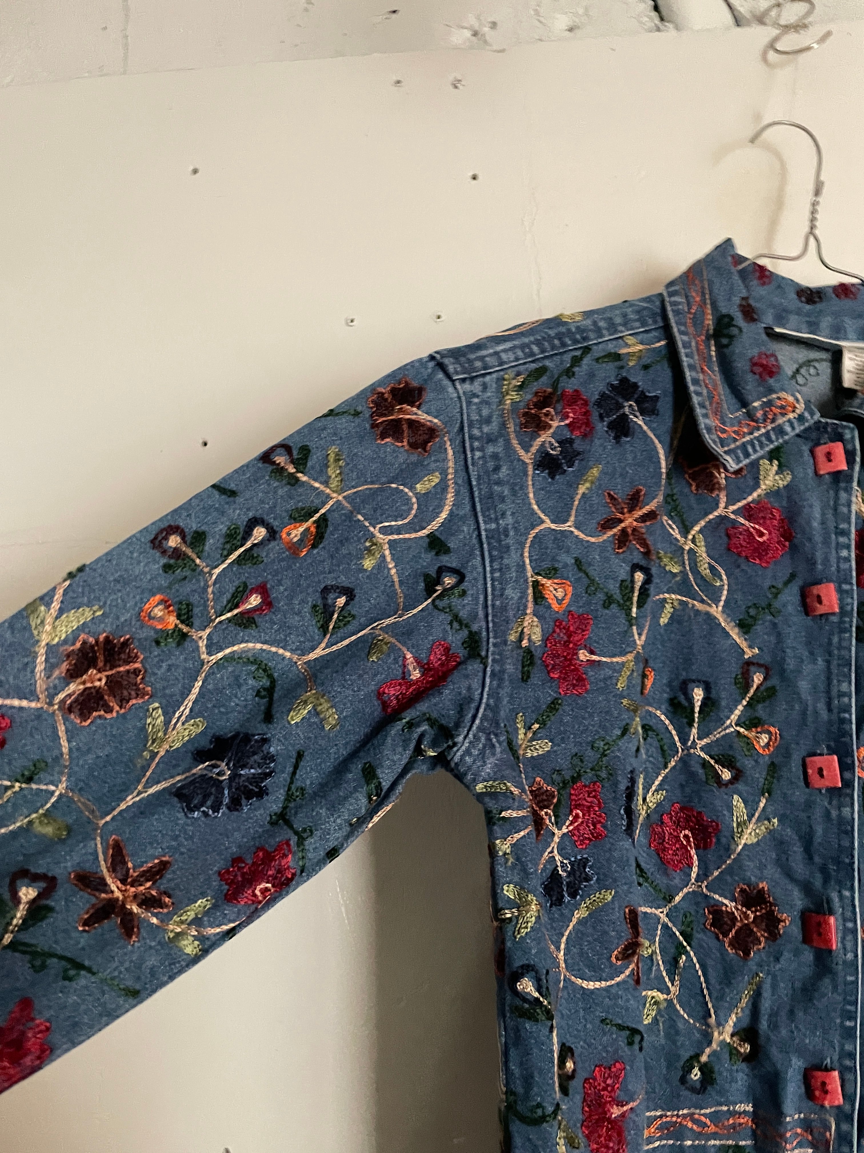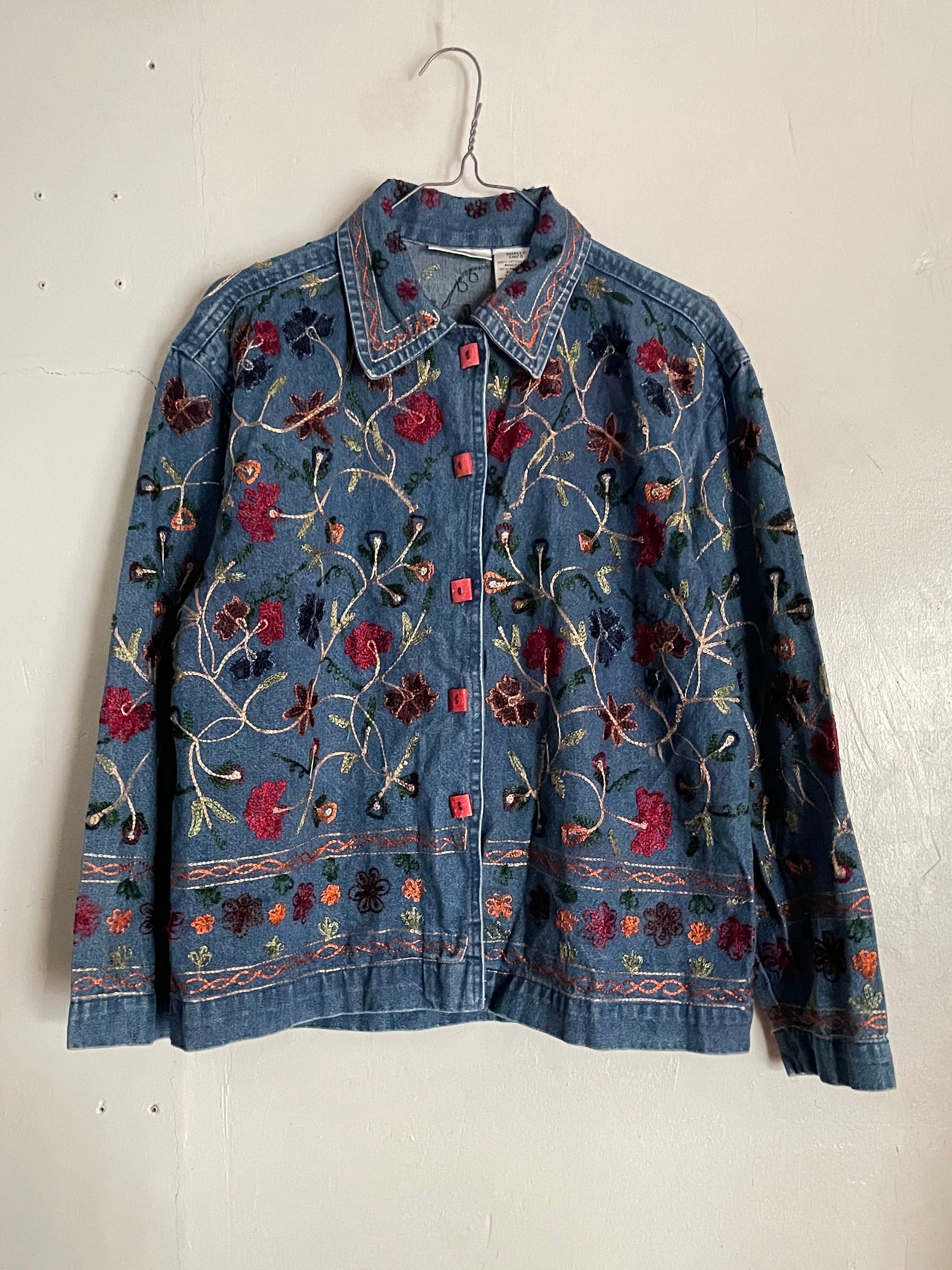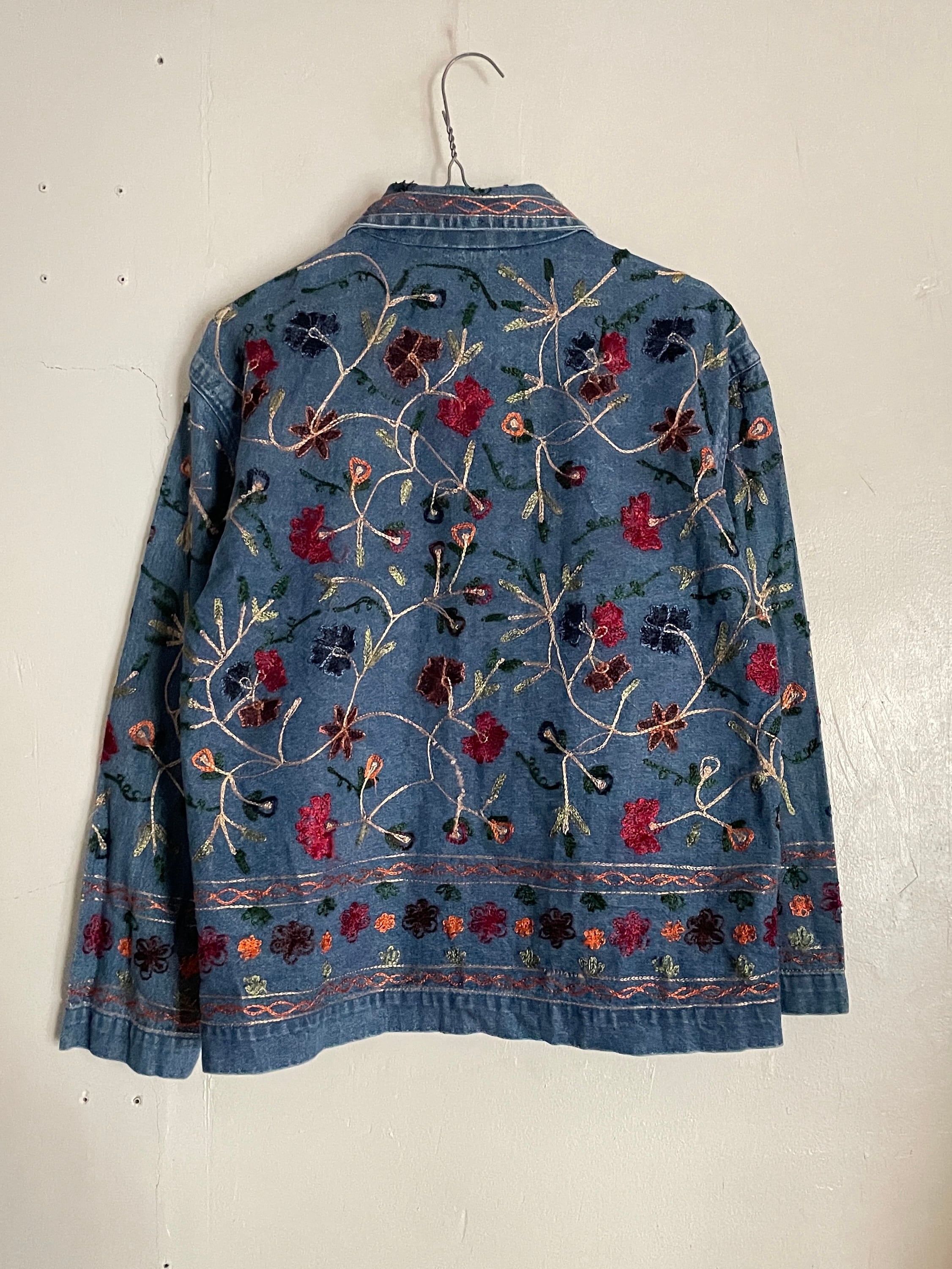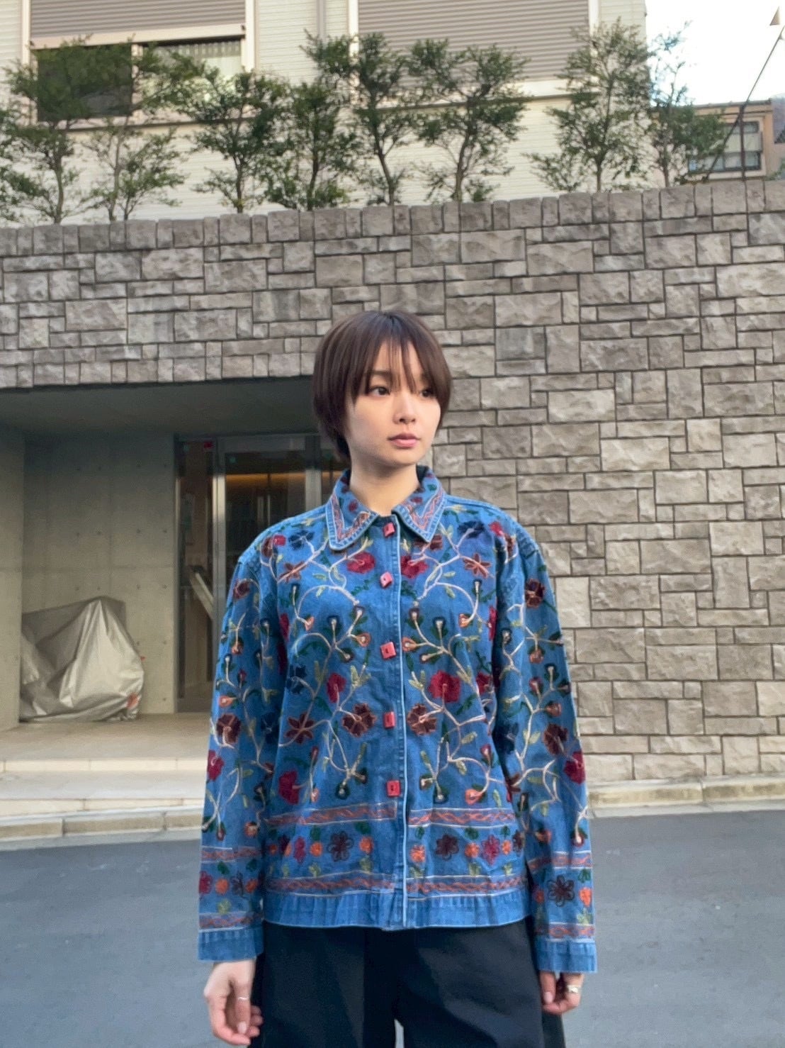 全面に施されたボタニカルな刺繍と、赤いスクエアボタンが目を惹く一着。レトロで温かみのあるデザインは、羽織るだけで主役級の存在感です。今の時期はコートの下のアクセントに、これからの季節はライトアウターとしてもロングシーズンで主役になれる一着です。