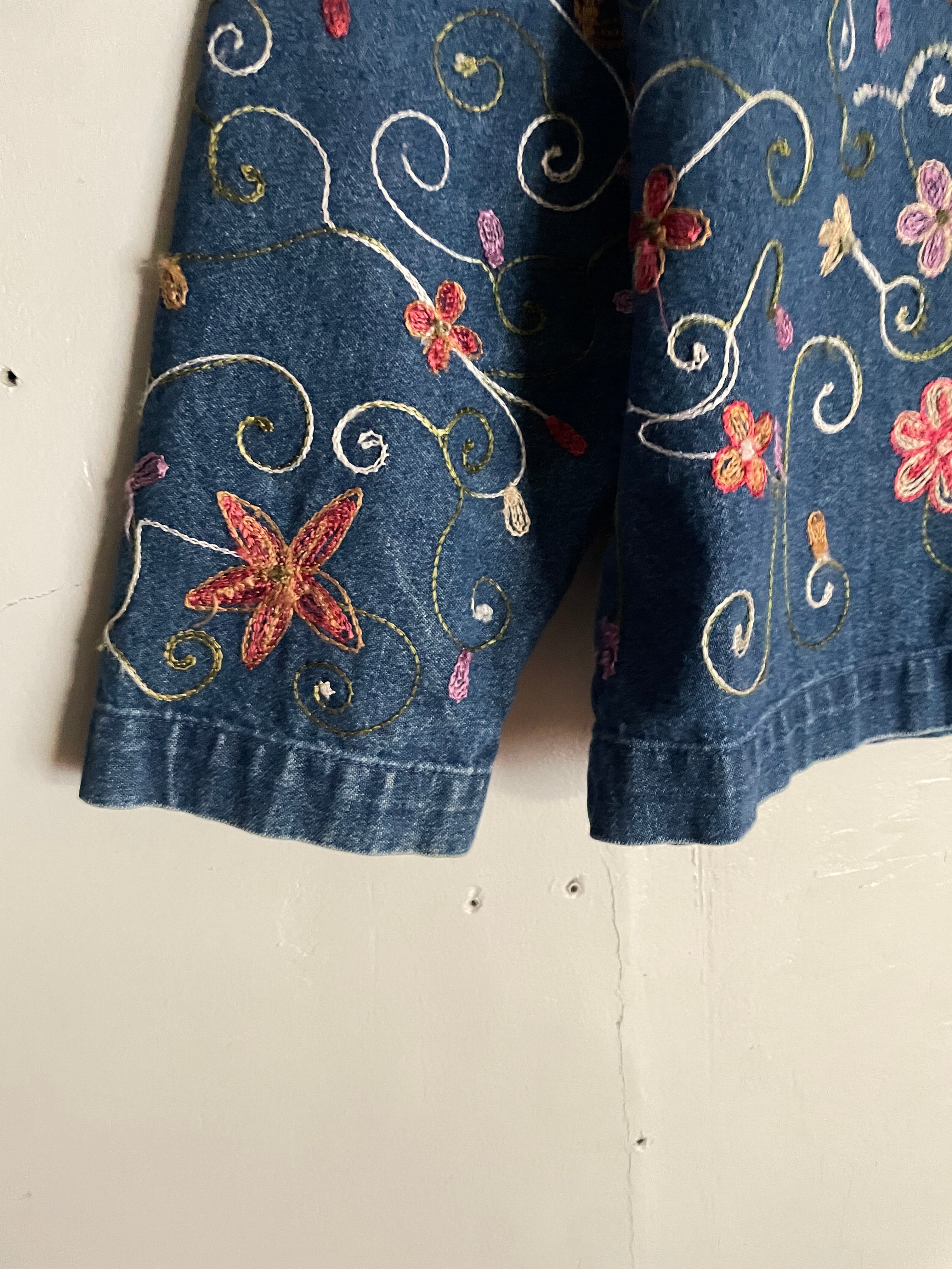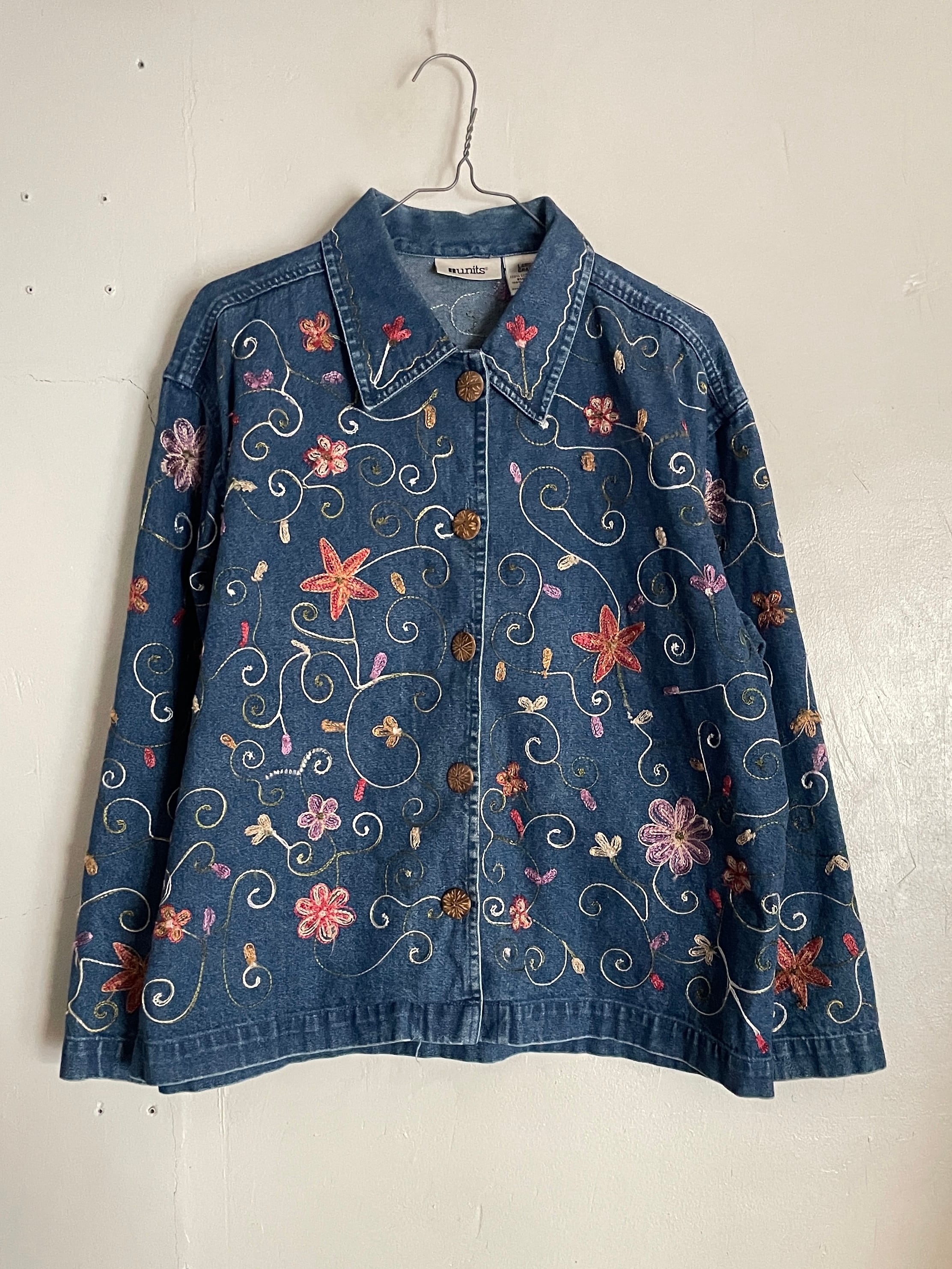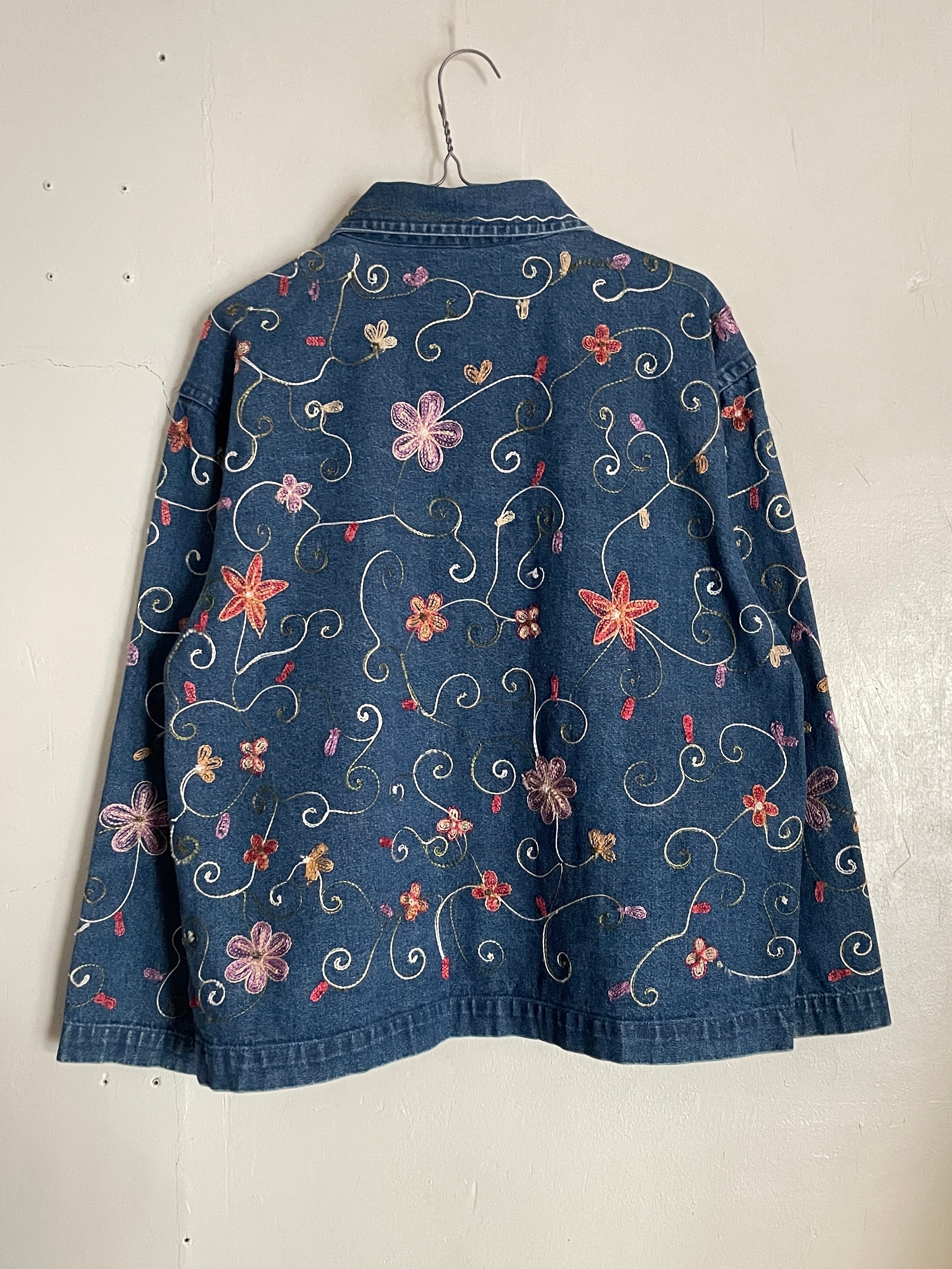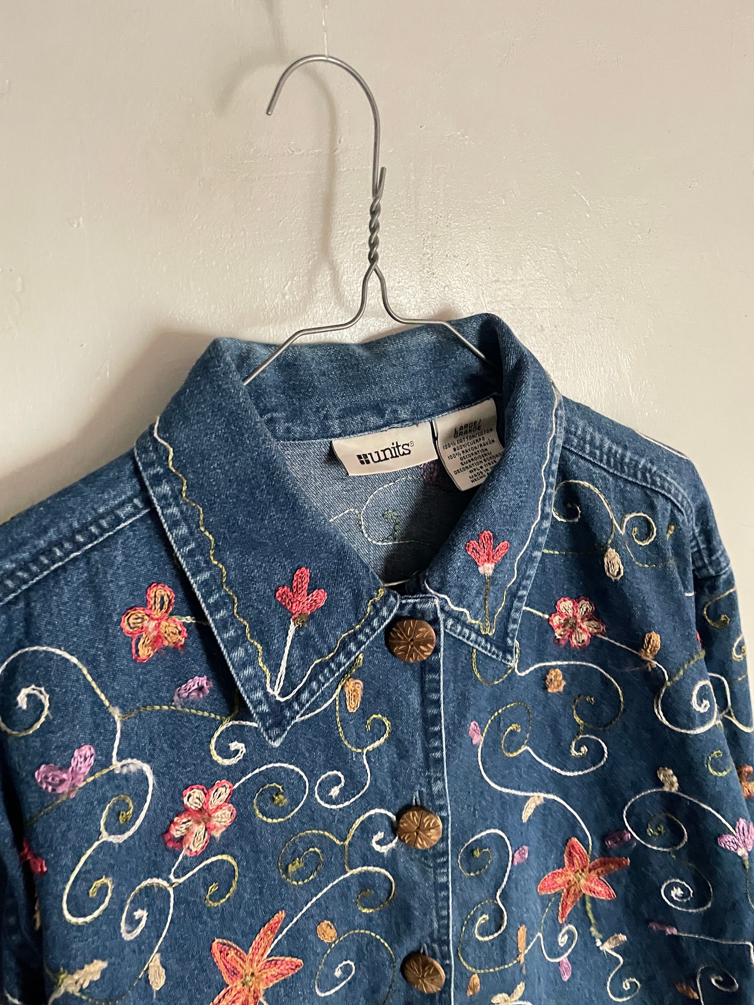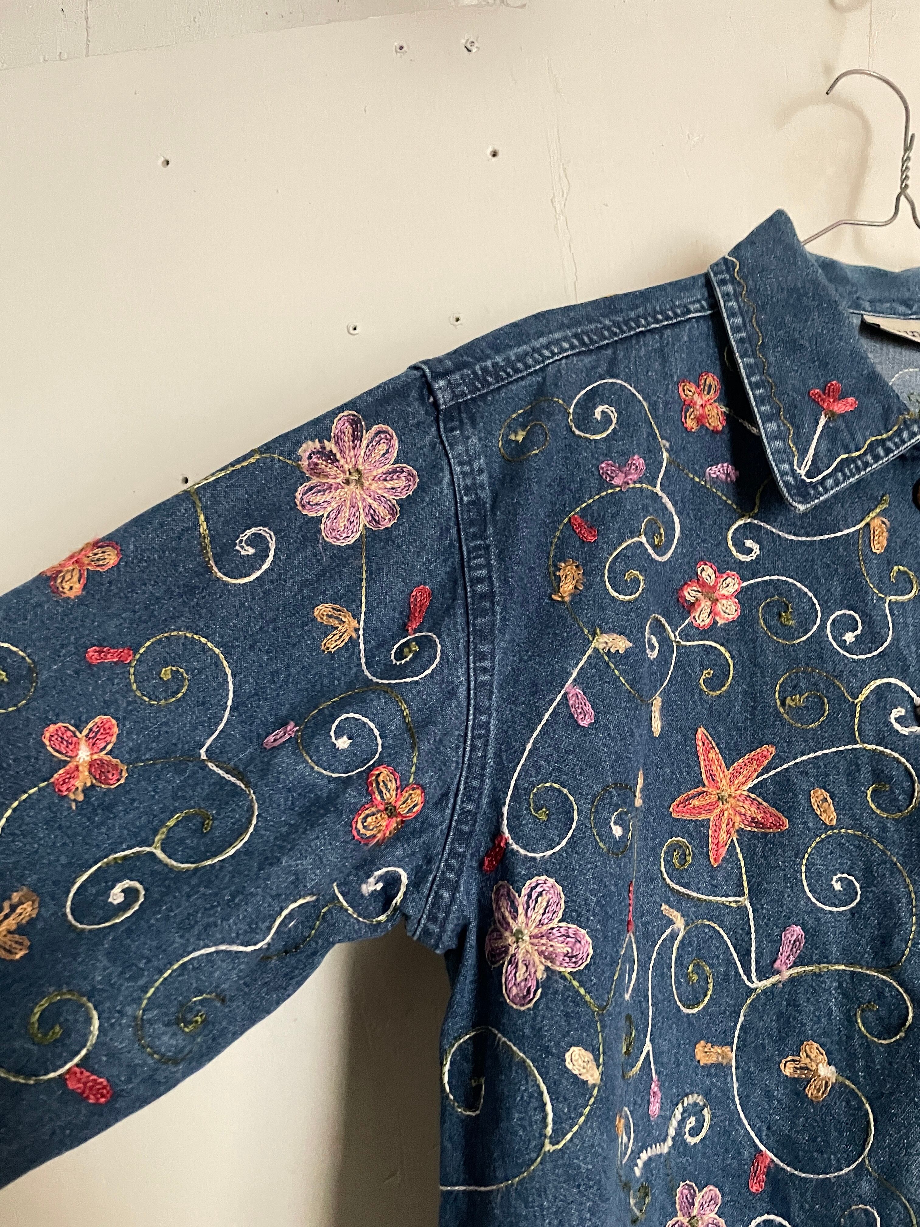 渦巻くような植物柄の刺繍が全面に広がる、アートなデニムジャケット。真鍮風のコンチョボタンが、フォークロアな雰囲気を格上げします。程良いゆとりのあるシルエットで、大人のレトロスタイルにも最適。さらりと羽織るだけで温かみと個性を演出でき、スタイリングの主役になれる一着です。