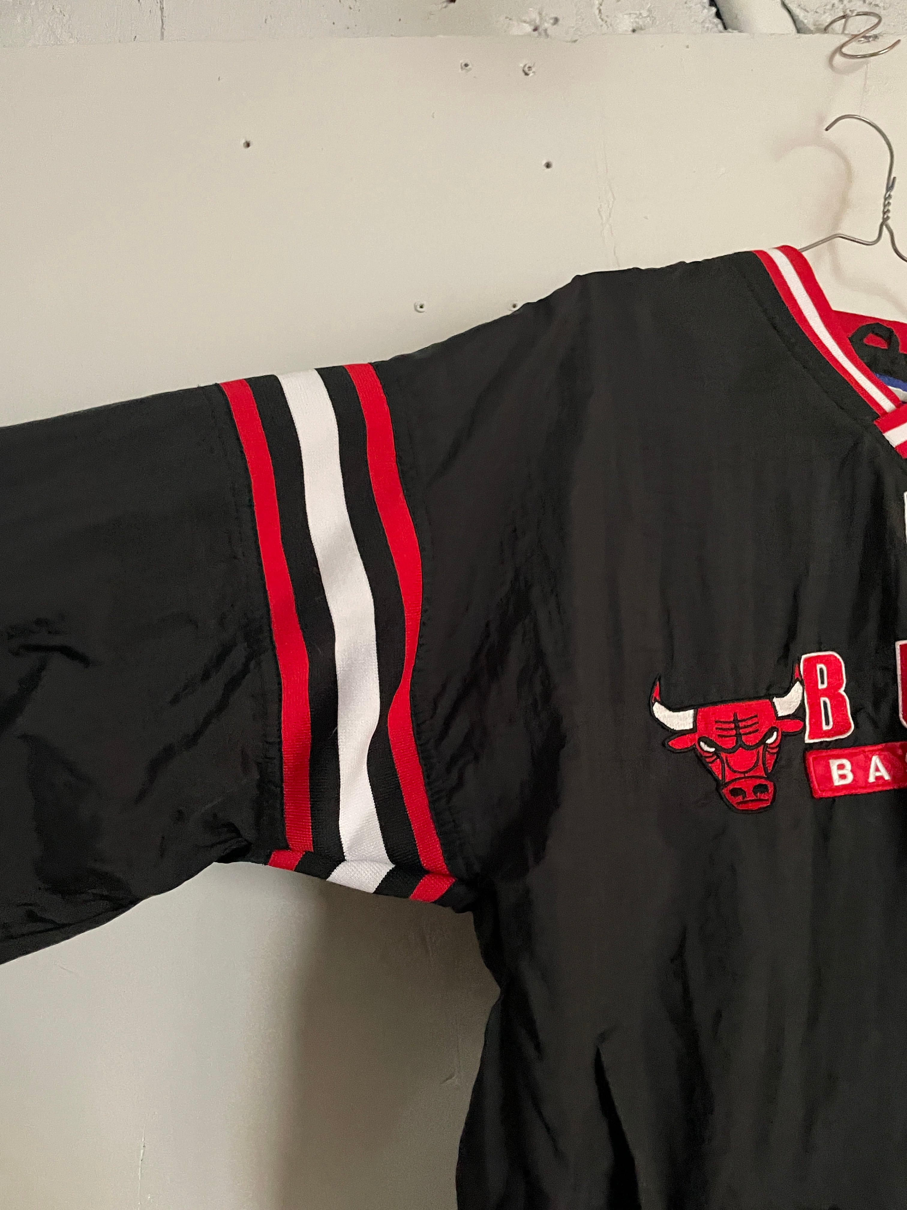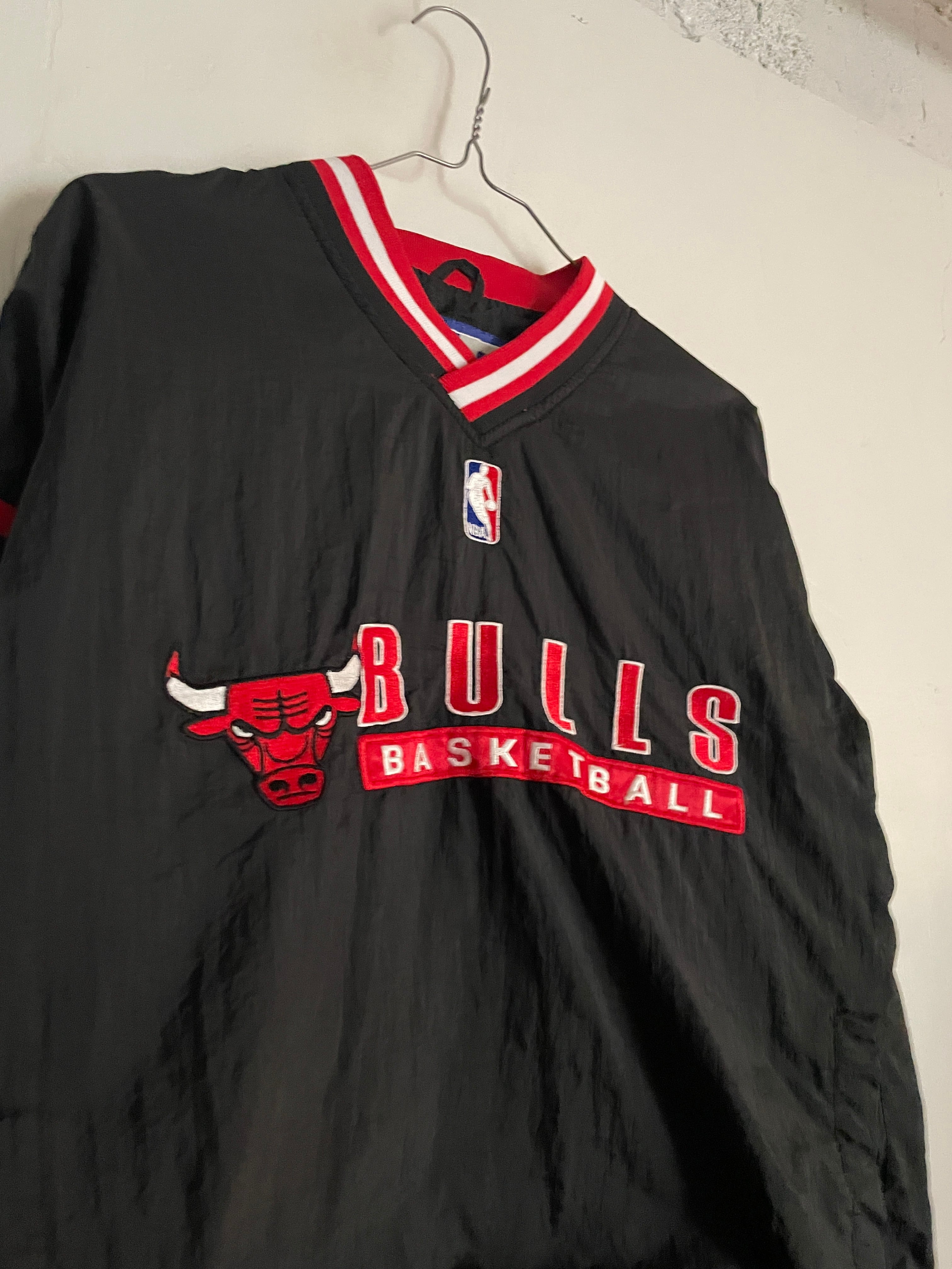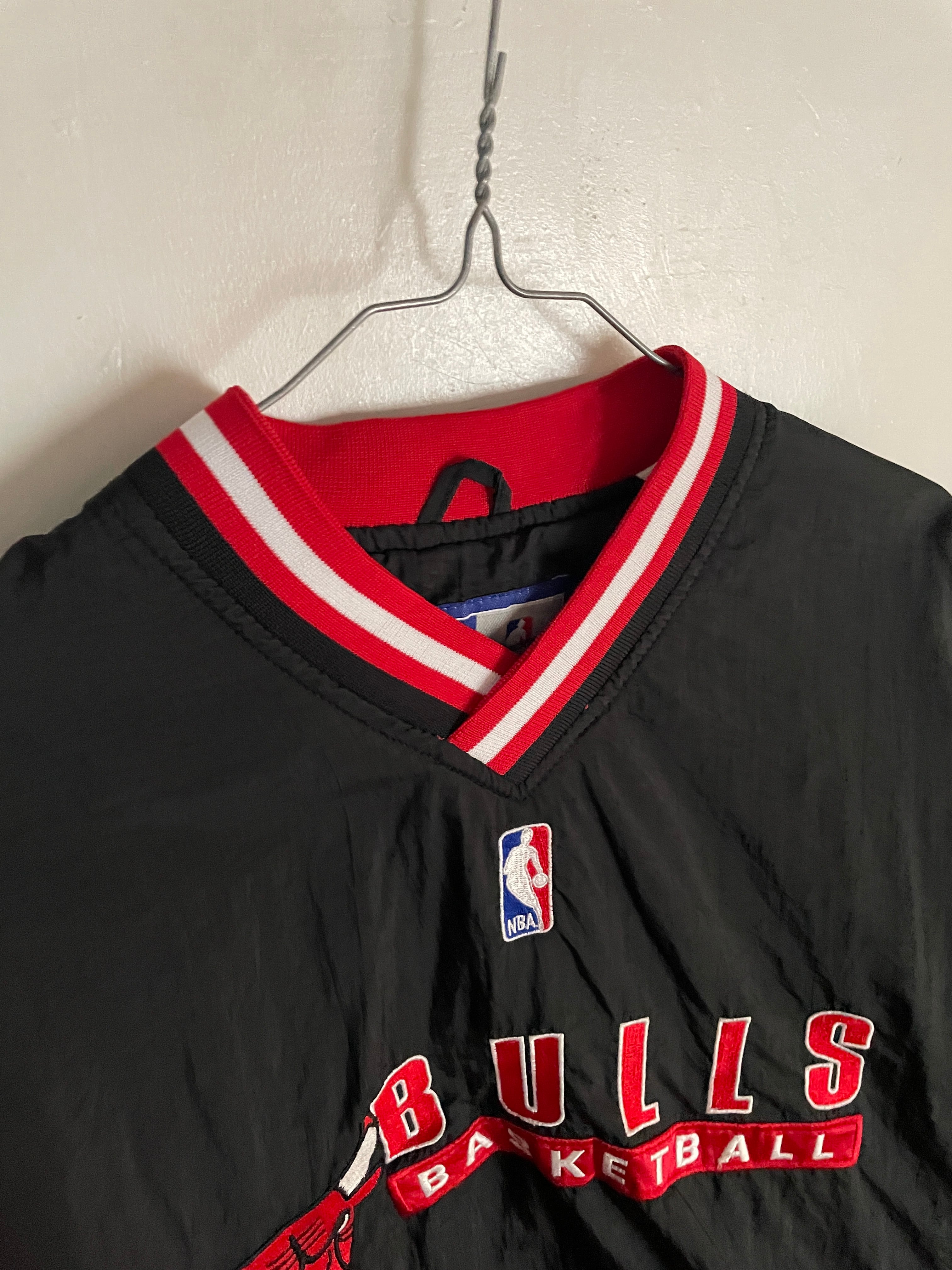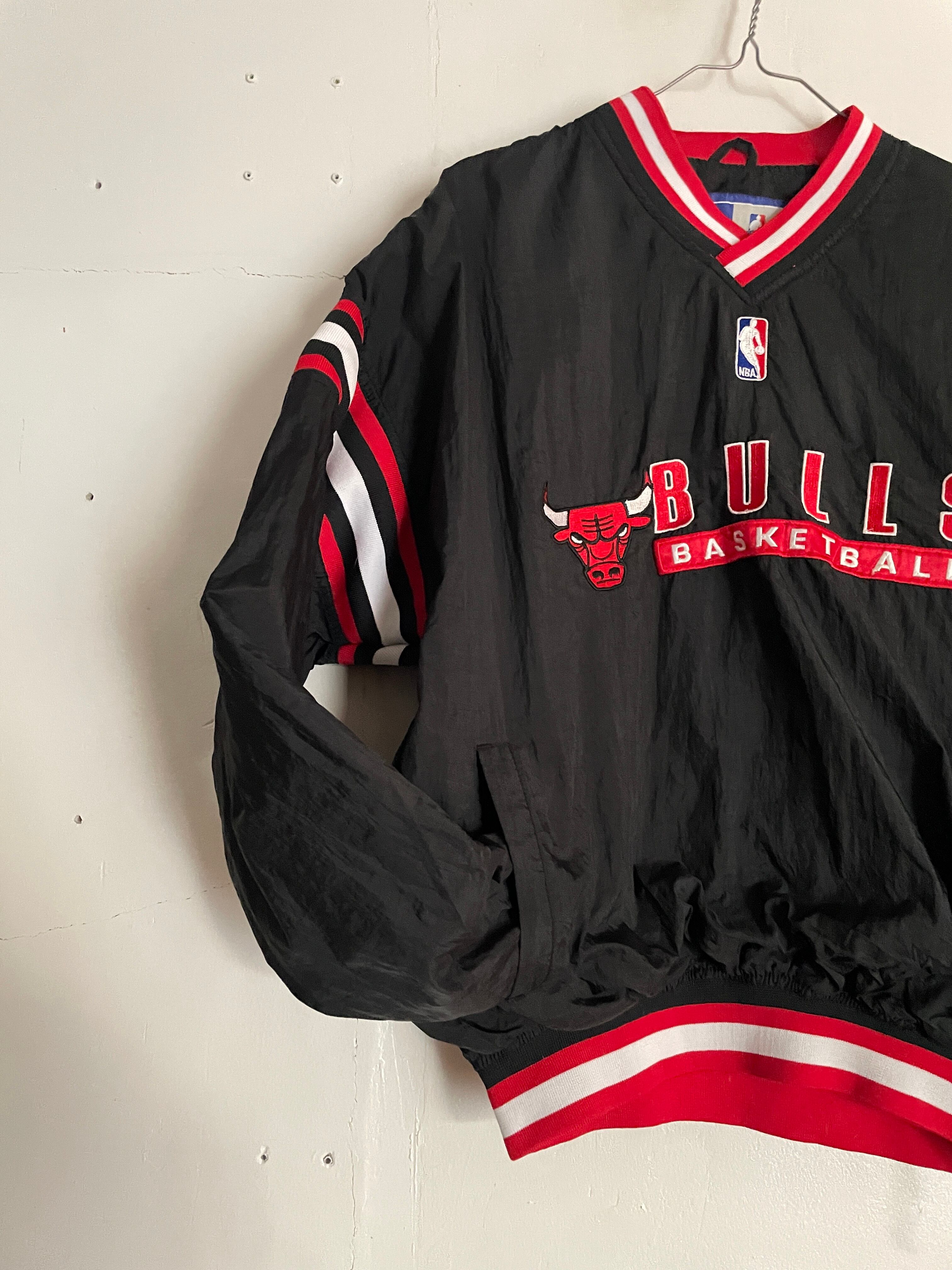 NBA黄金期の90sシカゴ・ブルズのナイロンプルオーバー。首元や袖口のリブにあしらわれたチームカラーのラインと、フロントの力強い刺繍ロゴが当時の空気感を象徴しています。スポーティーなVネック仕様は、インナーにパーカーやシャツを重ねるレイヤードスタイルとも相性抜群。