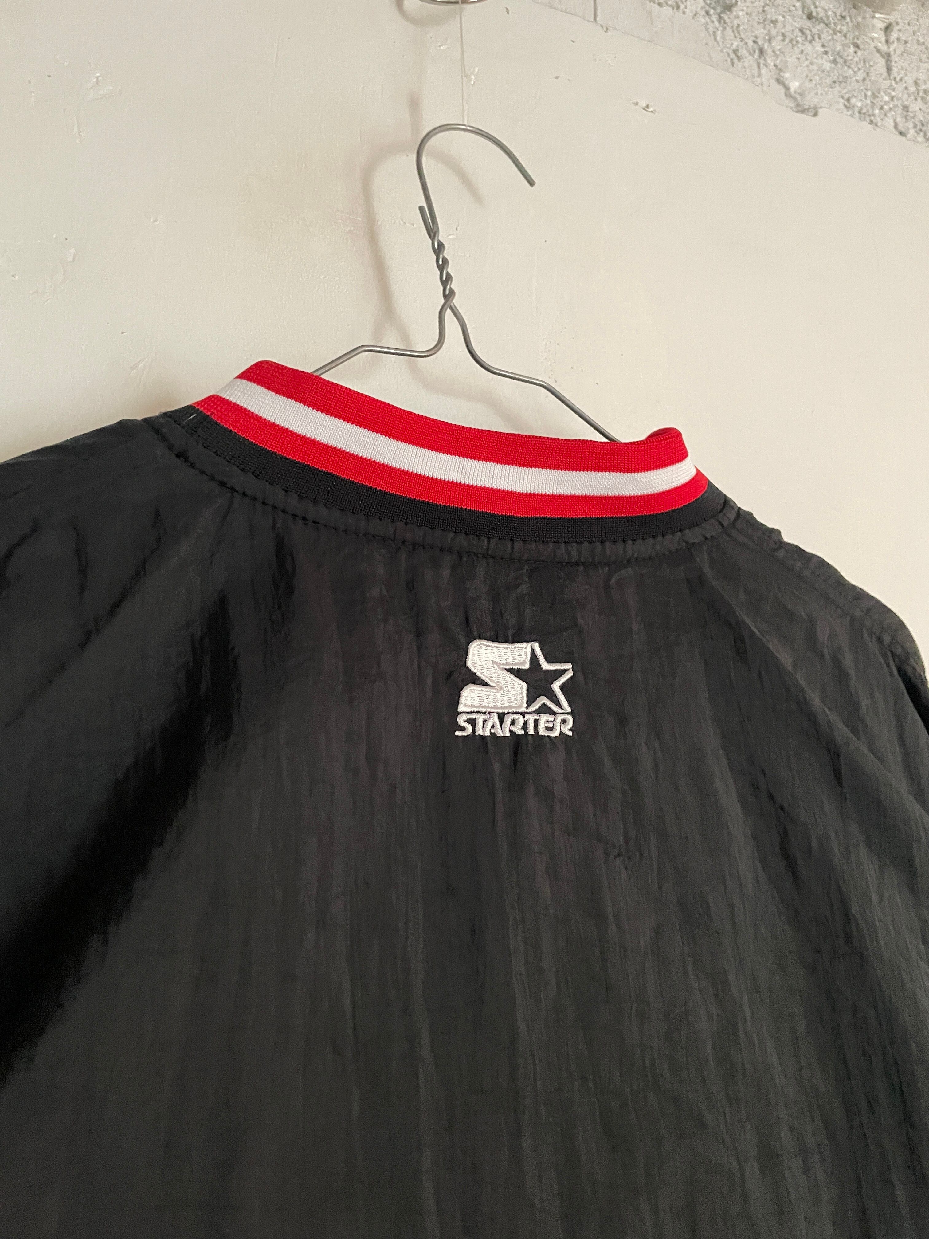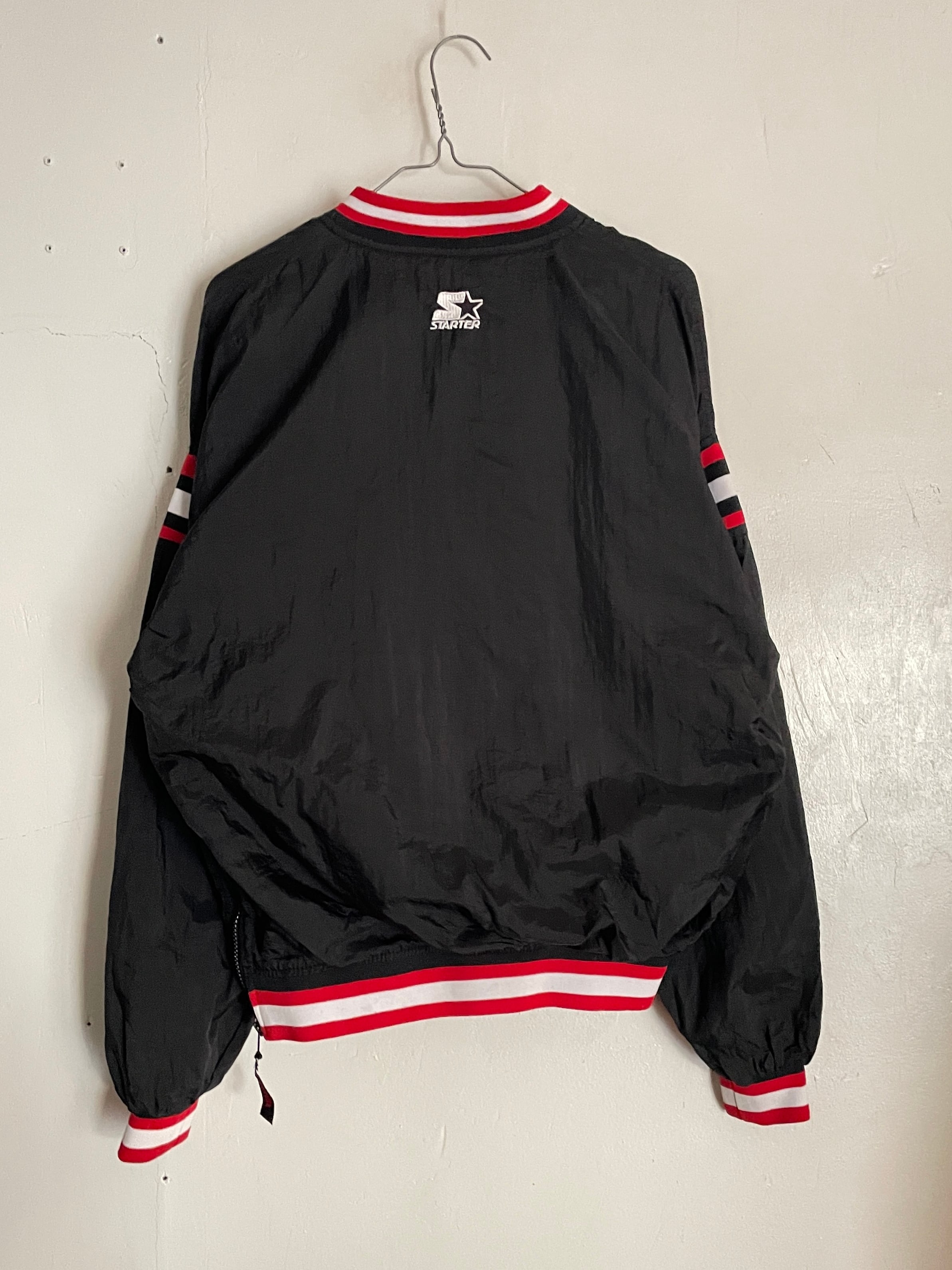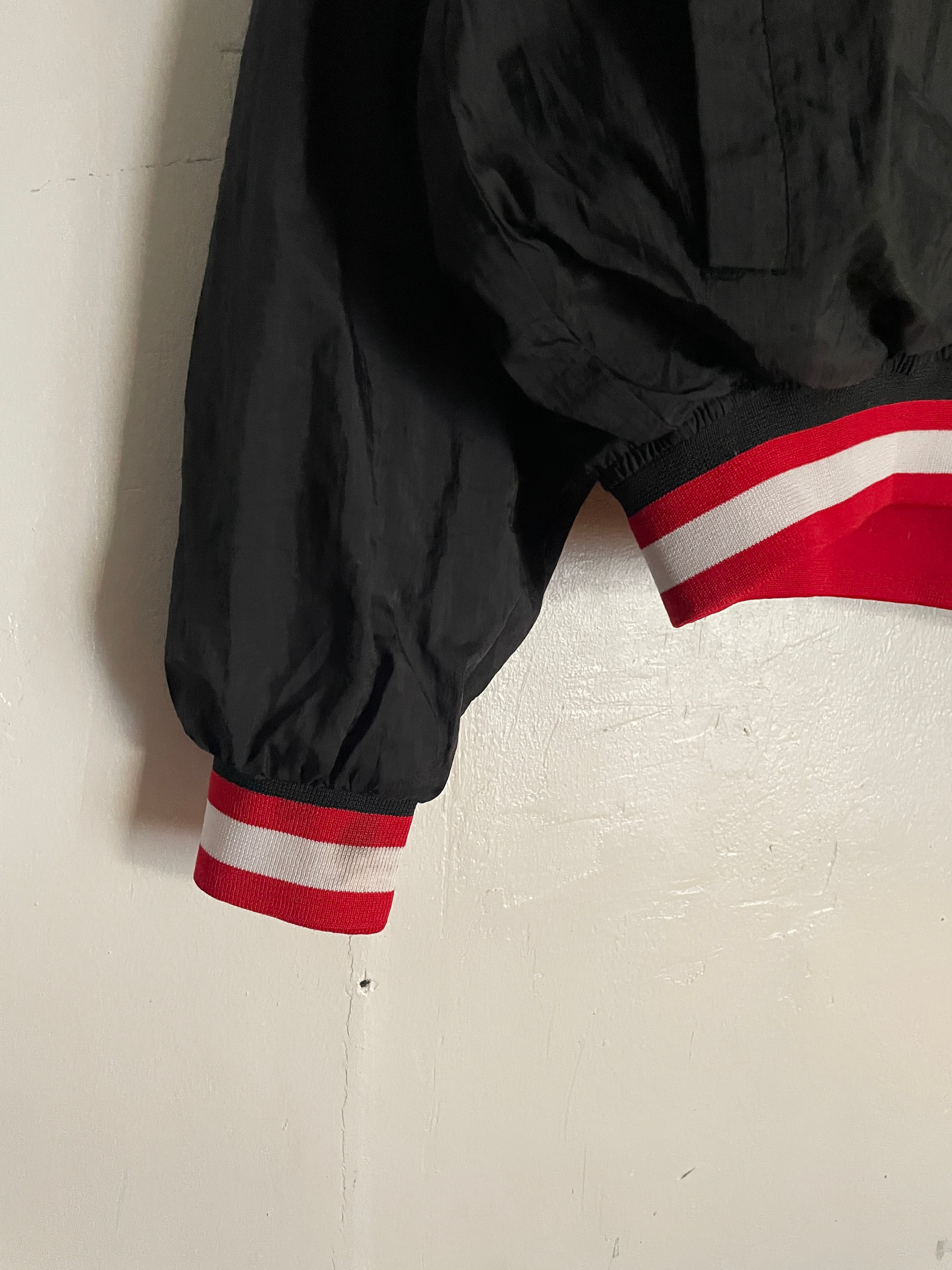 NBA黄金期の90sシカゴ・ブルズのナイロンプルオーバー。首元や袖口のリブにあしらわれたチームカラーのラインと、フロントの力強い刺繍ロゴが当時の空気感を象徴しています。スポーティーなVネック仕様は、インナーにパーカーやシャツを重ねるレイヤードスタイルとも相性抜群。