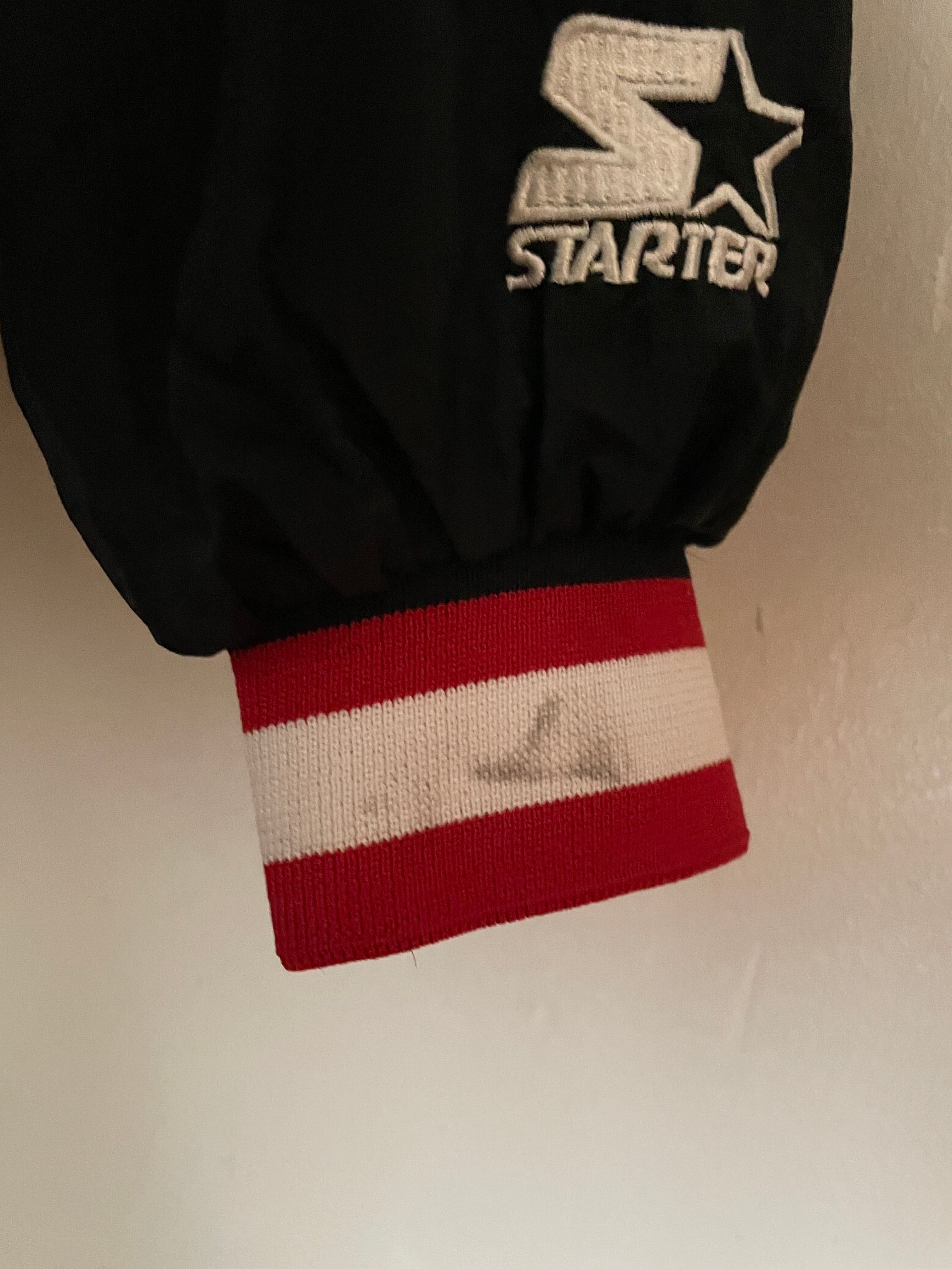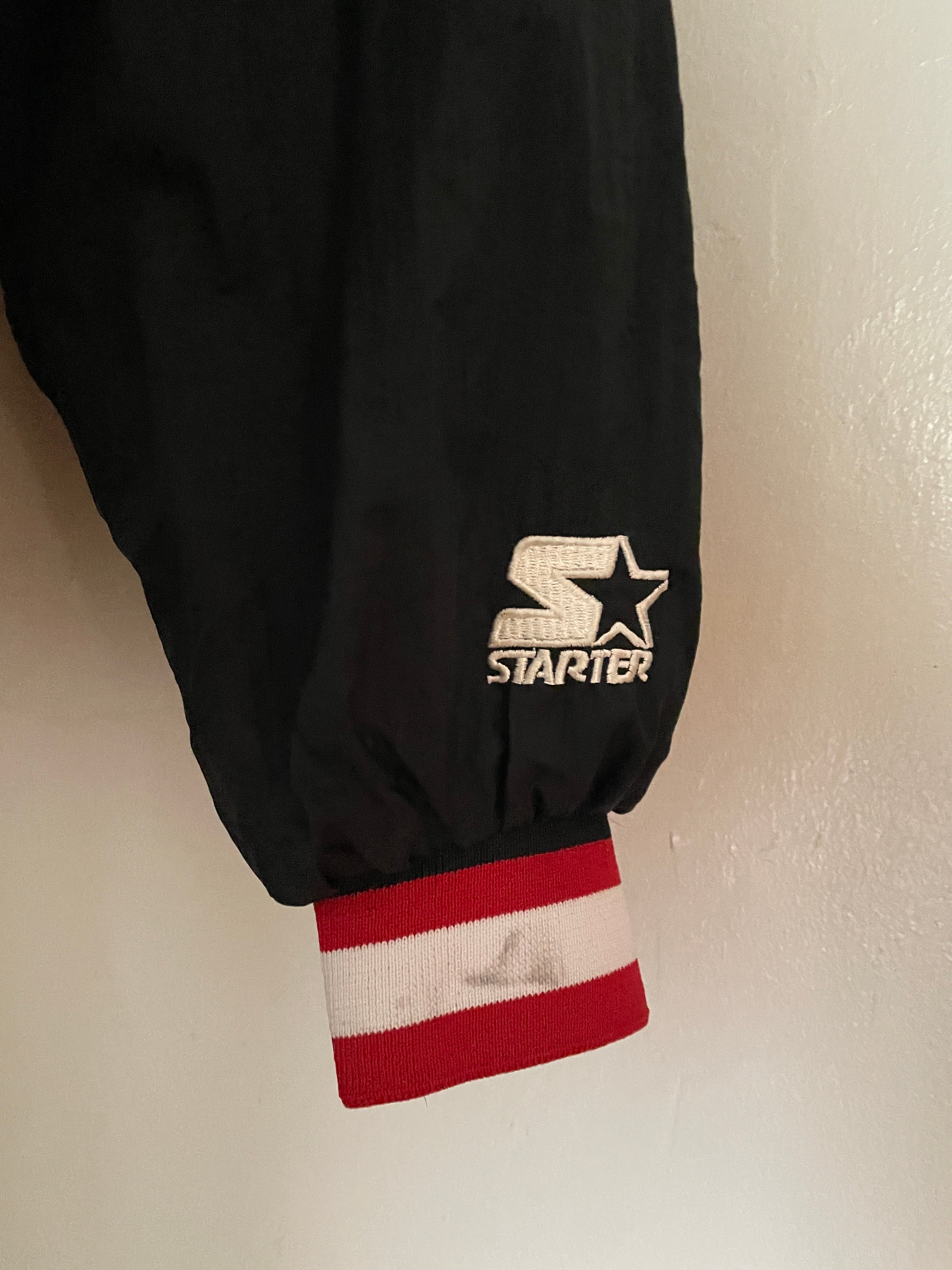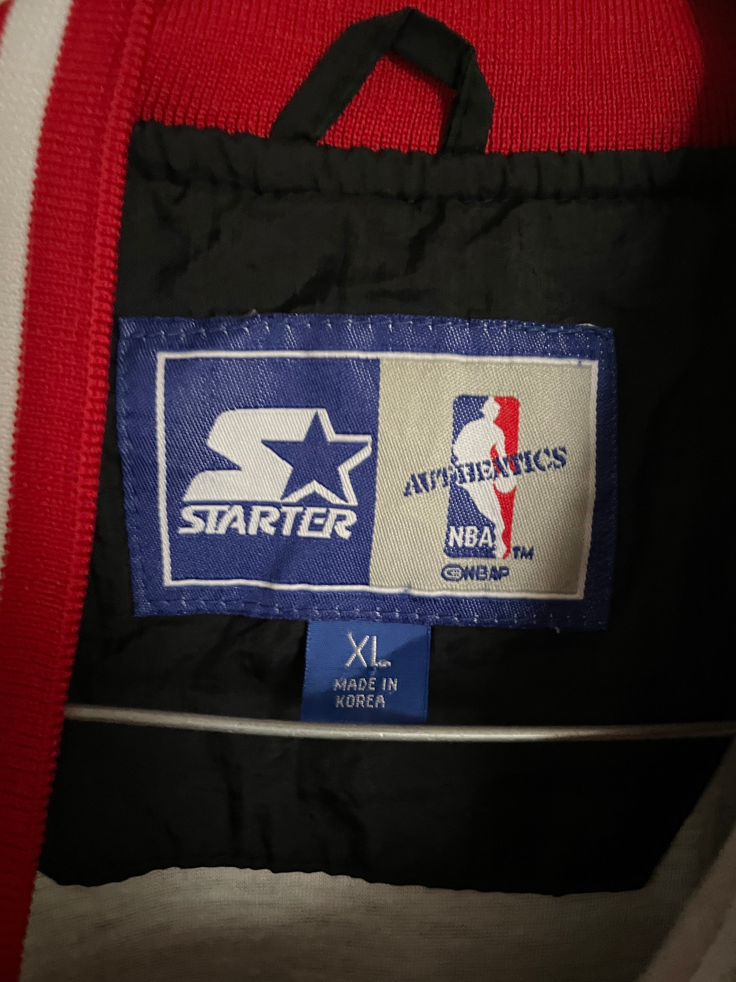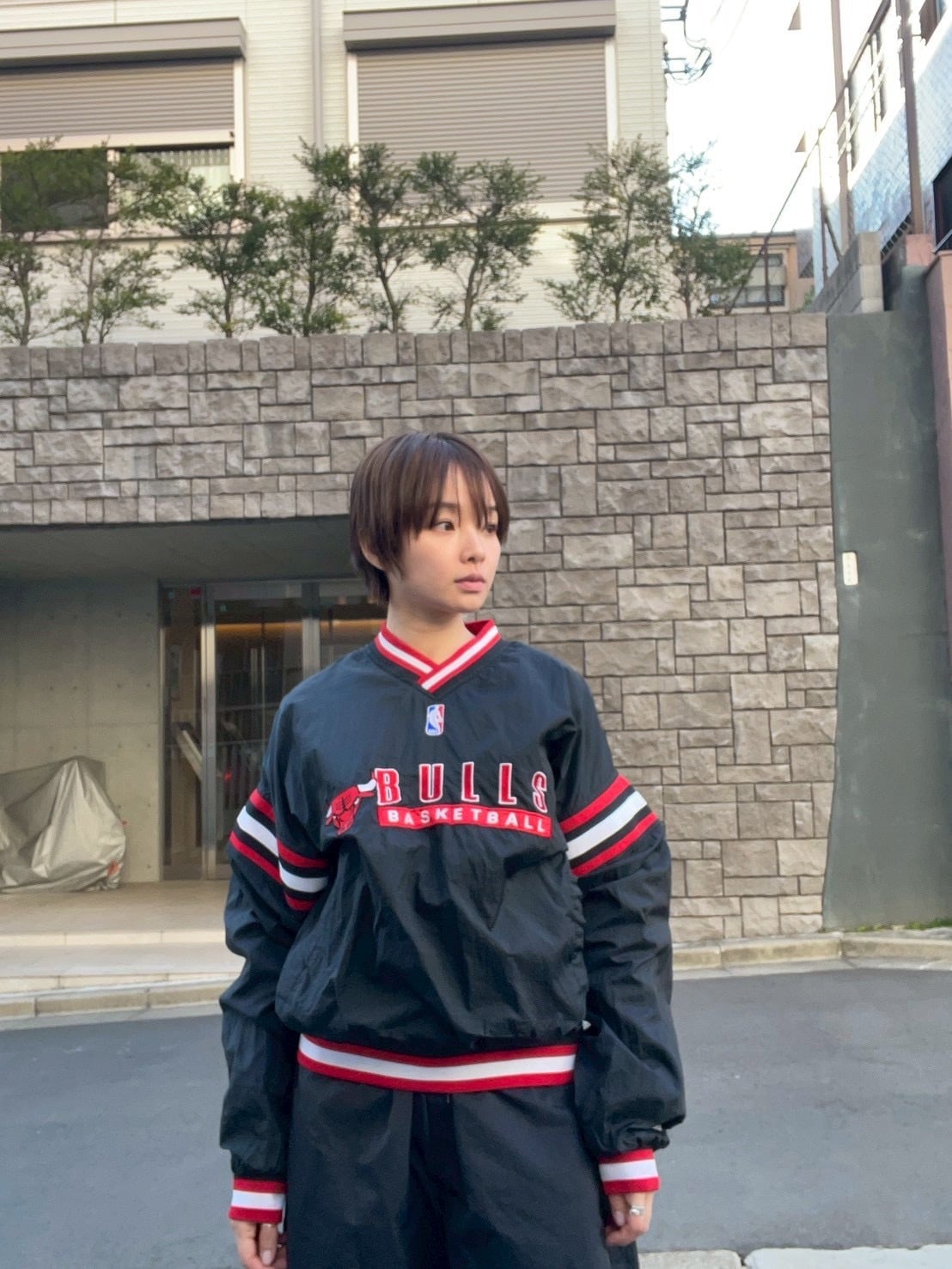 NBA黄金期の90sシカゴ・ブルズのナイロンプルオーバー。首元や袖口のリブにあしらわれたチームカラーのラインと、フロントの力強い刺繍ロゴが当時の空気感を象徴しています。スポーティーなVネック仕様は、インナーにパーカーやシャツを重ねるレイヤードスタイルとも相性抜群。
