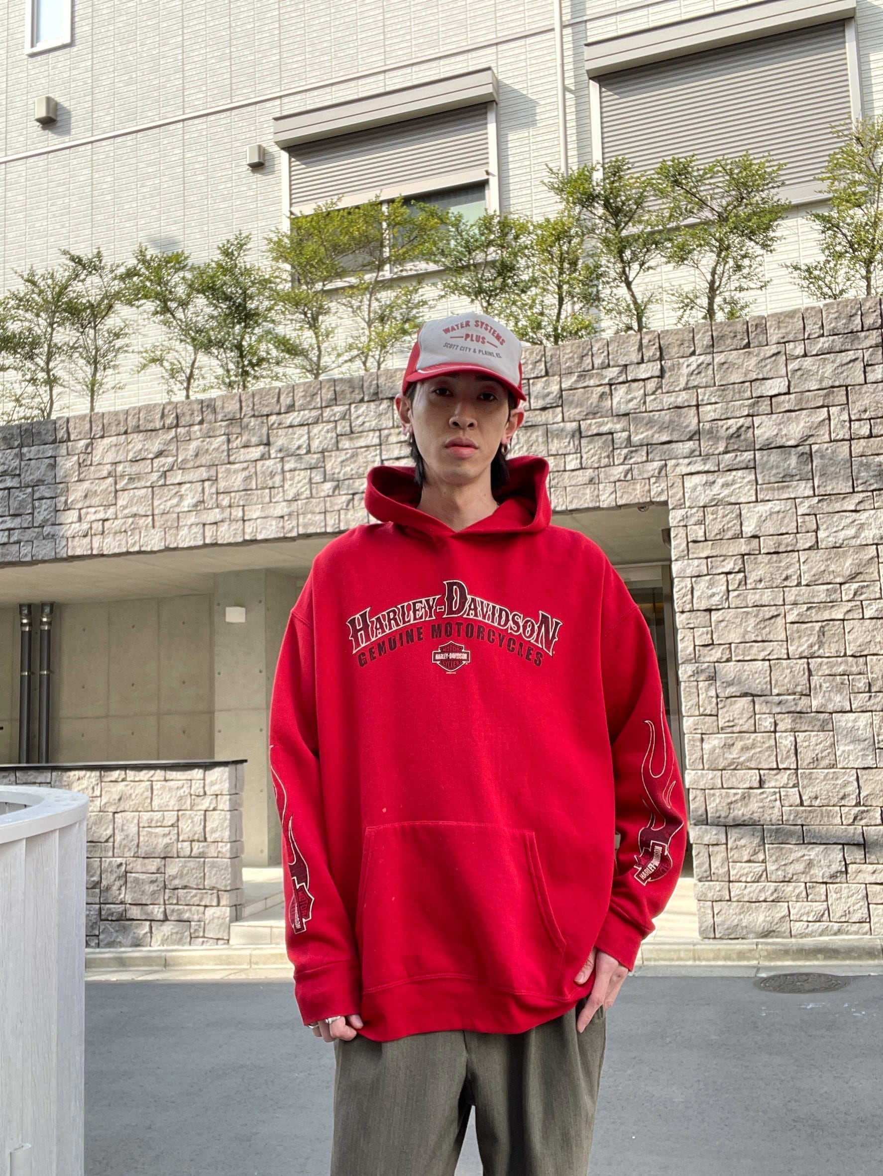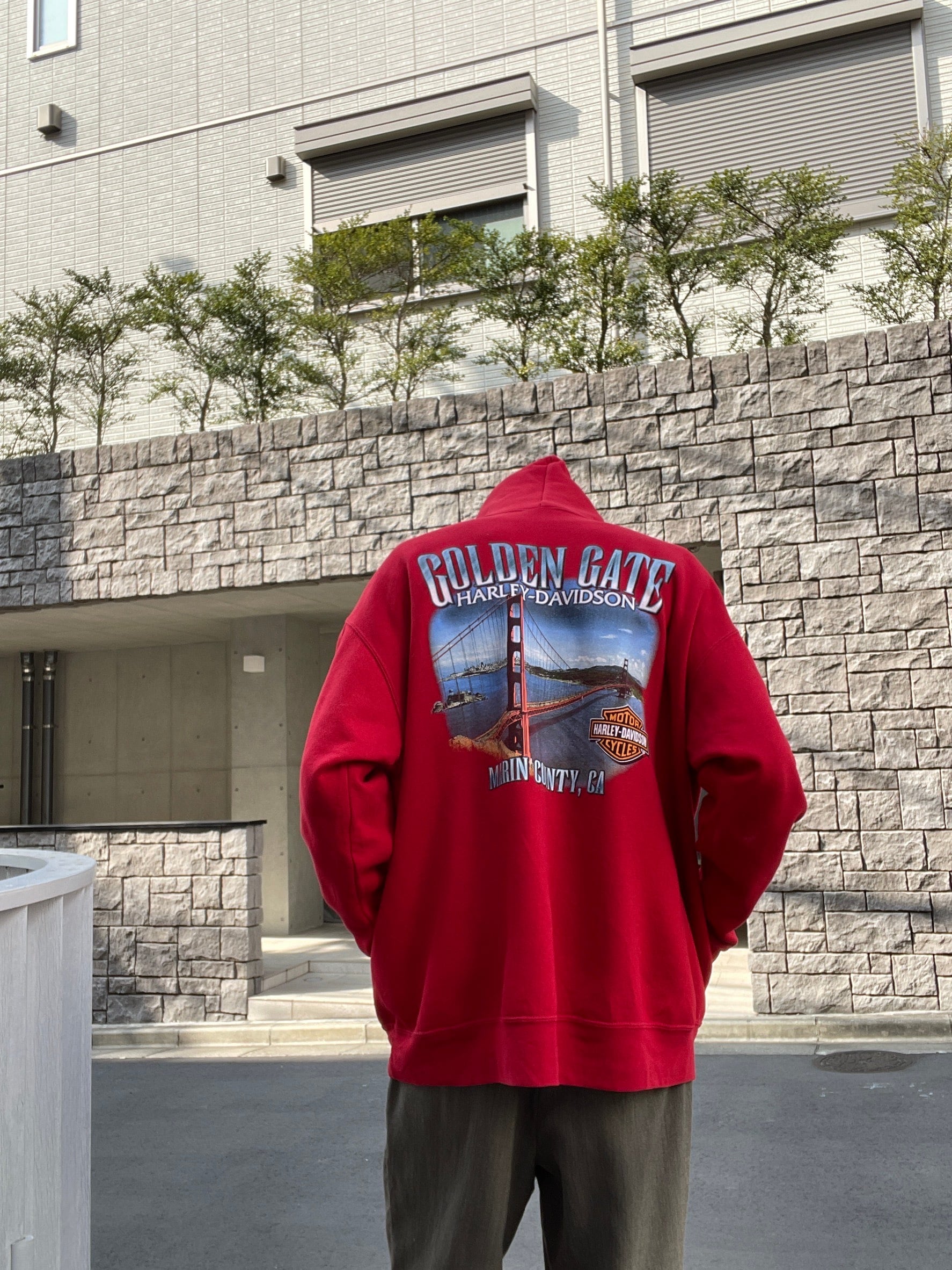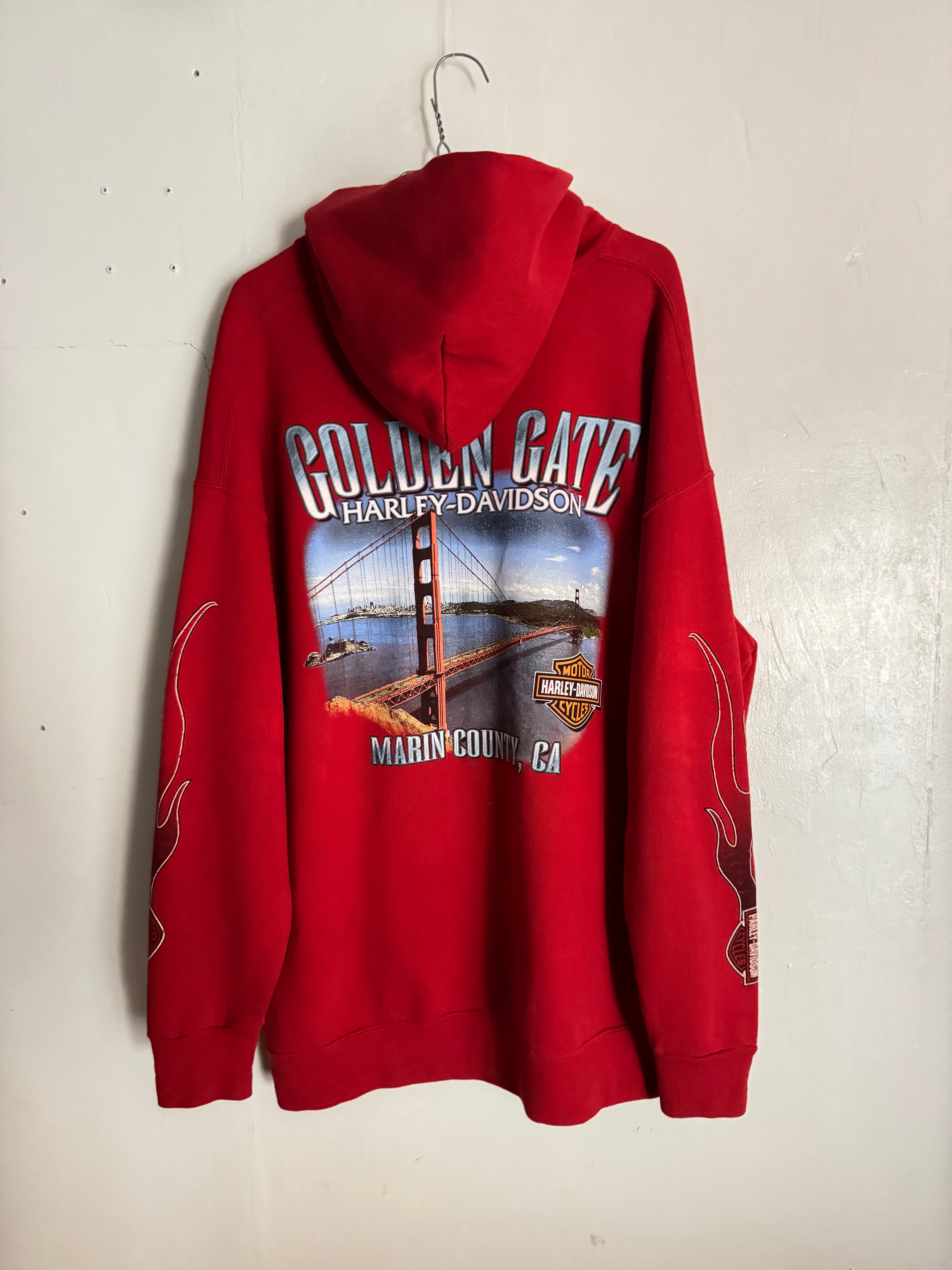 明るいレッドボディに、両面プリントが施された、ハーレーダビッドソンのパーカー。フロント部分はハーレーのネームプリント。バックにはサンフランシスコの象徴である、ゴールデンゲートブリッジのグラフィックプリント。両袖にはファイヤープリントも施されています。どの角度から見てもかっこいい一着です。ゆったりとしたサイズ感なので、ラフに着られるのも魅力的です。今の時期にはインナーの差し色としても活躍してくれそうです。春には主役になる事間違い無しです。