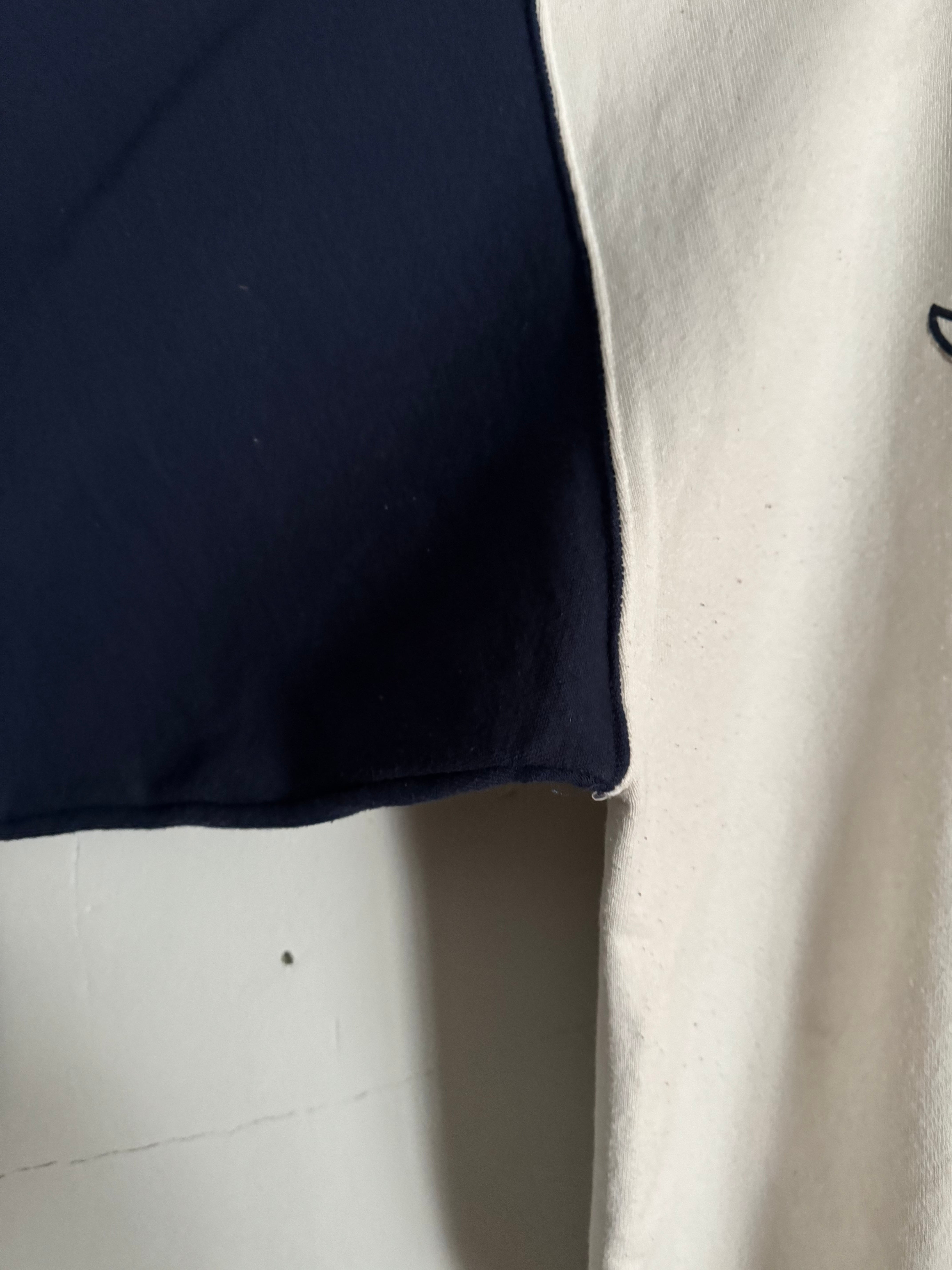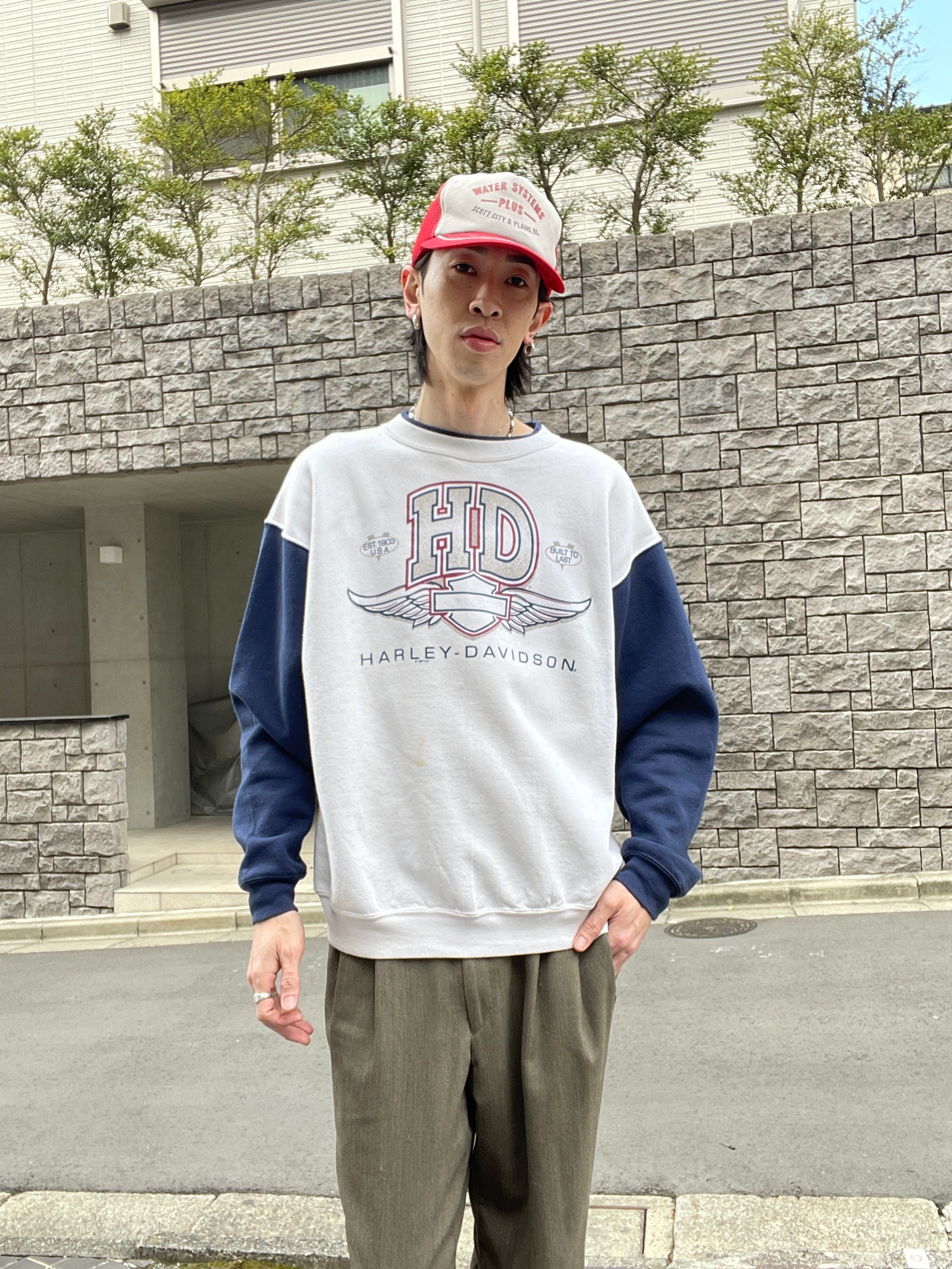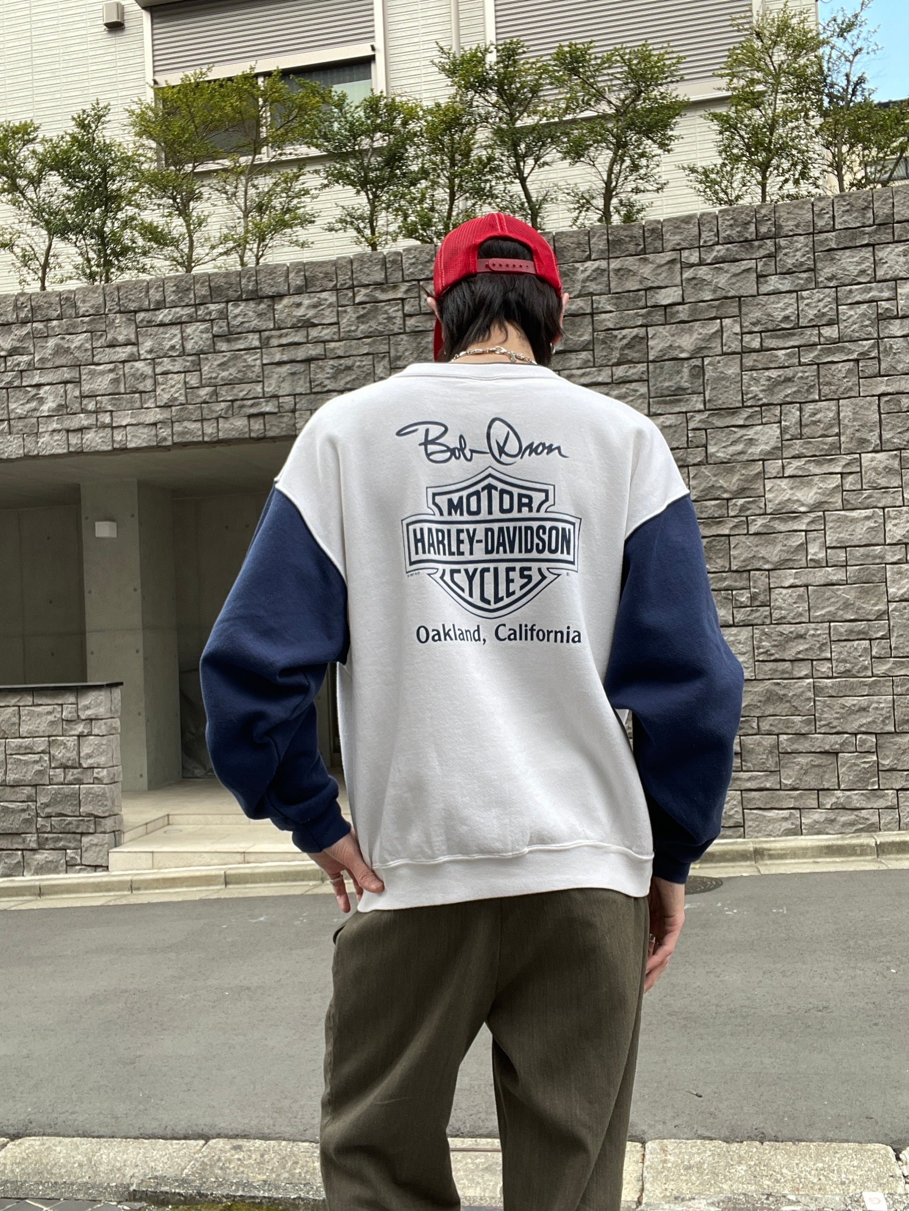 ホワイトボディで、袖がネイビーで切り替えられたデザインがお洒落な、ハーレーダビッドソンのスウェット。配色の良い両面プリント。ハーレーは派手めなものが物が多いですが、こちらはハーレーにしては控えめで珍しいデザインになっています。ダブルネック仕様なのも面白いです。ゆったりとしたサイズ感でラフに着られるのも魅力的です。USA製で97年のコピーライト入り。春には主役になってくれる一着です。
