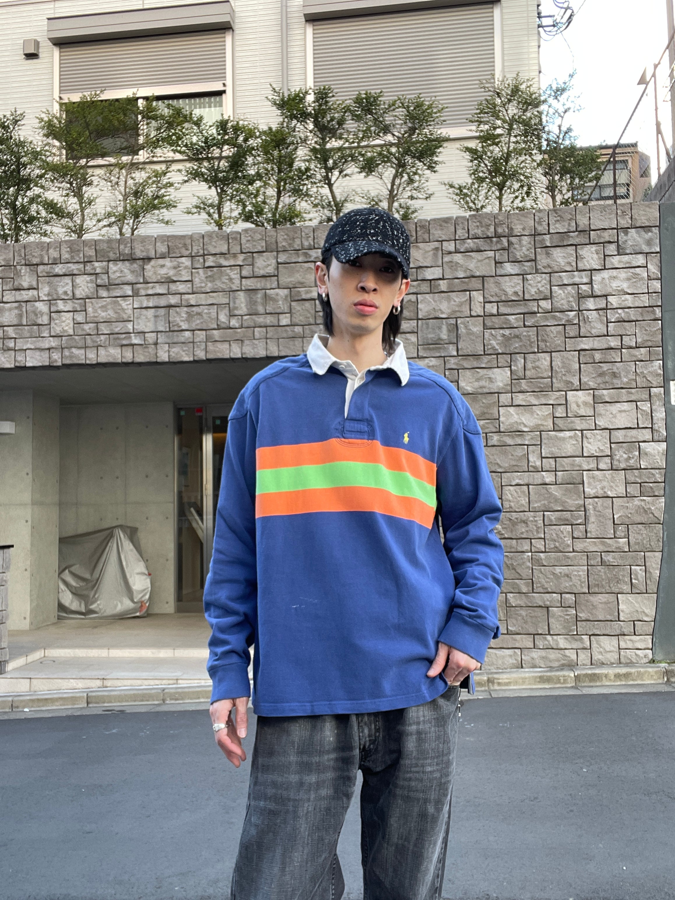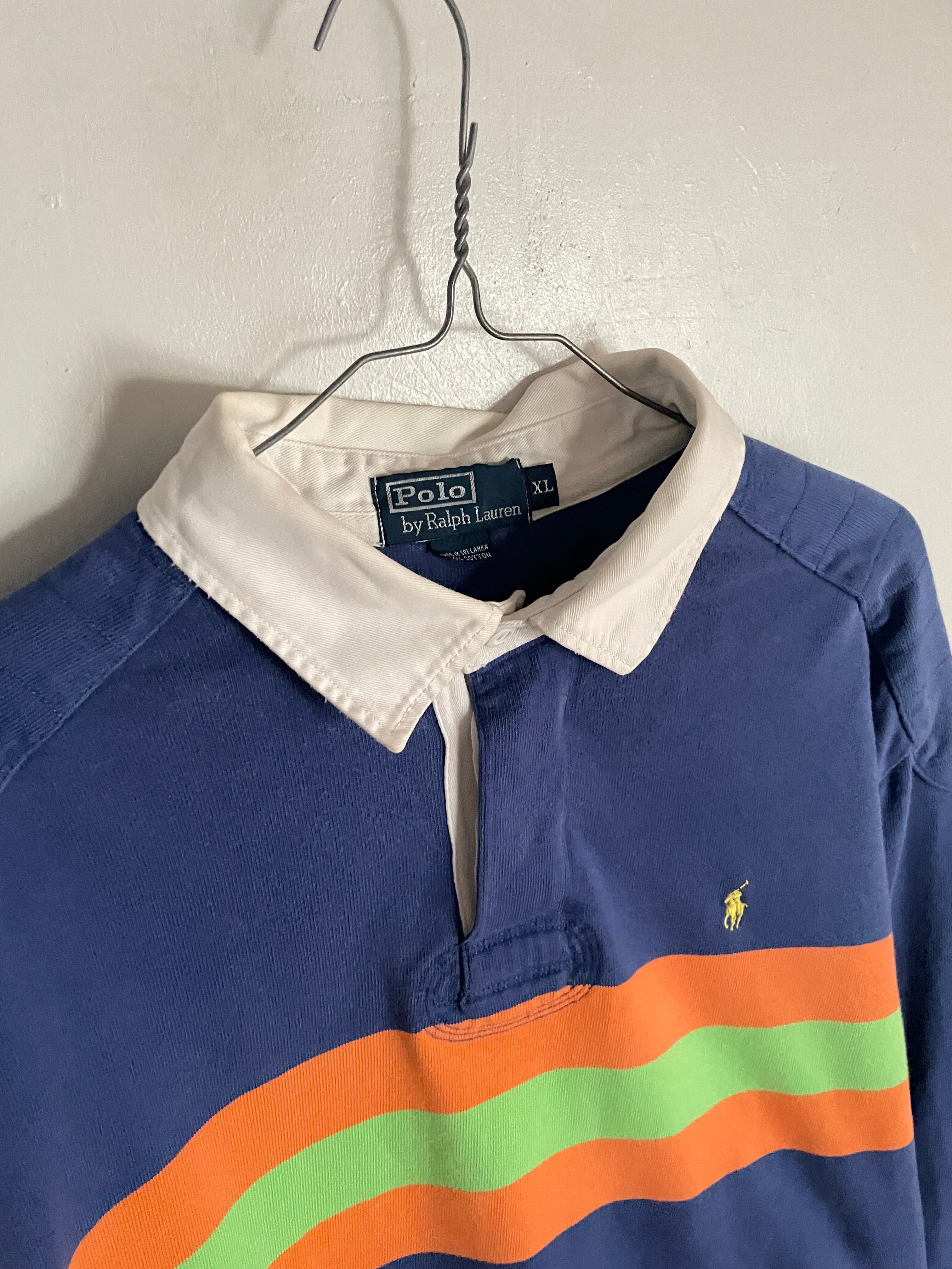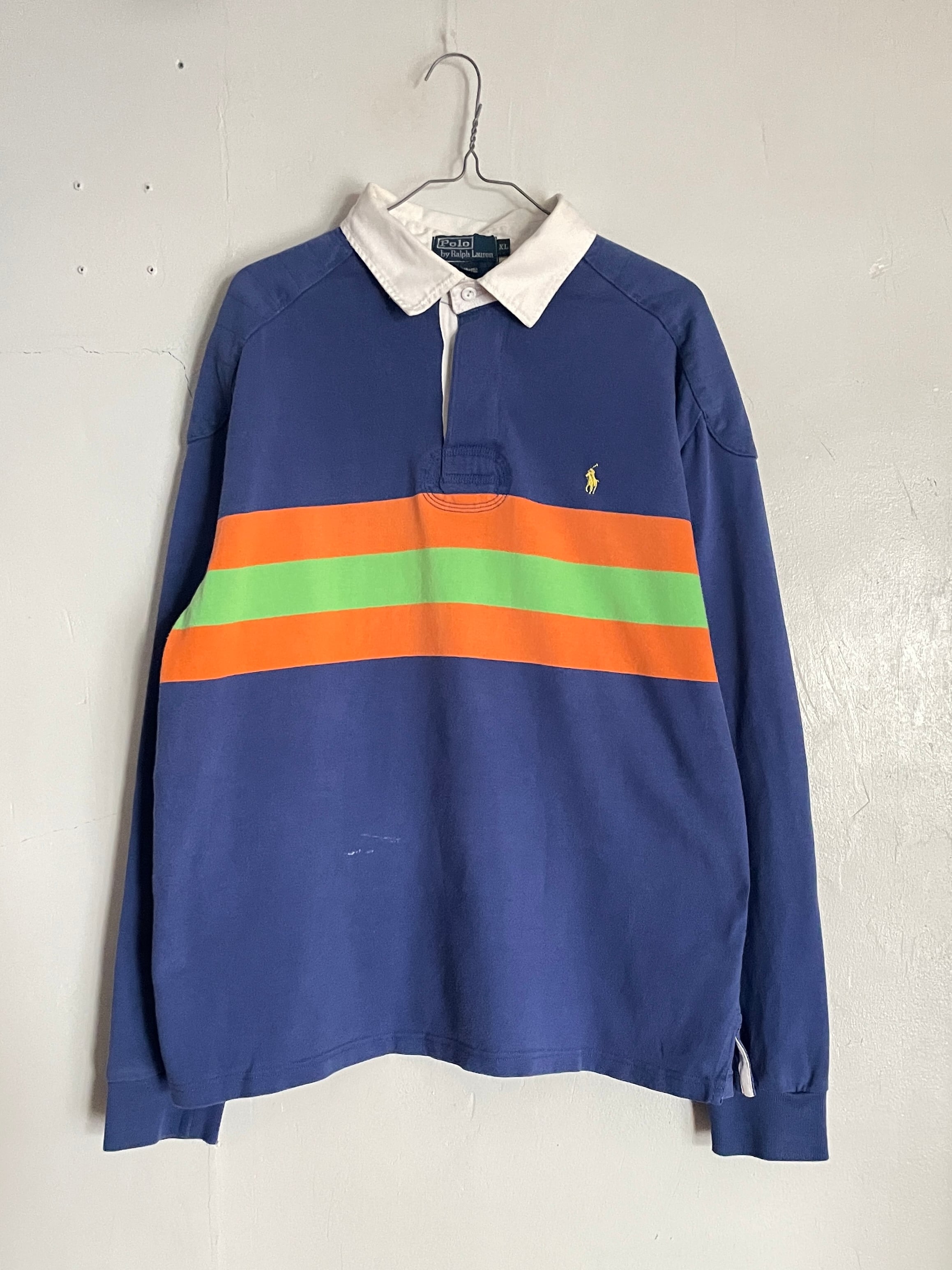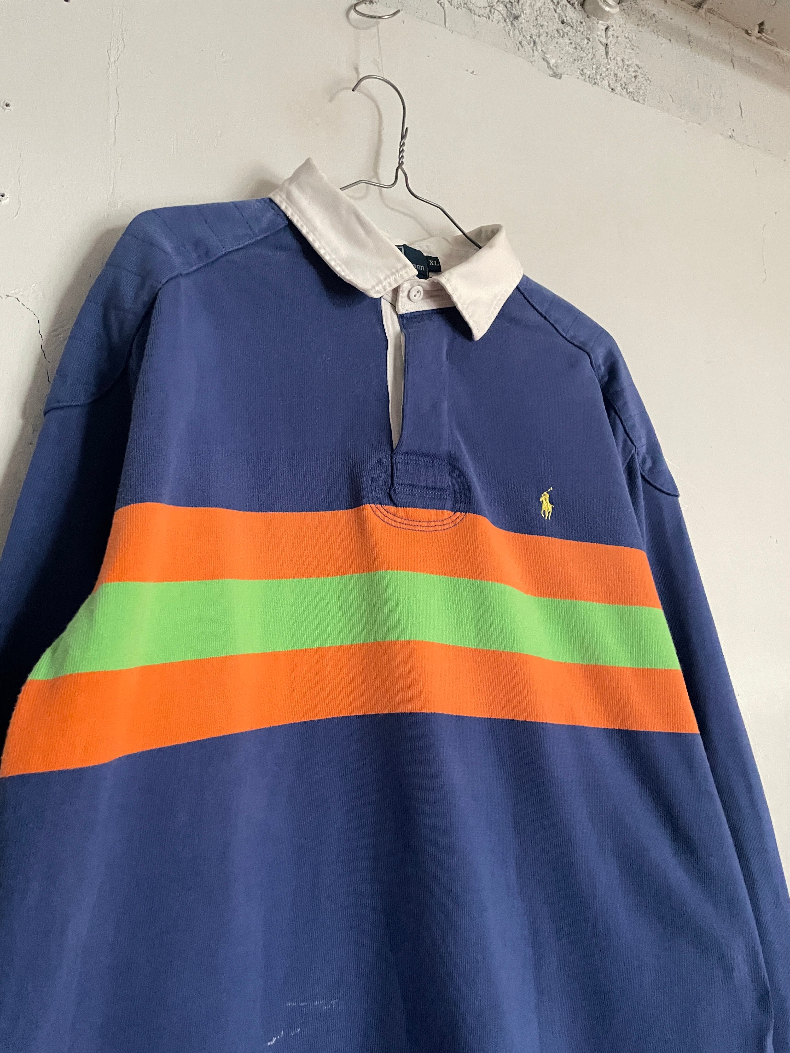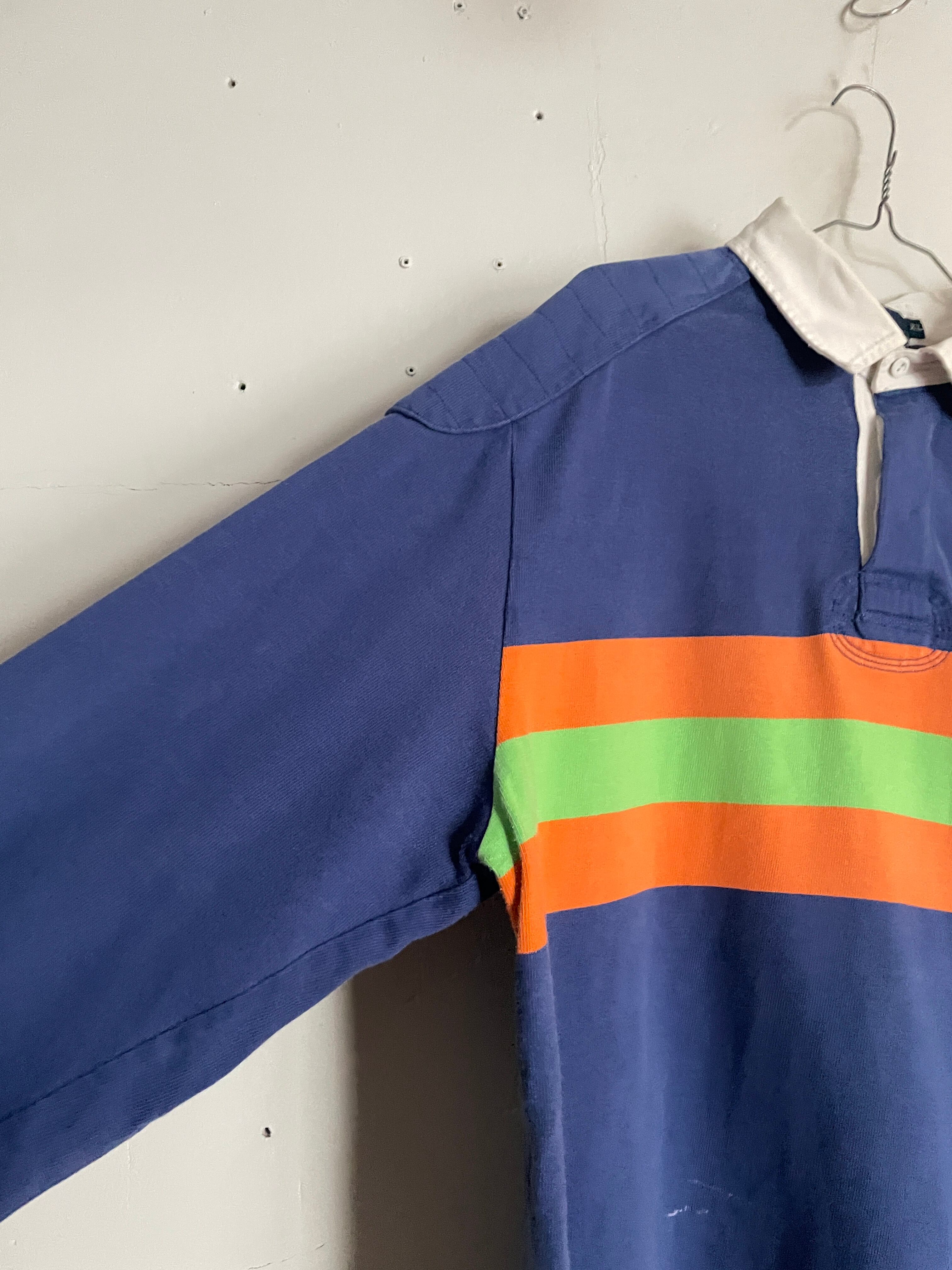ブルーボディをベースに、オレンジとグリーンの太めなボーダーデザインが施された、ラルフローレンのラガーシャツ。しっかりとしたタフなコットン素材。肘当てやショルダーパットが施されているのが、ラガーシャツの特徴です。スポーティーさとストリートな雰囲気がミックスしたお洒落な一着です。ゆったりとしたサイズ感で、春にはファッションの主役になってくれるアイテムです。所々に白いシミが見られますが、あまり気になりません。