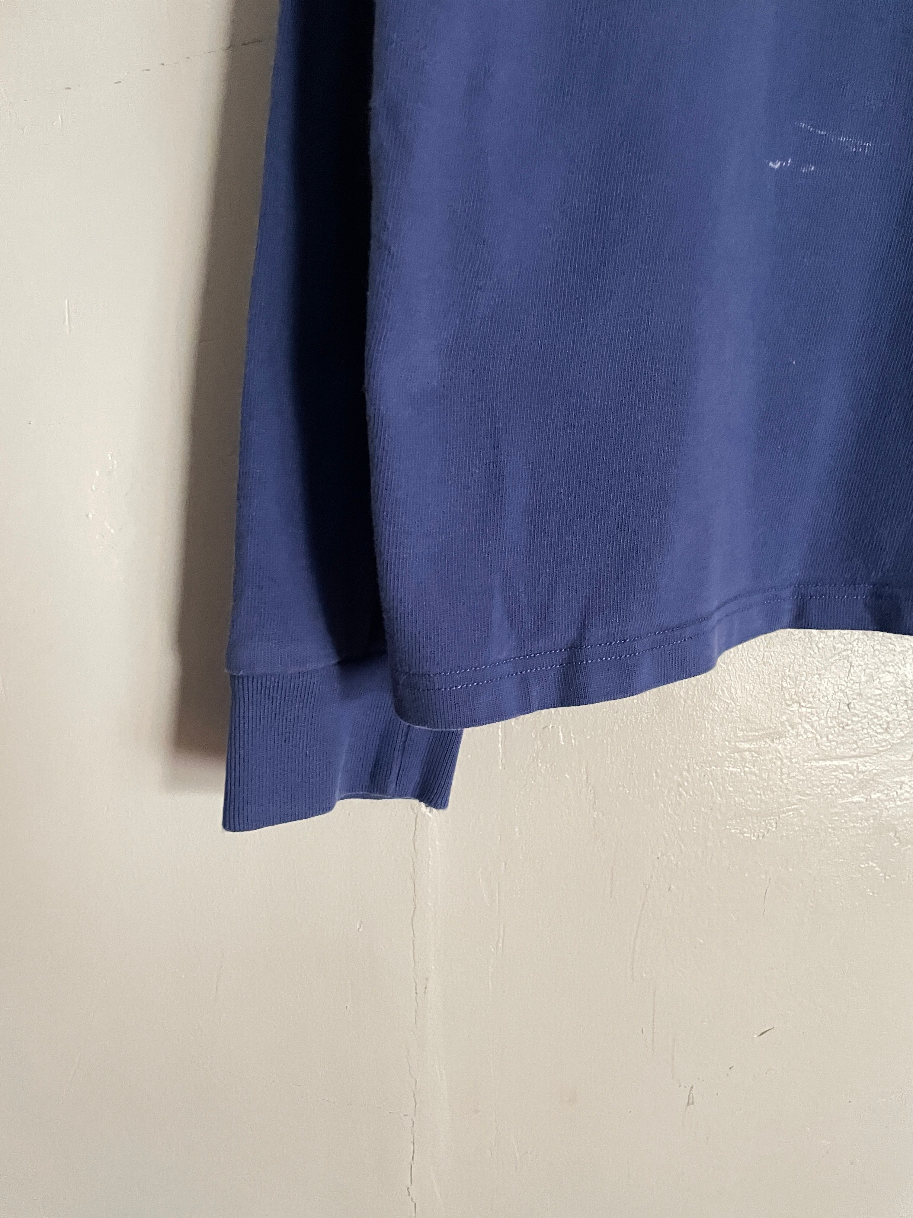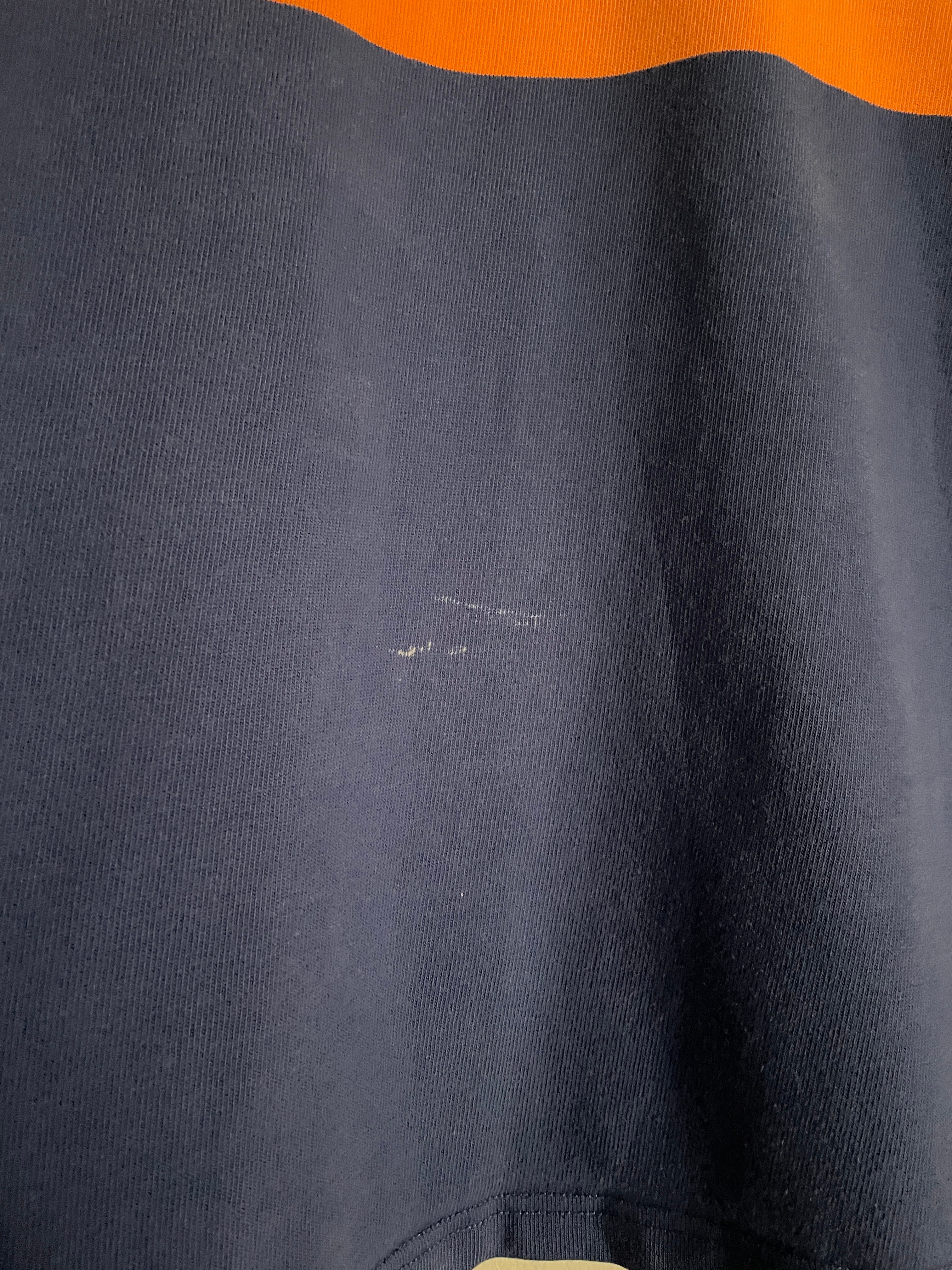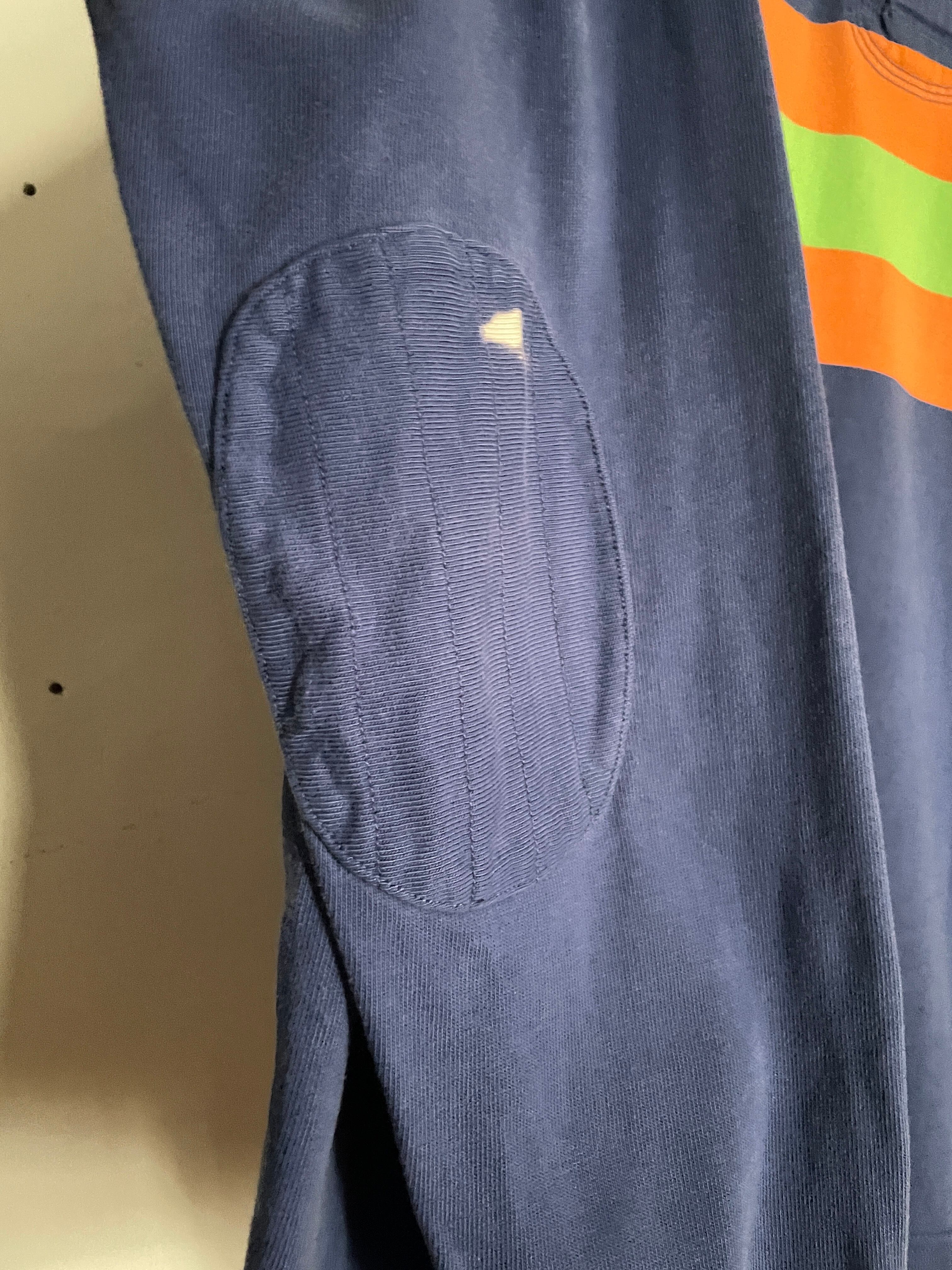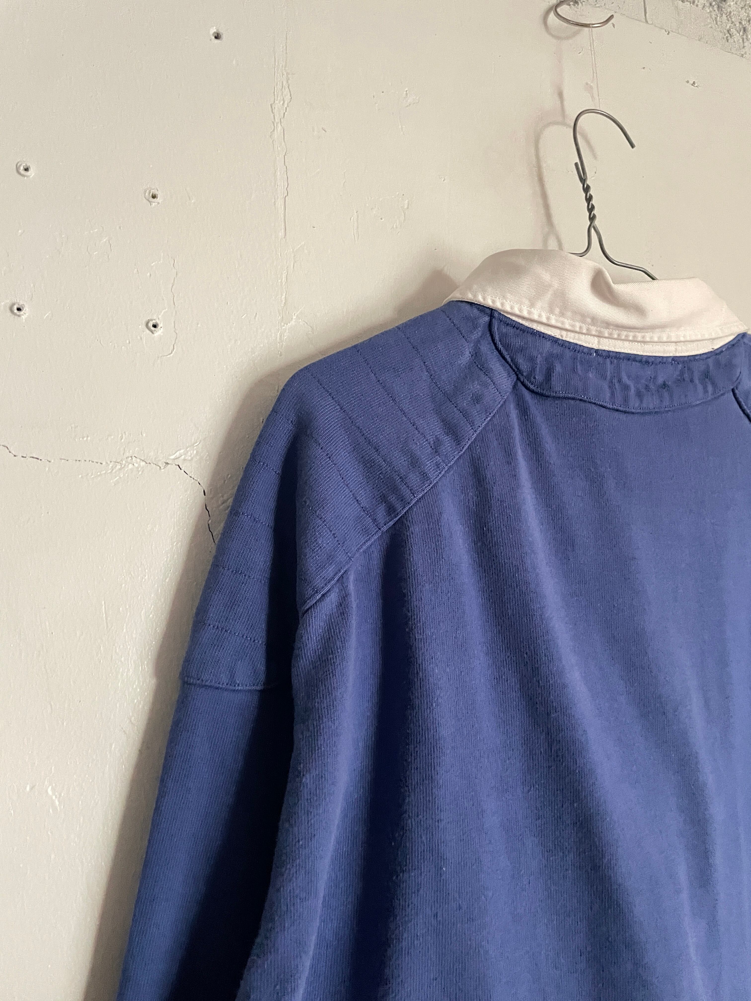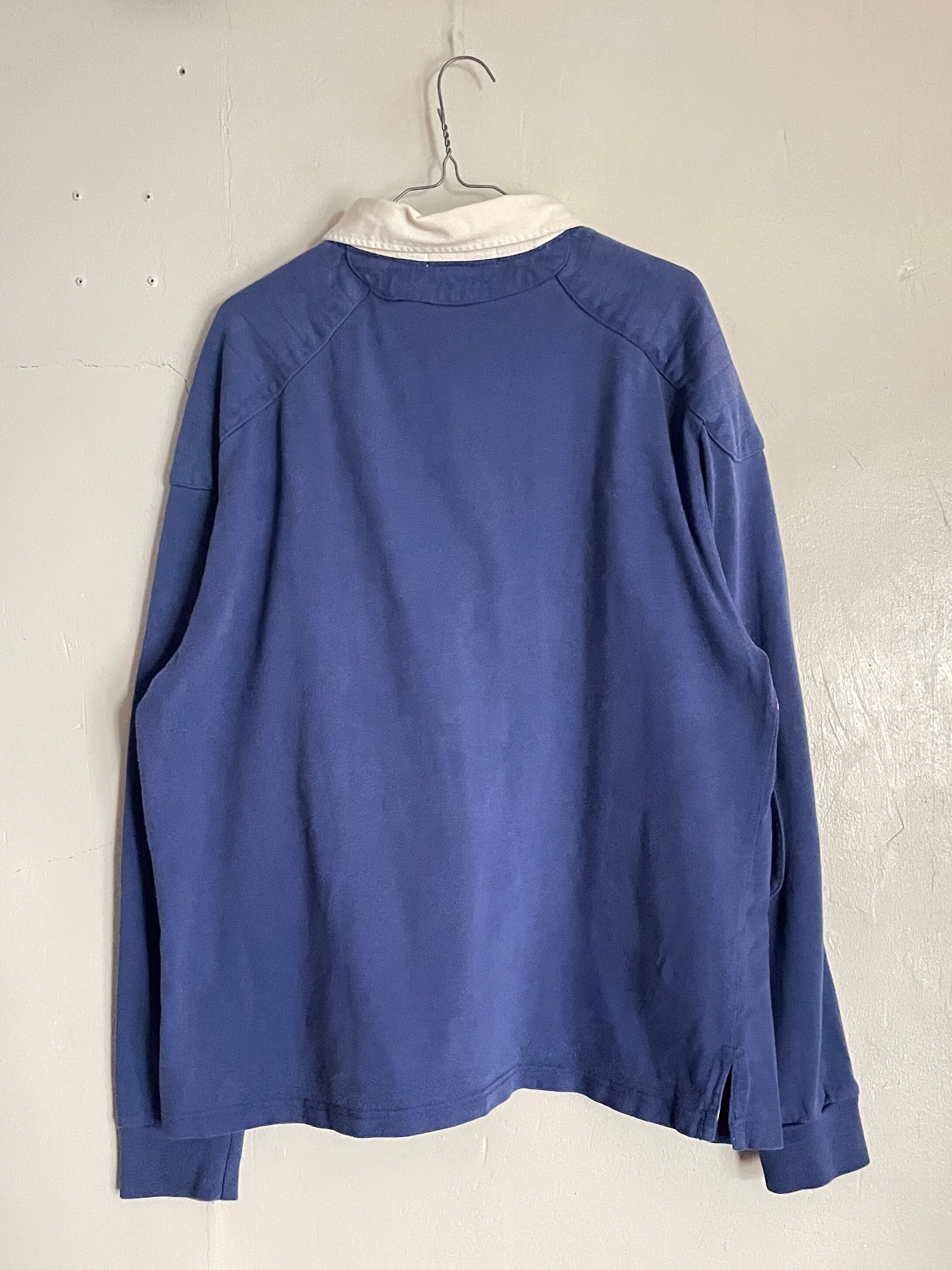 ブルーボディをベースに、オレンジとグリーンの太めなボーダーデザインが施された、ラルフローレンのラガーシャツ。しっかりとしたタフなコットン素材。肘当てやショルダーパットが施されているのが、ラガーシャツの特徴です。スポーティーさとストリートな雰囲気がミックスしたお洒落な一着です。ゆったりとしたサイズ感で、春にはファッションの主役になってくれるアイテムです。所々に白いシミが見られますが、あまり気になりません。