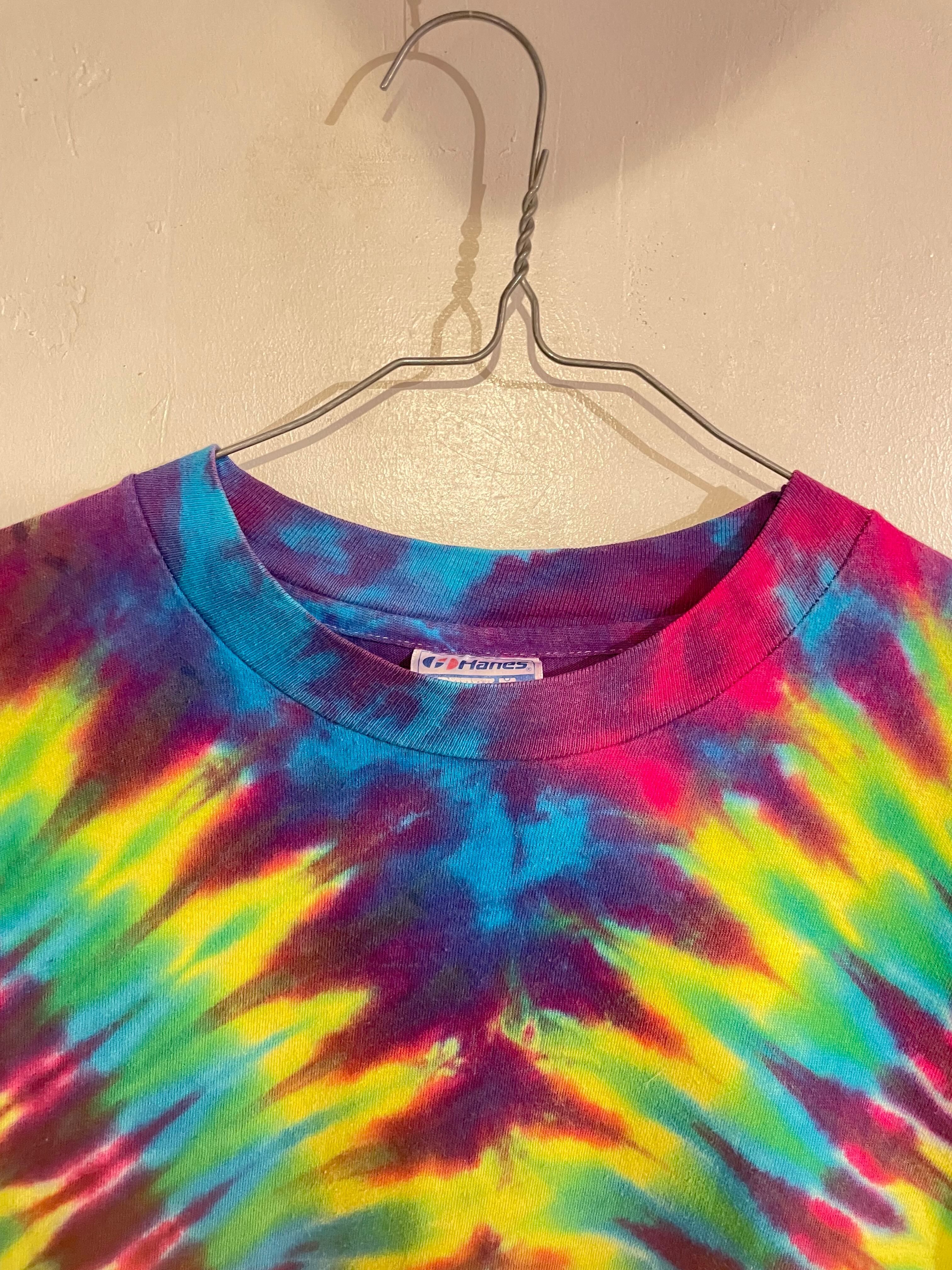 派手さのあるレインボーカラーが魅力的なタイダイ染めロンT。サイケデリックな雰囲気のある一着です。一枚でも雰囲気は抜群ですが、インナーなどで使って、レイヤードなどでも楽しめそうなアイテムです。ヘインズボディでUSA製なのもポイントが高いです。