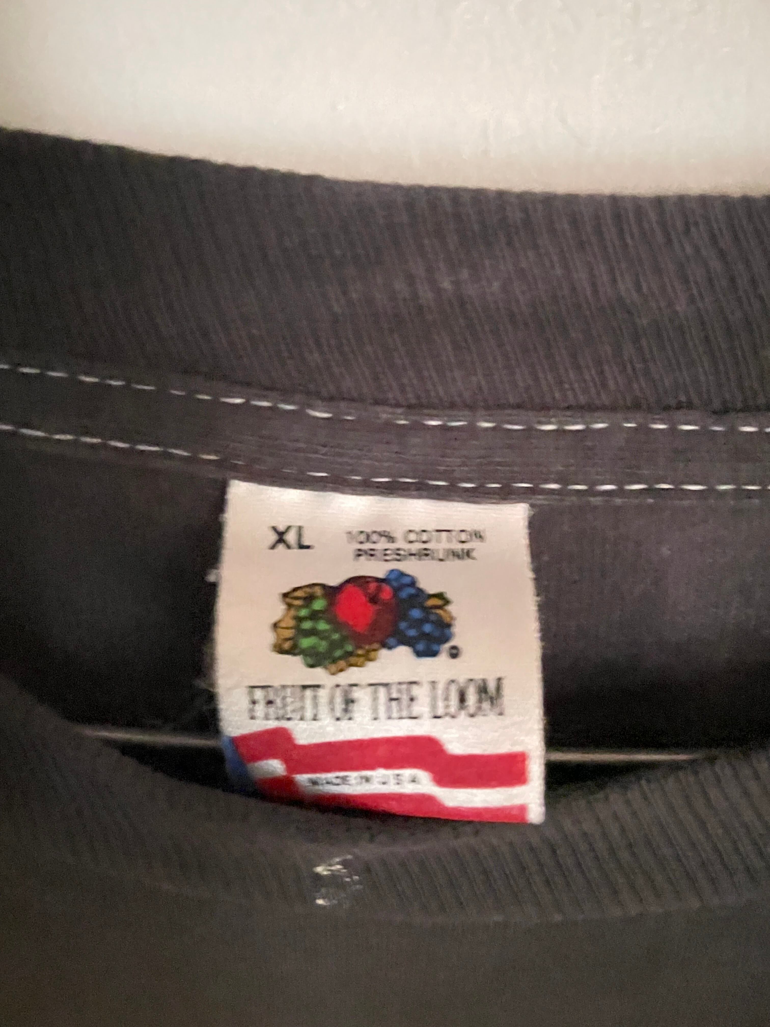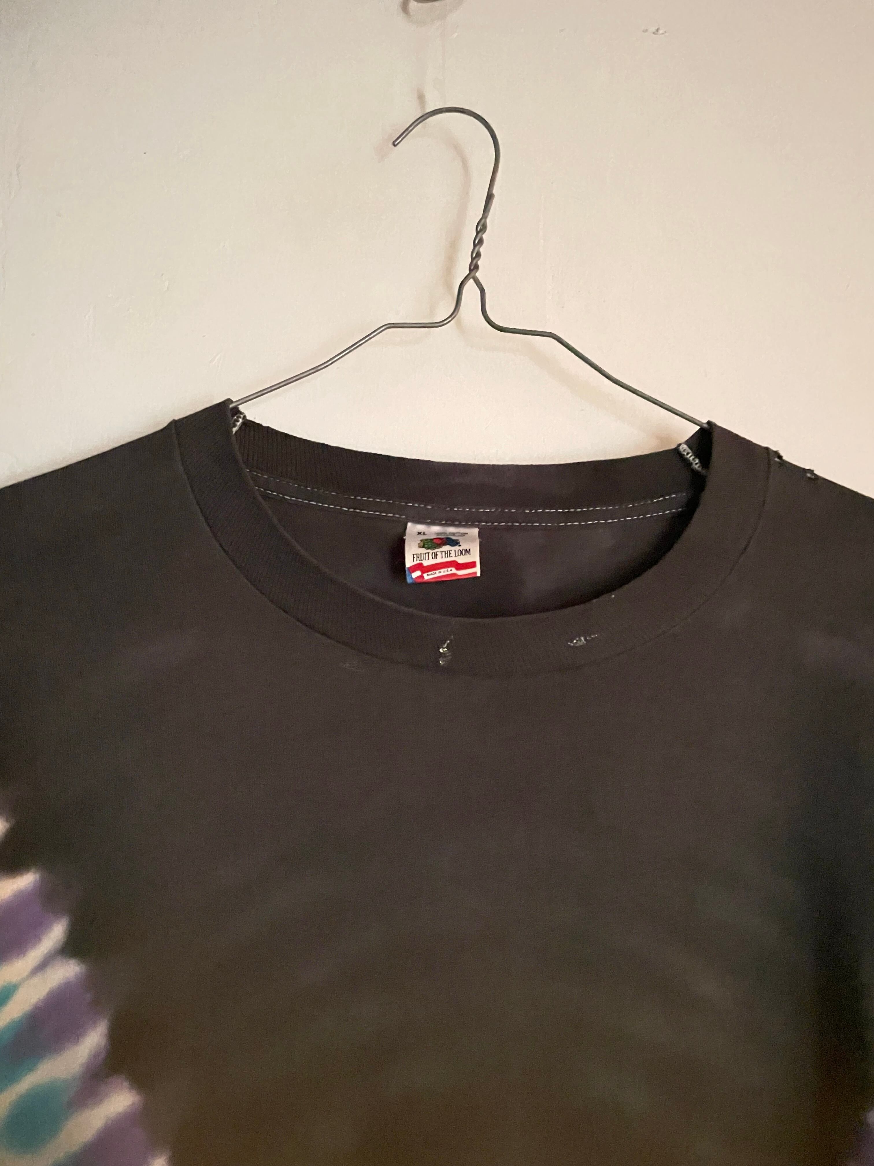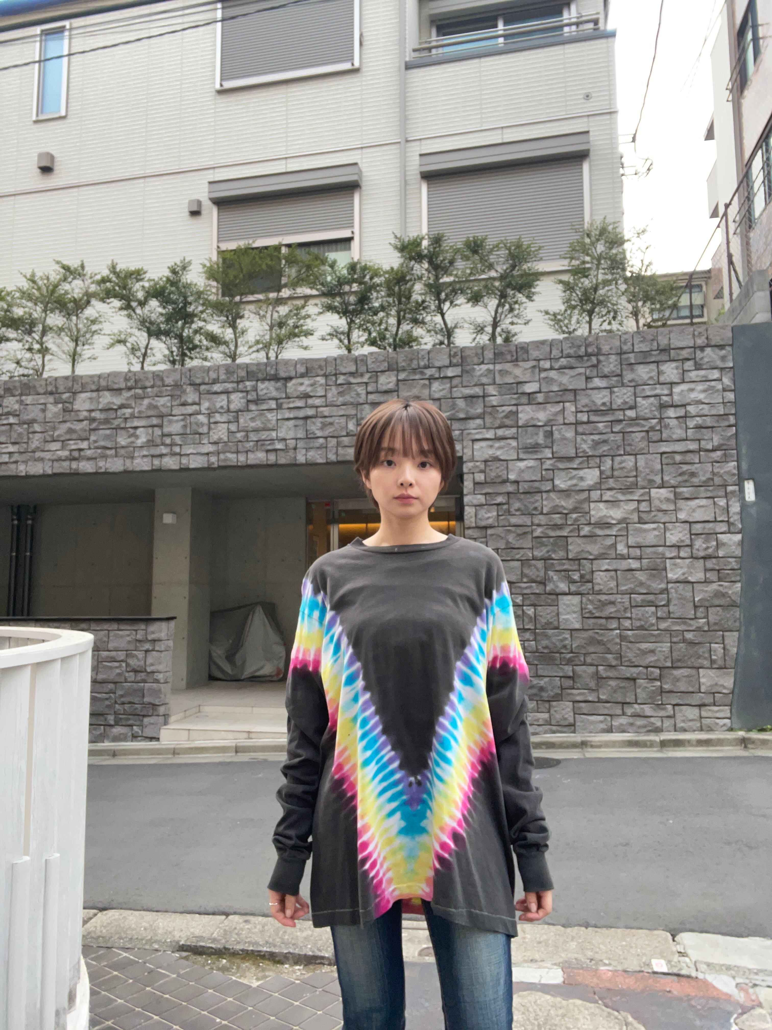 フェードしたブラックボディをベースに、V字型のタイダイ(絞り染め)デザインが施されたロンT。肩部分から中央に向かって上手くタイダイがデザインされています。一枚で雰囲気の出るアイテムです。インナーのレイヤードアイテムとしても活躍してくれそうです。ボディはフルーツオブザルームでUSA製。ゆったりとしたサイズ感なので、ラフに着られるのもポイントが高いです。所々に小さなダメージなどが見られますが、あまり気になりません。