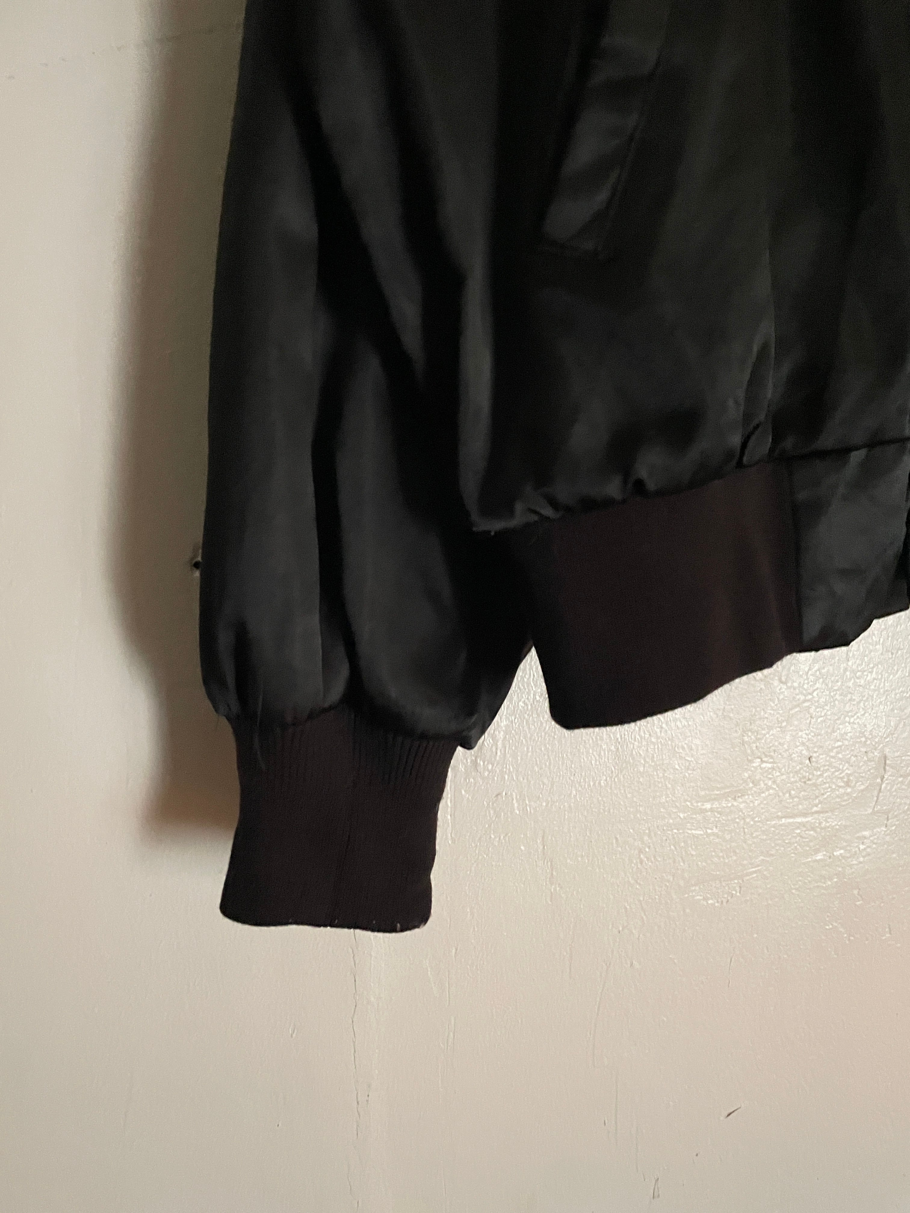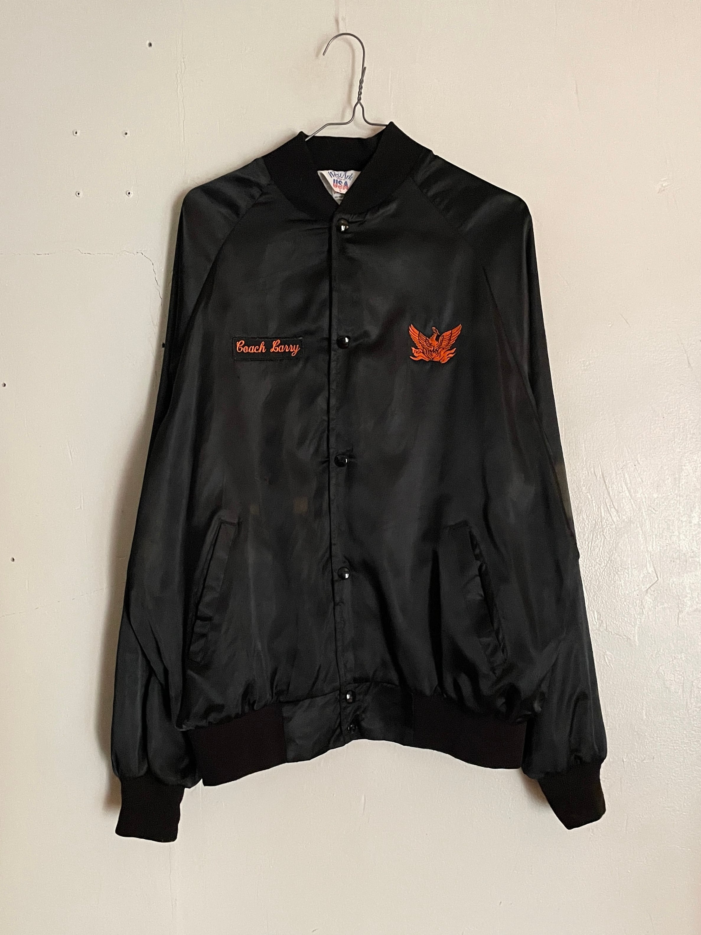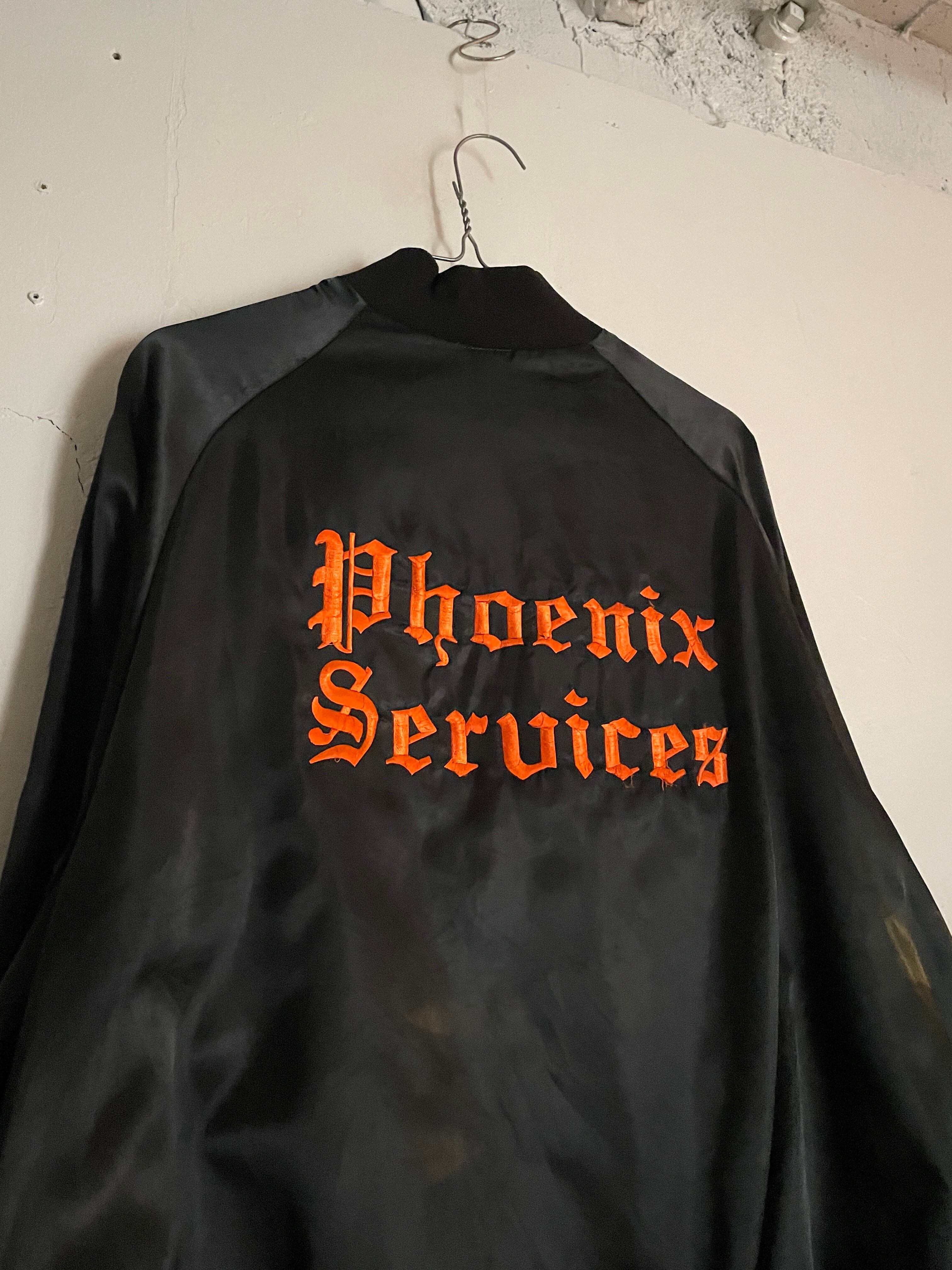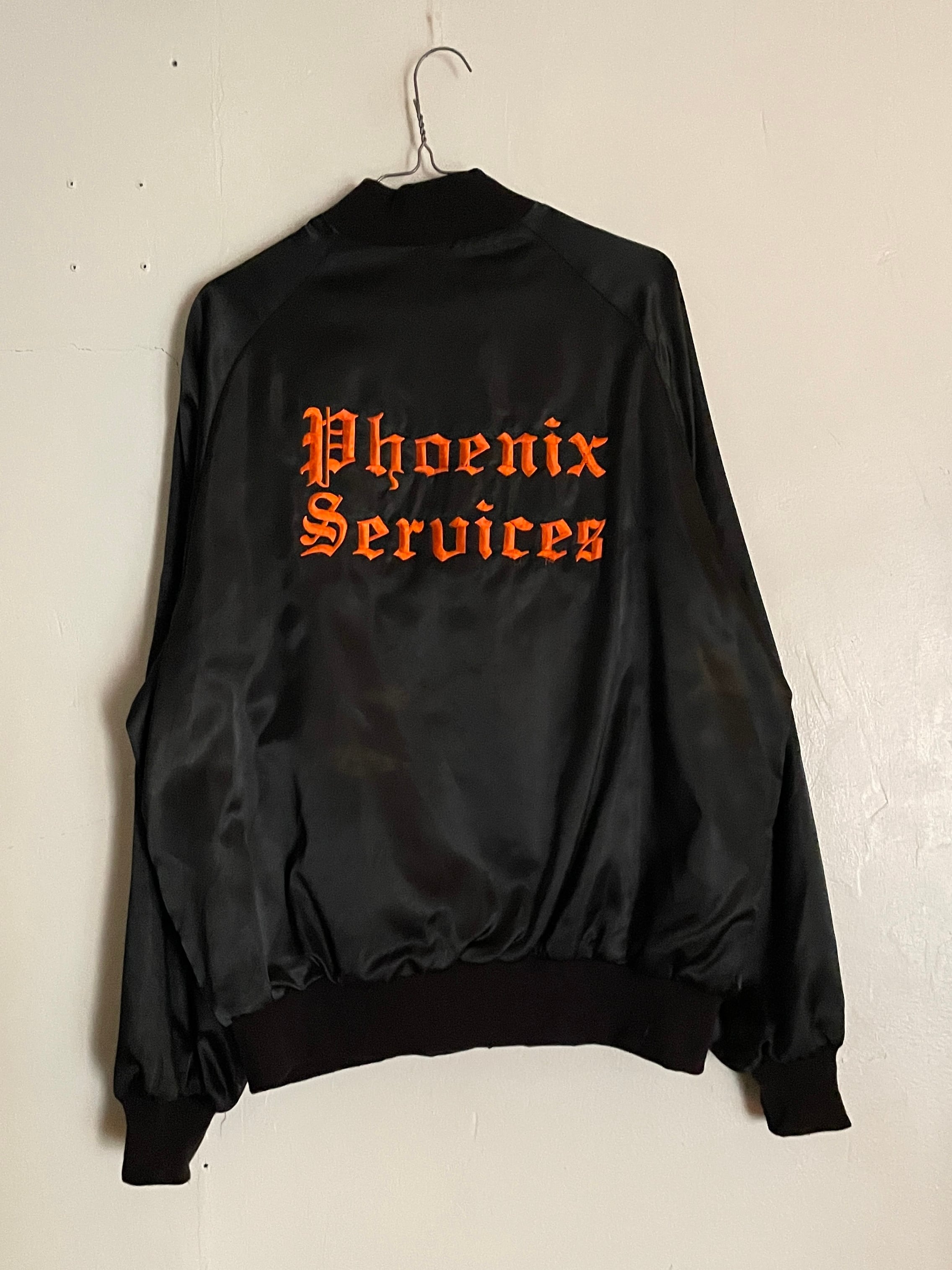 光沢のあるブラックボディに、オレンジカラーで、ワッペン、刺繍が施されたナイロンスナップブルゾン。ブラックとオレンジの相性は抜群ですね。フロントにはネームワッペンと、フェニックスワッペン。バックには”Phoenix Services"のデカ刺繍が施されています。ゆったりとしたサイズ感で、春には主役になってくれる一着かと思います。USA製なのもポイントが高いです。