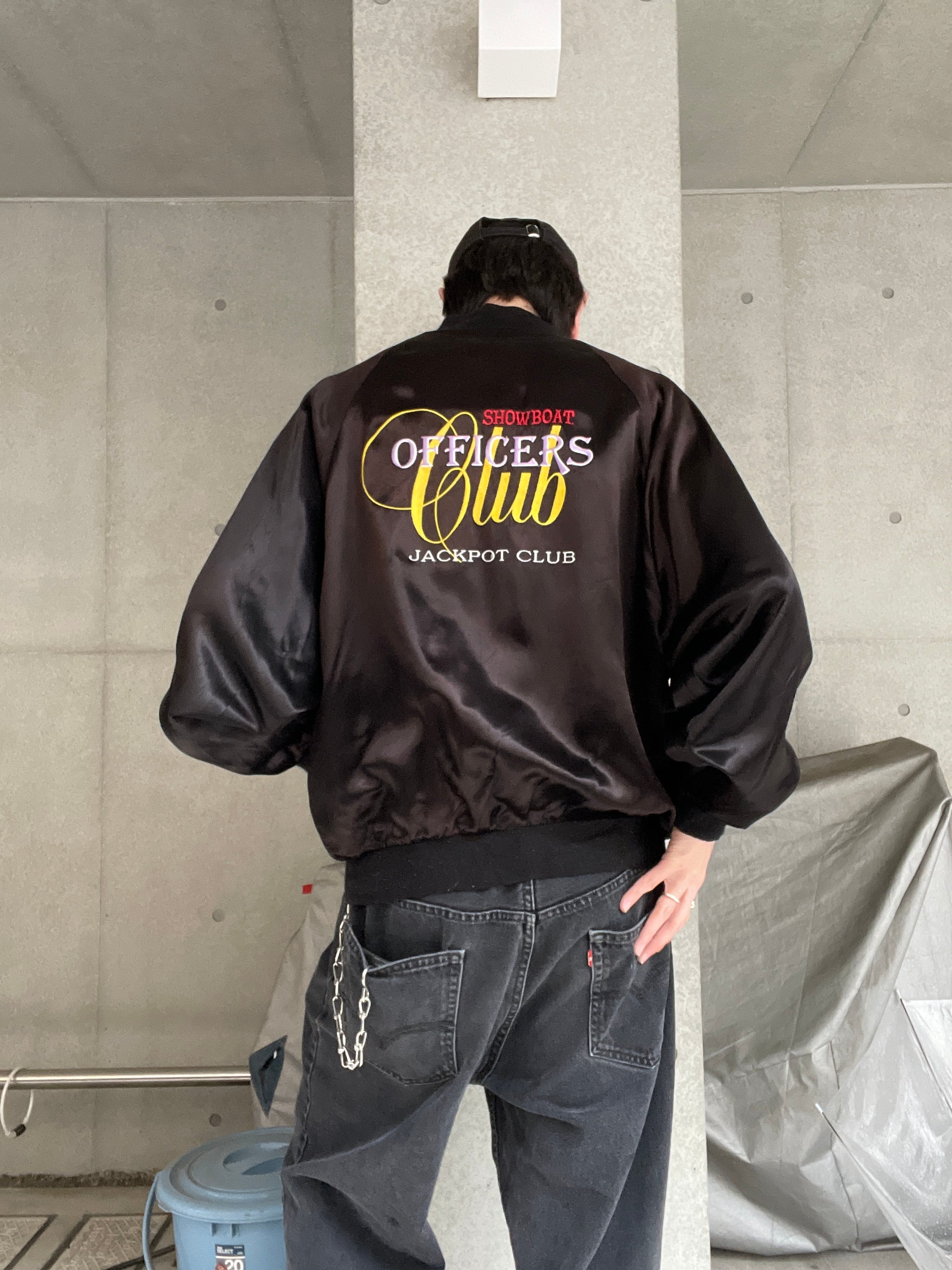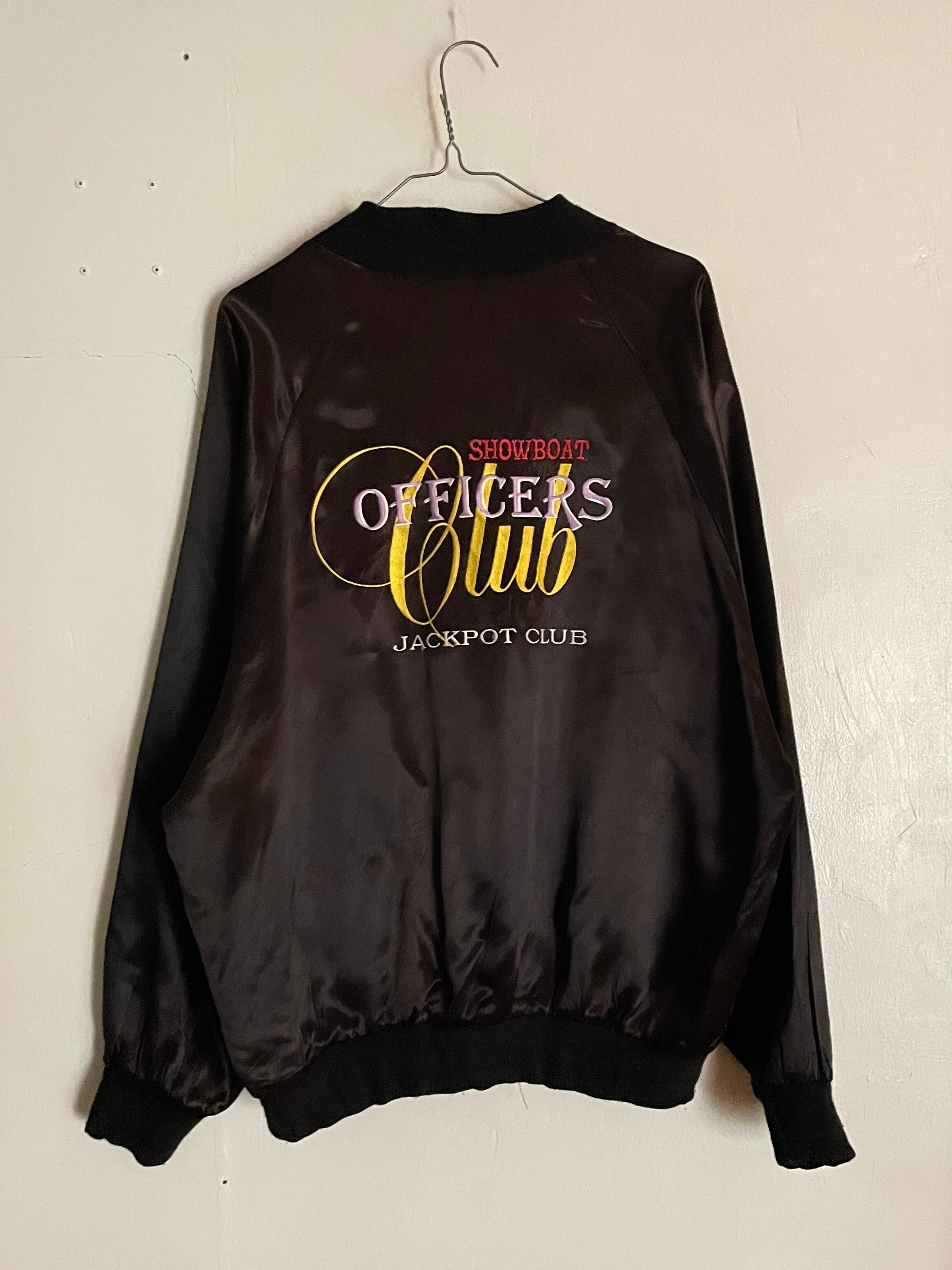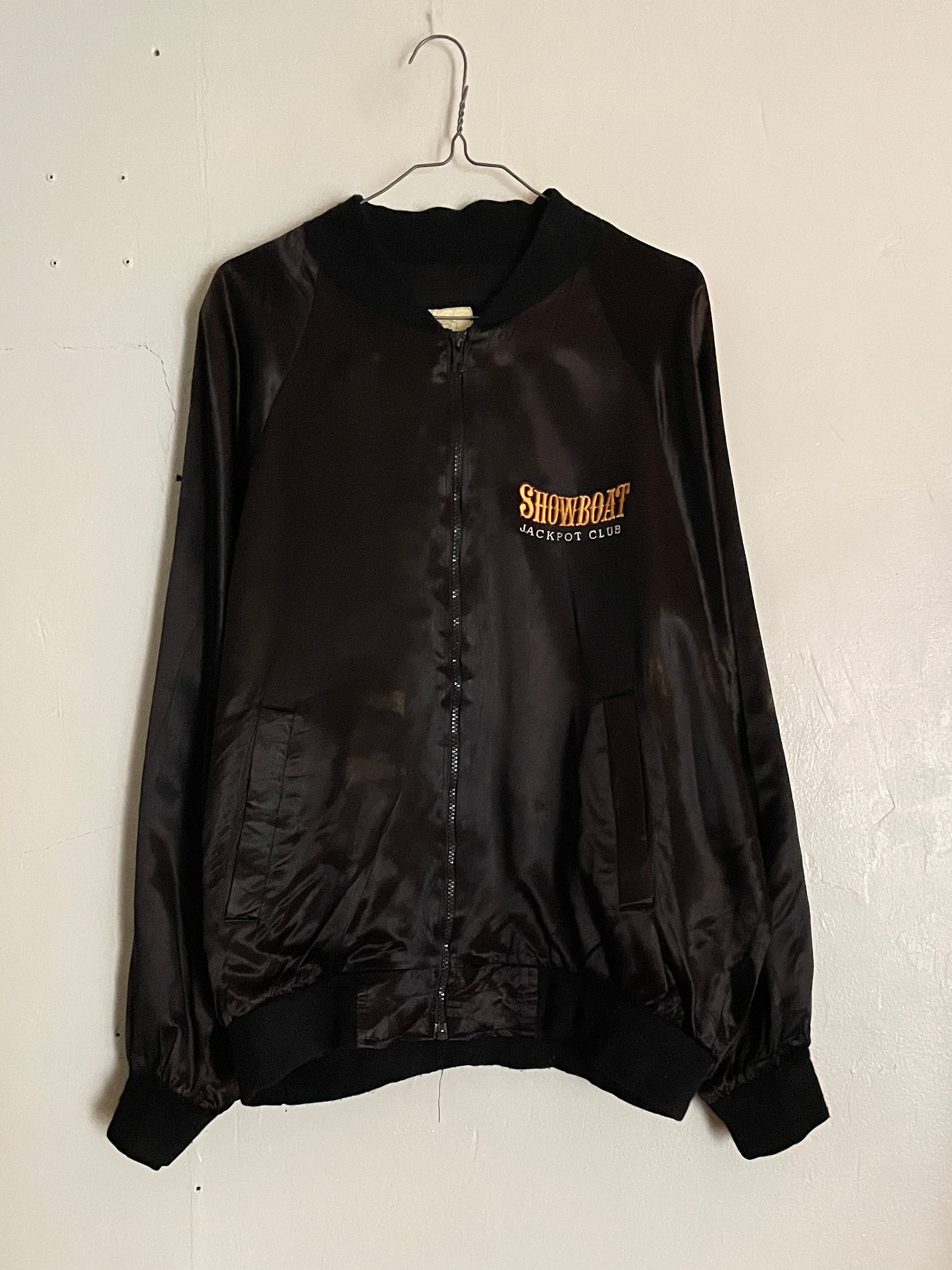 光沢のあるブラックボディに、かつてアメリカのラスベガスにあったカジノ”ショーボード”の刺繍が両面に施されたアセテートジップブルゾン。テロッとした軽めな素材感。フロント部分にはワンポイント。バックには配色がお洒落なデカ刺繍が施されています。前後でしっかりとメリハリのあるデザインがグッドです。ゆったりとしたサイズ感なのでラフに着られるのも魅力的です。春には主役になってくれるアイテムです。USA製なのもポイントが高いです。