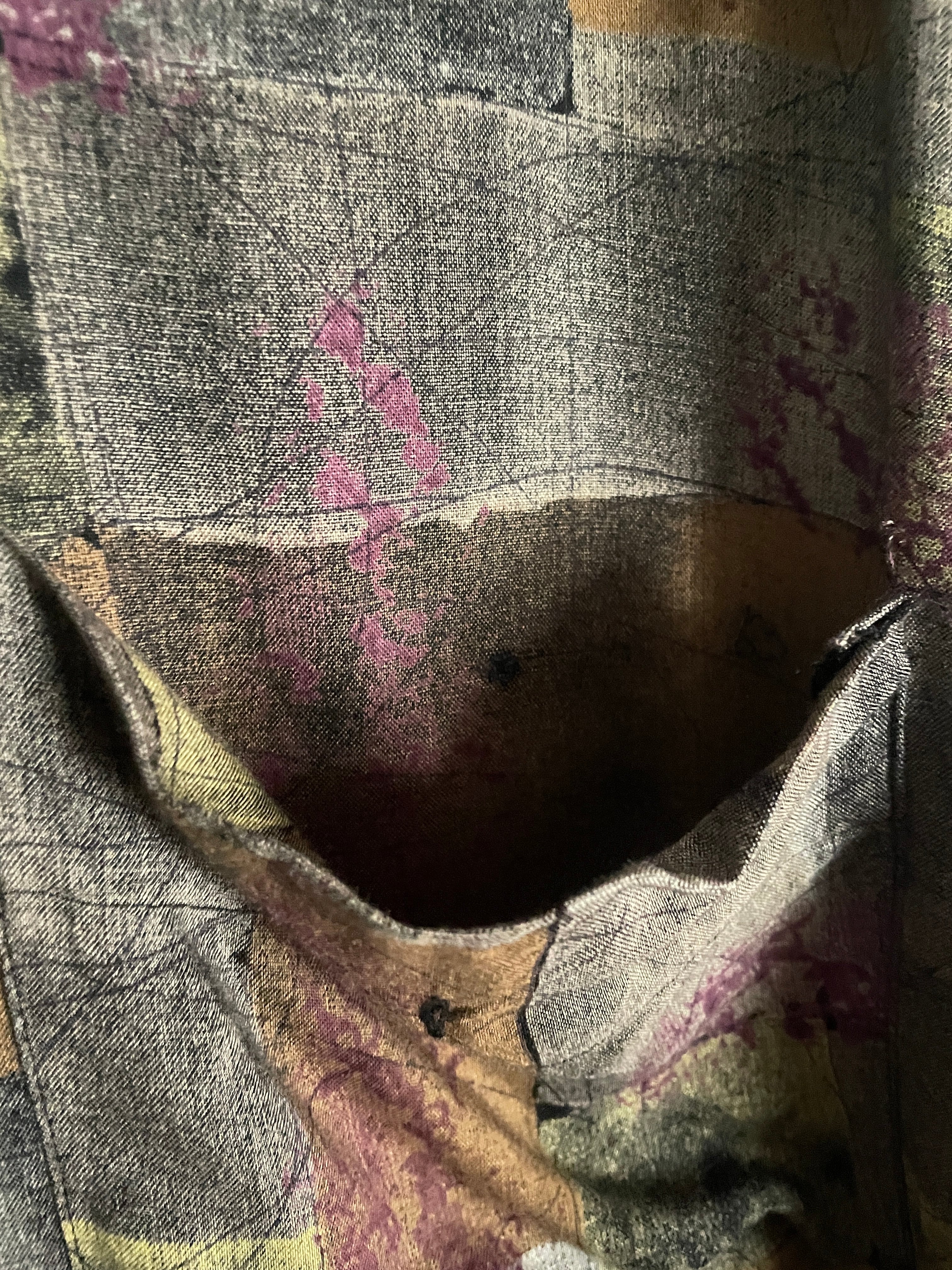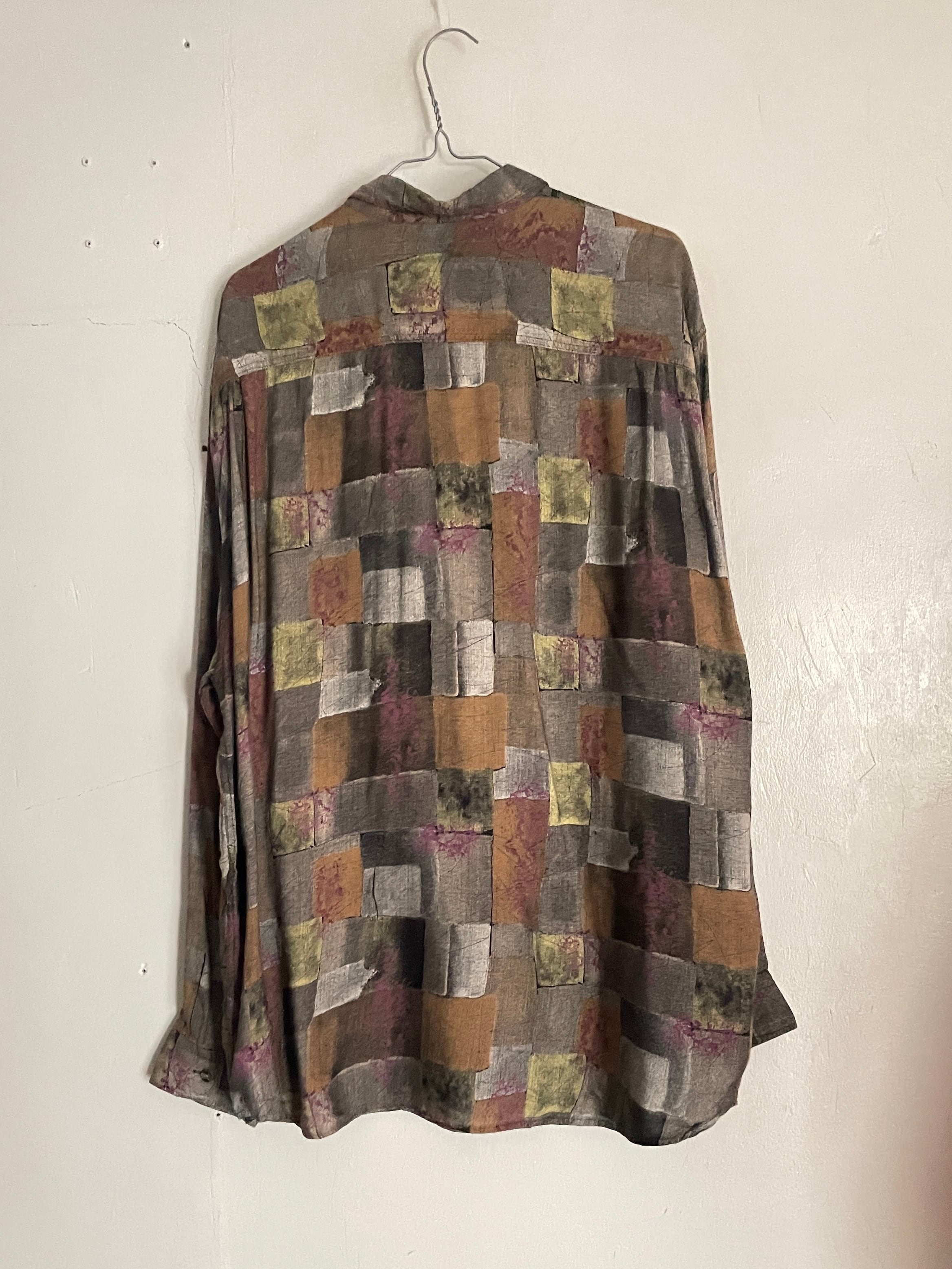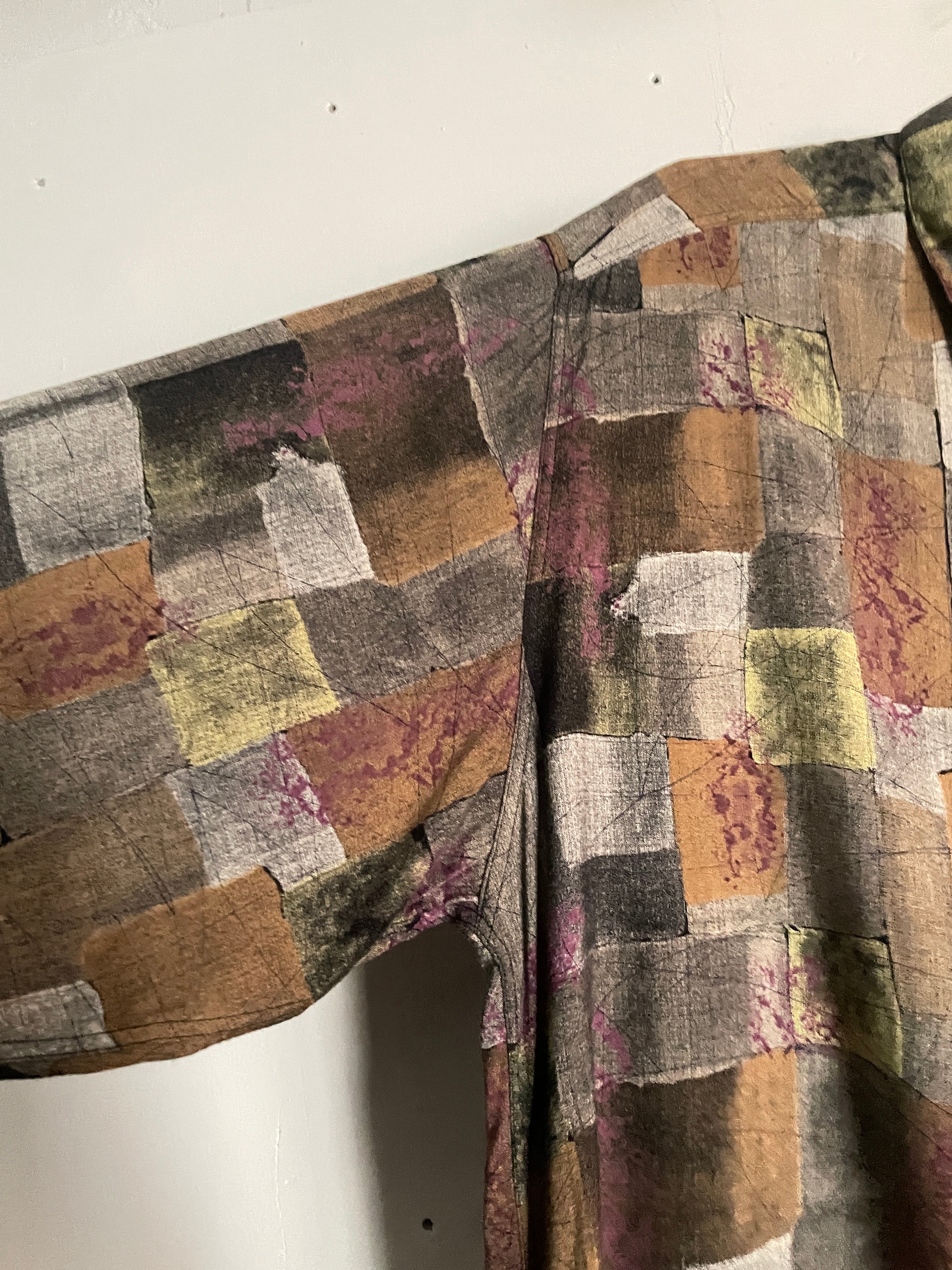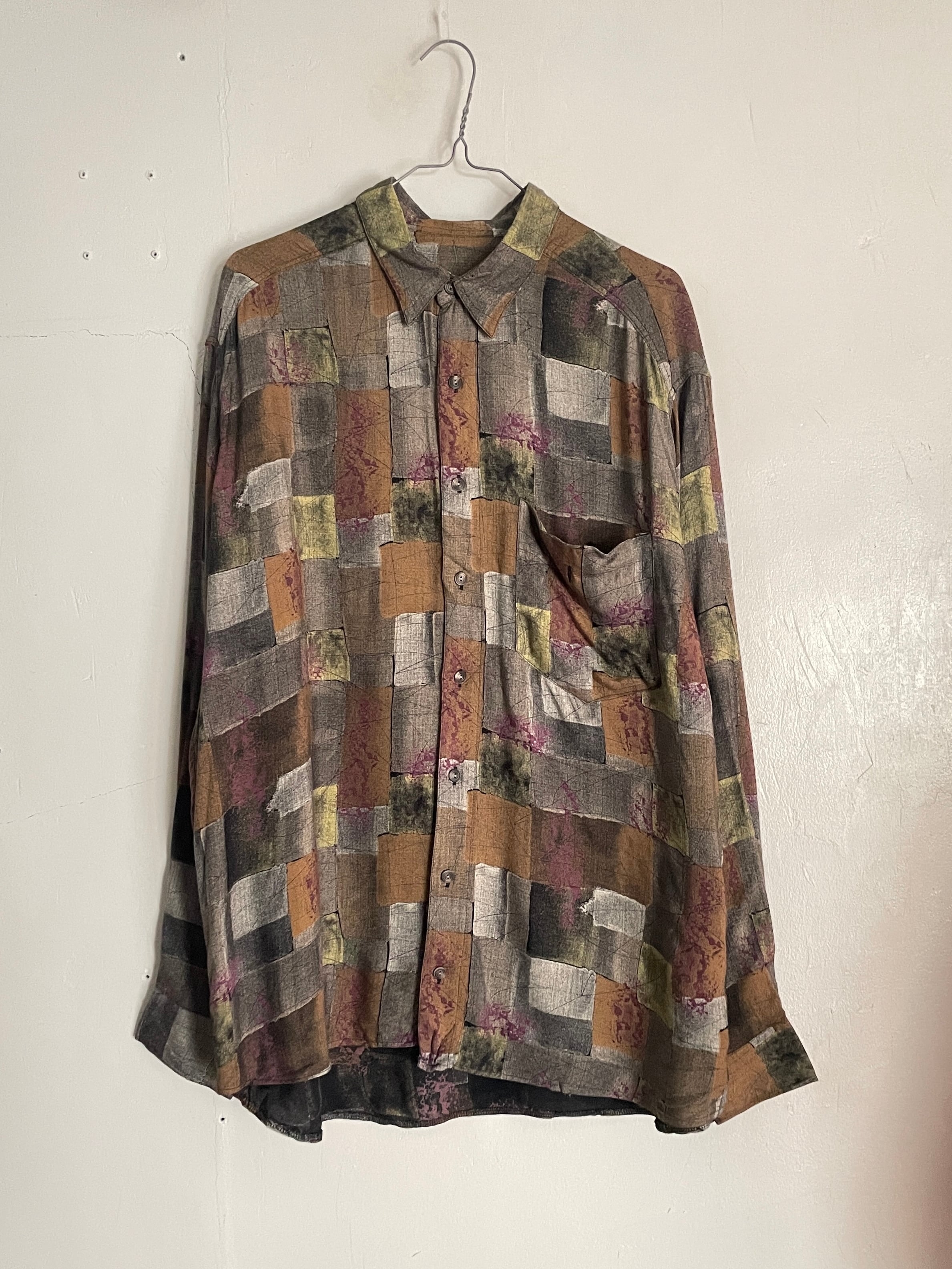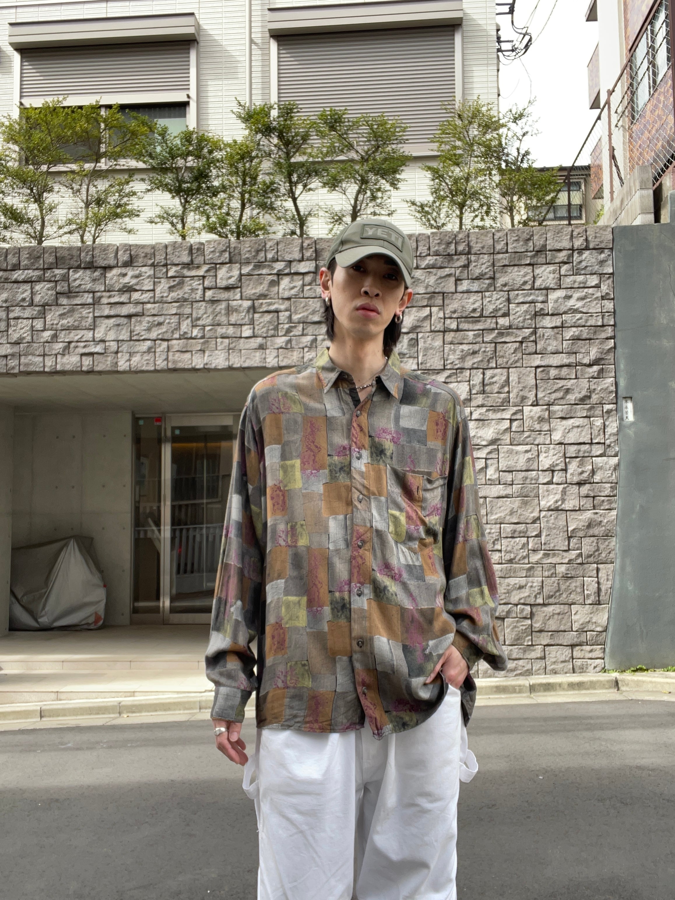 パッチワークのようなボックス型のパターンが組み合わさった、レトロでアート感のある総柄デザインが魅力的なレーヨンシャツ。くすみ系の色でまとめられていて、渋さも感じられるデザインになっています。サラッとした上質なレーヨン素材で、着心地も◎。ゆったりとラフに着られるサイズ感で、春にはファッションの主役になってくれるシャツです。胸ポケットのボタンがありません。