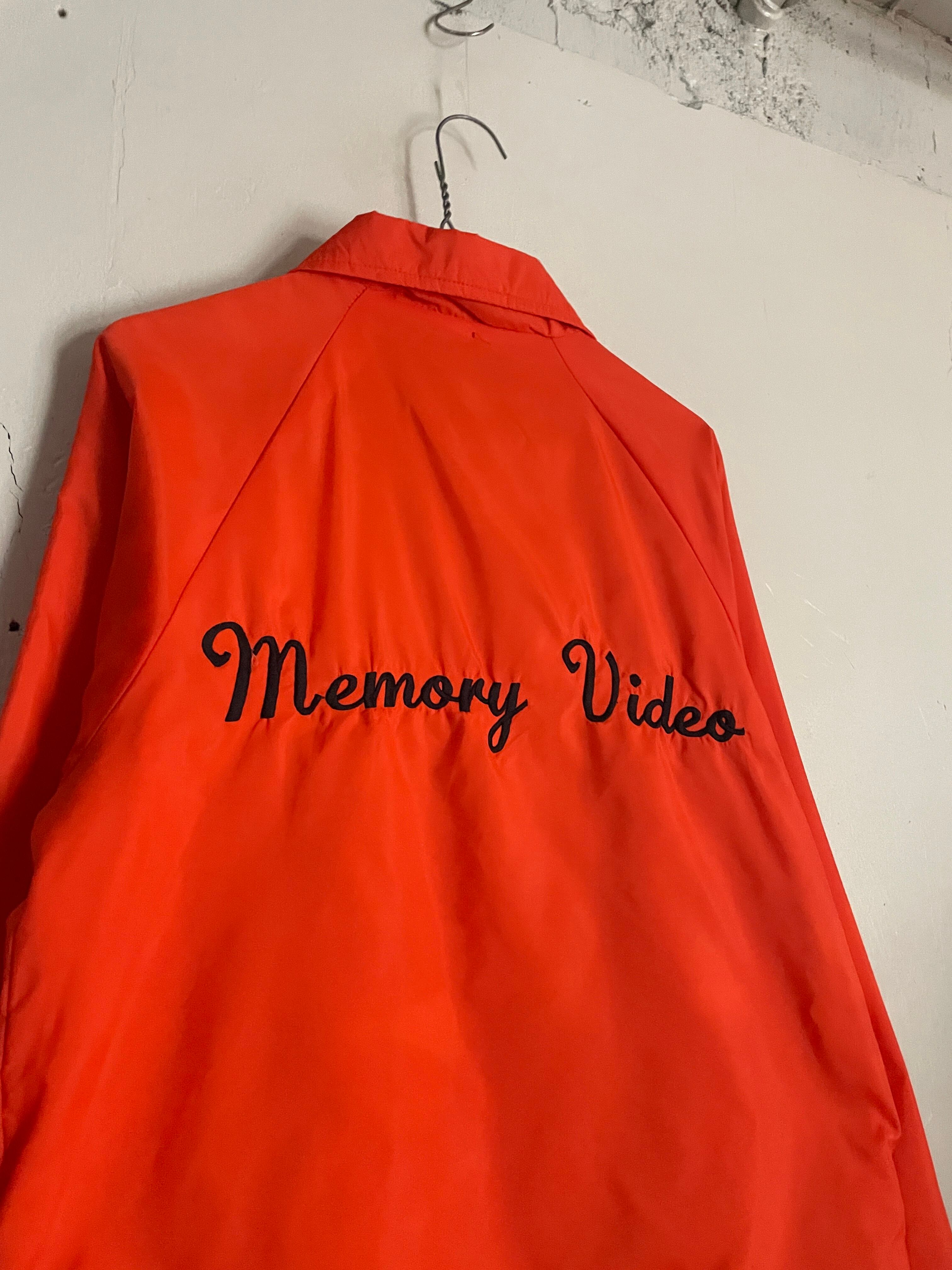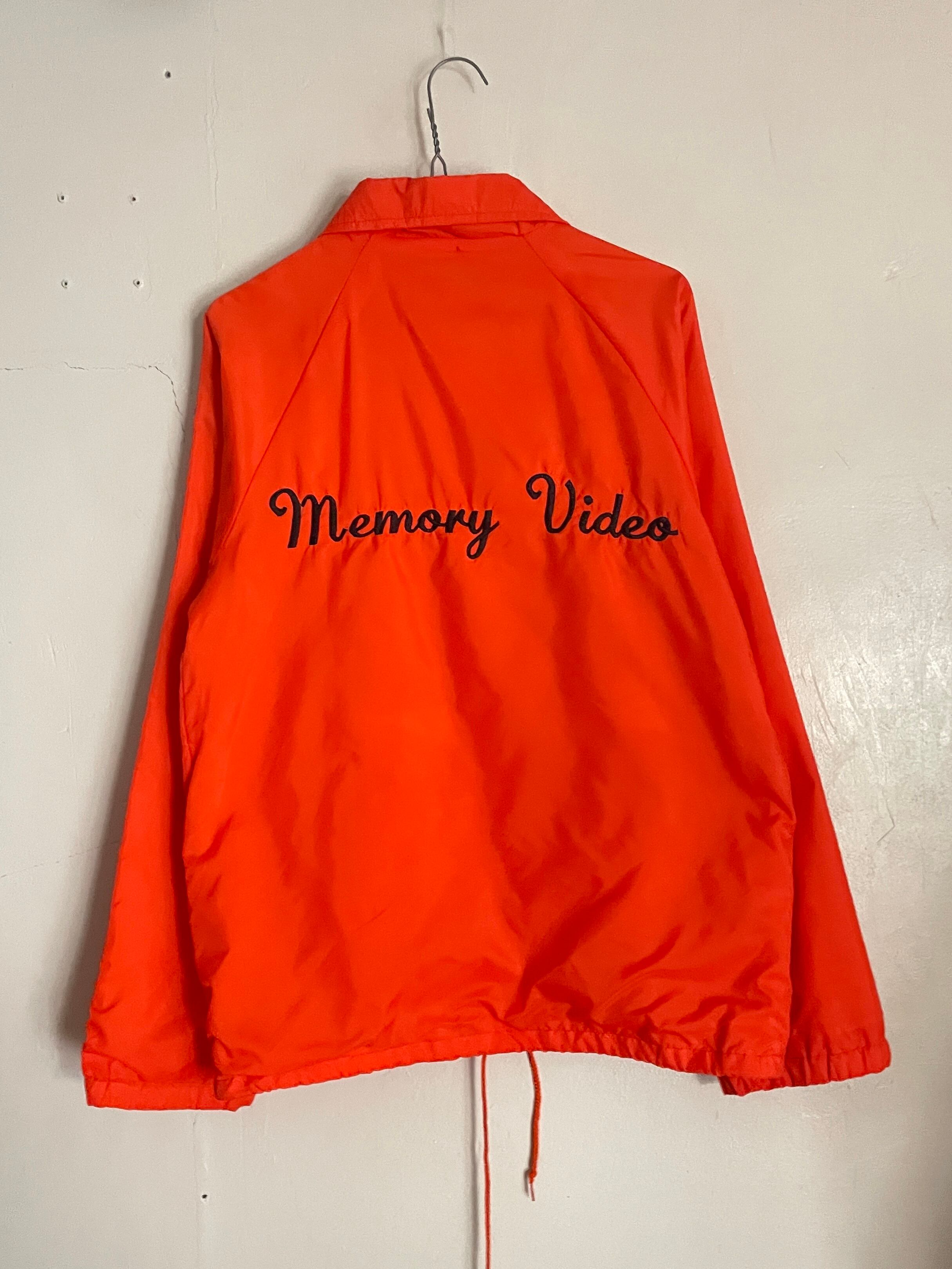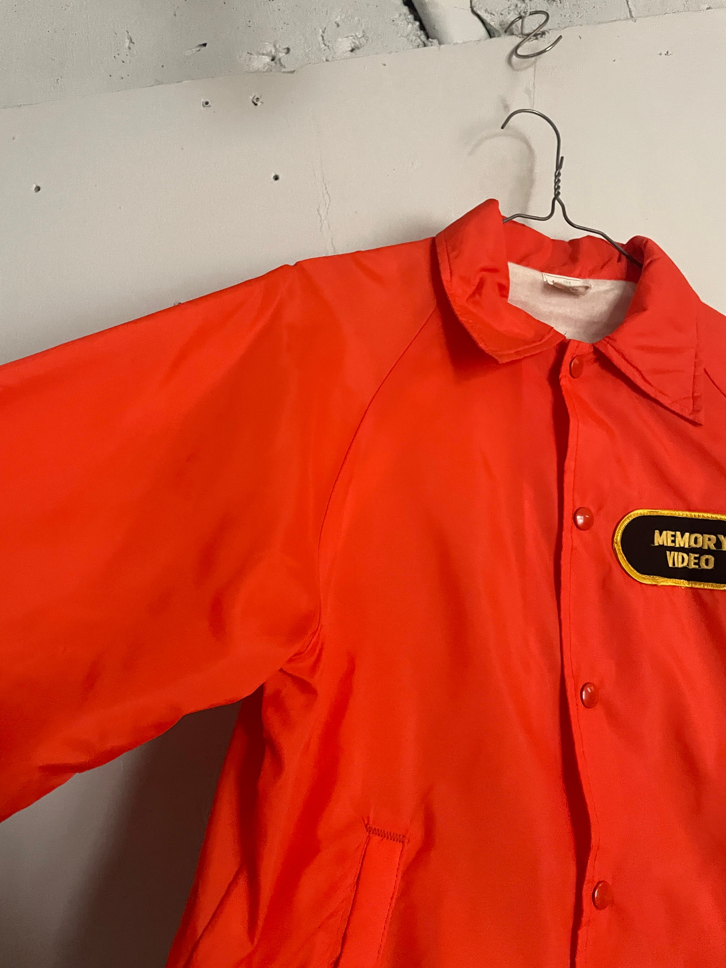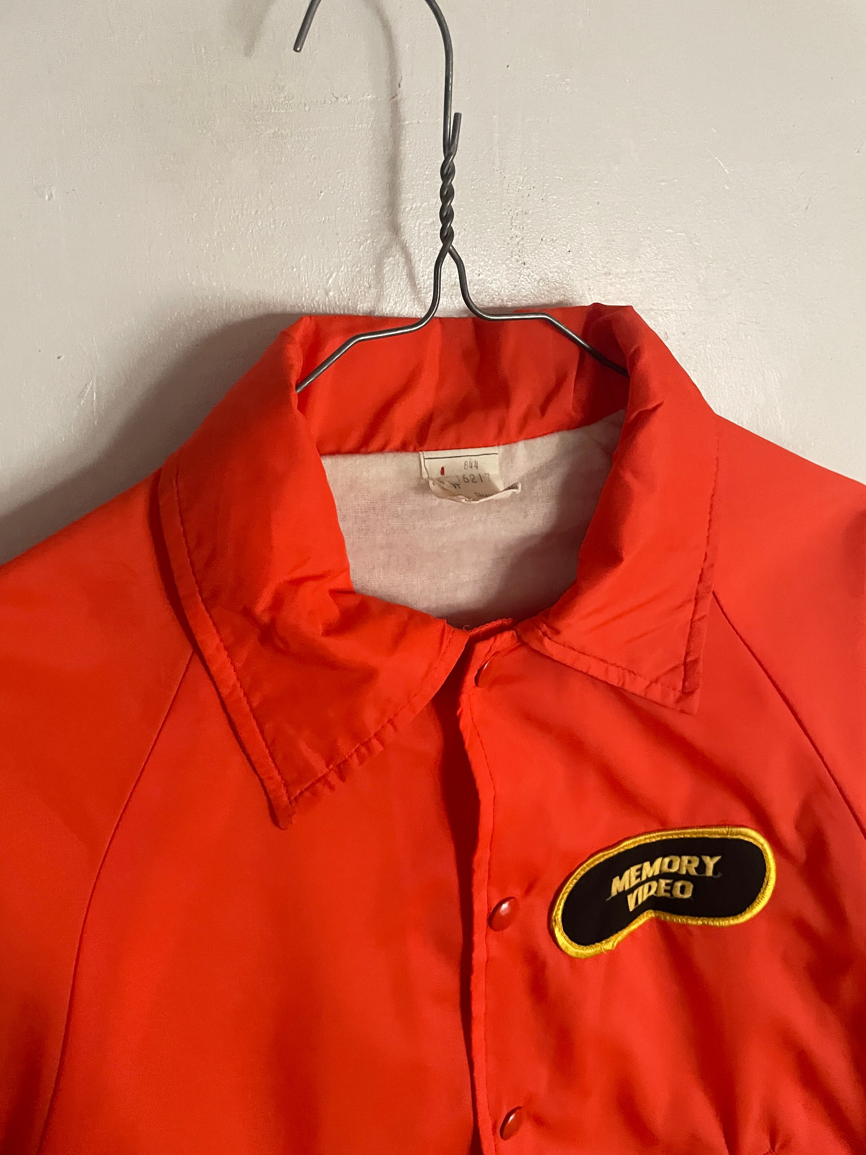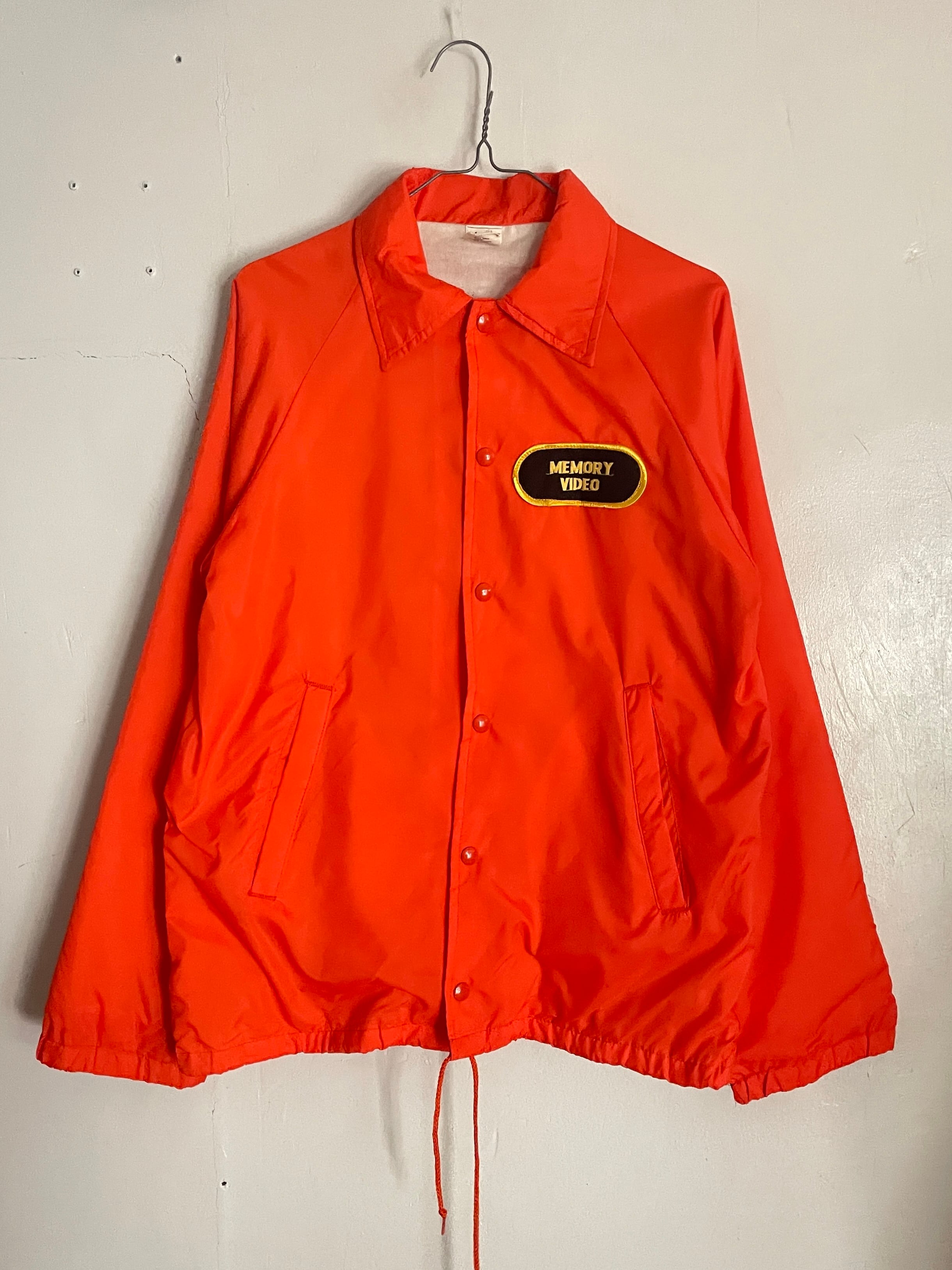 発色の良いオレンジボディに、ビデオレンタル店や映像制作関連の企業かと思われるワッペンと刺繍が施されたコーチジャケット。フロント部分にはワッペン、バックにはデカ刺繍。前後でメリハリのあるデザインがグッドです。スナップボタンで着脱しやすいのがコーチジャケットの魅力でもあります。サイズ表記はSMALLですが、ゆったりめなサイズ感で、春にはファッションのメインになってくれます。USA製なのもポイントが高いです。