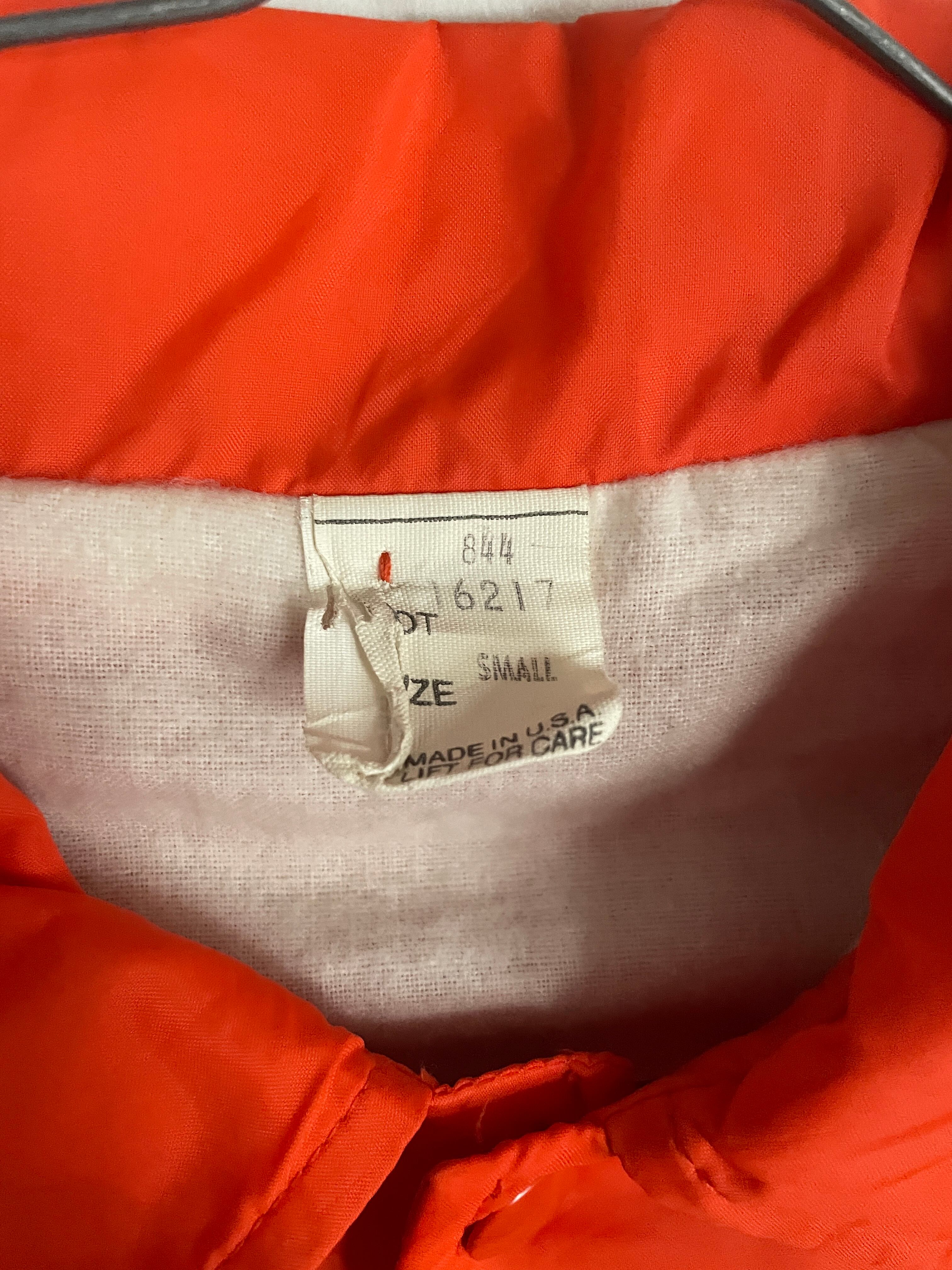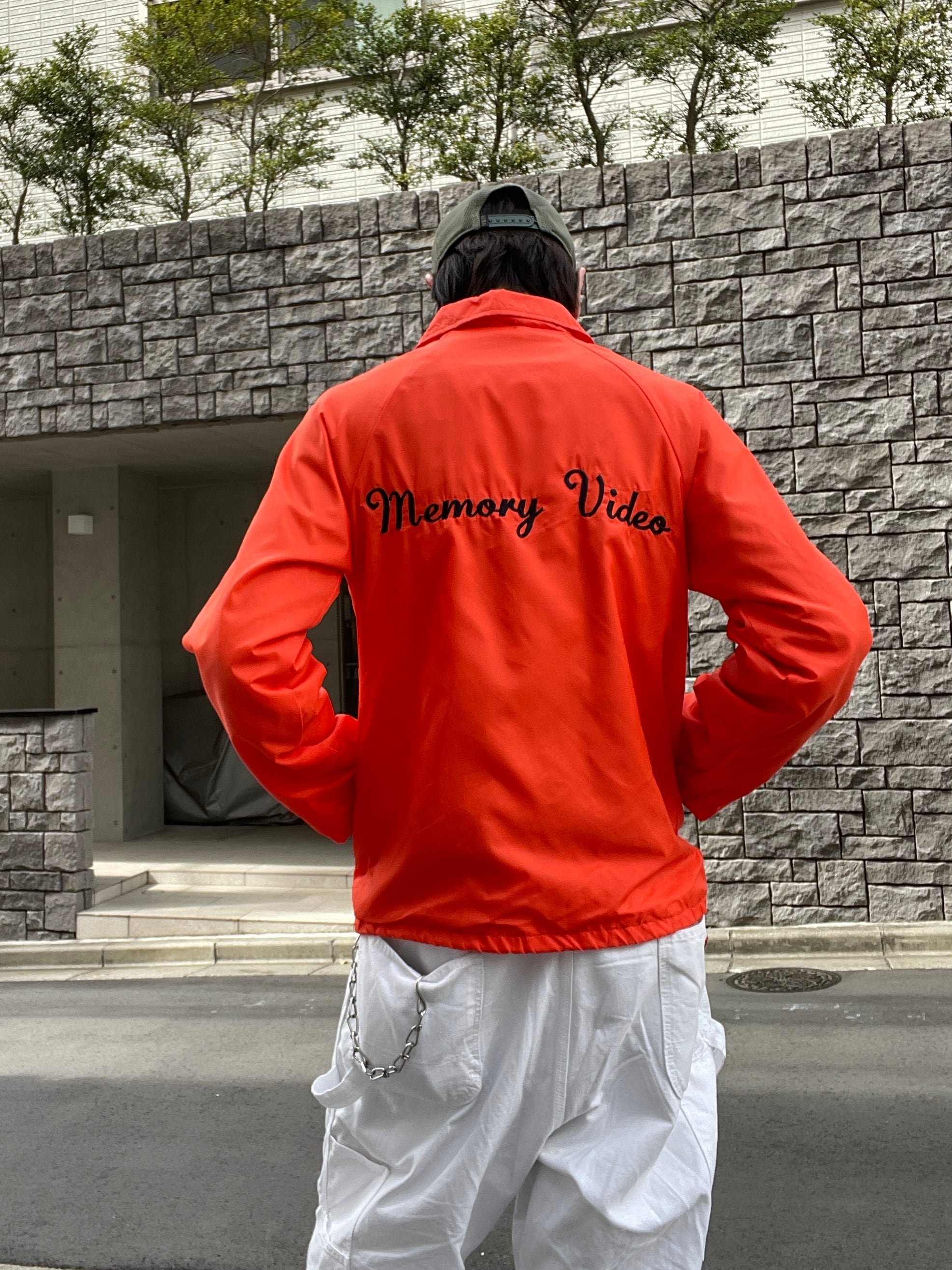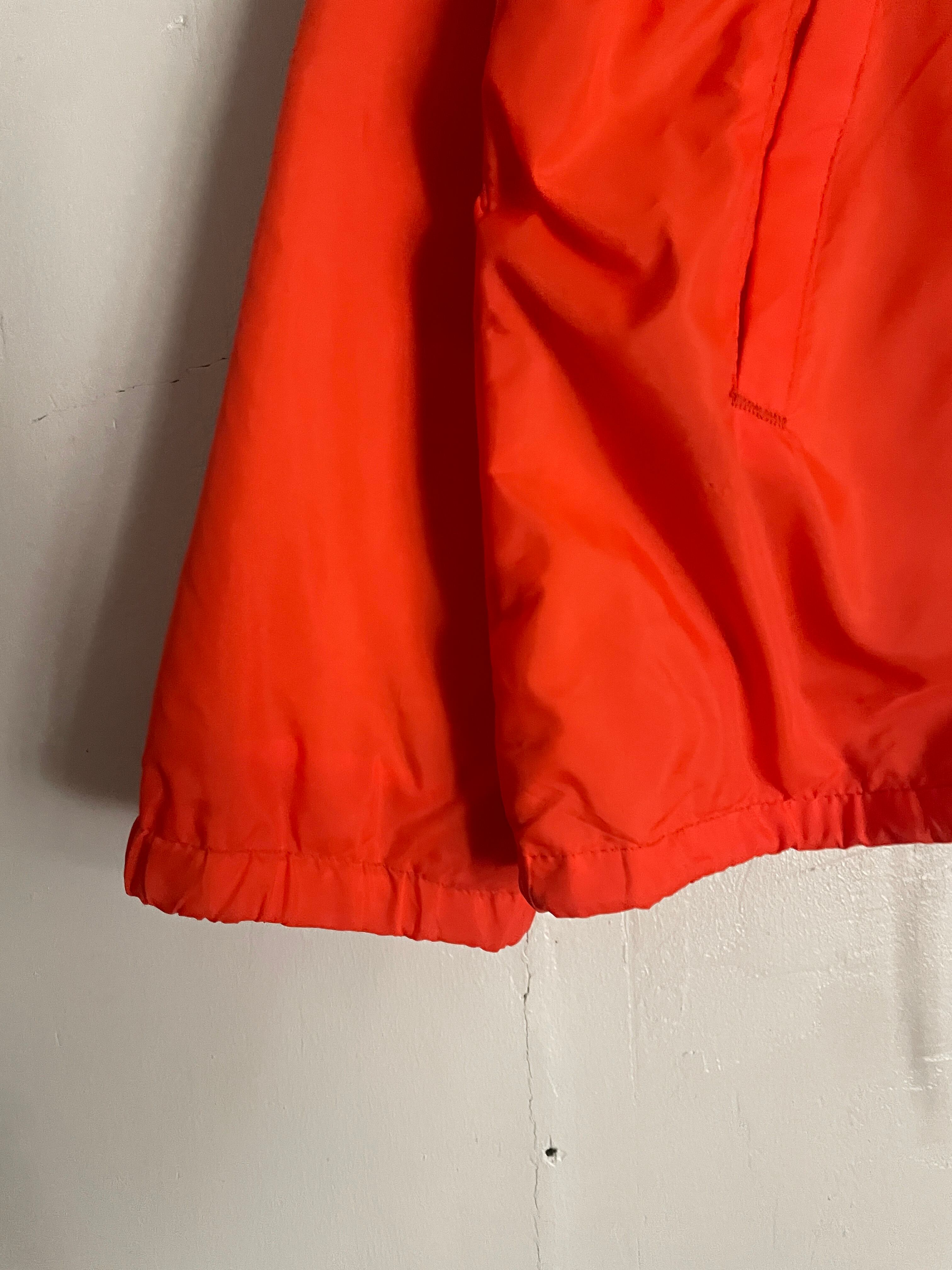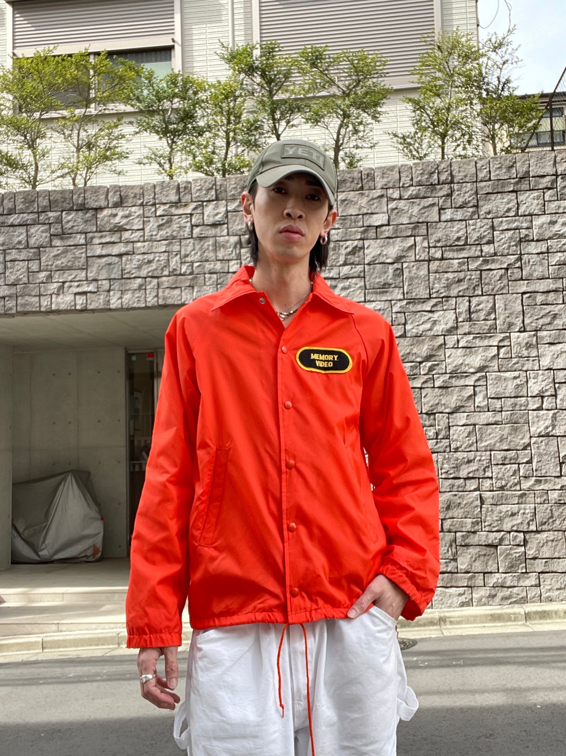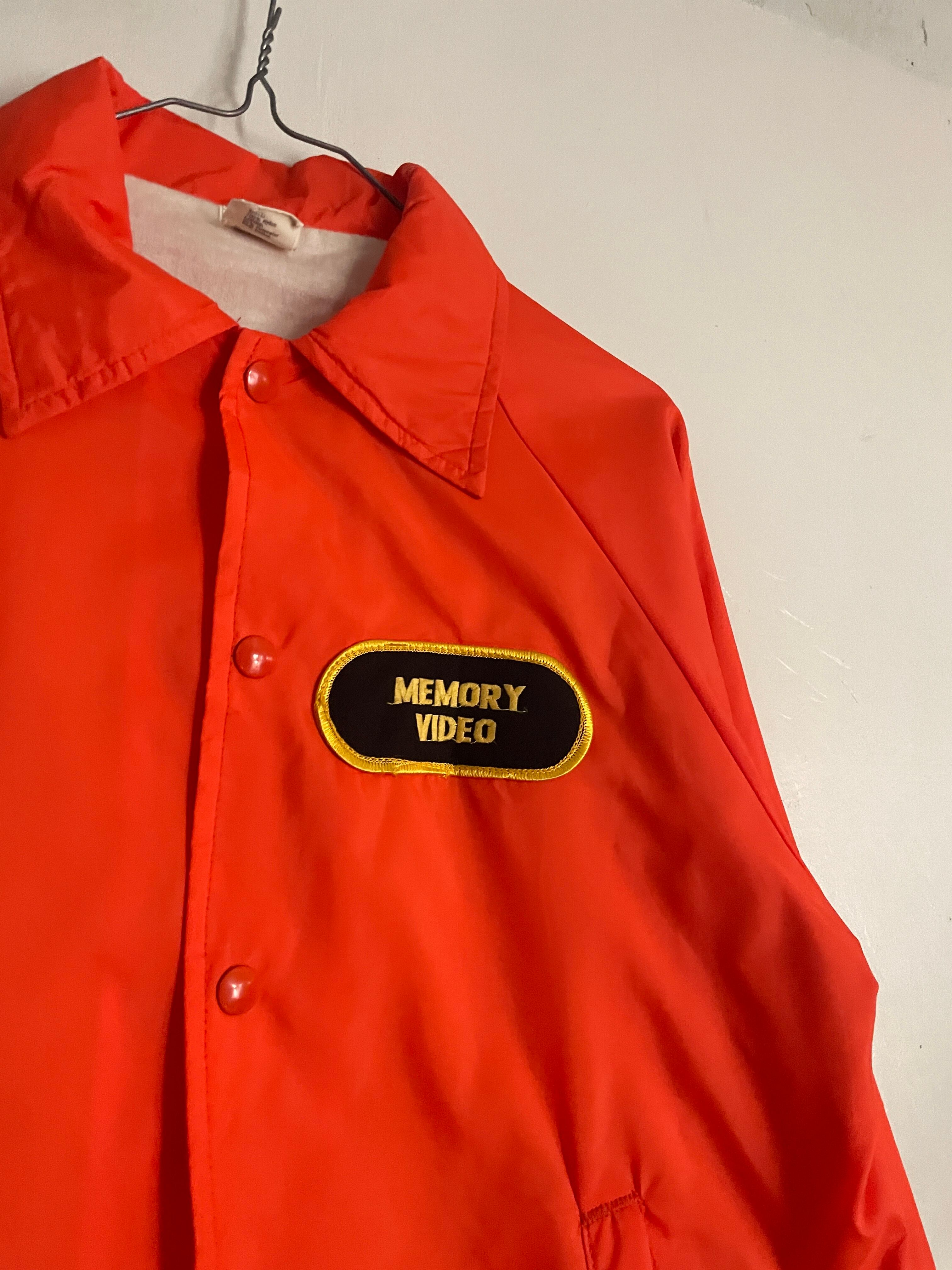 発色の良いオレンジボディに、ビデオレンタル店や映像制作関連の企業かと思われるワッペンと刺繍が施されたコーチジャケット。フロント部分にはワッペン、バックにはデカ刺繍。前後でメリハリのあるデザインがグッドです。スナップボタンで着脱しやすいのがコーチジャケットの魅力でもあります。サイズ表記はSMALLですが、ゆったりめなサイズ感で、春にはファッションのメインになってくれます。USA製なのもポイントが高いです。