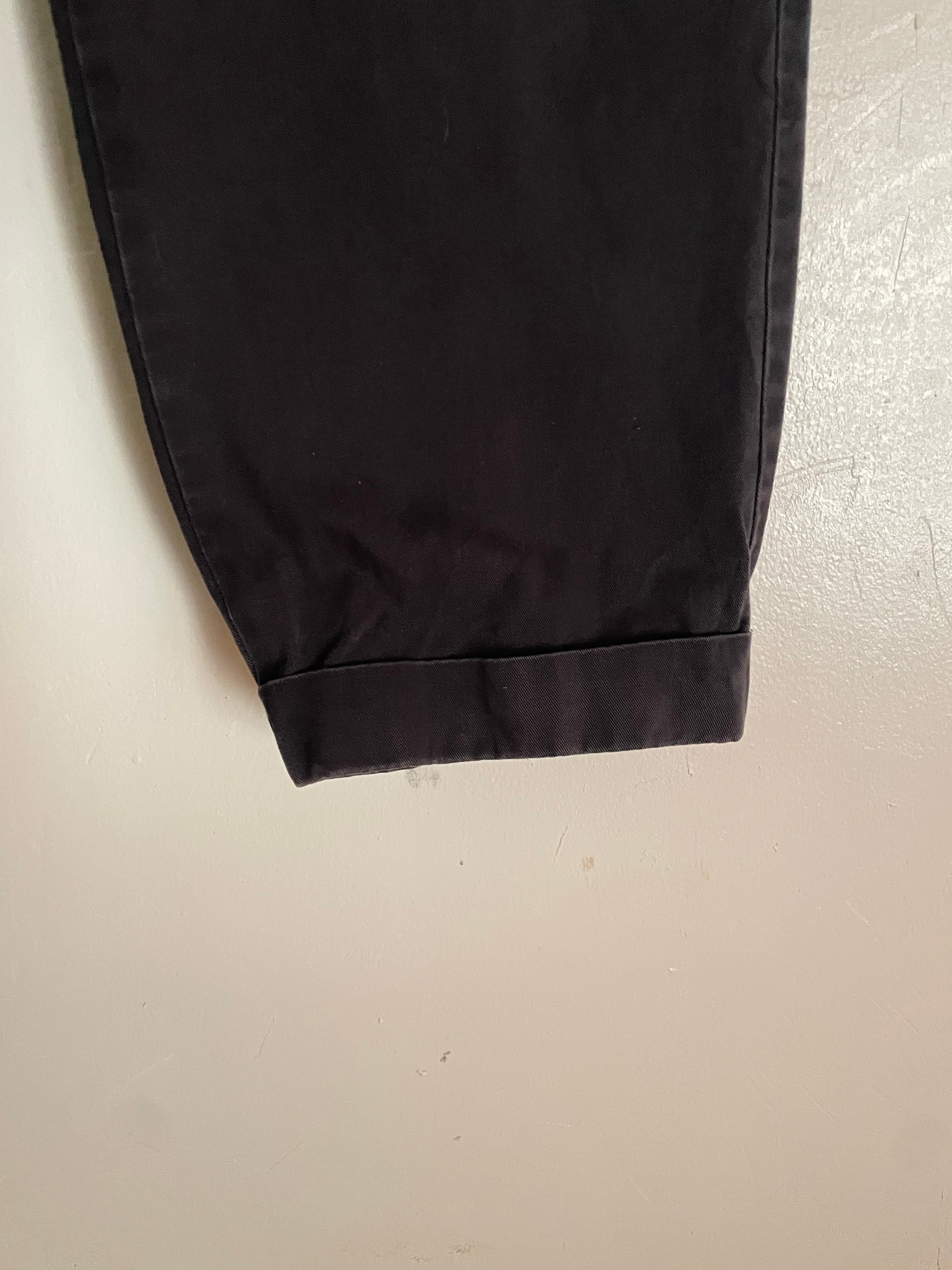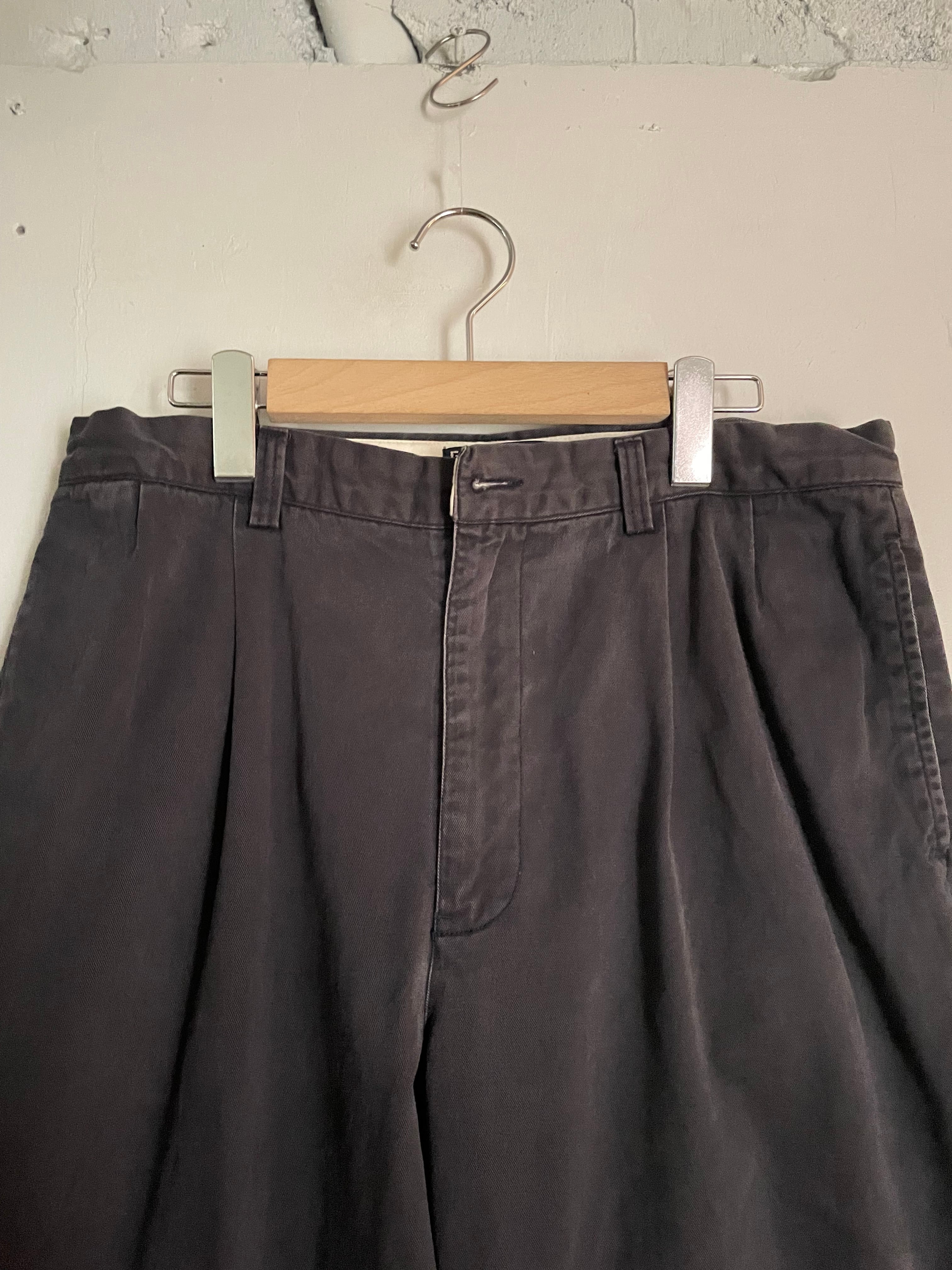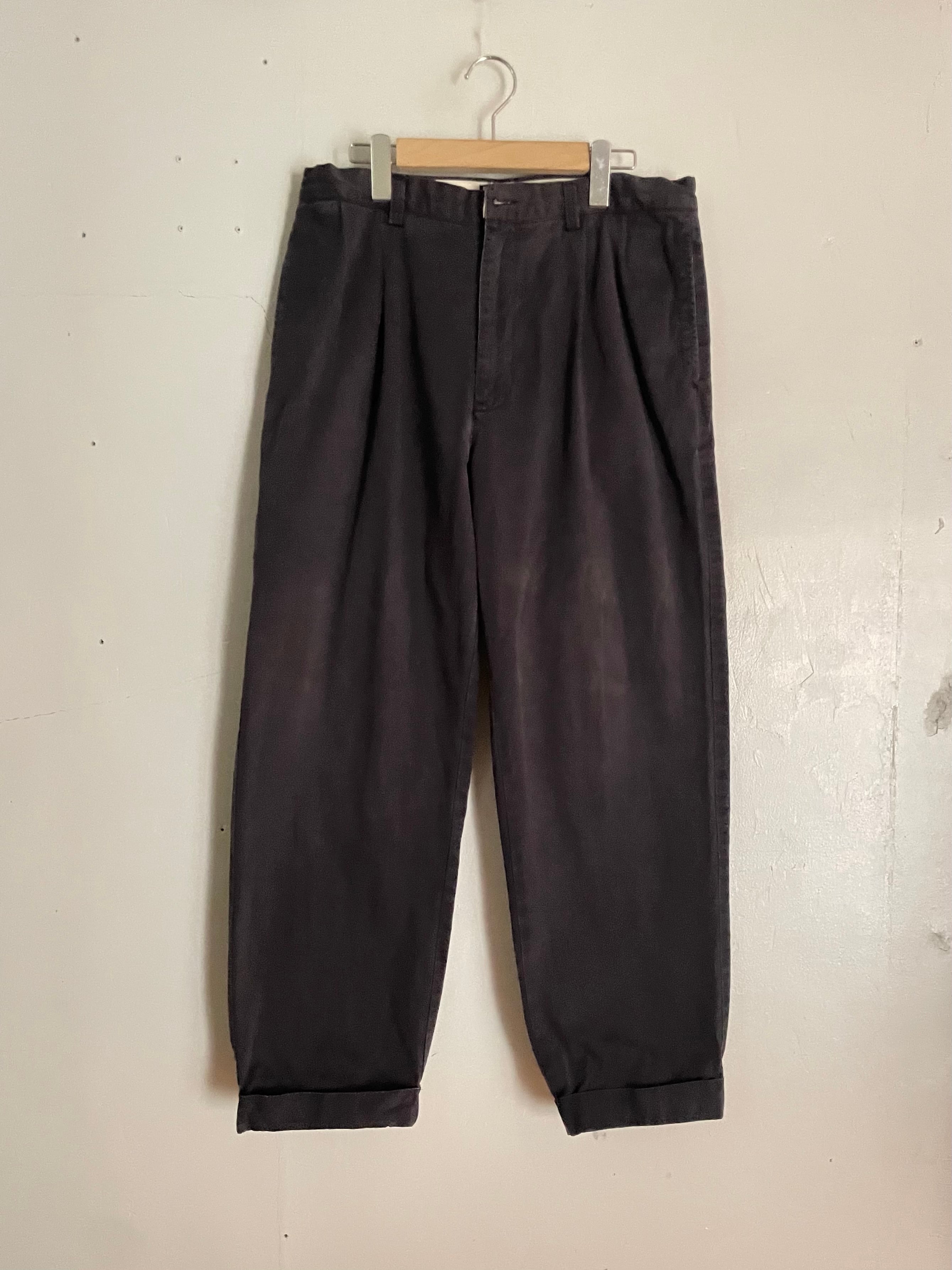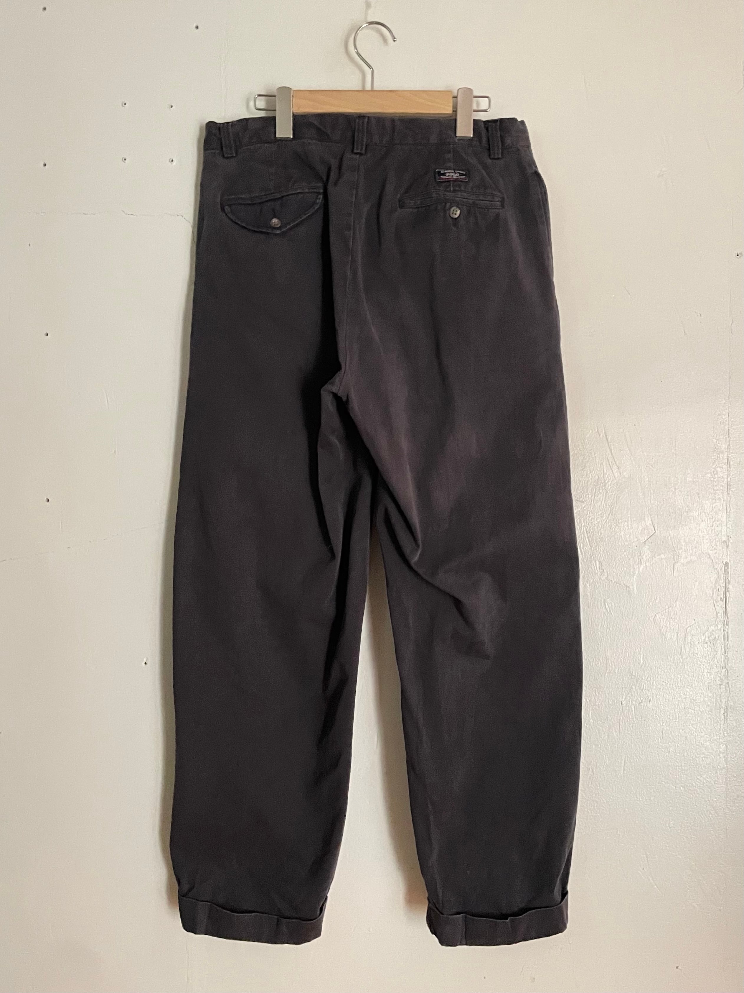 良い褪せ方をしたダークグレーカラーで、深めな2タックの入った、ガツンとした太さのあるワイドシルエットが魅力的な、ラルフローレンのチノパン。ラルフローレンの名作の一つでもあります。丈夫なコットン素材なので、季節問わずガシガシ履けそうです。癖が無く、様々なファッションに取り入れやすい万能アイテムです。ウエストボタンが欠損しています。