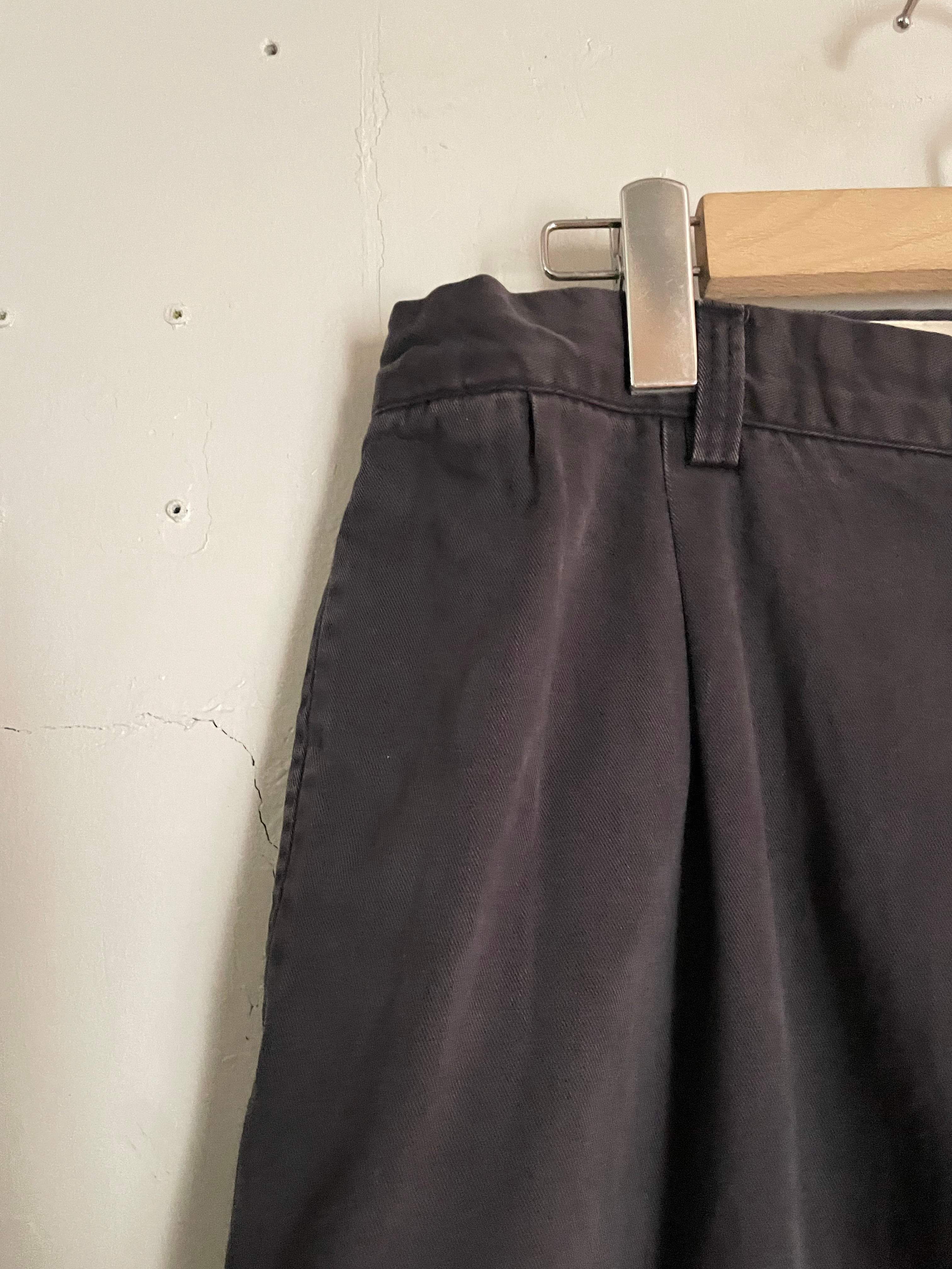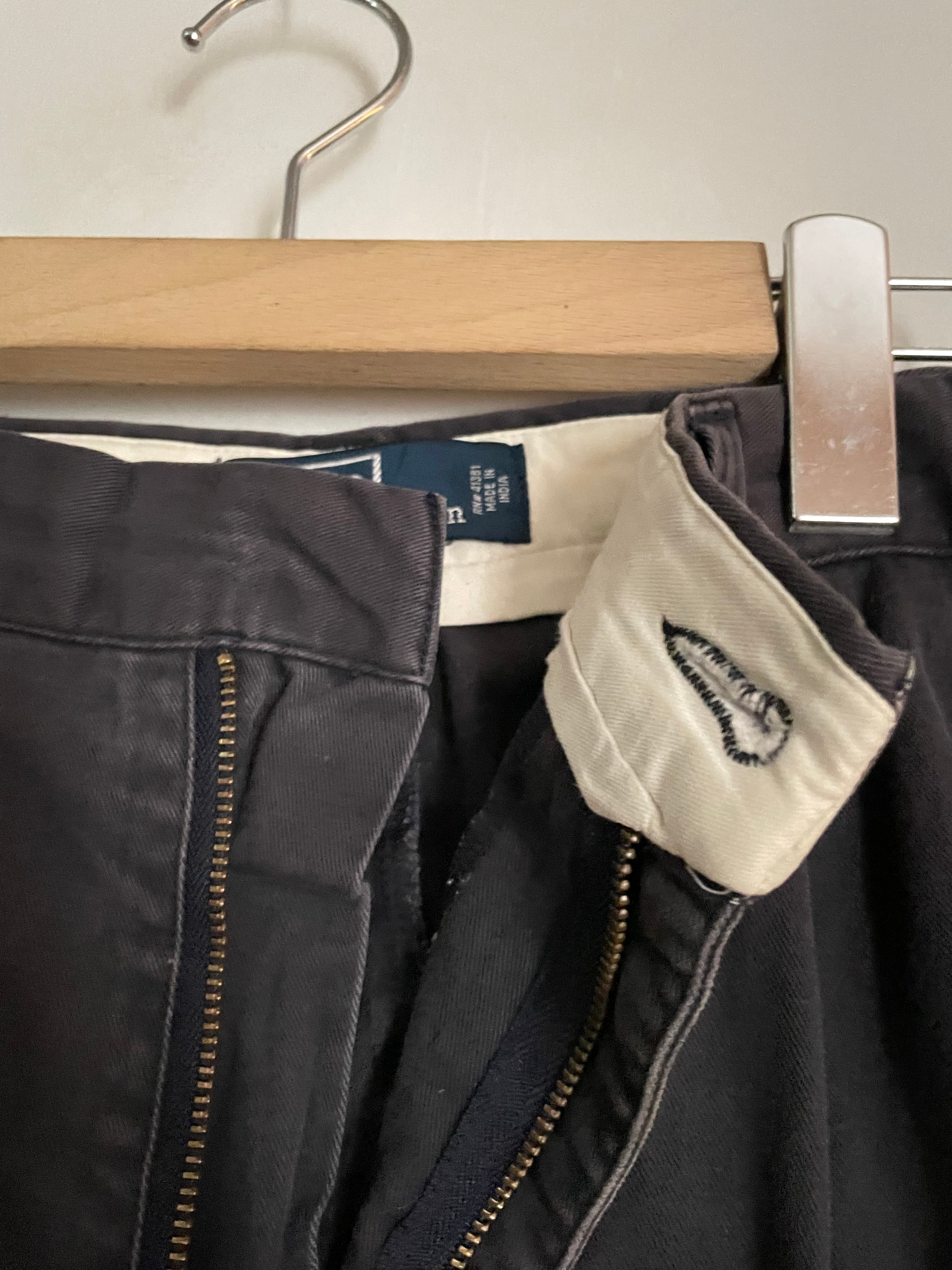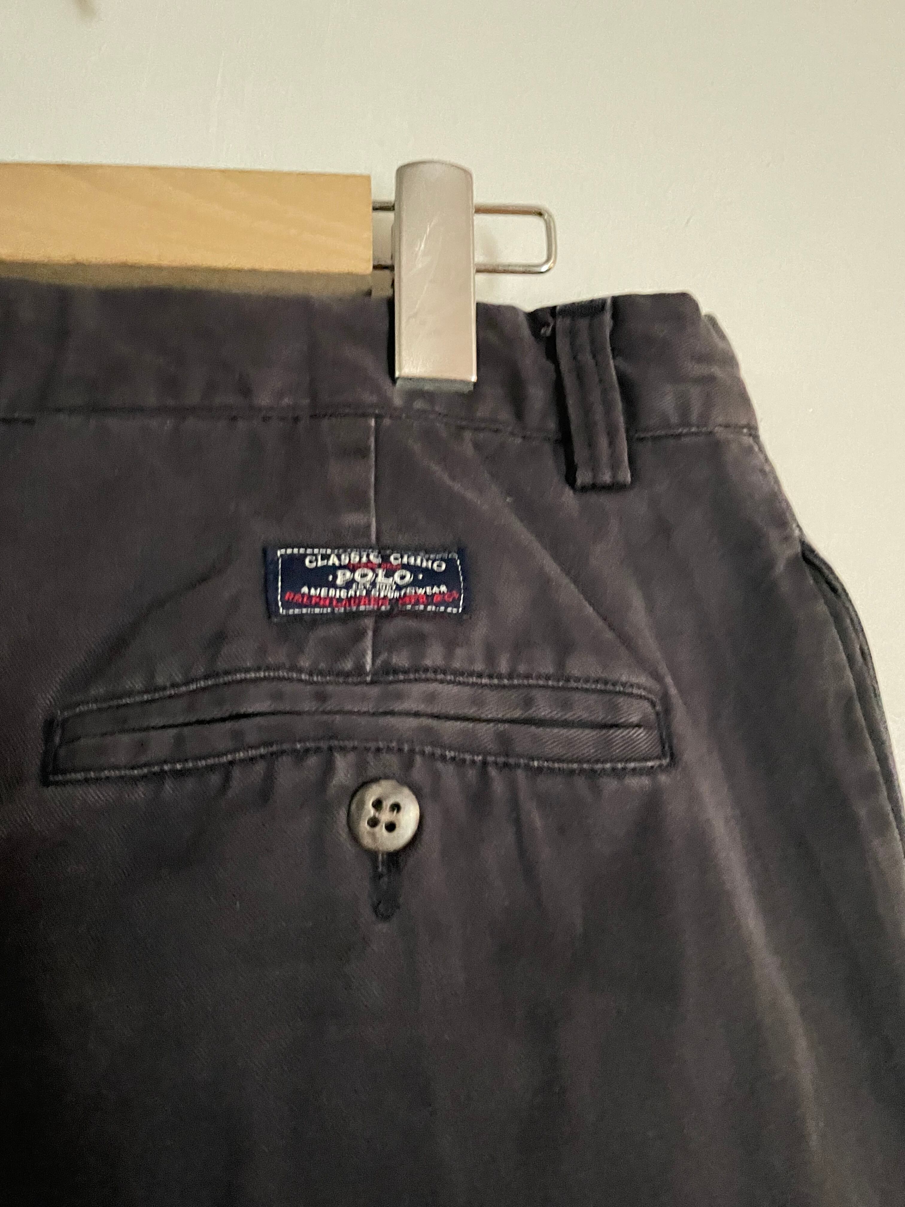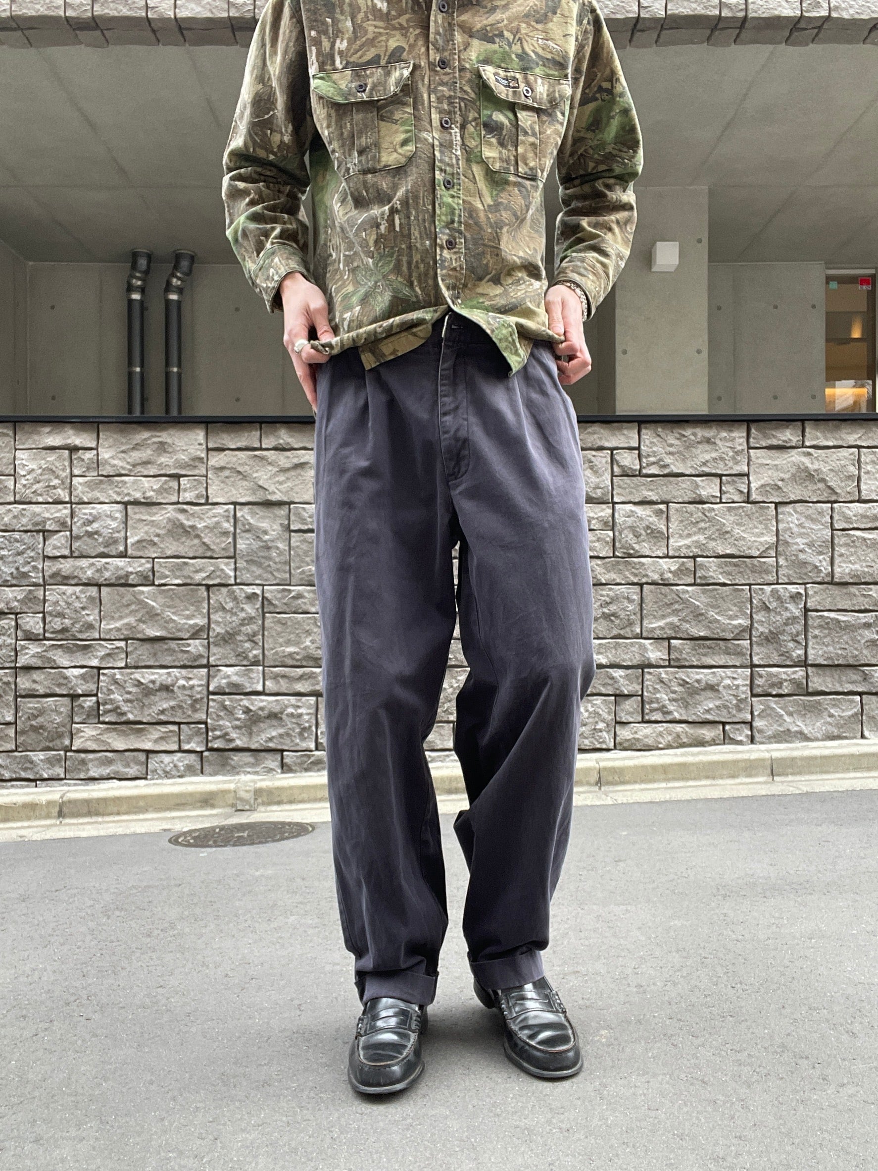 良い褪せ方をしたダークグレーカラーで、深めな2タックの入った、ガツンとした太さのあるワイドシルエットが魅力的な、ラルフローレンのチノパン。ラルフローレンの名作の一つでもあります。丈夫なコットン素材なので、季節問わずガシガシ履けそうです。癖が無く、様々なファッションに取り入れやすい万能アイテムです。ウエストボタンが欠損しています。
