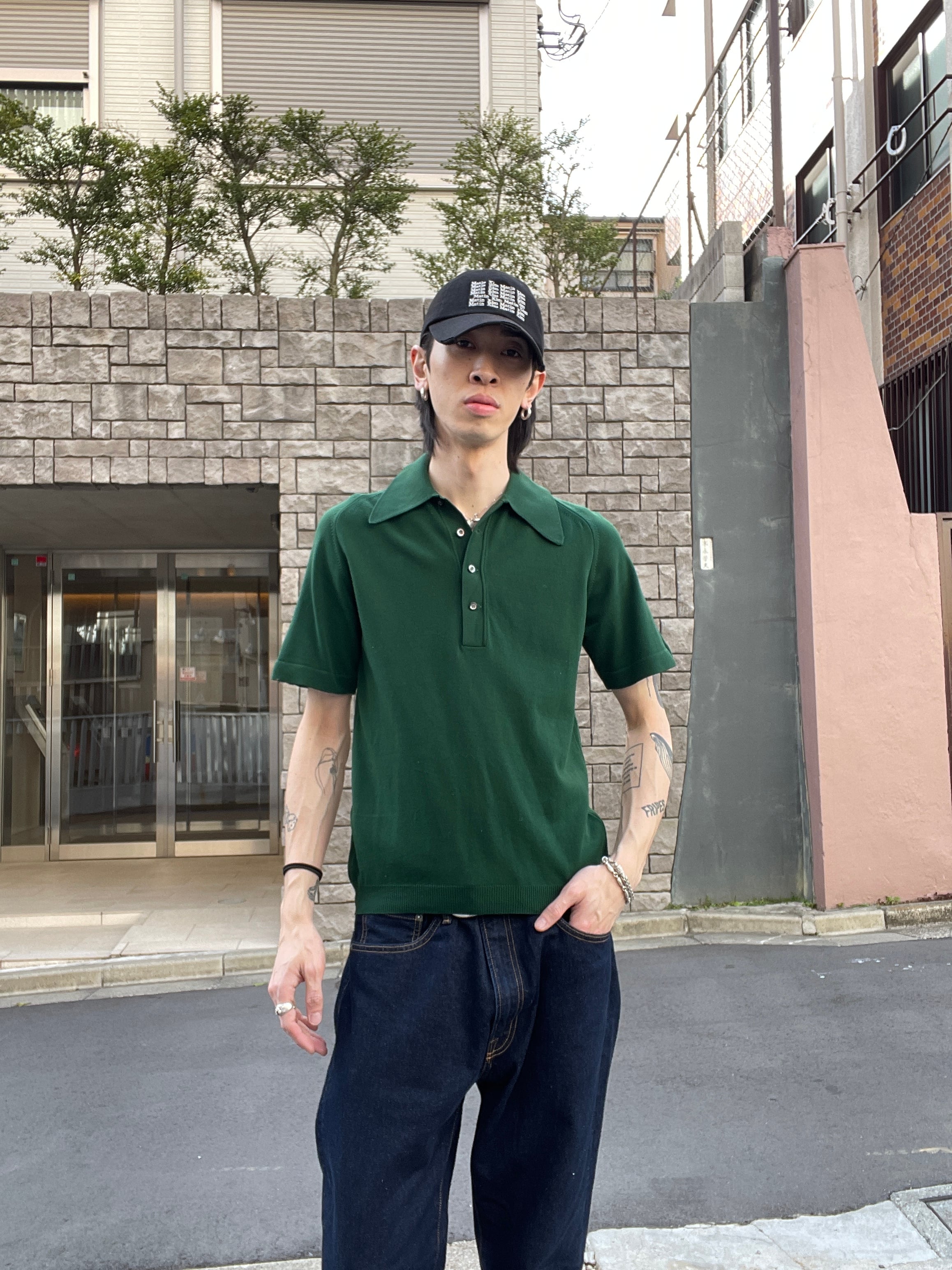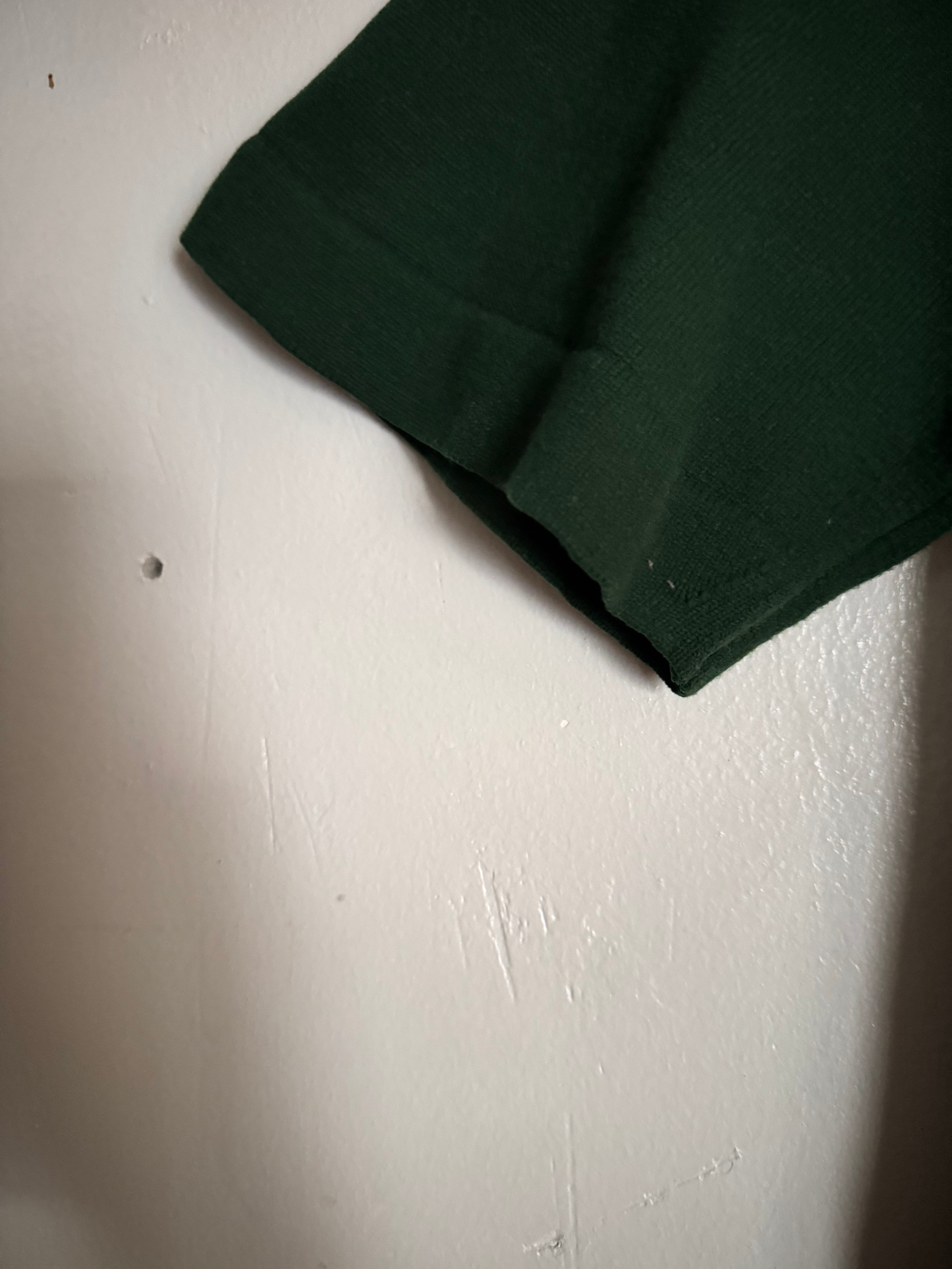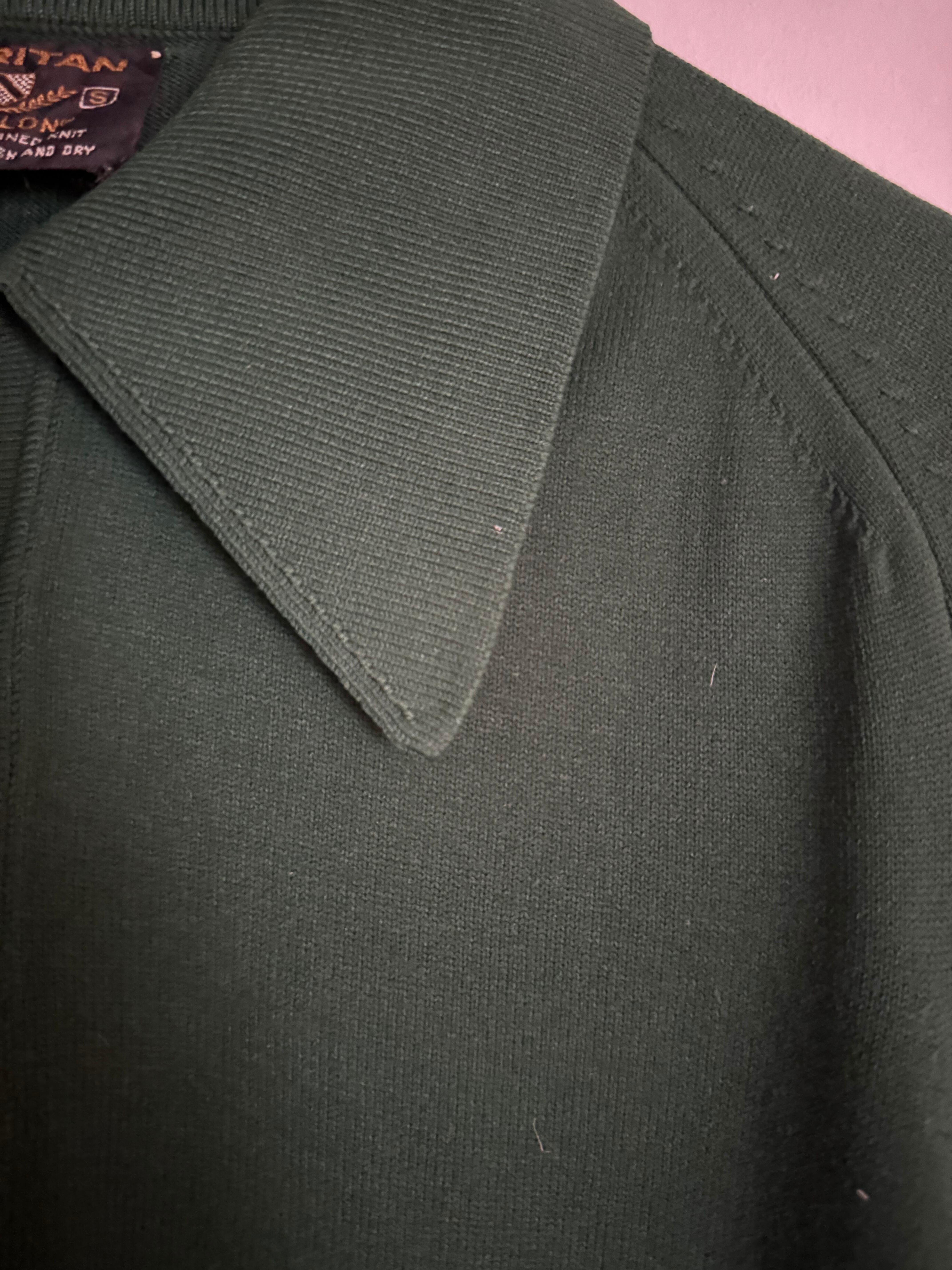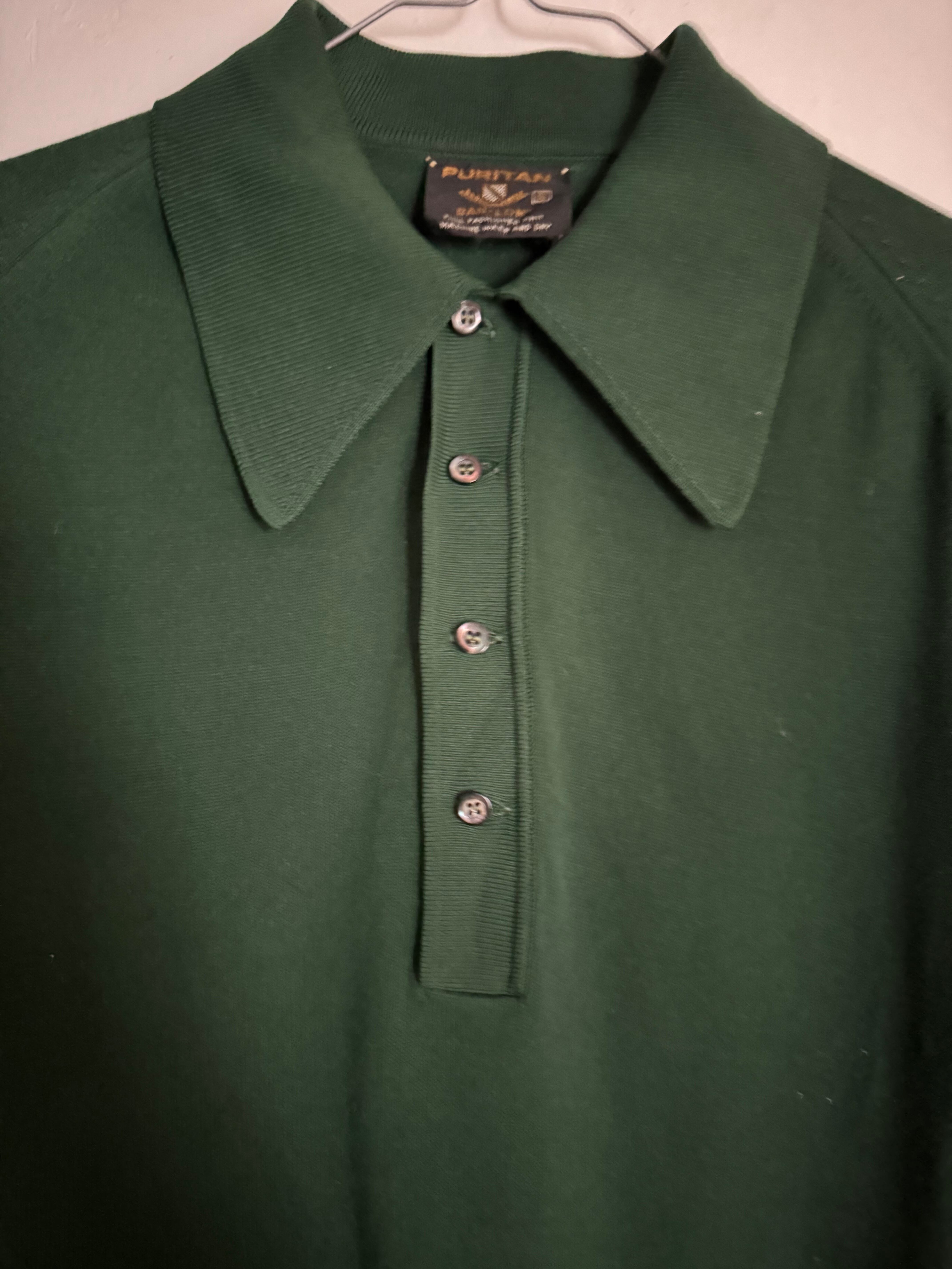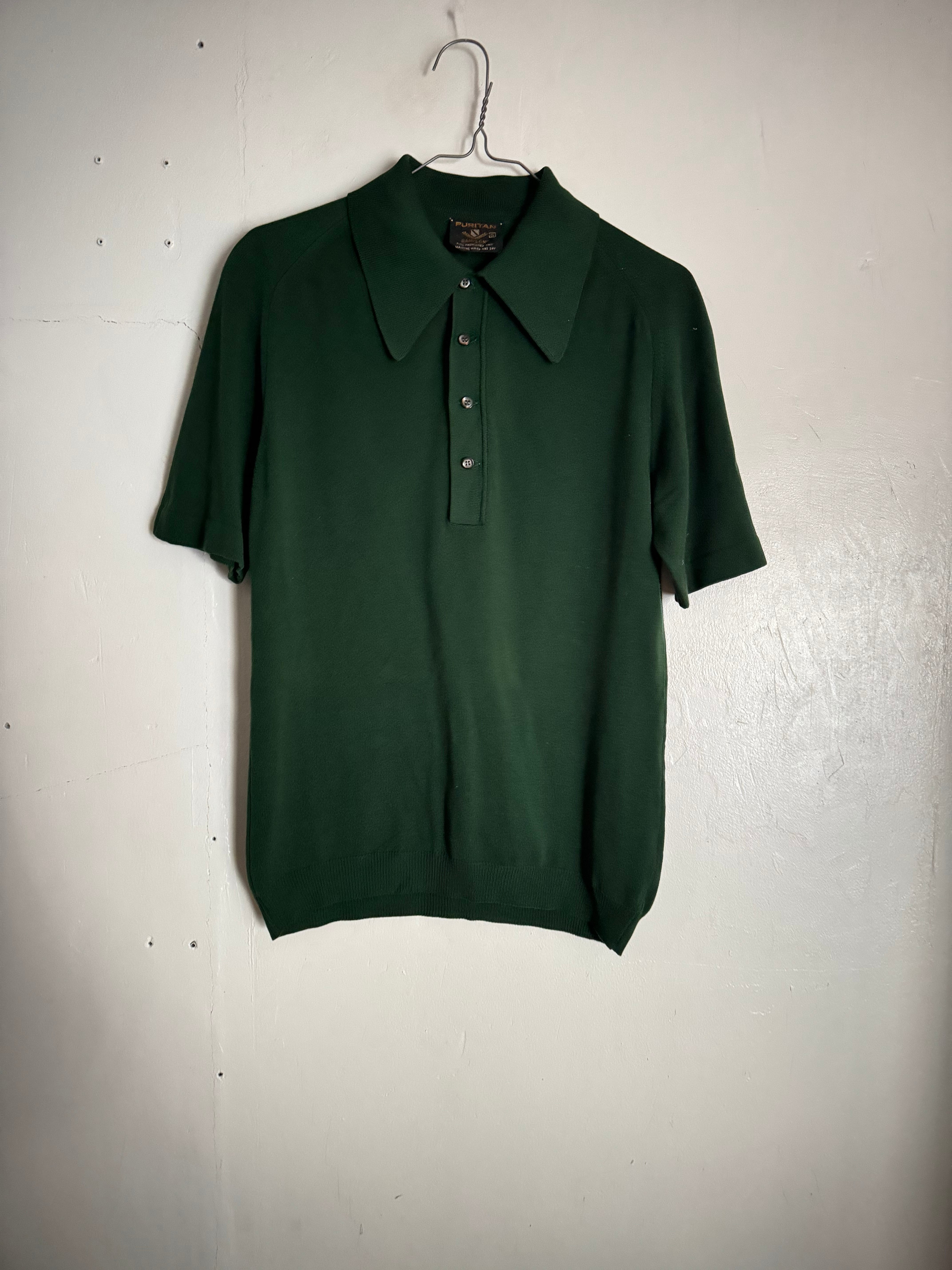 60-70年代に一世を風靡した高級ニット素材「BAN-LON」を使用した、ピューリタンの名作ポロシャツ。深みのある絶妙なダークグリーンは、この年代ならではのクラシックな表情。大きく尖った襟と肩に馴染むラグランスリーブ、そしてBAN-LON特有のとろみ感が、色気と上品さを演出します。一枚でもサラリと着ても、ジャケットのインナーに挿しても抜群に映える一着です。