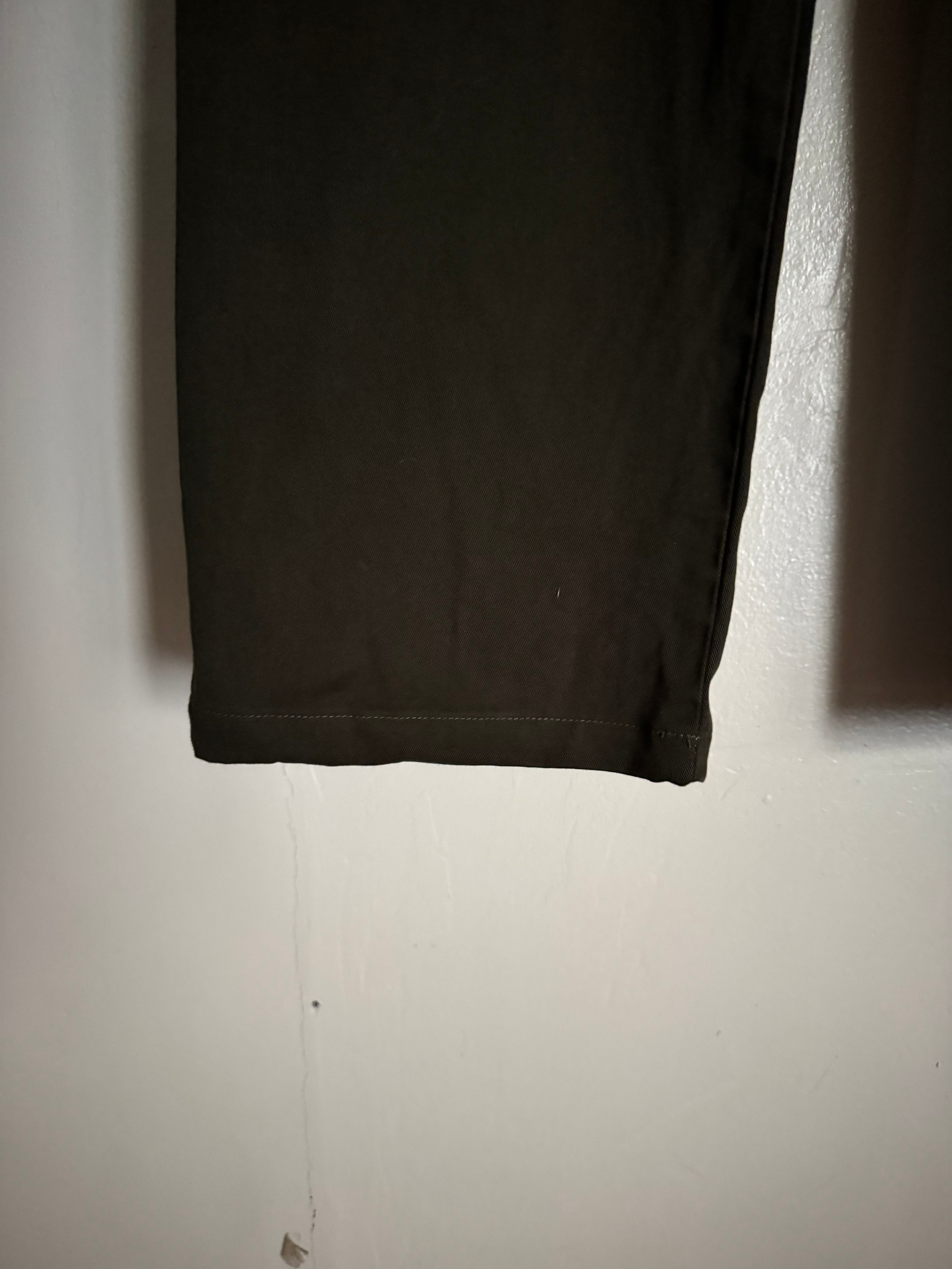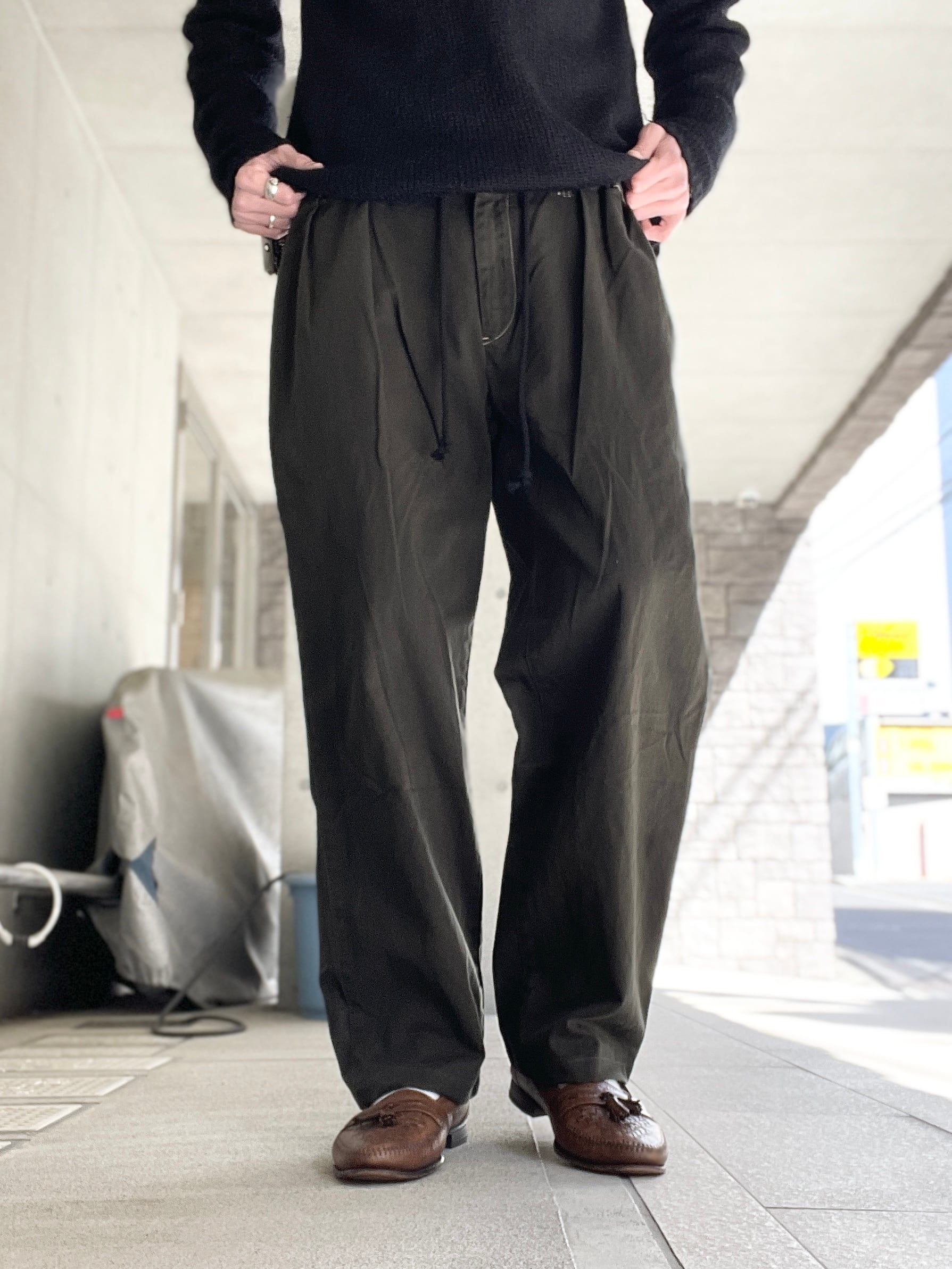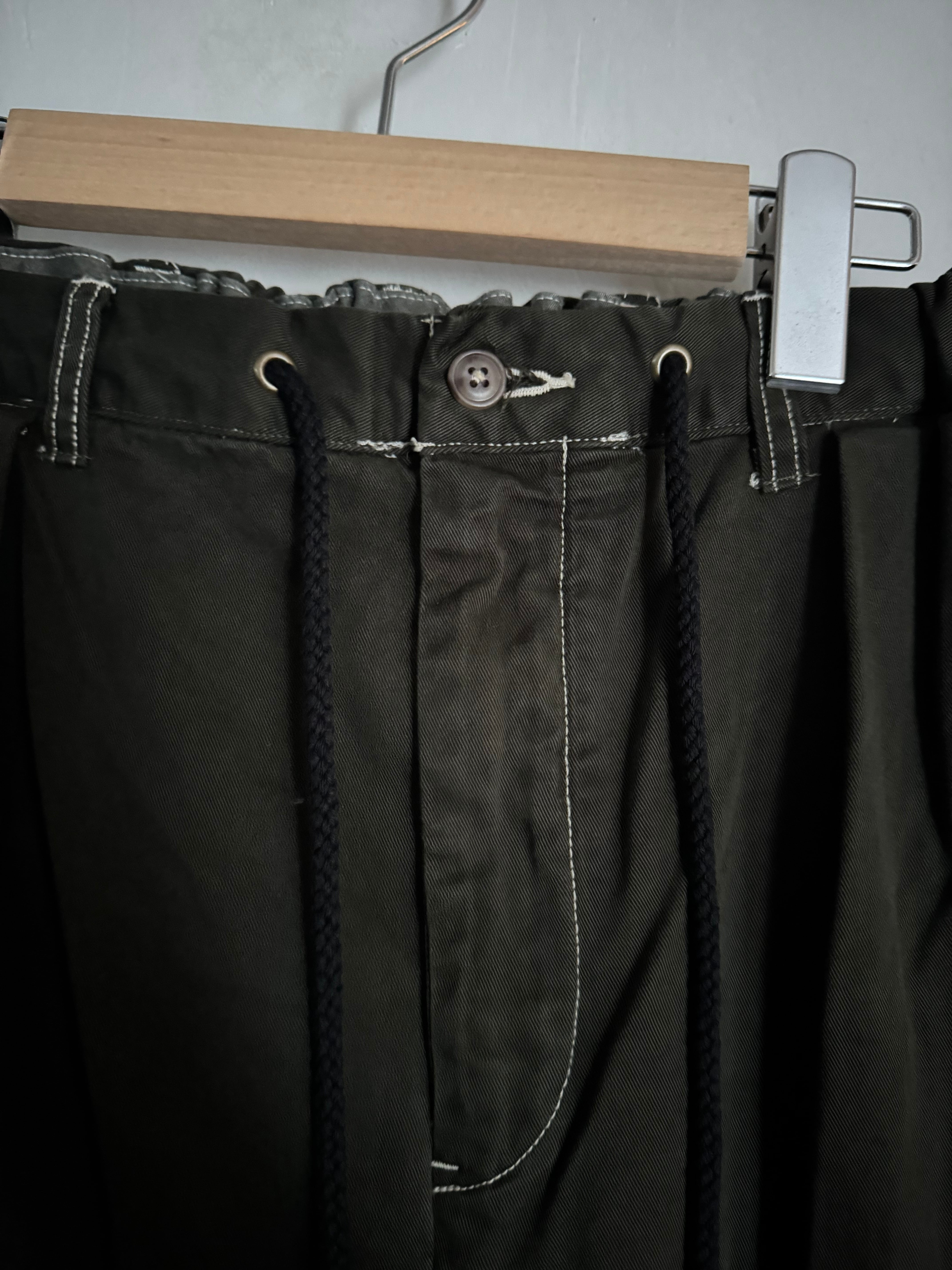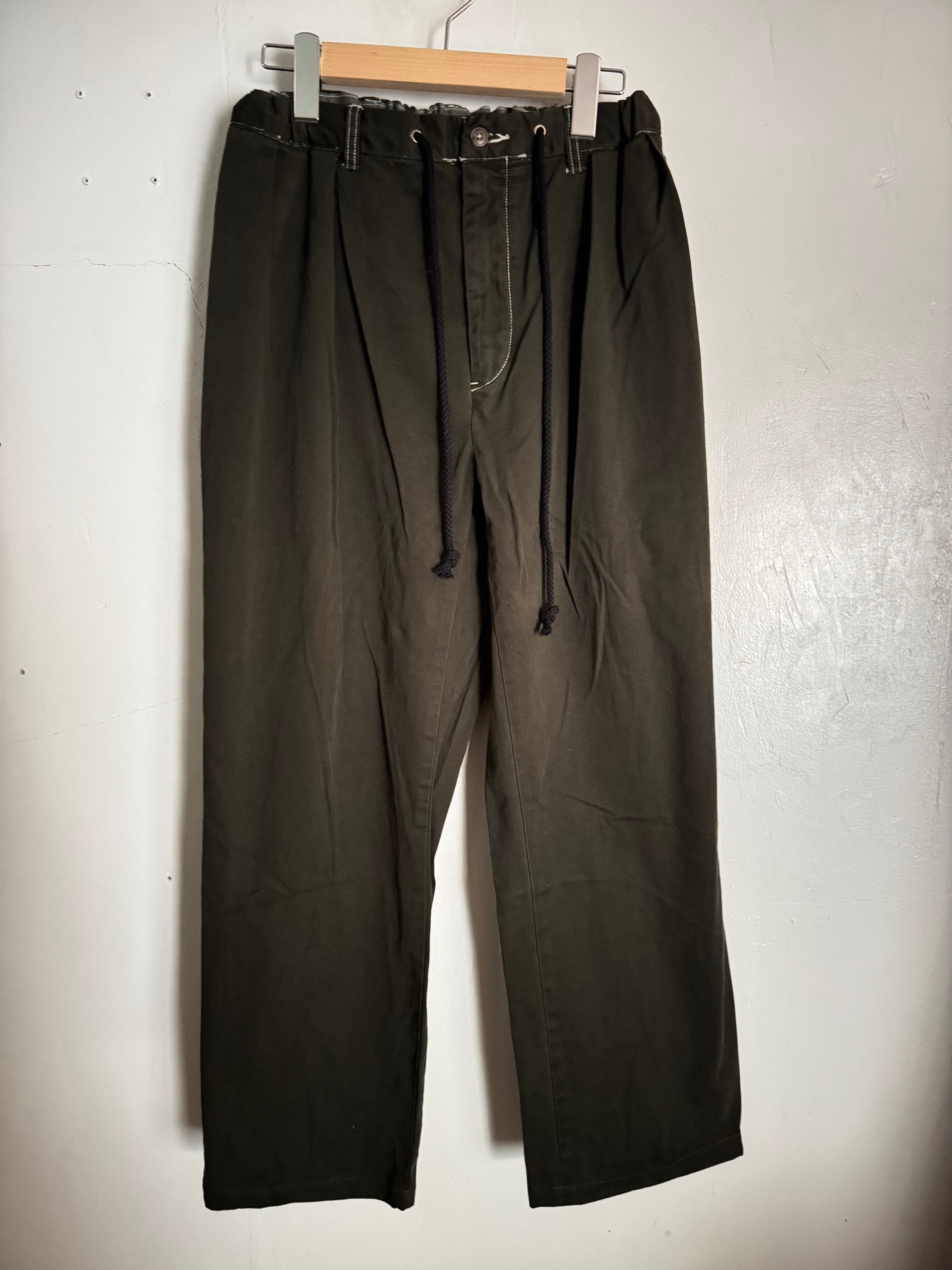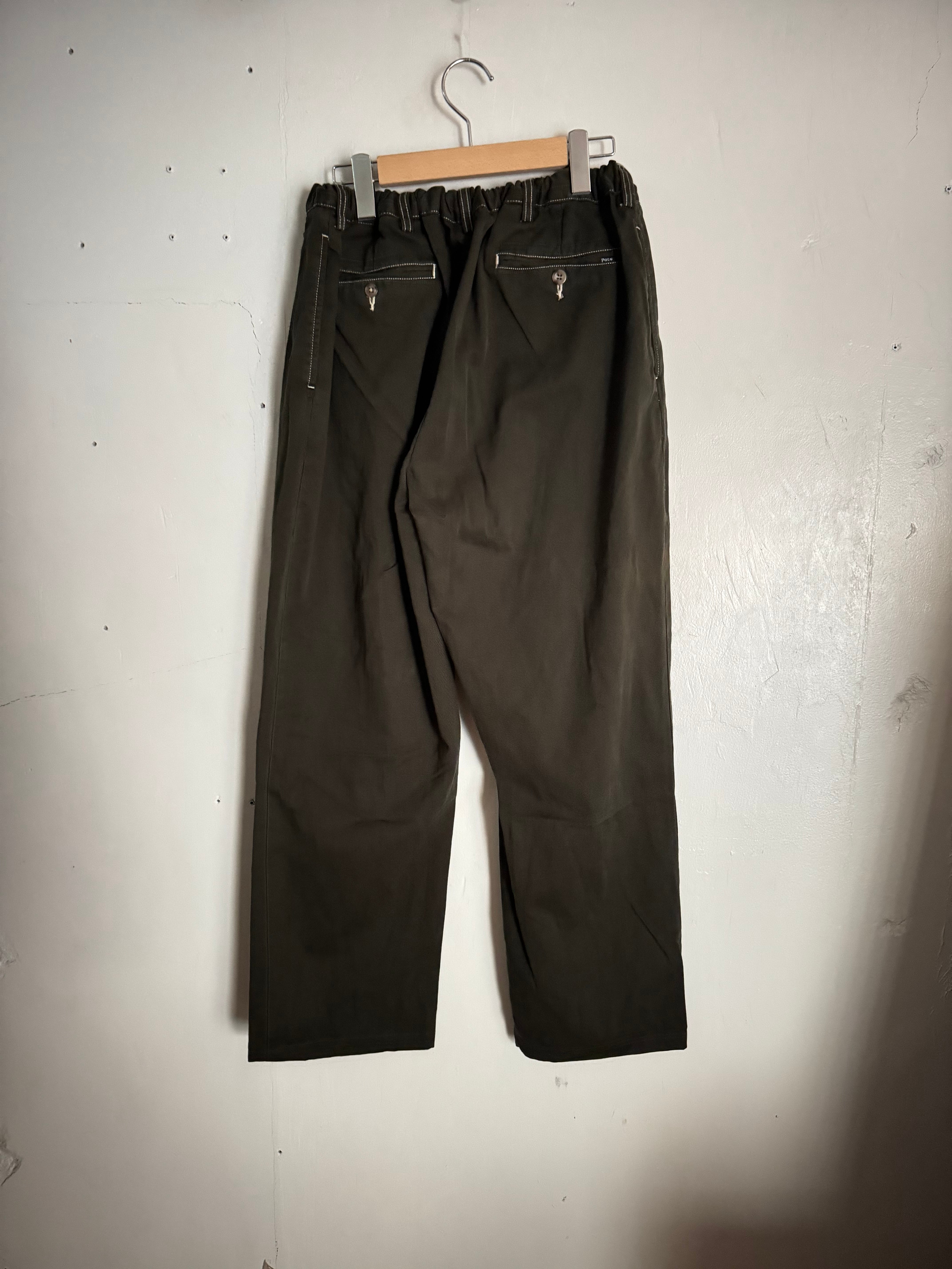 90年代ポロ・ラルフローレンの、ウエストゴム&ドローコード仕様のコットンイージーパンツ。ヴィンテージらしい渋みのあるグレイッシュカーキに白のステッチワークが絶妙なアクセントになっています。裾にかけて緩やかにテーパードする太めのシルエット、タフなコットン生地ながらイージーパンツならではの履き心地で、年中着回せる万能な一本です。