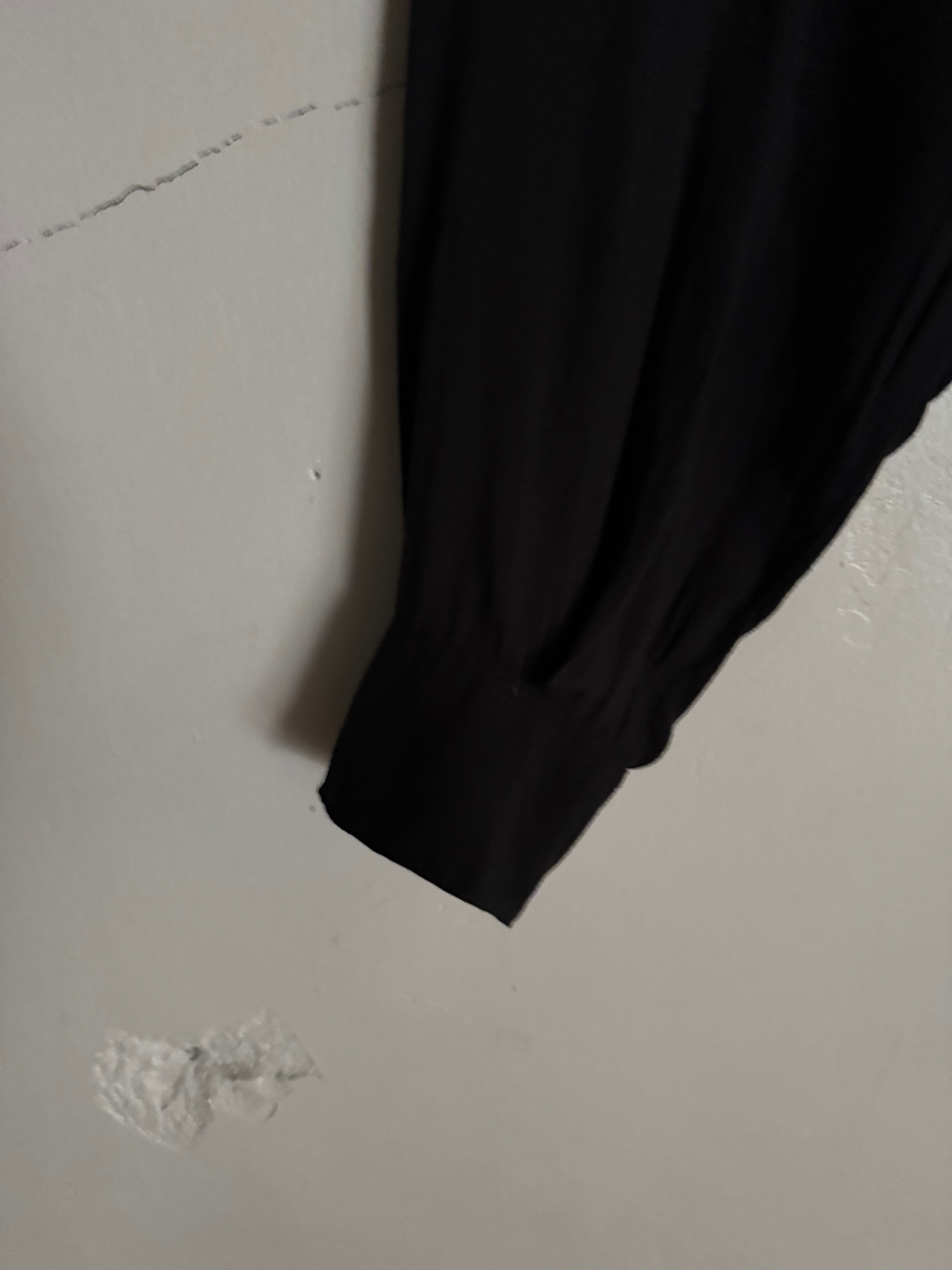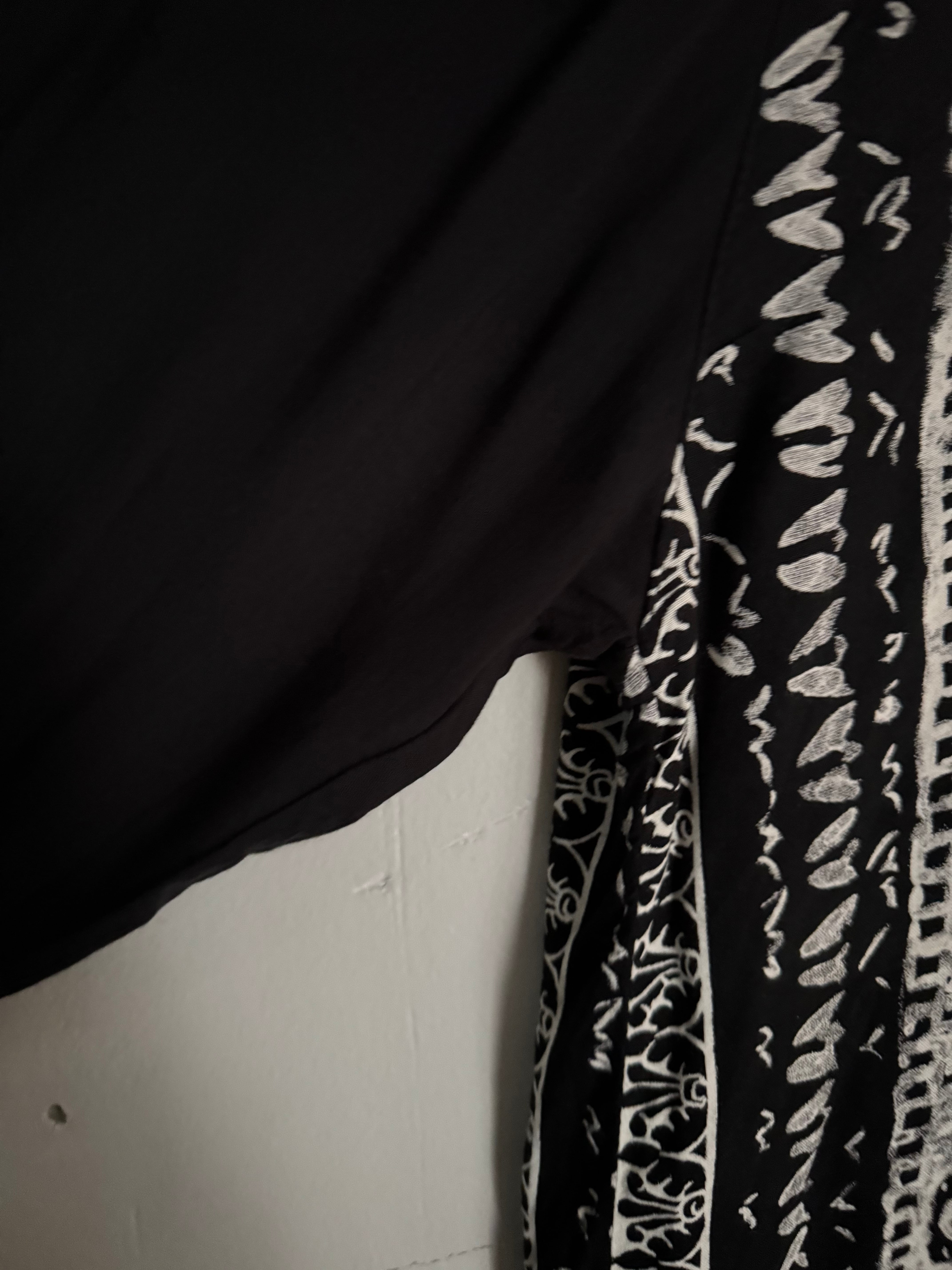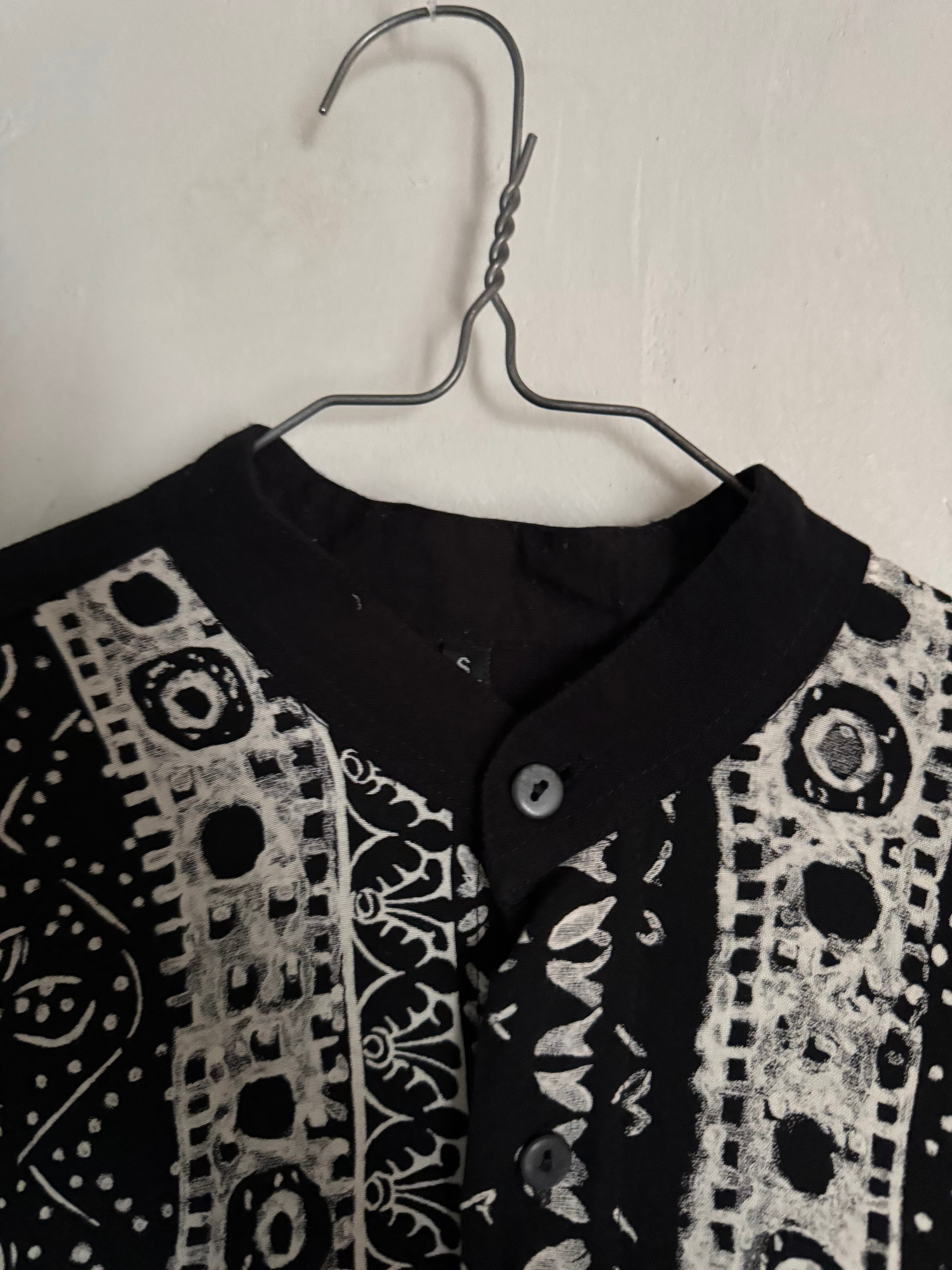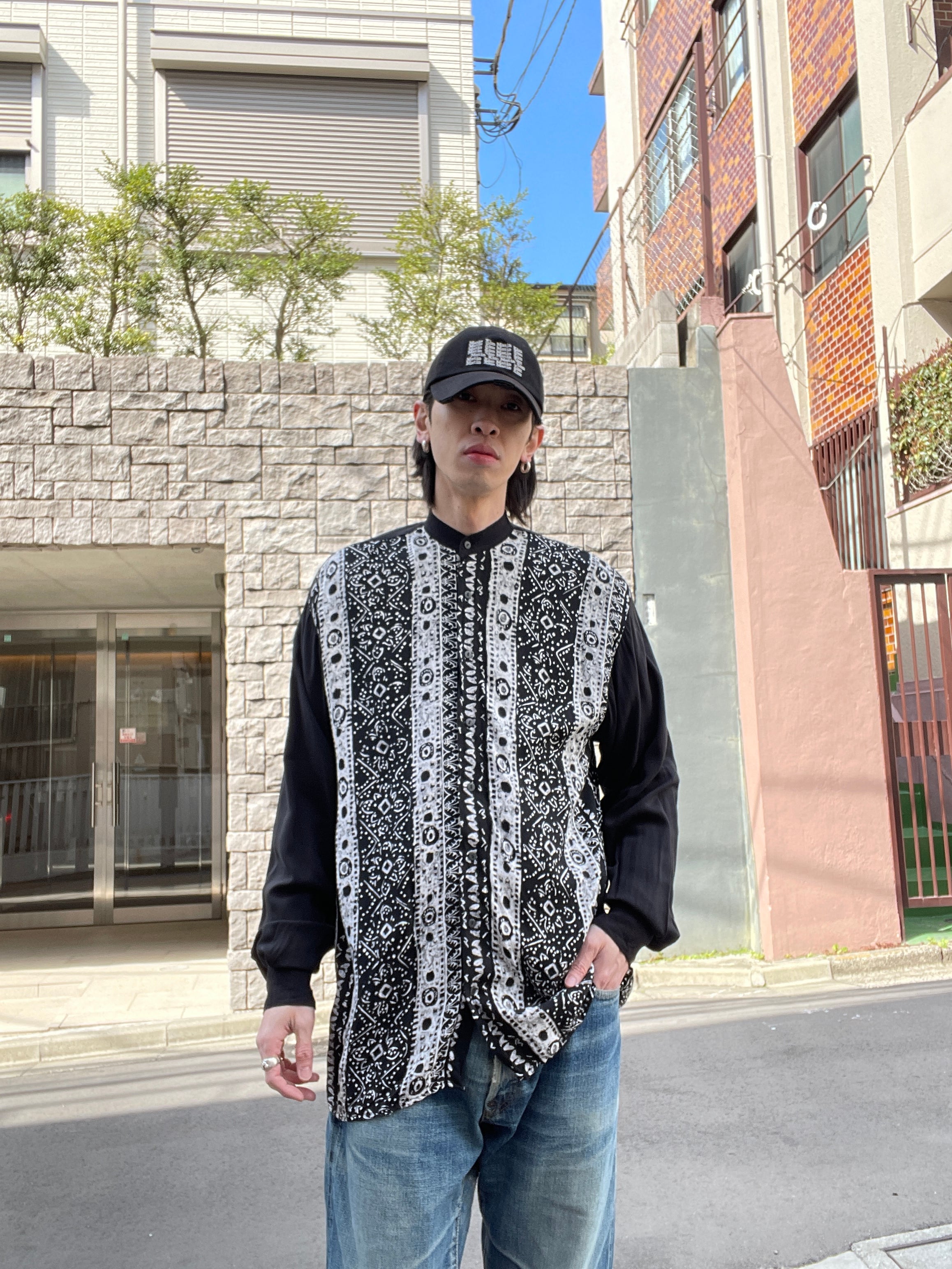 ブラックボディをベースにモノトーンの総柄デザインが施された、ノーカラーレーヨンシャツ。花や謎な模様が縦にデザインされています。ペイントで描かれたようなデザインがお洒落です。テロッとした質の良いレーヨン素材。サイズ表記はSですが、かなりゆったりとしたサイズ感。ノーカラーなので、ネックはすっきりとしていて、春には一枚でラフに決まるアイテムです。