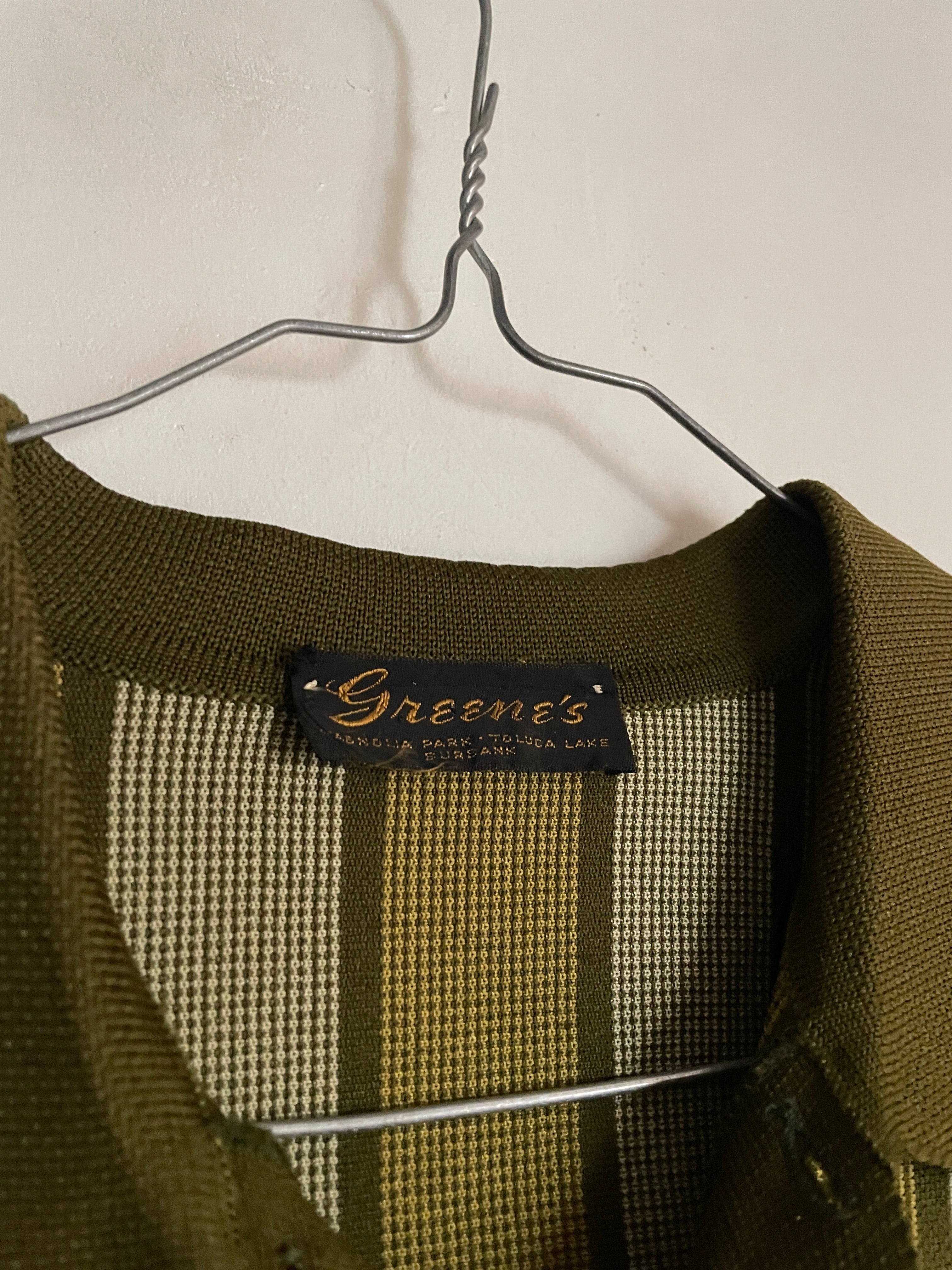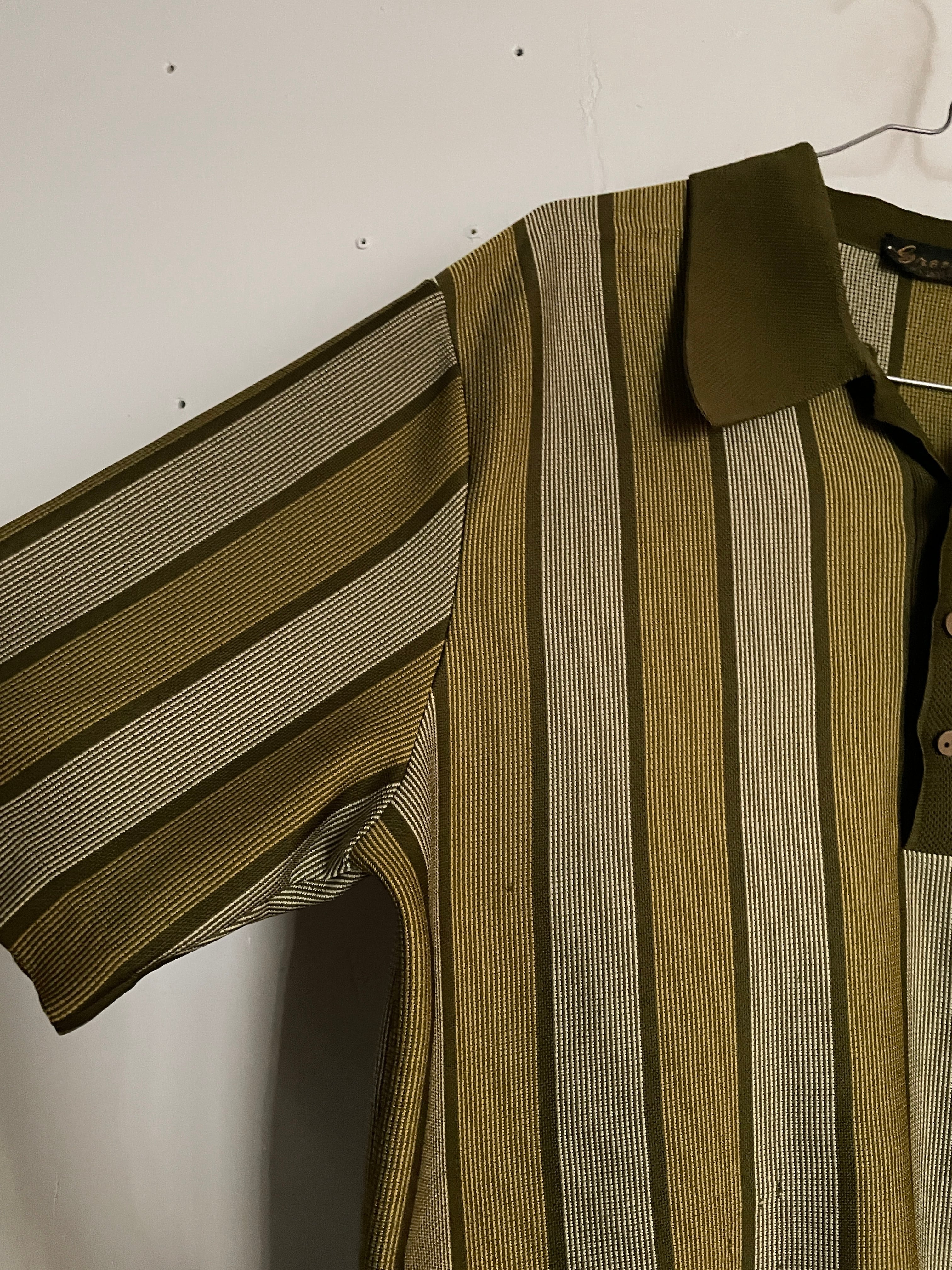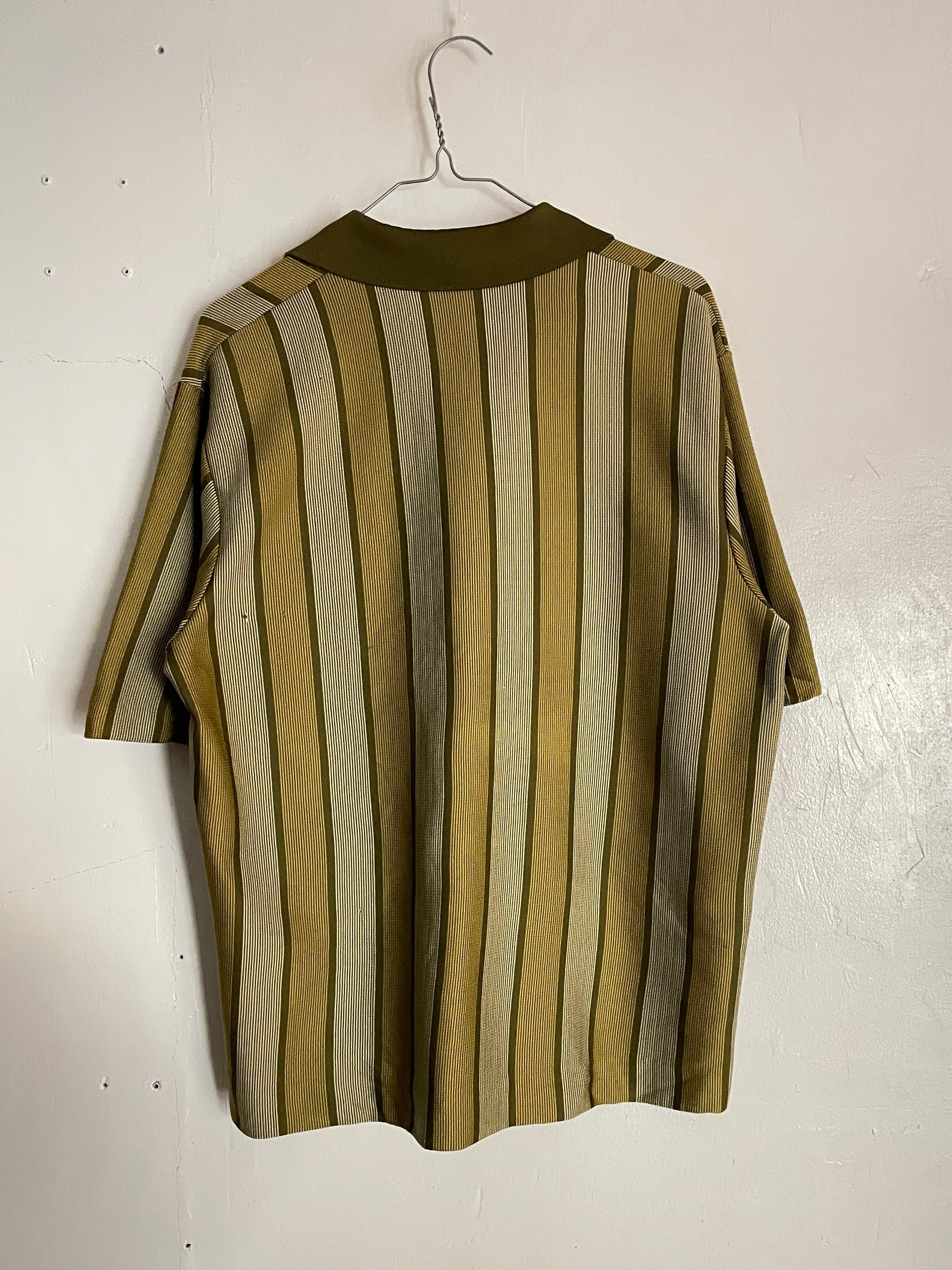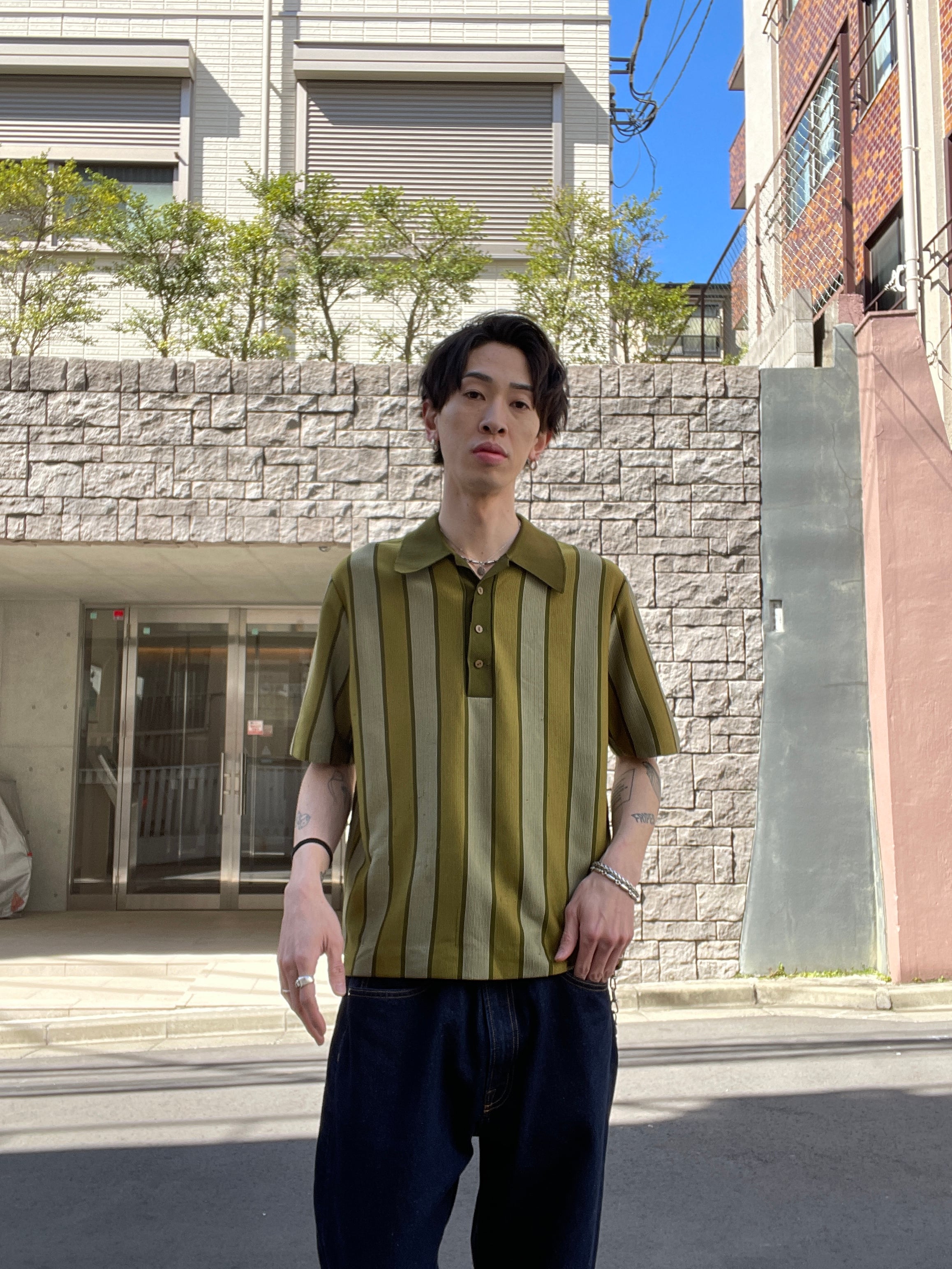 オリーブやブラウンを基調としたマルチストライプ柄デザインが魅力的な、ニットポロシャツ。レトロな雰囲気が感じられるデザインです。大振りな襟からは70年代らしさも感じられます。落ち着いたトーンなので、様々なファッションに取り入れやすそうです。伸縮性のあるポリ素材で、着心地も抜群です。ゆったりとしたサイズ感なので、ラフに着られるのも魅力的です。