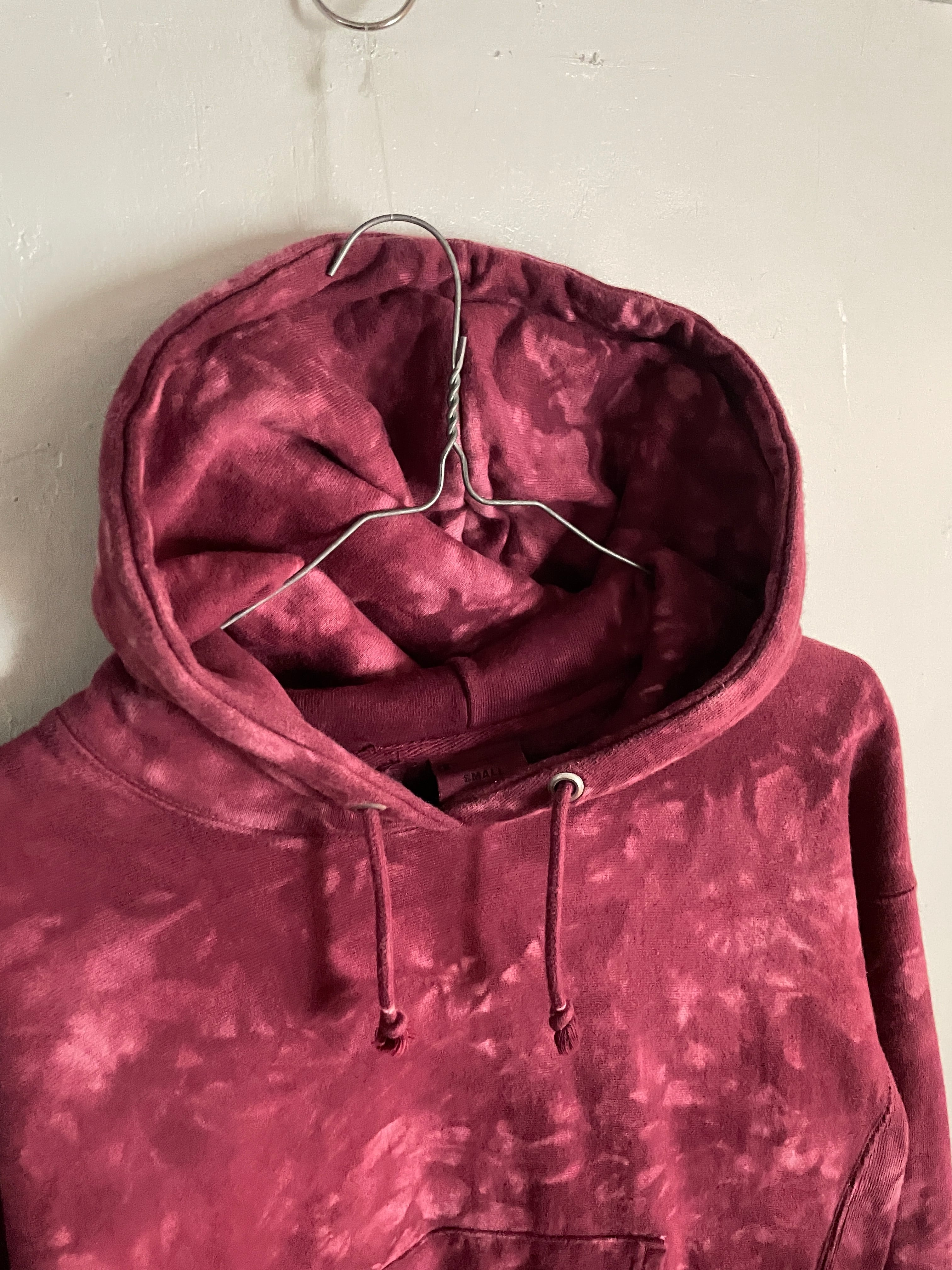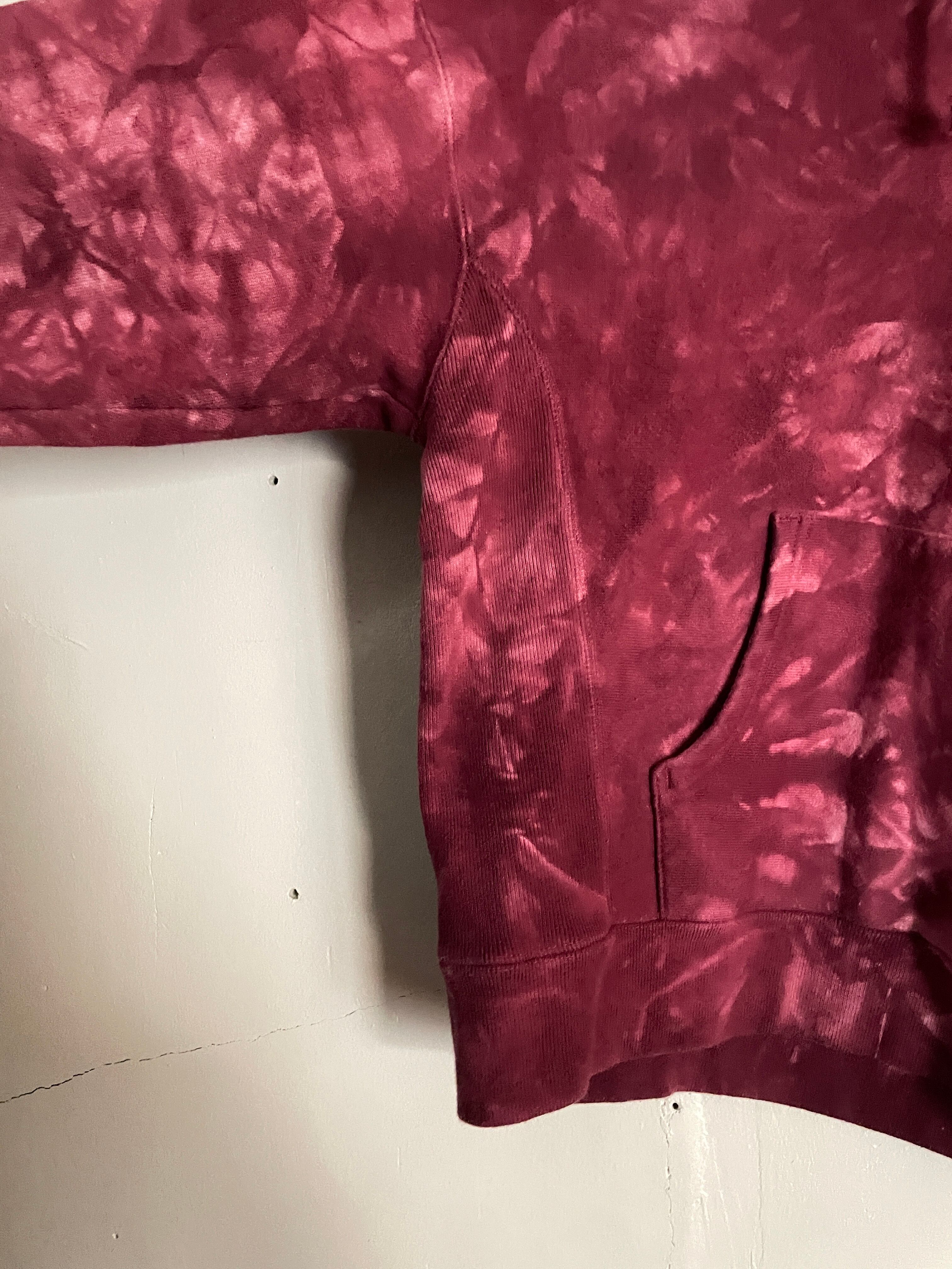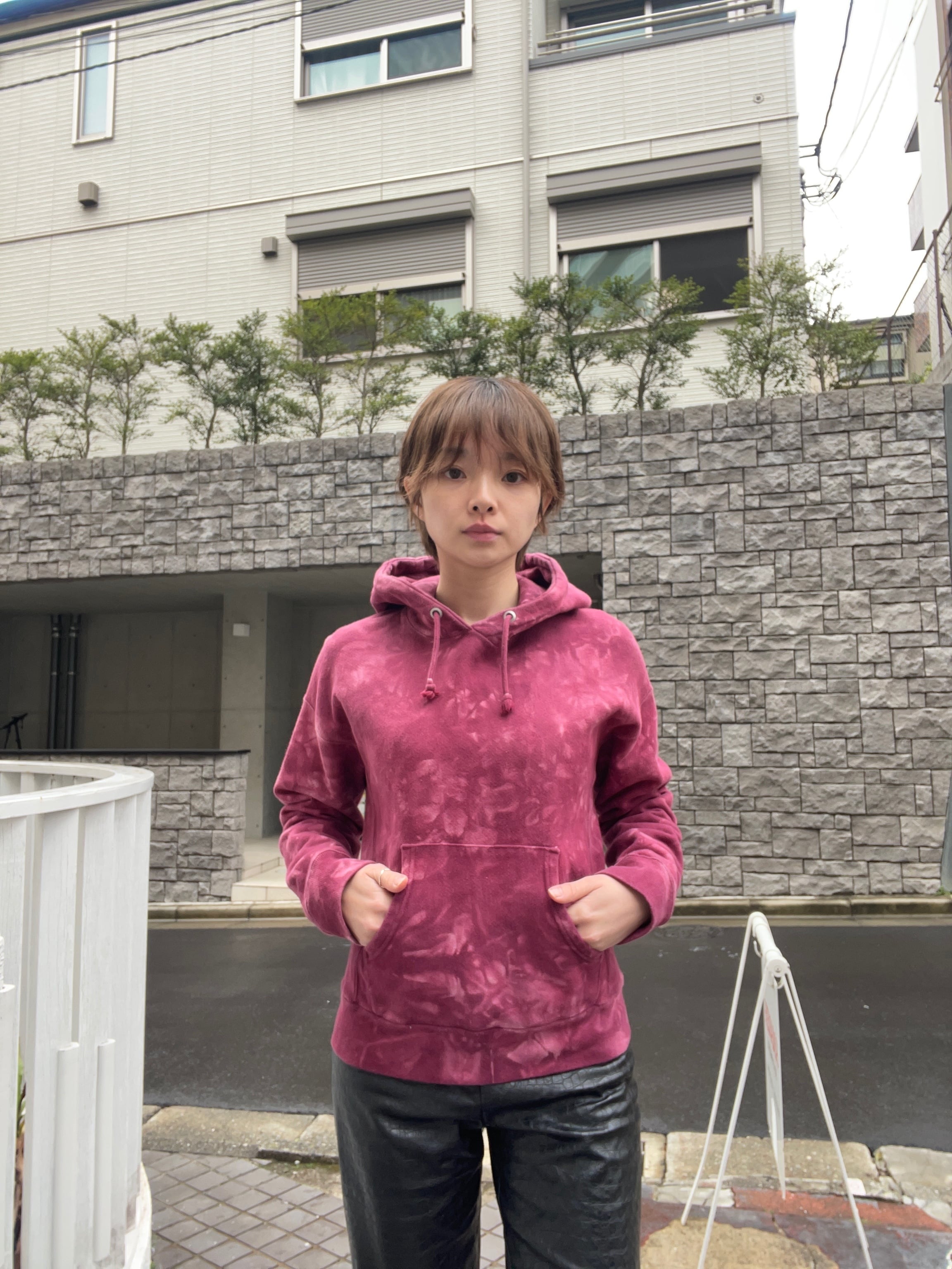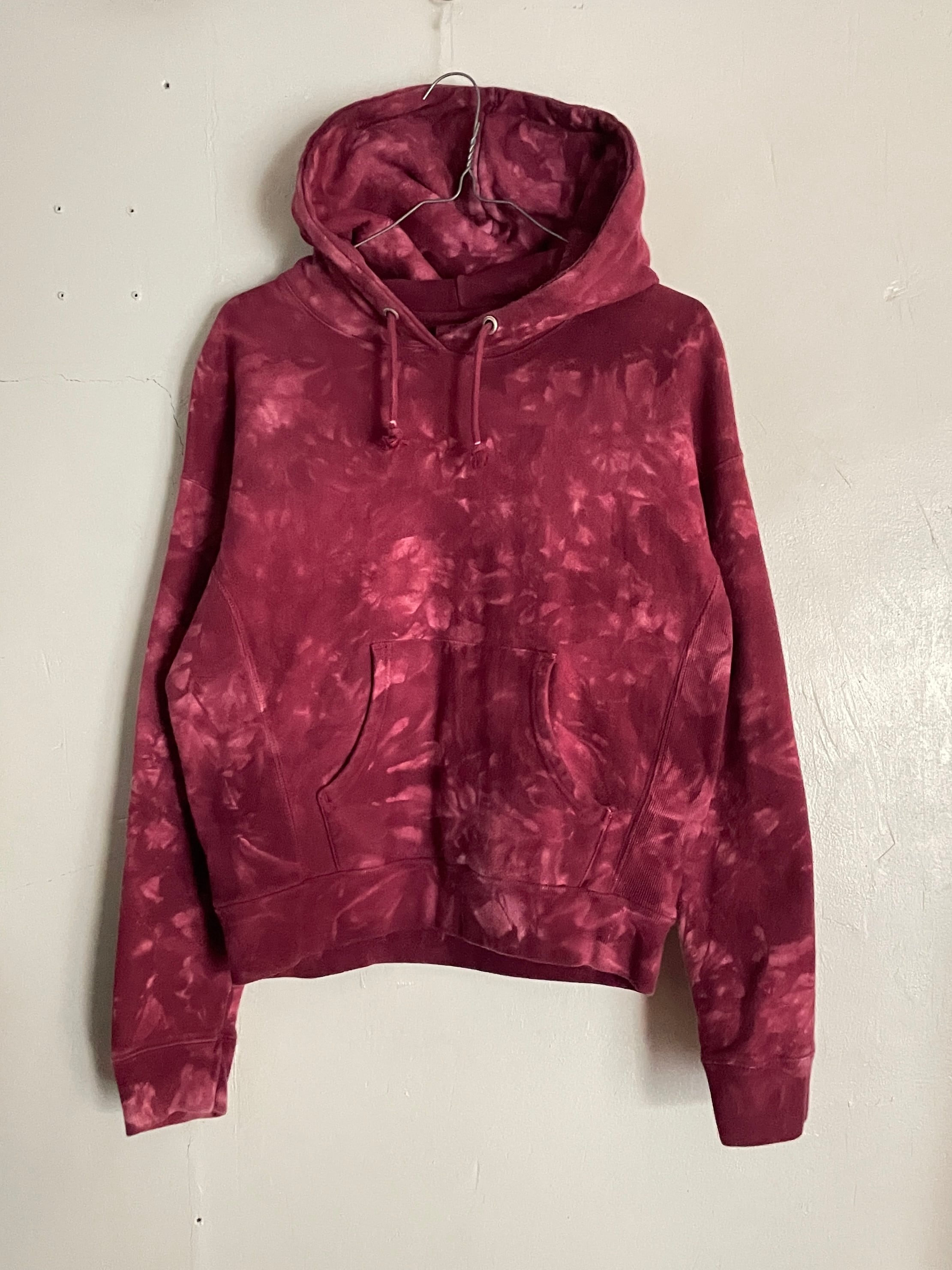 あえてムラを残した独特なタイダイ染が施された、チャンピオンリバースウィーブパーカー。ボルドーのような色気のある色味になっています。タフで頑丈なコットン、ポリ素材のスウェット生地がリバースウィーブの魅力です。短丈めでタイトなシルエット。春には一枚でファッションの主役になってくれるアイテムかと思います。