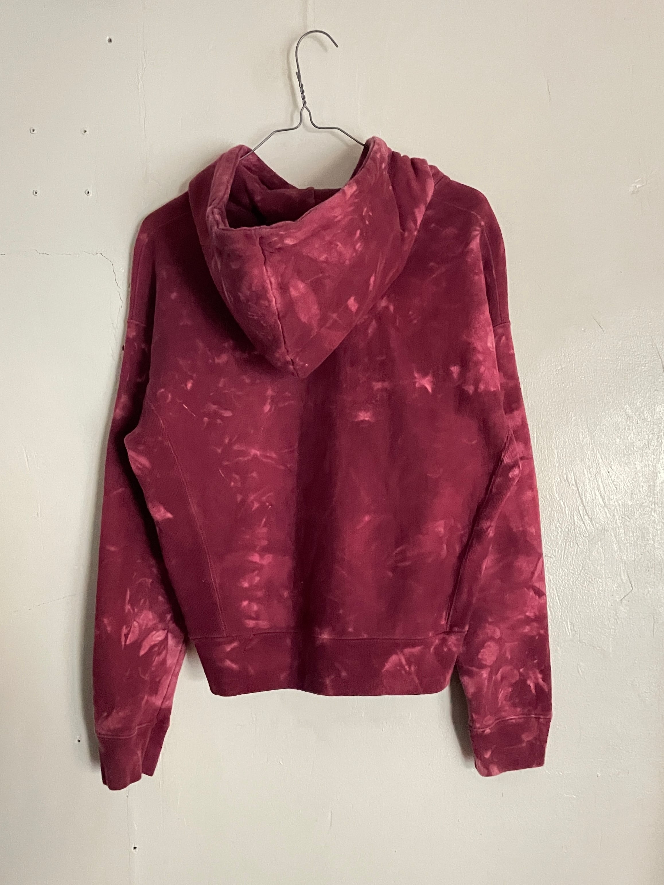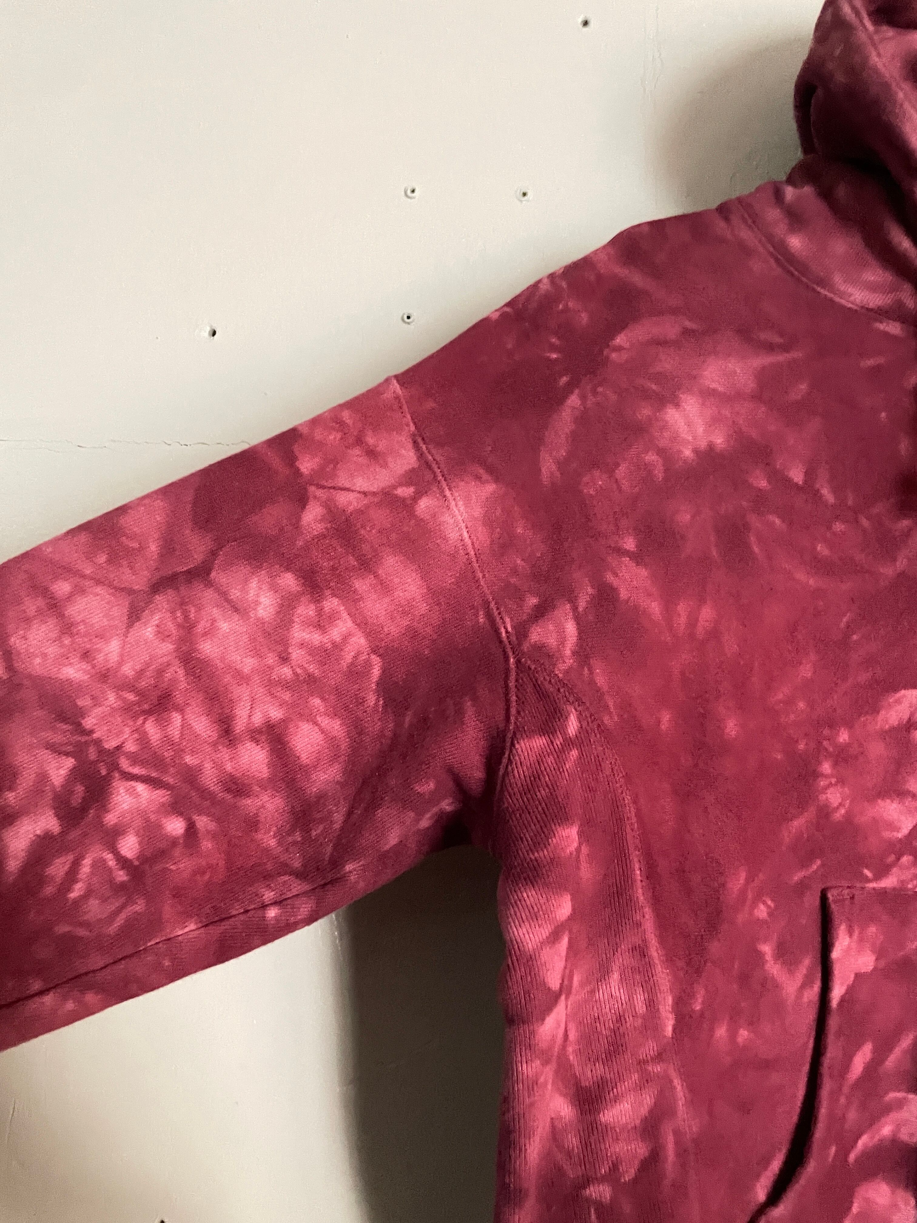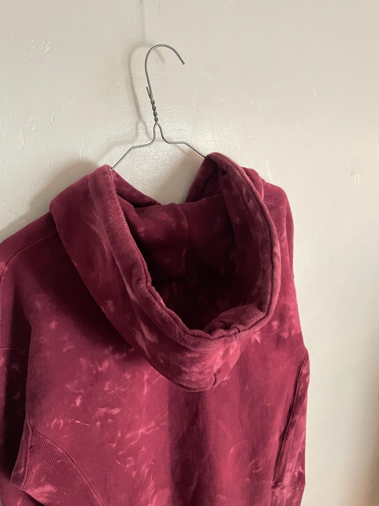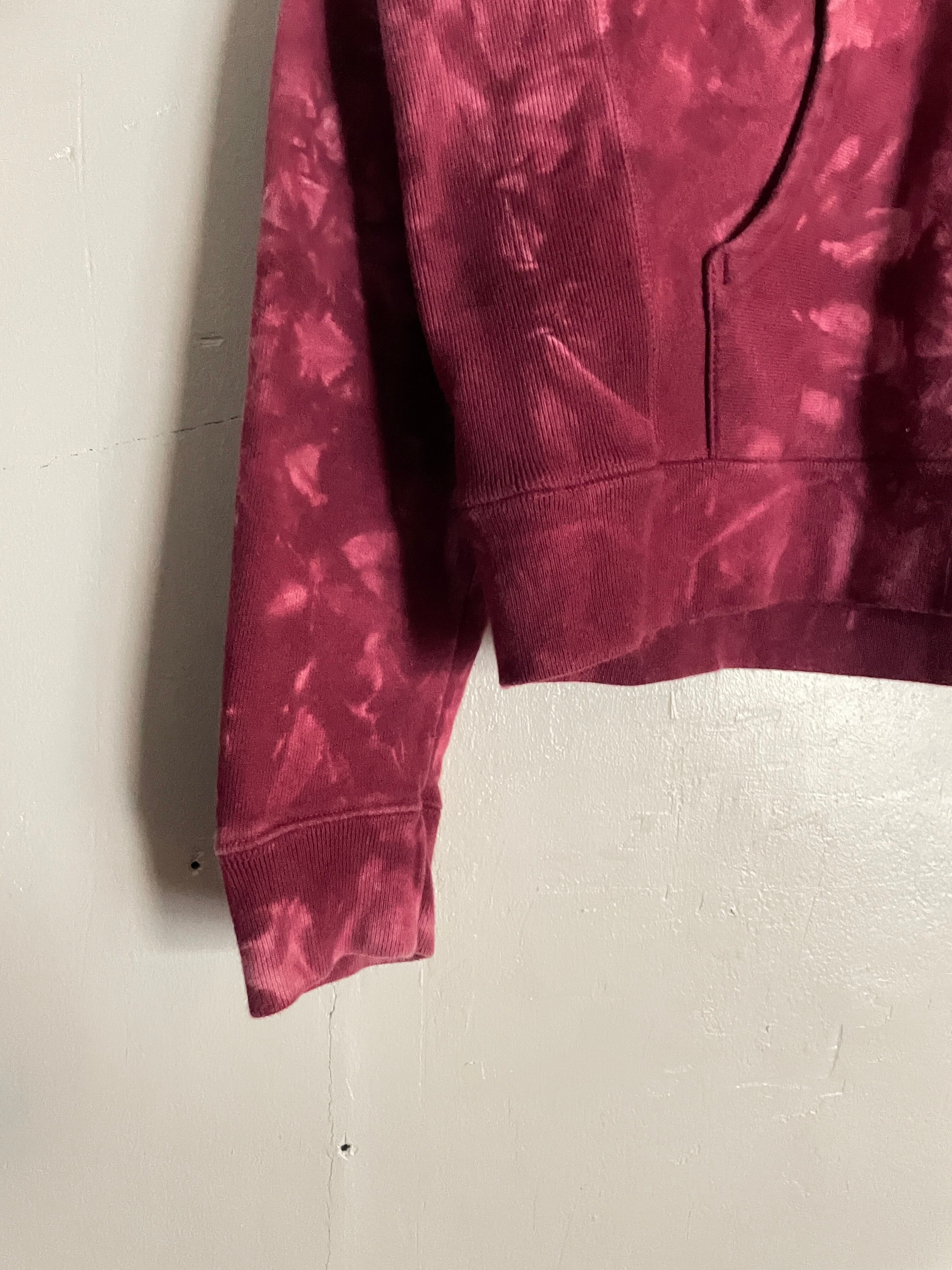 あえてムラを残した独特なタイダイ染が施された、チャンピオンリバースウィーブパーカー。ボルドーのような色気のある色味になっています。タフで頑丈なコットン、ポリ素材のスウェット生地がリバースウィーブの魅力です。短丈めでタイトなシルエット。春には一枚でファッションの主役になってくれるアイテムかと思います。