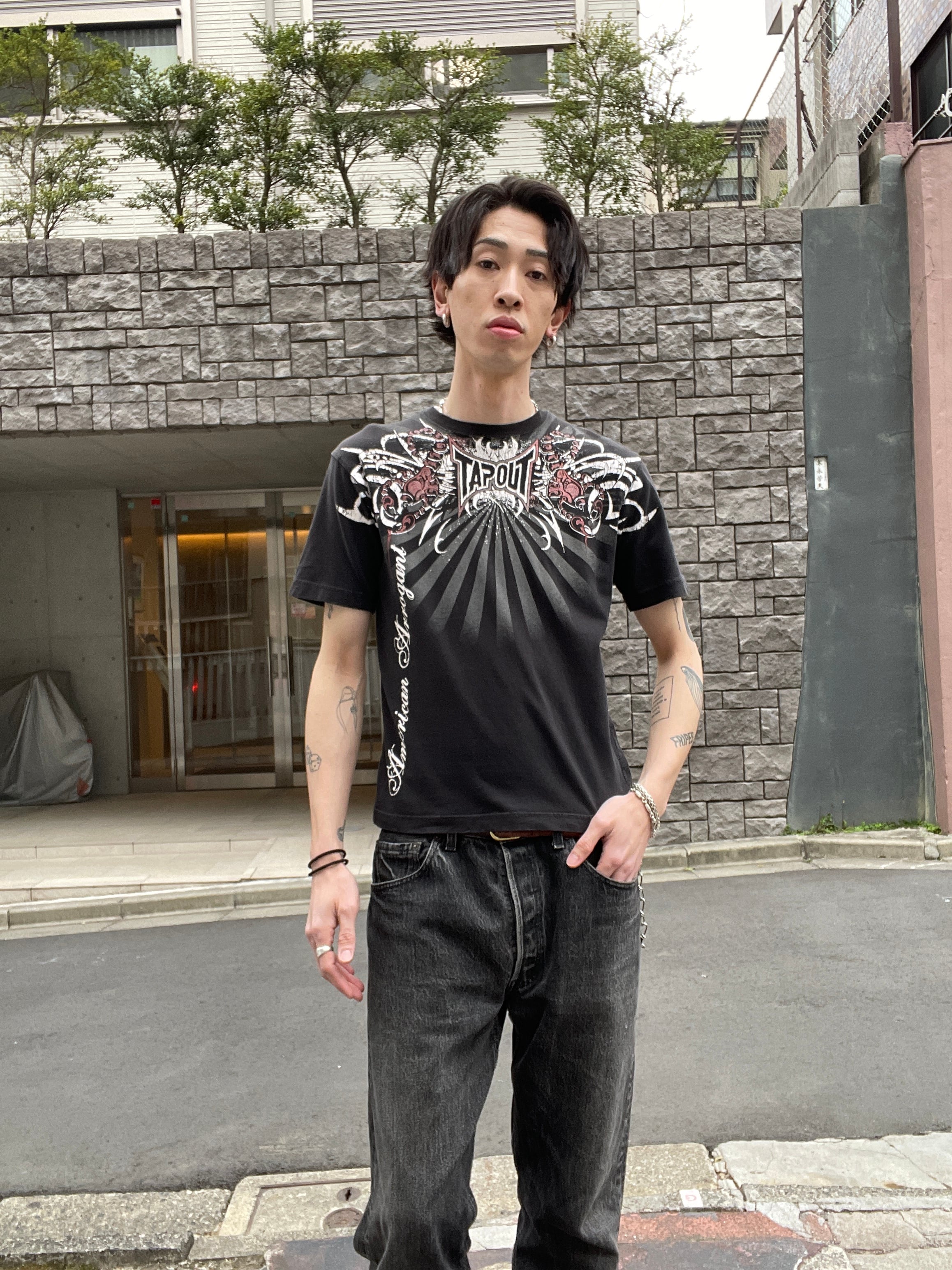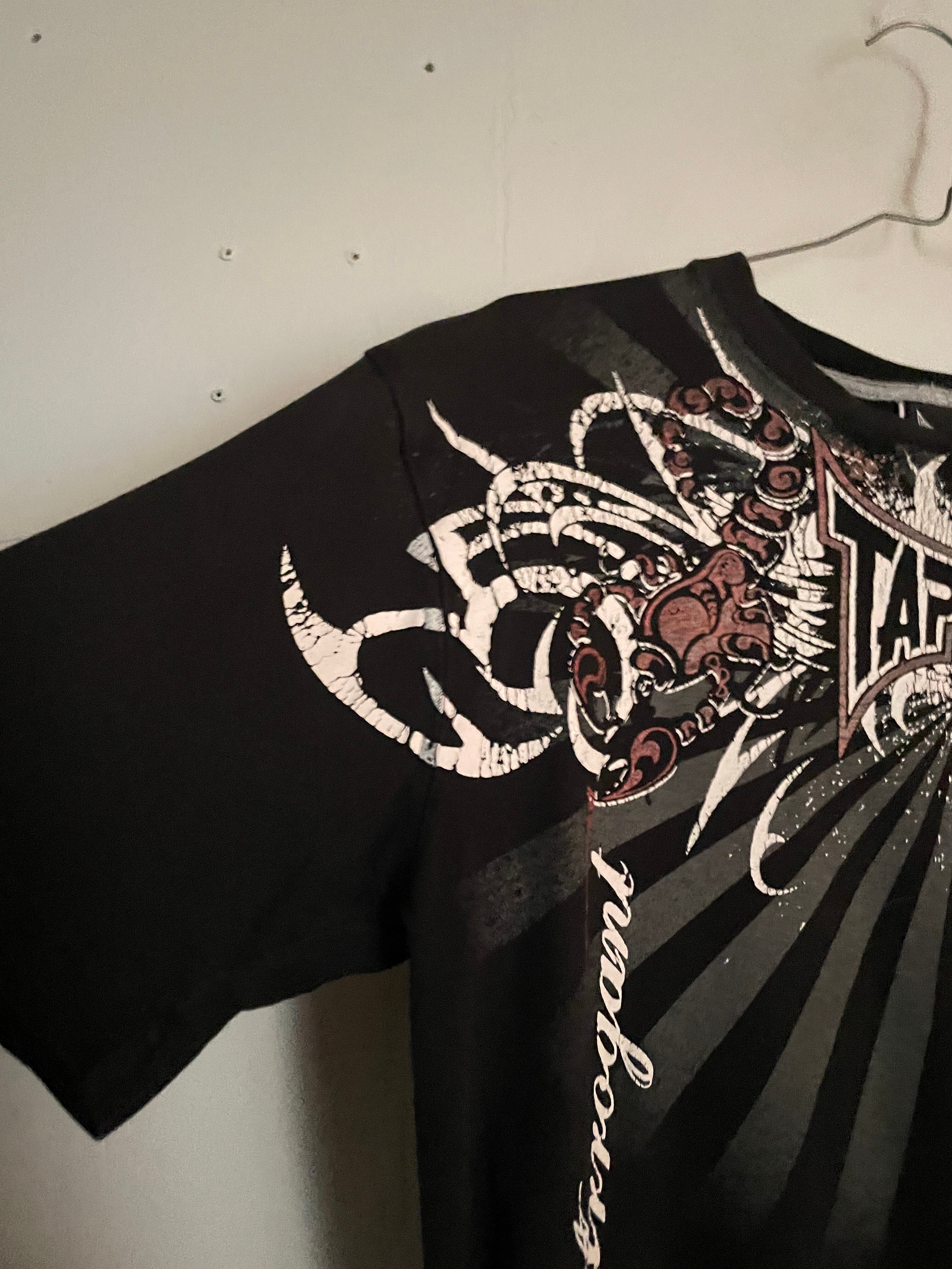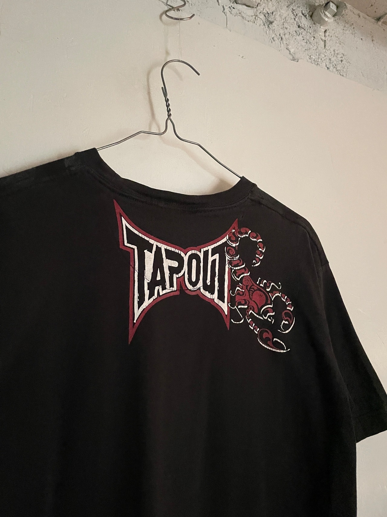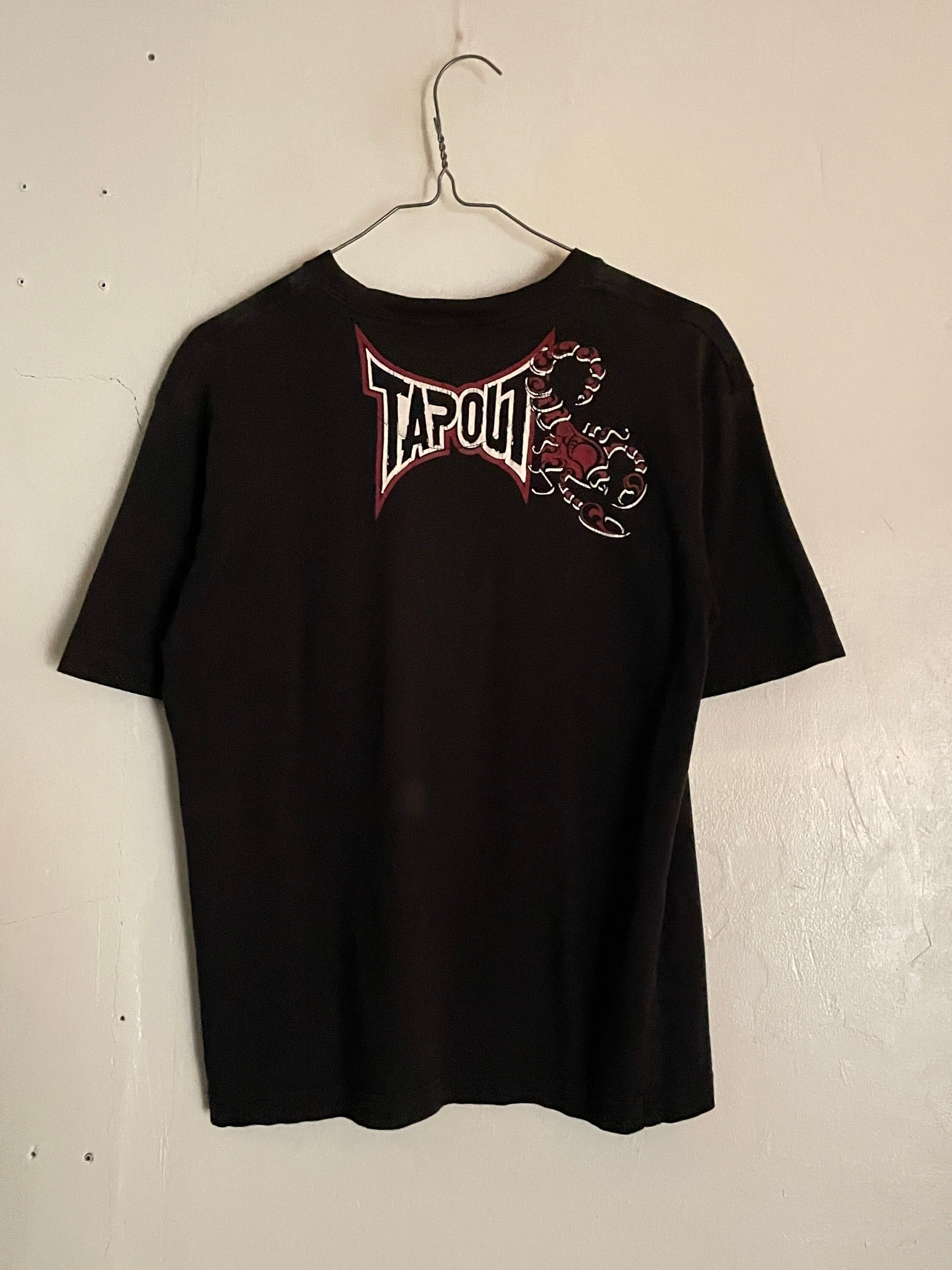 ブラックボディに、Y2Kな雰囲気が感じられるデザインが魅力的な、”TAPOUT"のTシャツ。アメリカ発の格闘技”MMA"ブランドです。スコーピオン、トライバル柄、ブランドネームプリントがインパクトのあるデザインでプリントされています。両面プリントなのも魅力的です。大き過ぎず、小さ過ぎないサイズ感で、一枚ではもちろん、インナーとしても活躍してくれる一着です。