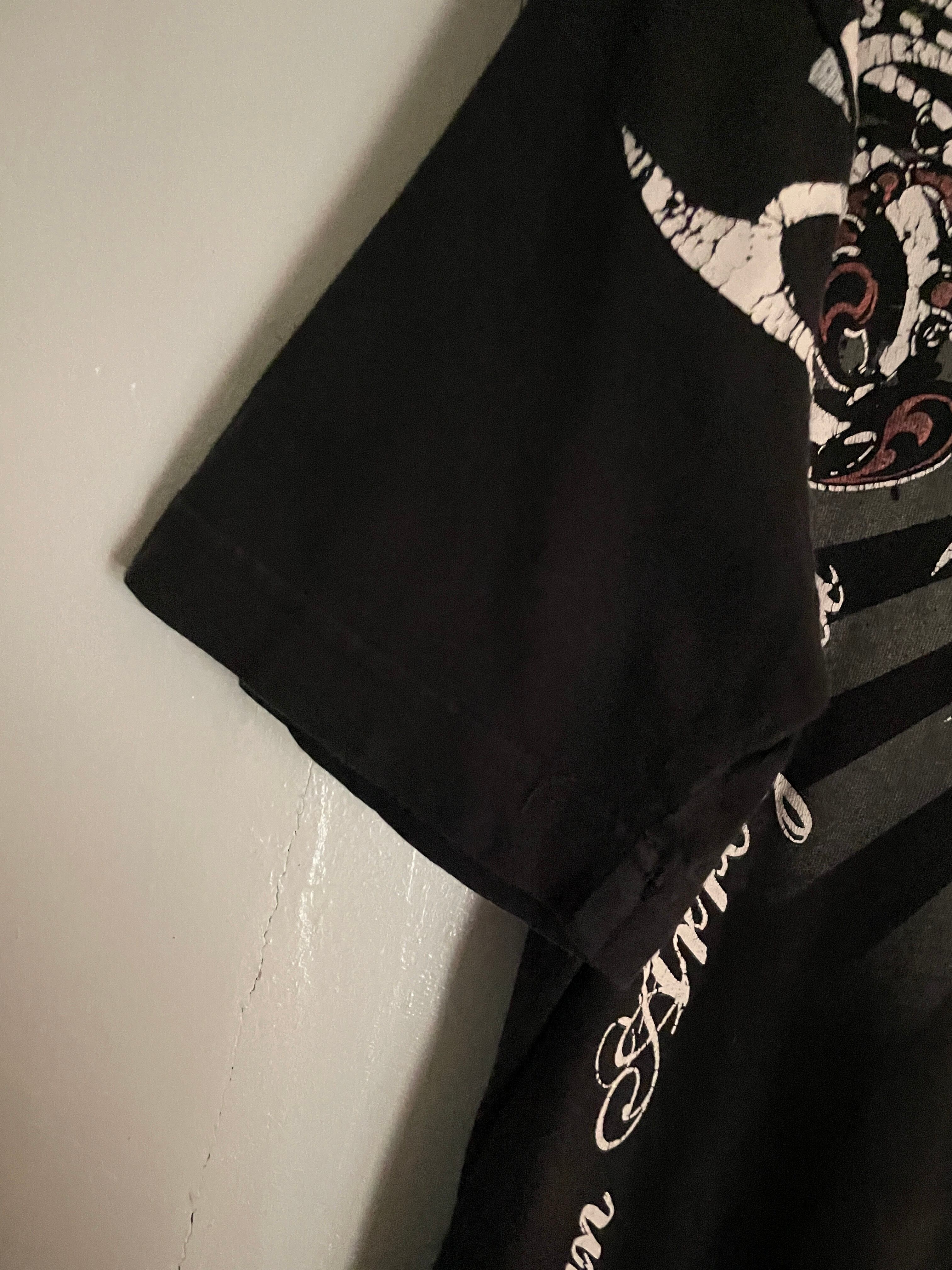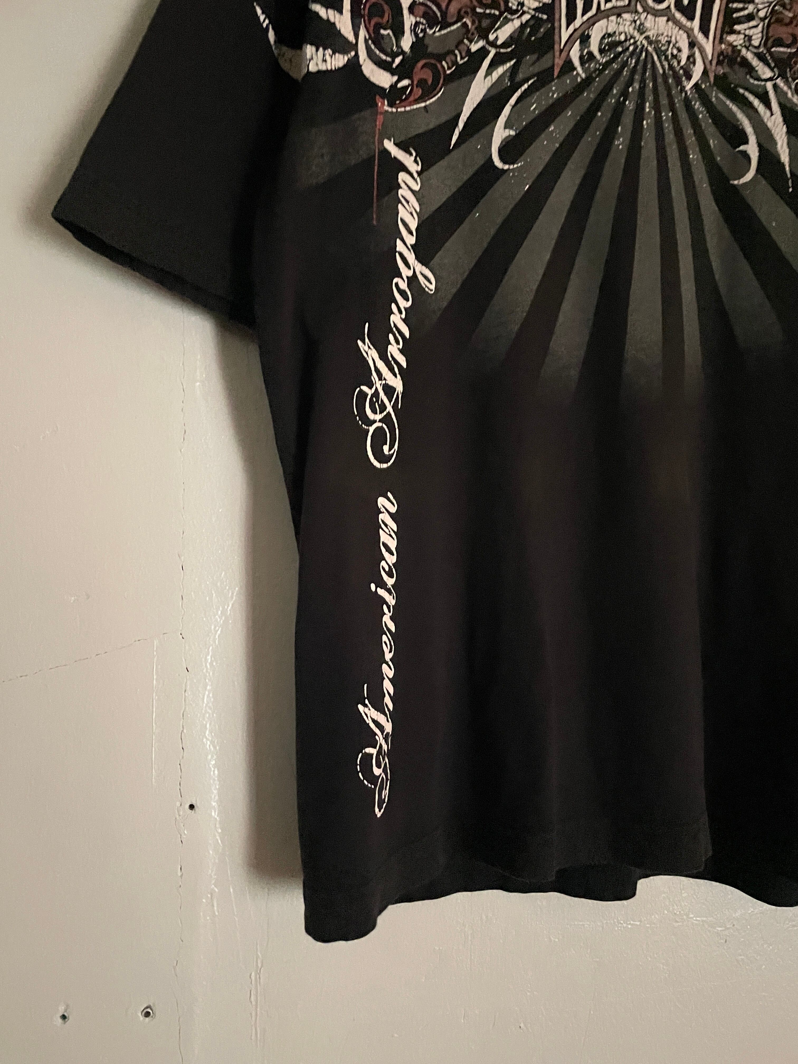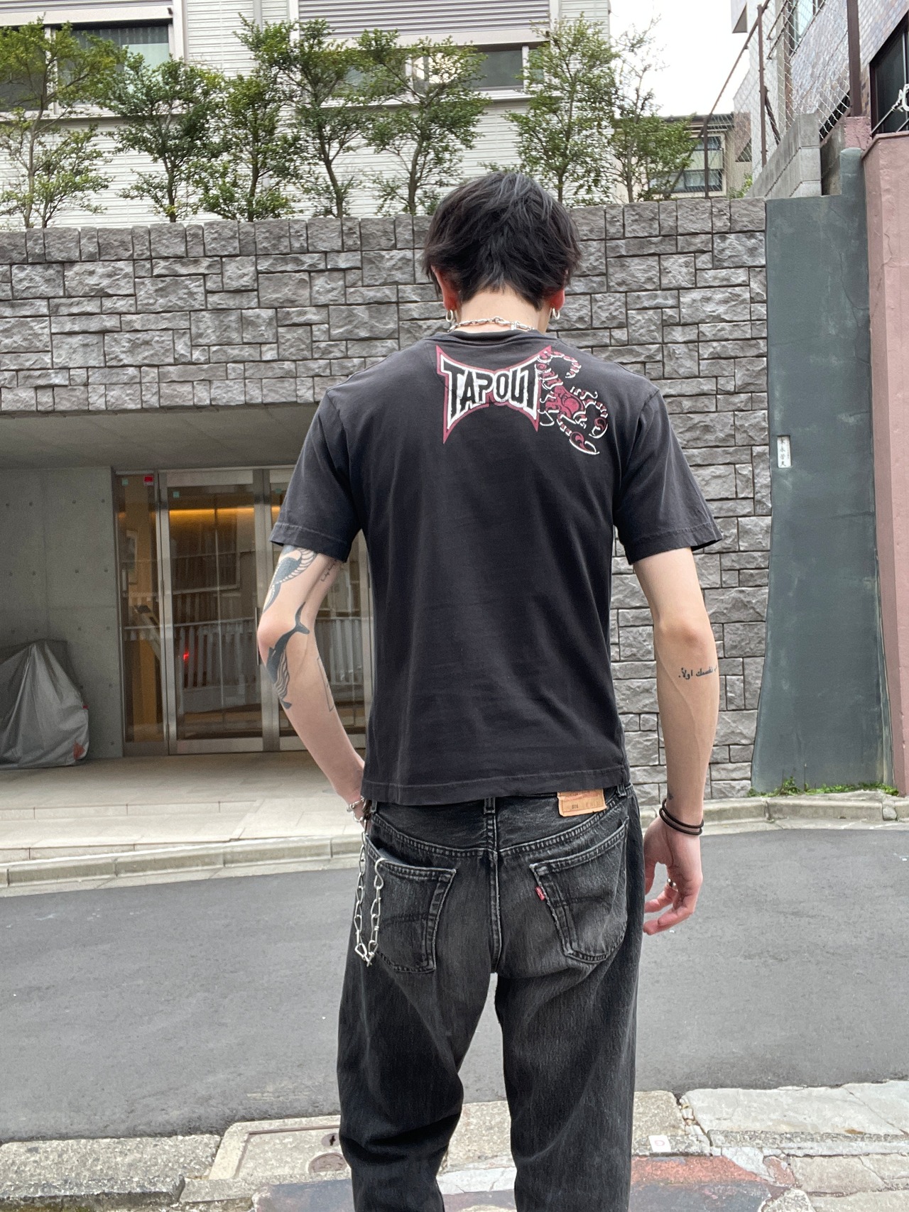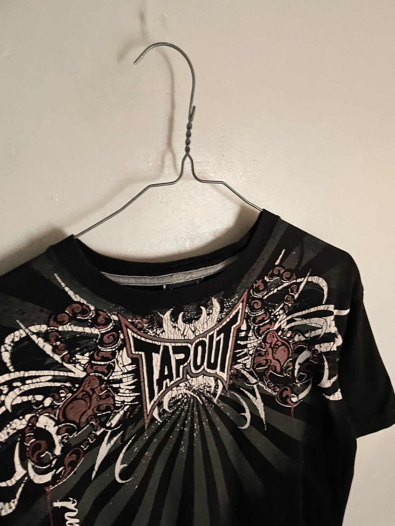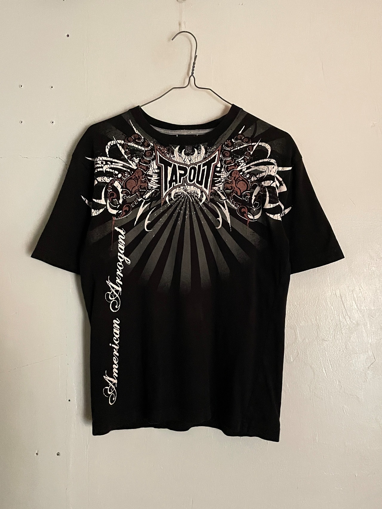 ブラックボディに、Y2Kな雰囲気が感じられるデザインが魅力的な、”TAPOUT"のTシャツ。アメリカ発の格闘技”MMA"ブランドです。スコーピオン、トライバル柄、ブランドネームプリントがインパクトのあるデザインでプリントされています。両面プリントなのも魅力的です。大き過ぎず、小さ過ぎないサイズ感で、一枚ではもちろん、インナーとしても活躍してくれる一着です。