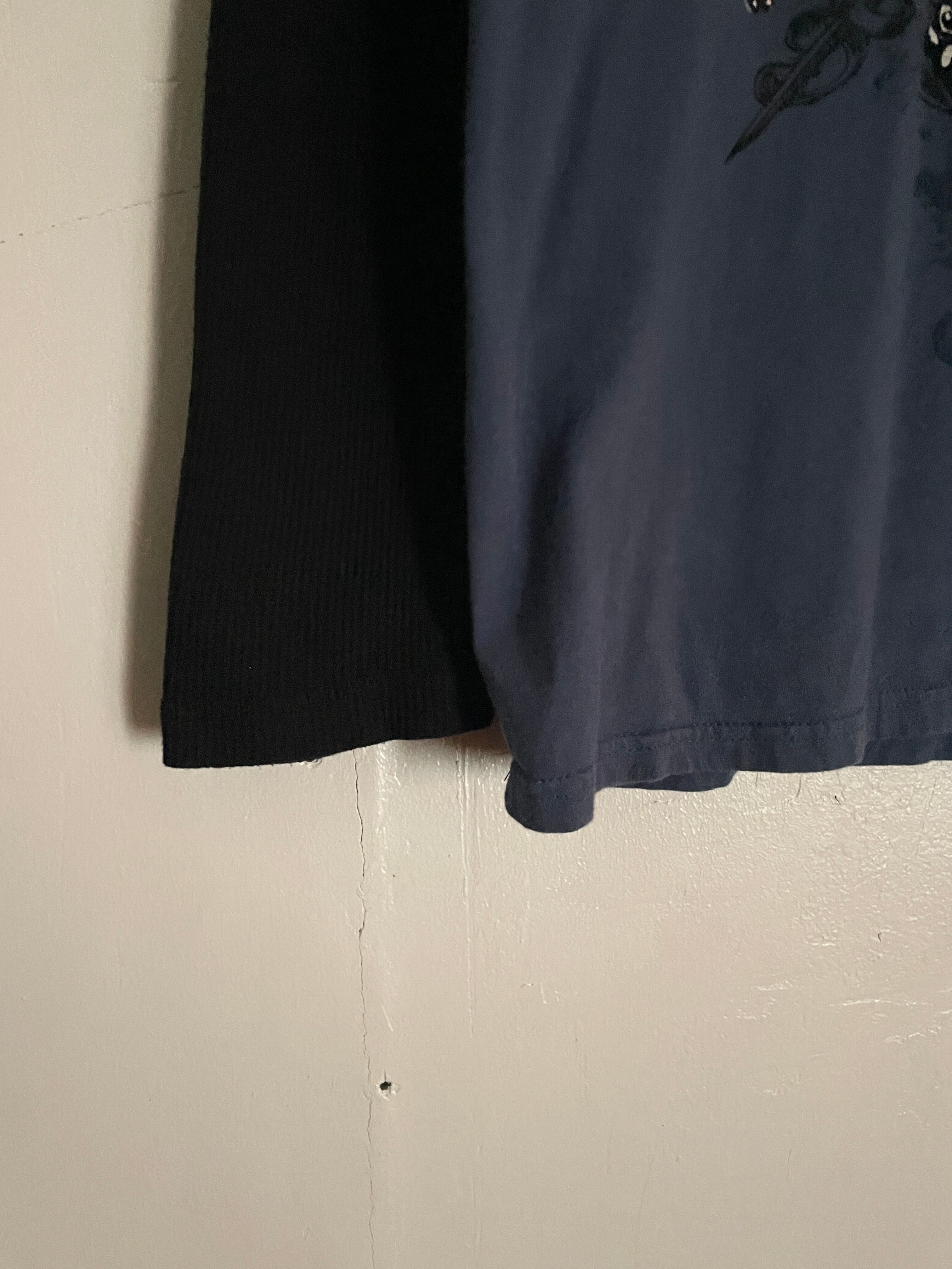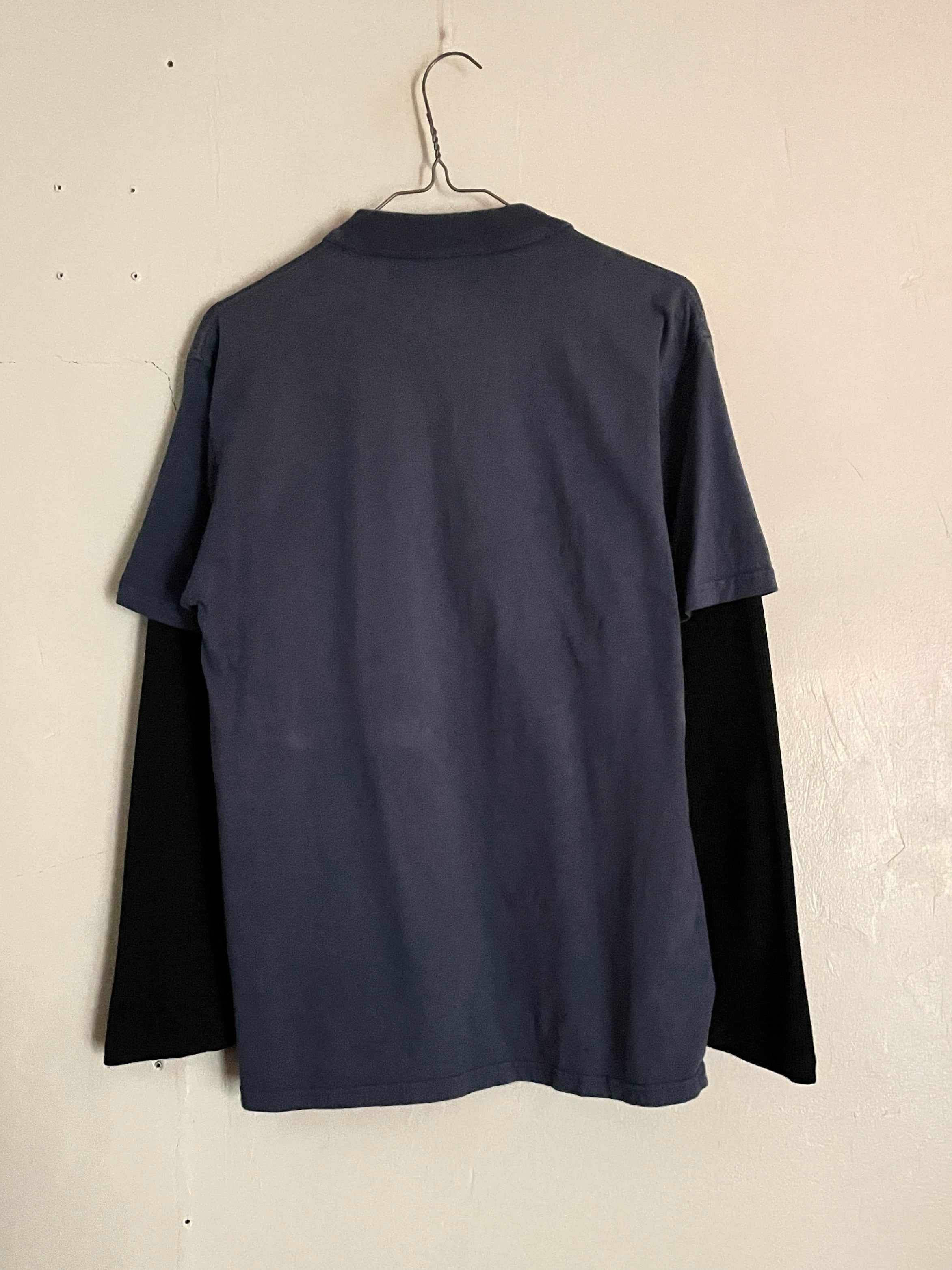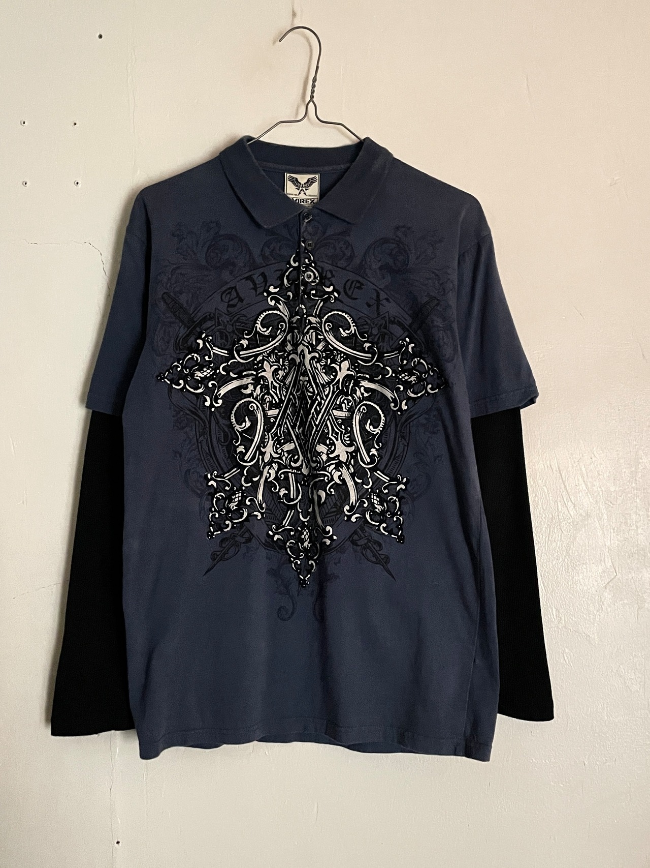 淡いブルーボディに、紋章のようなプリントが大胆に施された、アヴィレックスのレイヤードポロシャツ。Y2Kな雰囲気ががっつりと感じられるディテールになっています。レイヤード部分はサーマル生地になっています。着丈長めのややタイトめなシルエット。春には一枚でファッションの主役になってくれそうです。