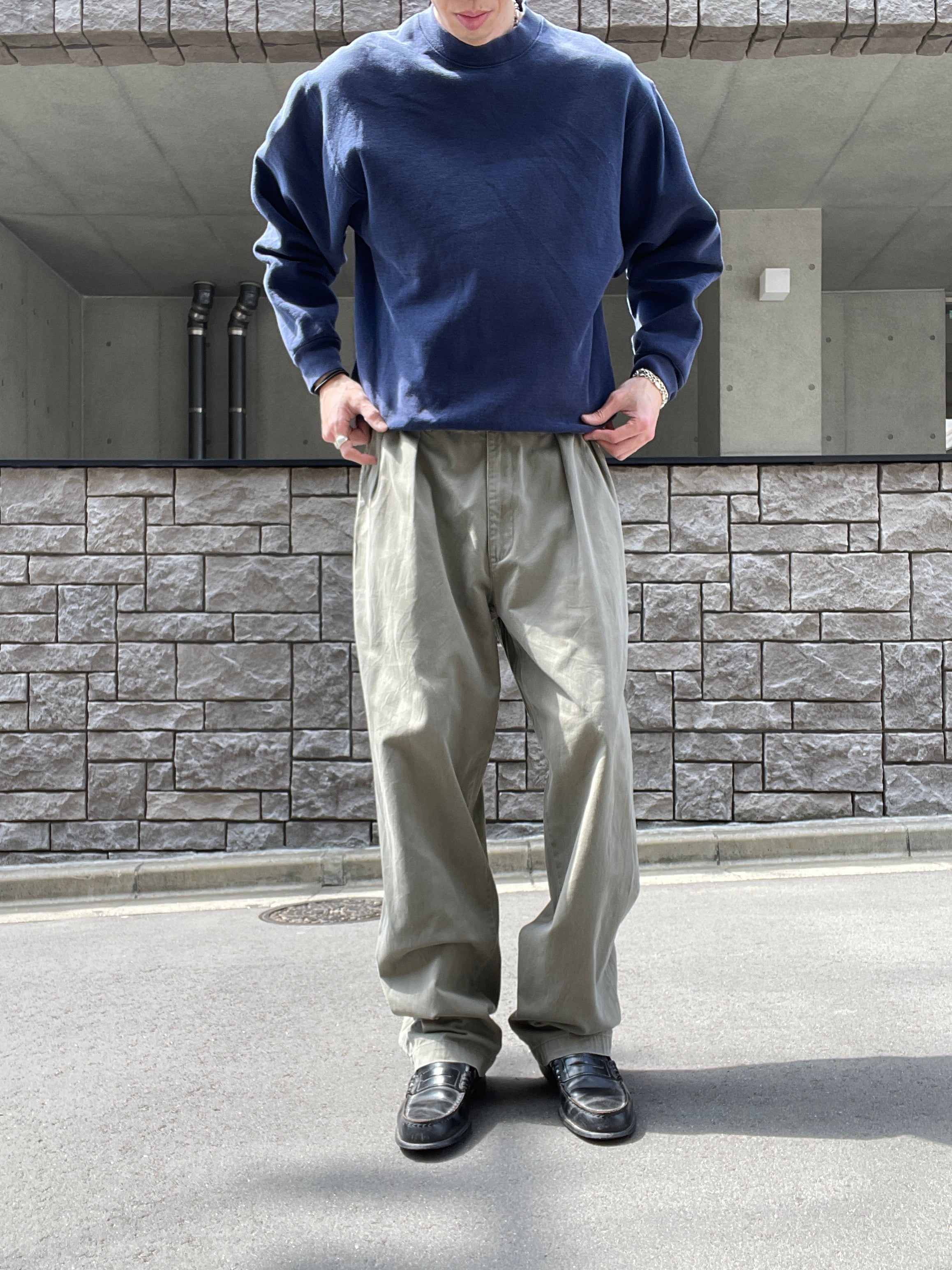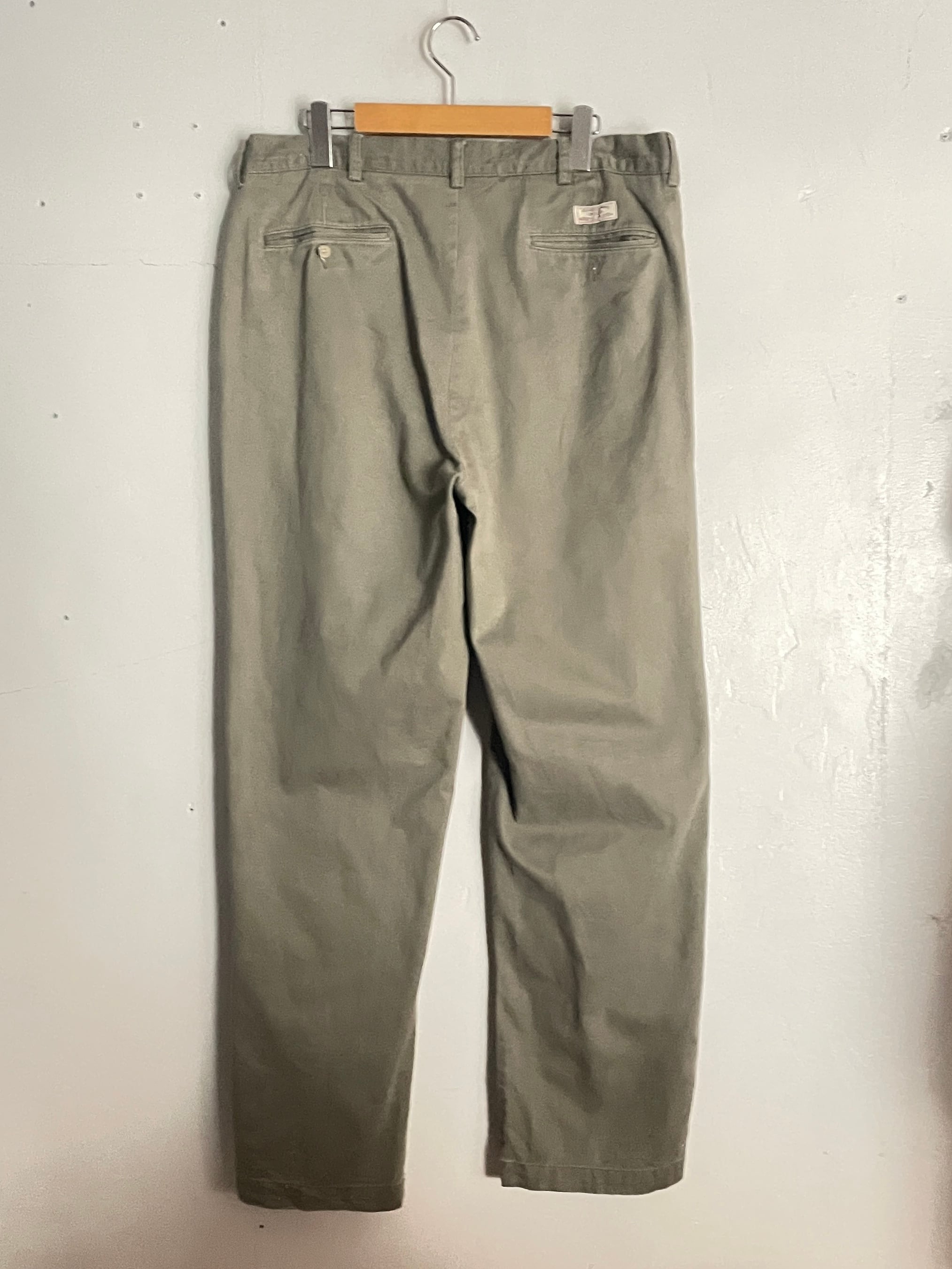 ラルフローレンの代名詞とも言える2タック仕様のチノトラウザーズです。最大の特徴は、腰回りにゆとりを持たせたクラシックなシルエット。深く入ったタックが、無骨なワークウェアとは一線を画す上品なドレープを生み出します。長年使い込まれたようなフェード感のあるベージュカラーは、現行品にはない雰囲気を放っています。太めのワタリから裾にかけて緩やかにテーパードが効いており、足元を選ばずに重宝する一本です。