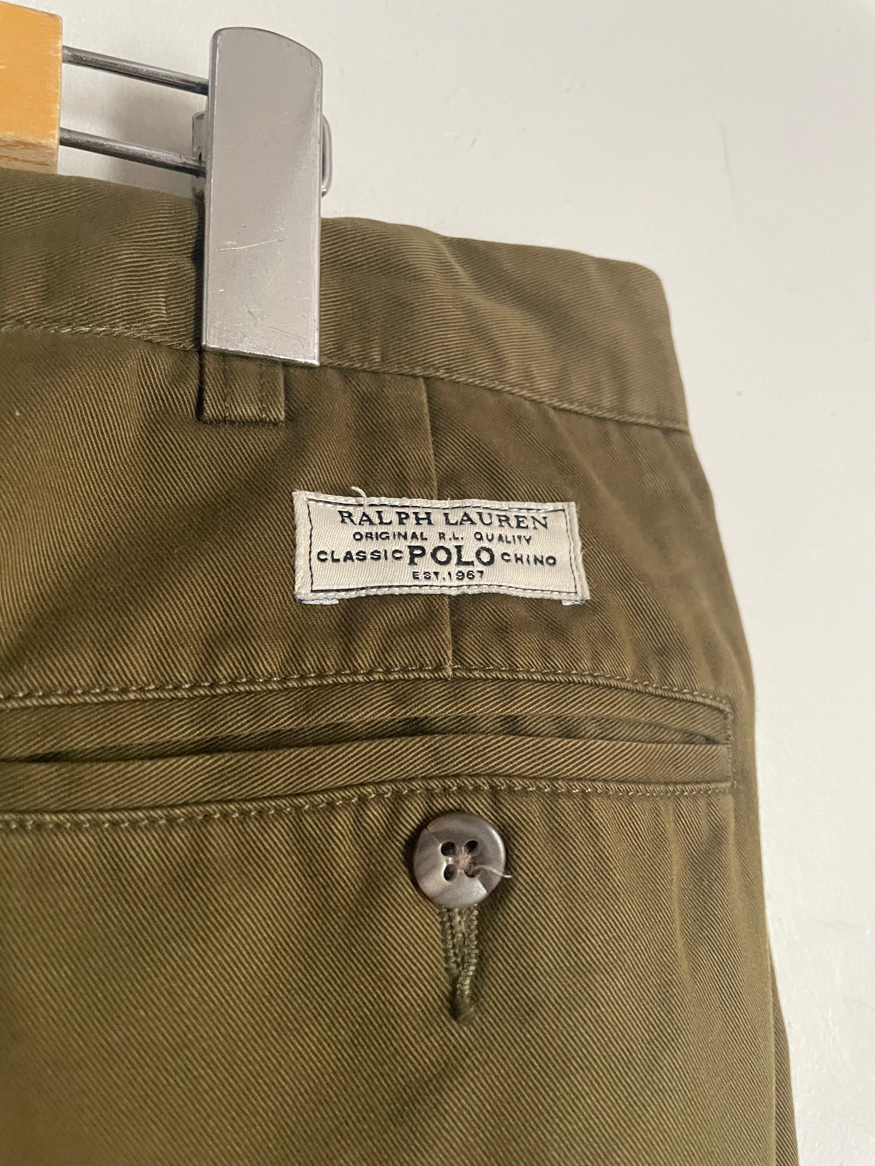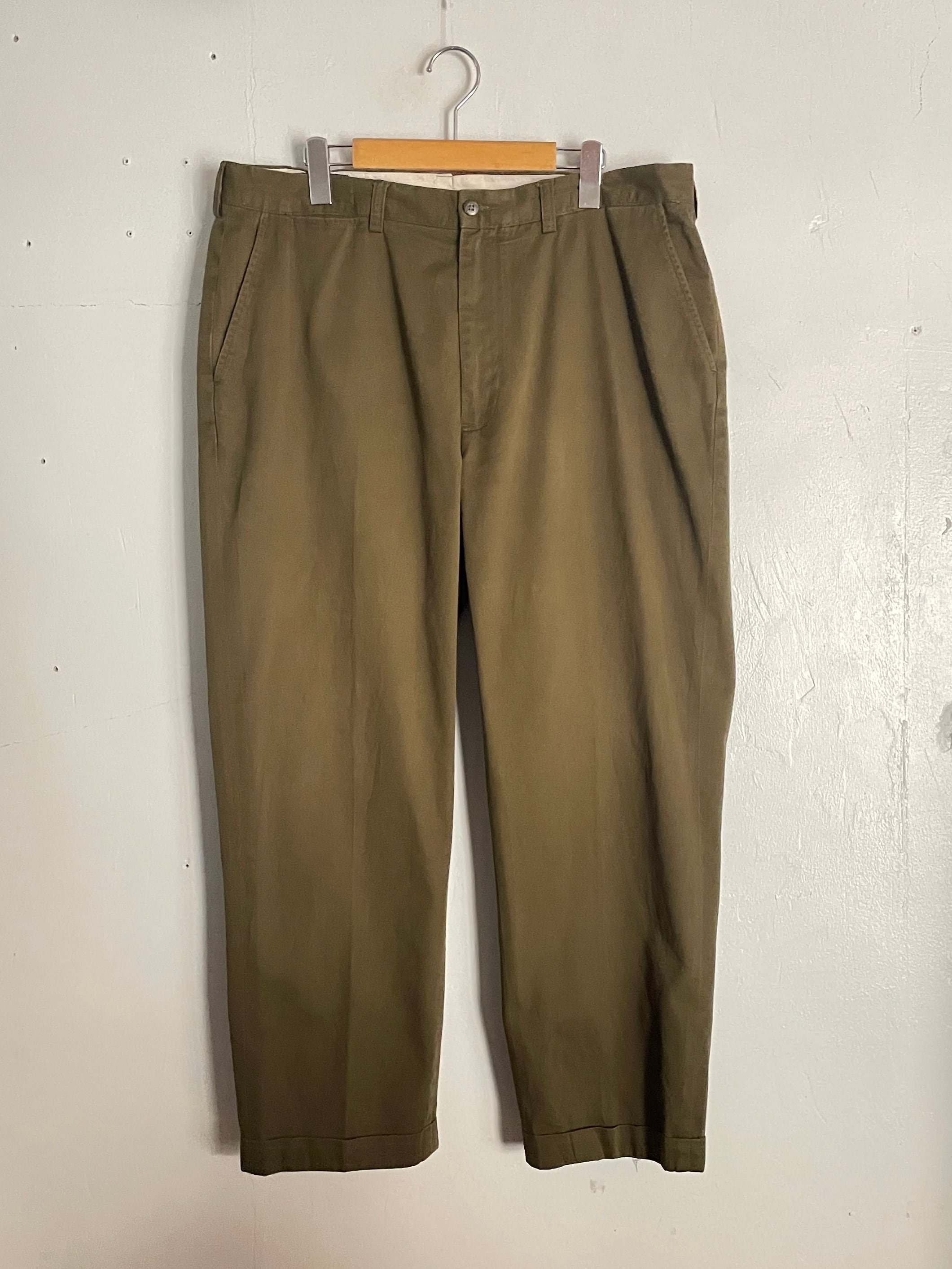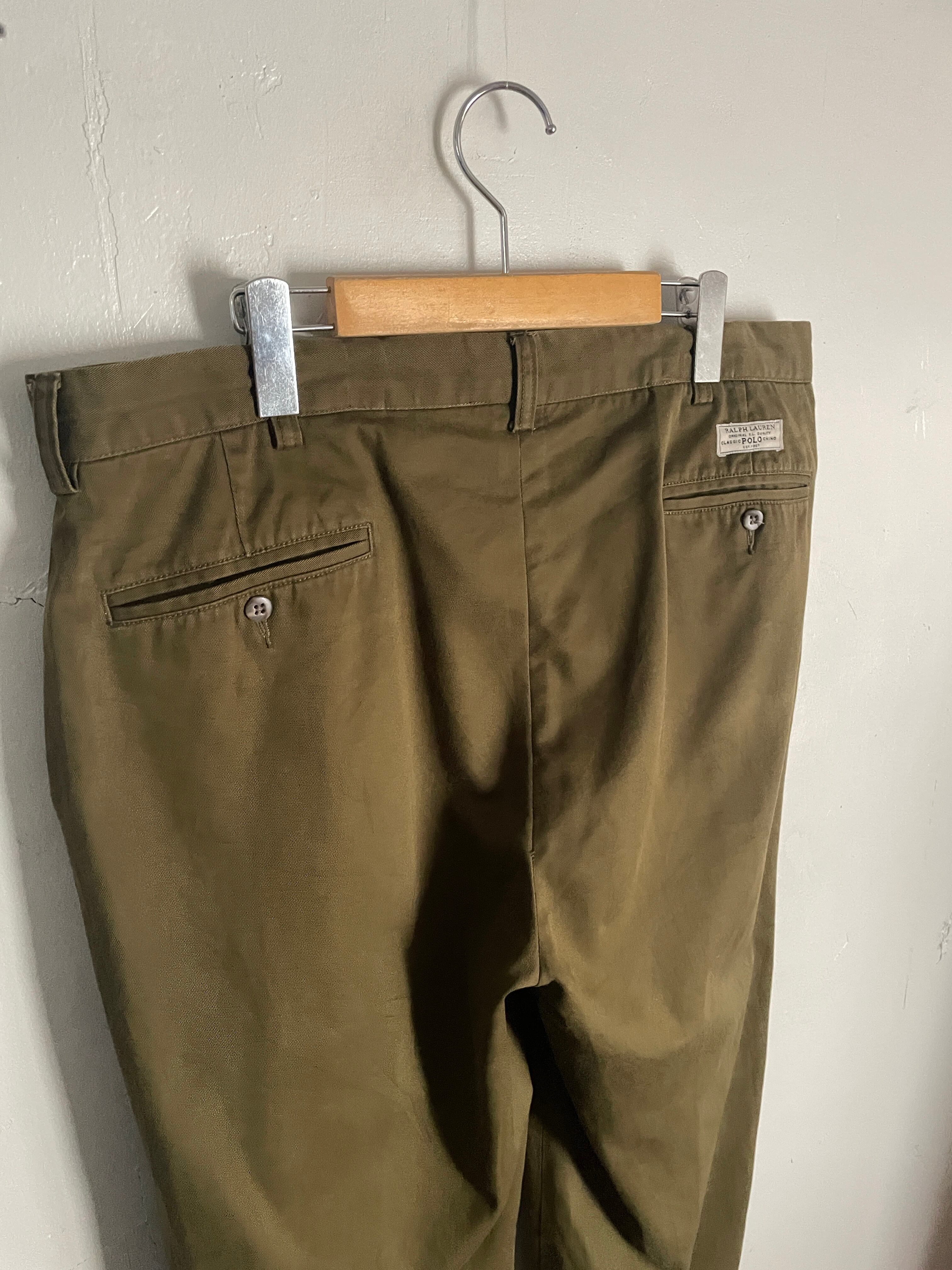 ラルフローレンのミリタリーライクなオリーブカラーのチノパンです。無骨な印象の強い厚手コットン生地は、長い年月を経て柔らかく、深みのあるアタリが随所に見られる最高のコンディション。一般的なチノよりもさらに太く作られた無骨なワイドストレートシルエットと腰回りのタックがなく、ストンと真っ直ぐに落ちるラインが特徴的な一本です。