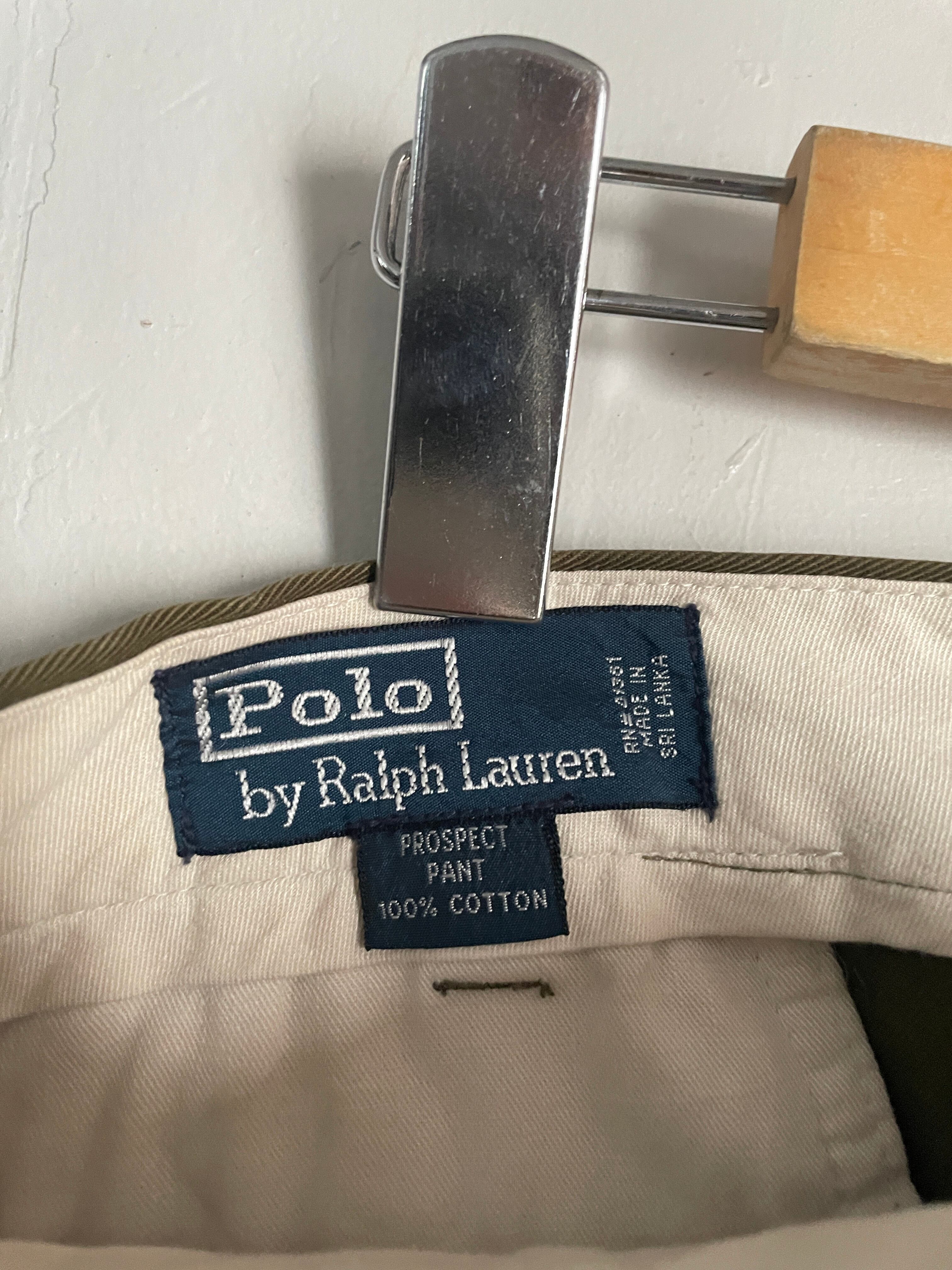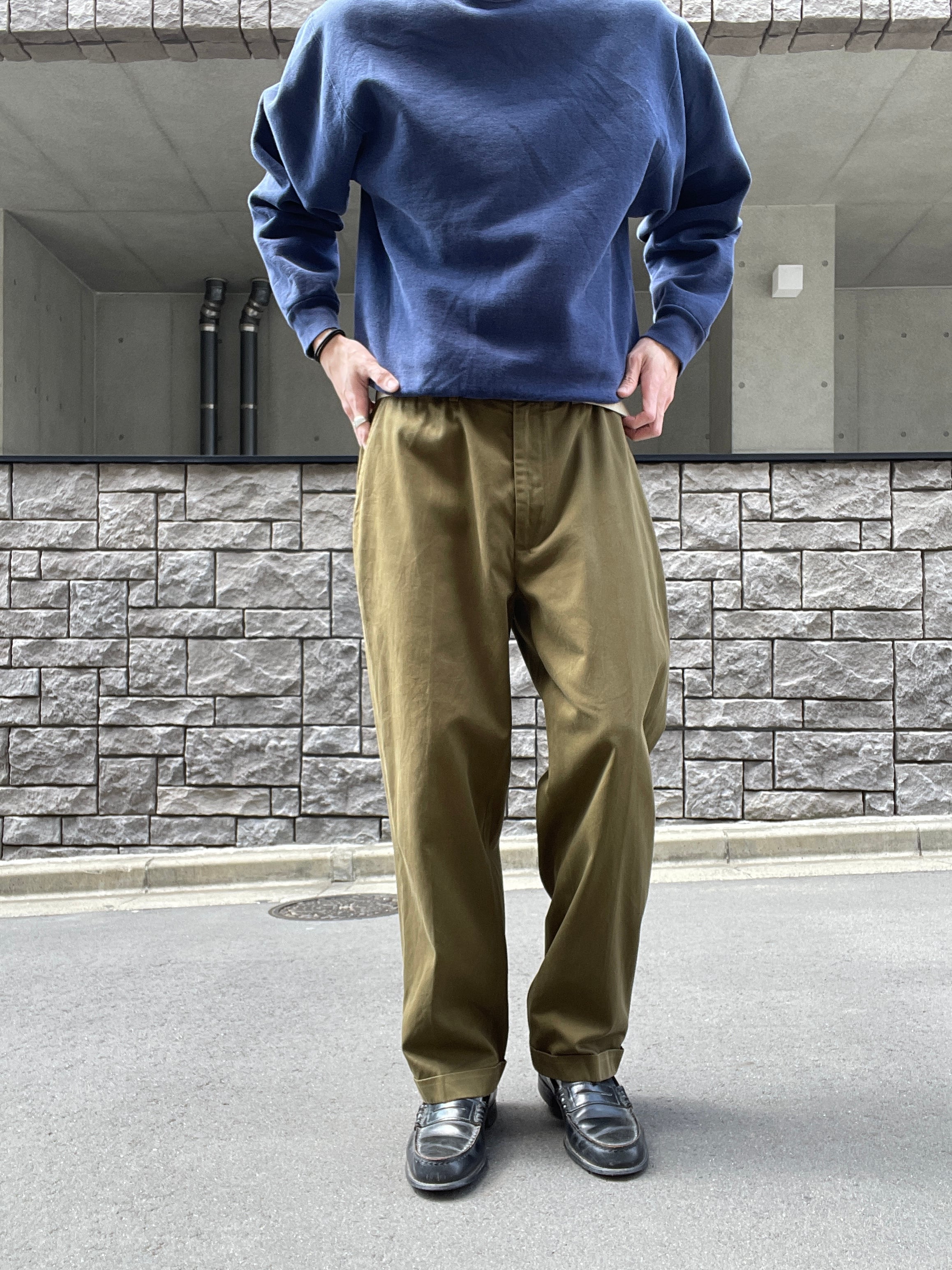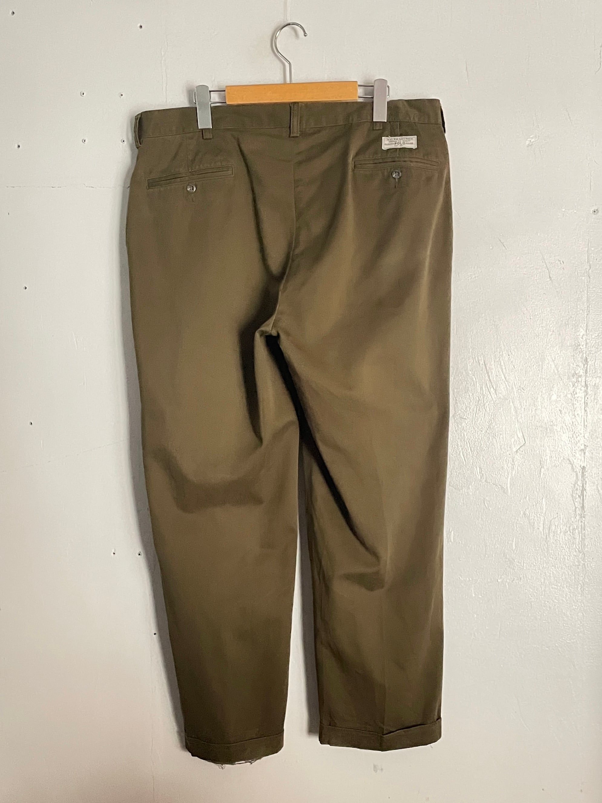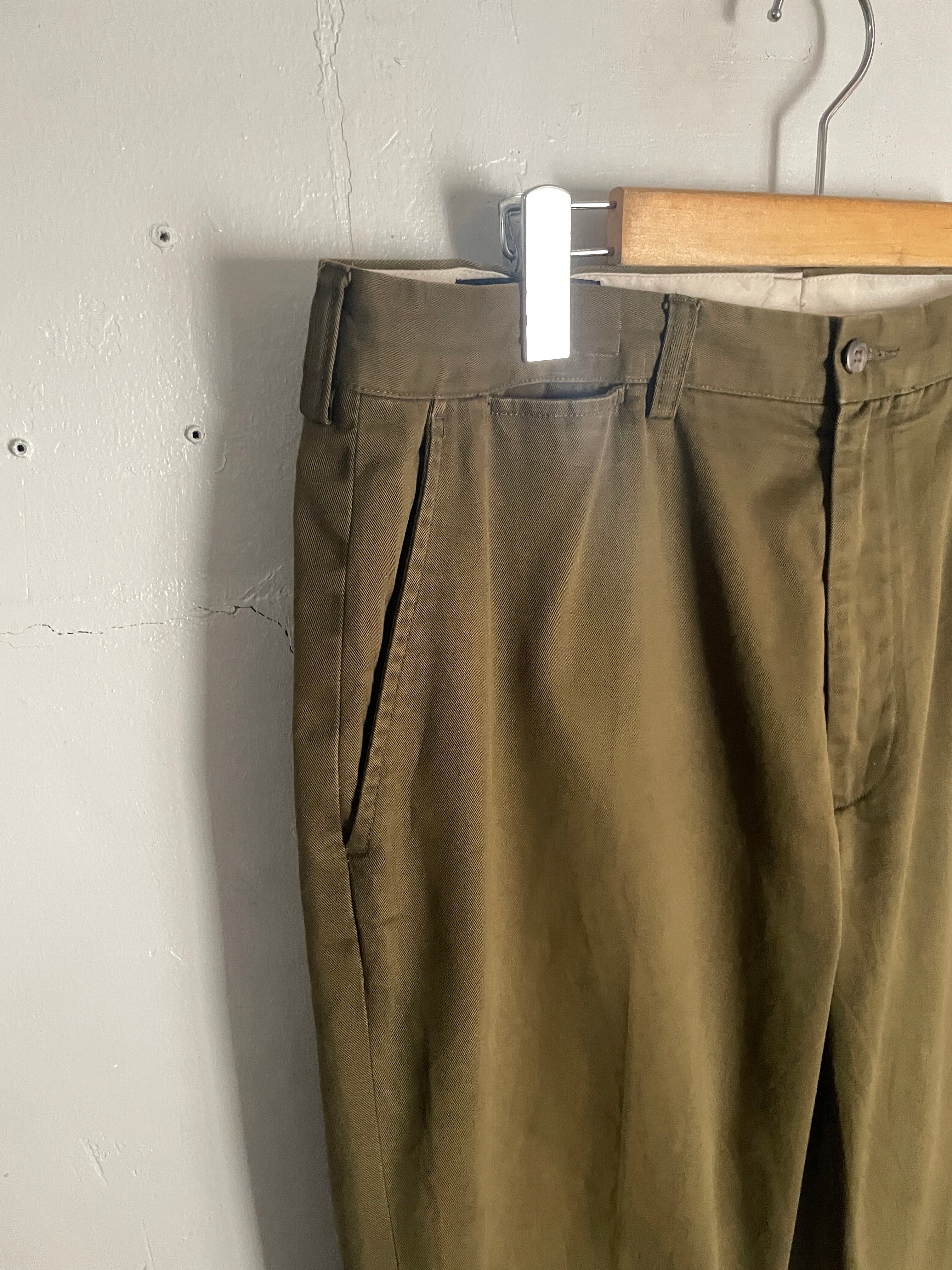 ラルフローレンのミリタリーライクなオリーブカラーのチノパンです。無骨な印象の強い厚手コットン生地は、長い年月を経て柔らかく、深みのあるアタリが随所に見られる最高のコンディション。一般的なチノよりもさらに太く作られた無骨なワイドストレートシルエットと腰回りのタックがなく、ストンと真っ直ぐに落ちるラインが特徴的な一本です。