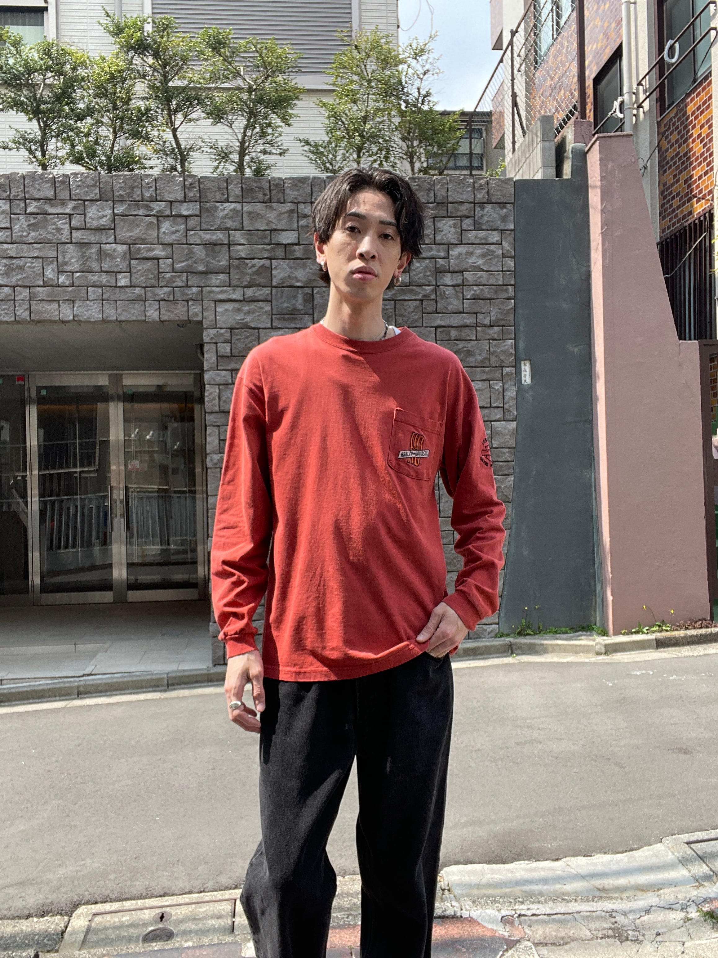 淡いオレンジボディで、ポケット上にブランドロゴ刺繍が施された、ハーレーダビッドソンのロンT。ハーレーは派手さのあるものが多い中、こちらは主張が激し過ぎないシンプルめなデザイン。袖にもワンポイントで刺繍が入っていたりとさりげないのがグッドです。ゆったりとしたサイズ感で、今の時期には一枚でラフに着られそうです。