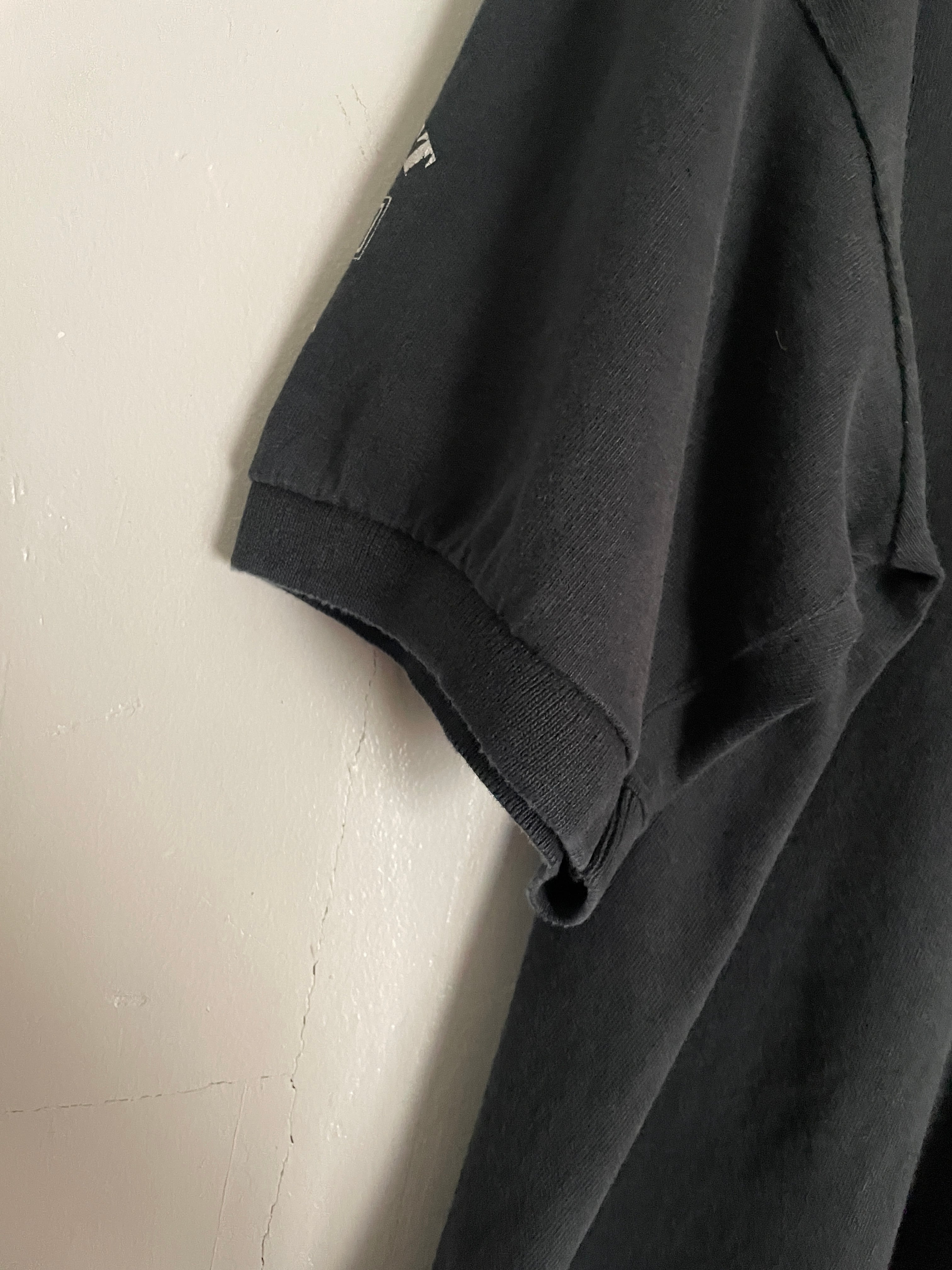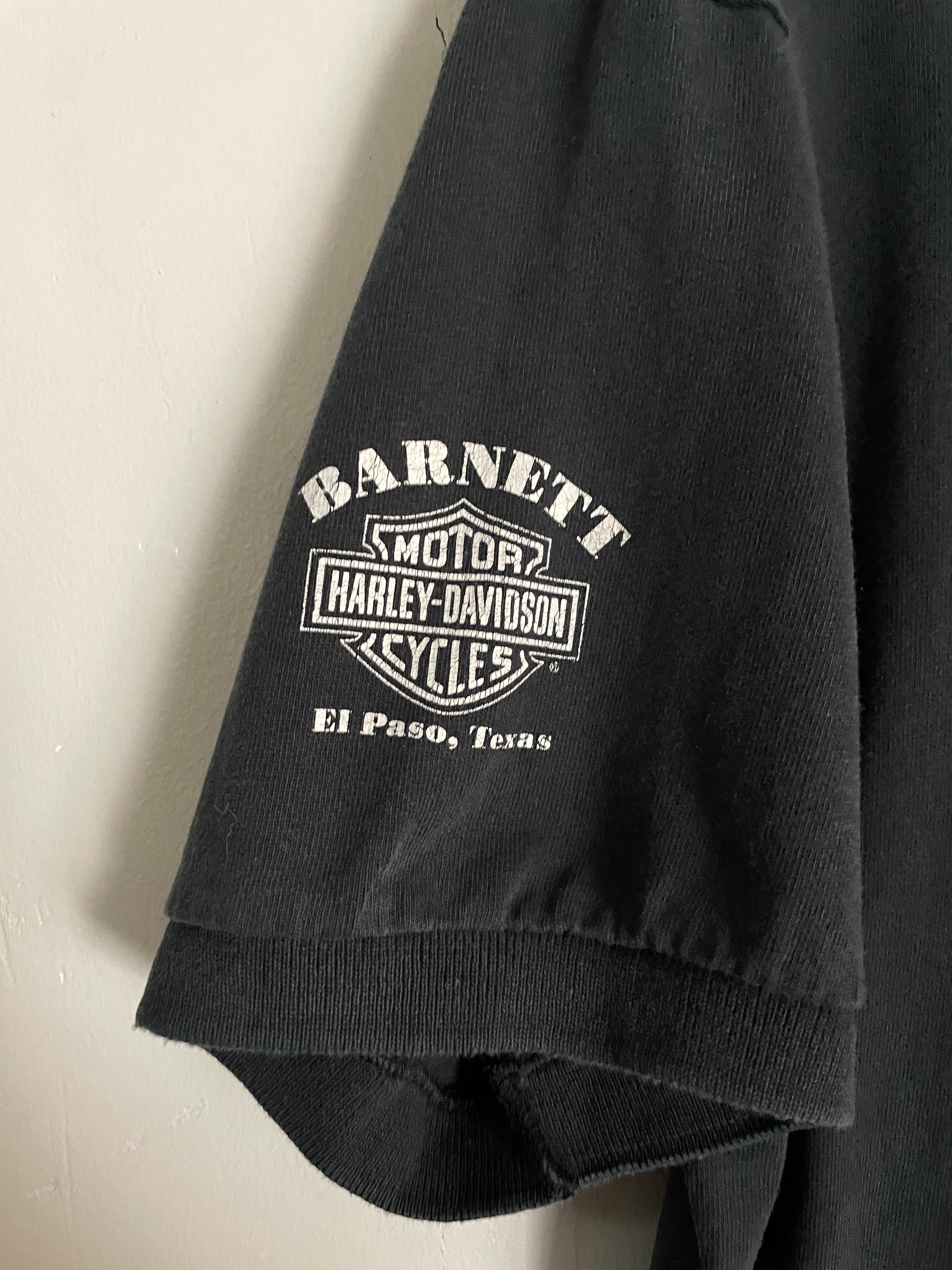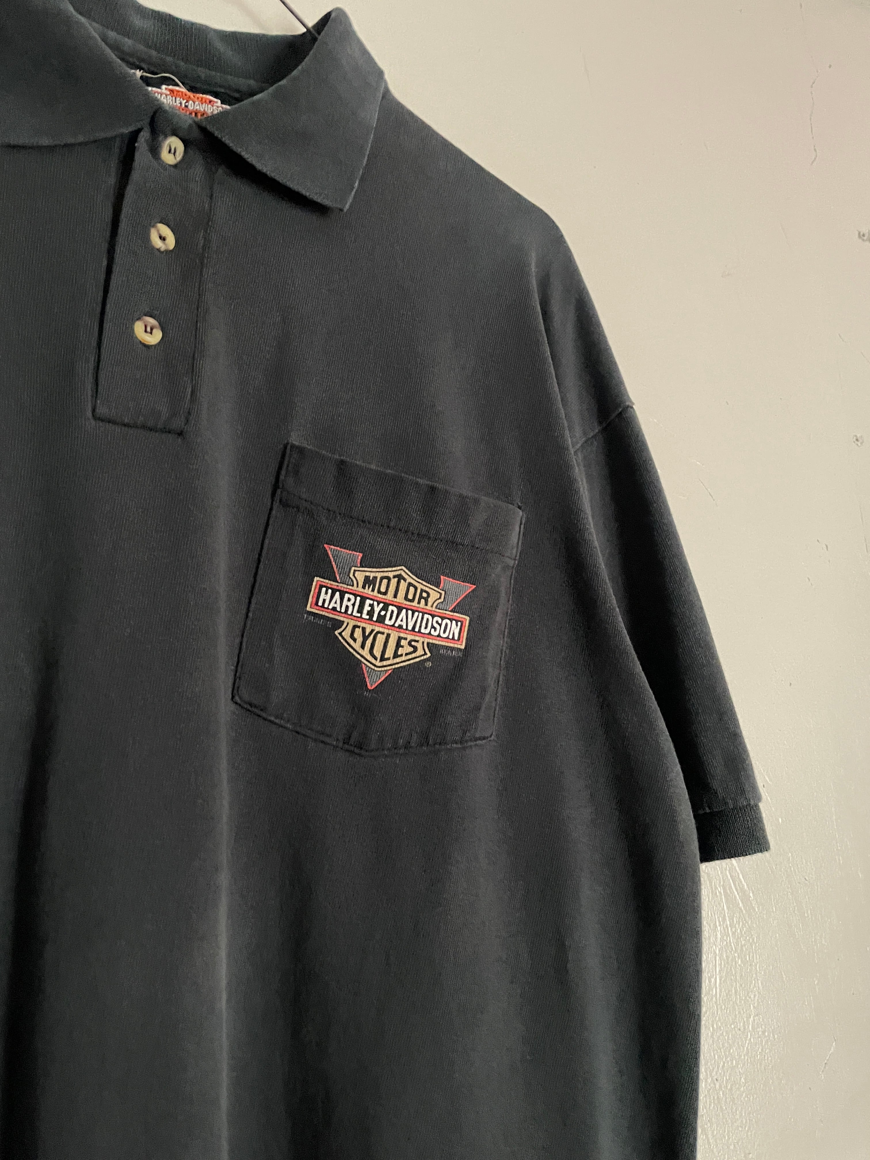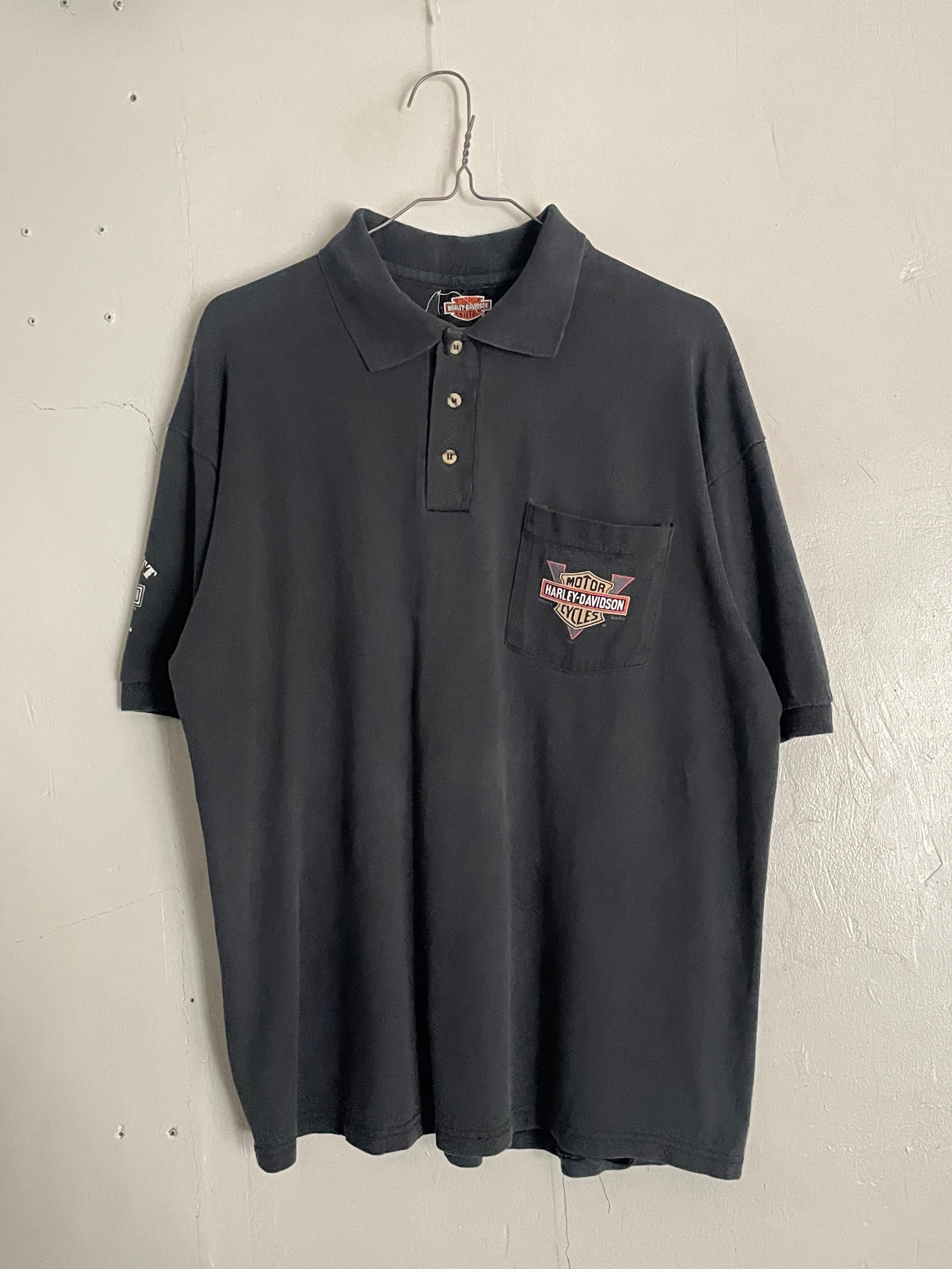 やや褪せたネイビーボディで、ポケット上にワンポイントでブランドロゴプリントが施された、ハーレーダビッドソンのポロシャツ。主張の激し過ぎないデザインなので、使い勝手の良いポロシャツです。右袖にもさりげなくプリントが施されています。ゆったりとしたサイズ感なので、一枚でラフに着られそうです。USA製なのもポイントが高いです。