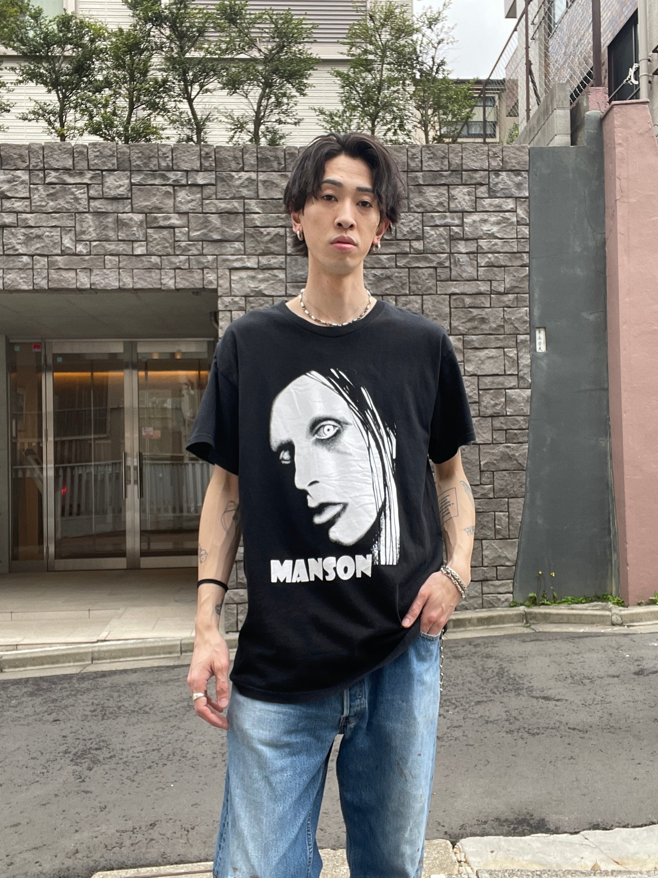 ブラックボディに、アメリカのロックバンド”マリリン・マンソン”がプリントされたTシャツ。ホワイトプリントで、こちらを見ているマリリン・マンソンがリアルにプリントされています。ダークな雰囲気のあるクールなデザインになっています。ゆったりとしたサイズ感で、夏には一枚で決まってくれる一着です。