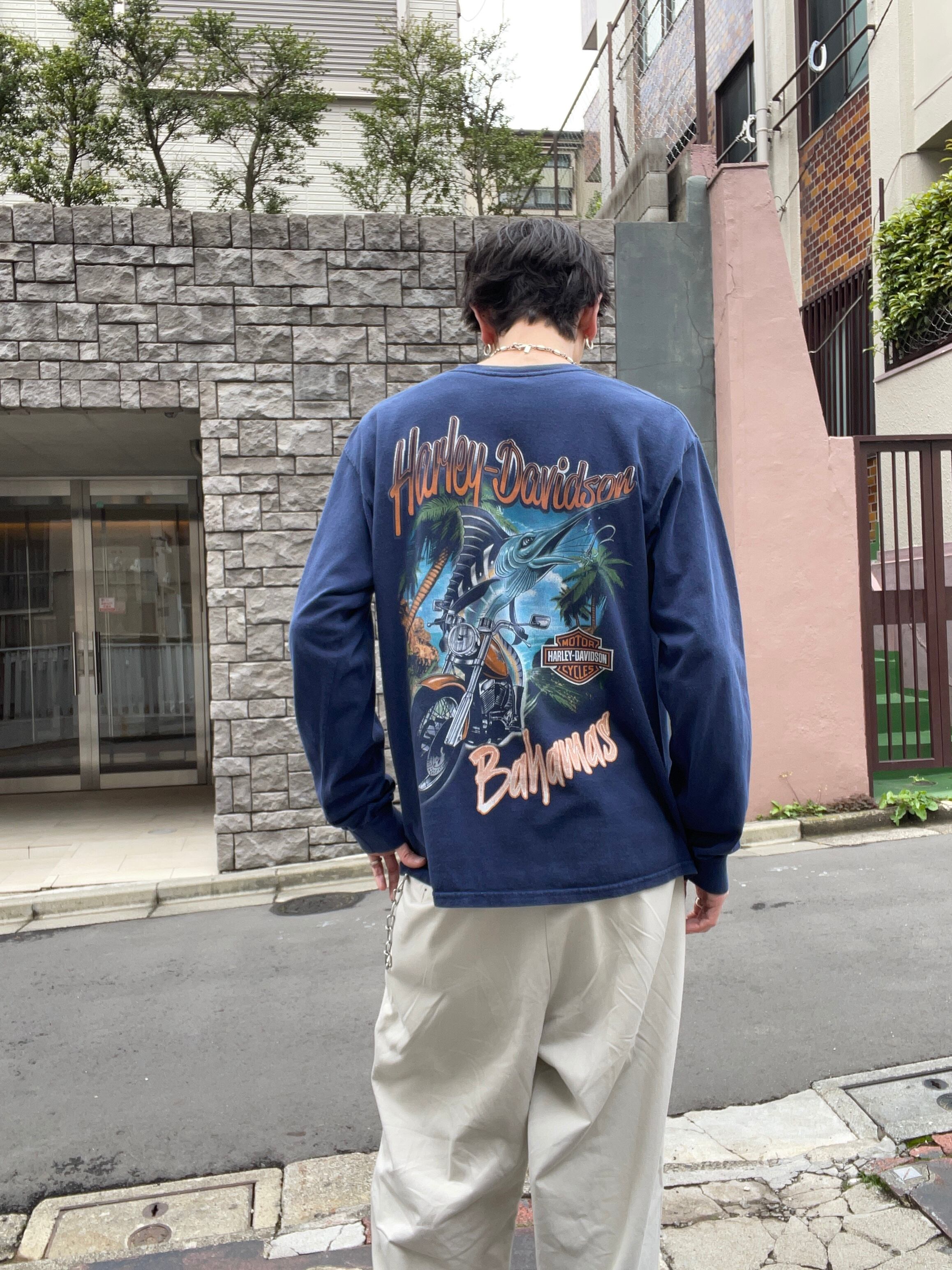 ネイビーボディに、両面プリントが施されたハーレーダビッドソンのロンT。フロント部分にはポケット付きで、控えめなハーレーロゴ。バックにはバイクに乗ったイカしたカジキがダイナミックでインパクト大のプリント。バハマのネームプリント入り。ゆったりとしたサイズ感で、今の時期には一枚でラフに着られそうです。