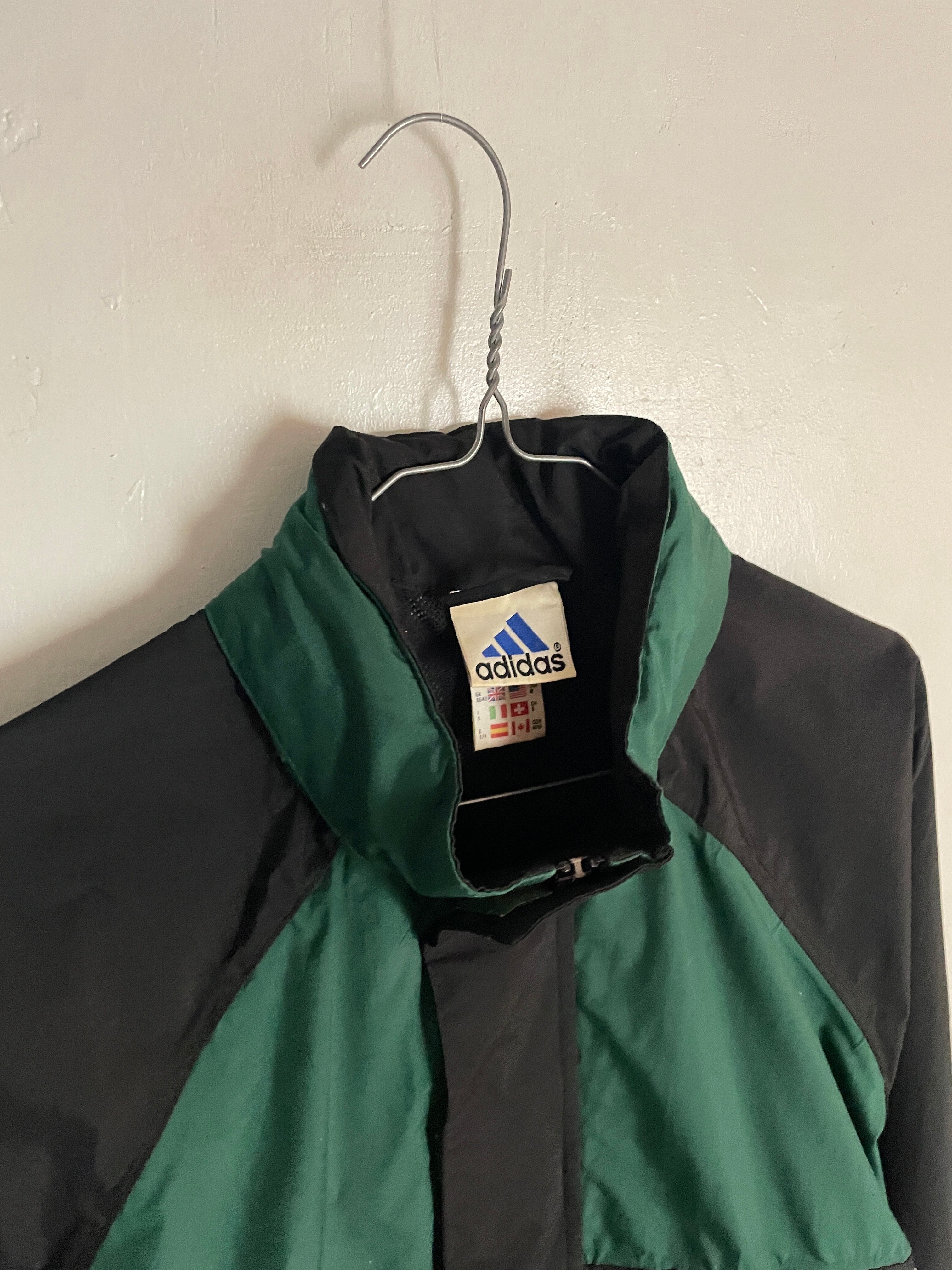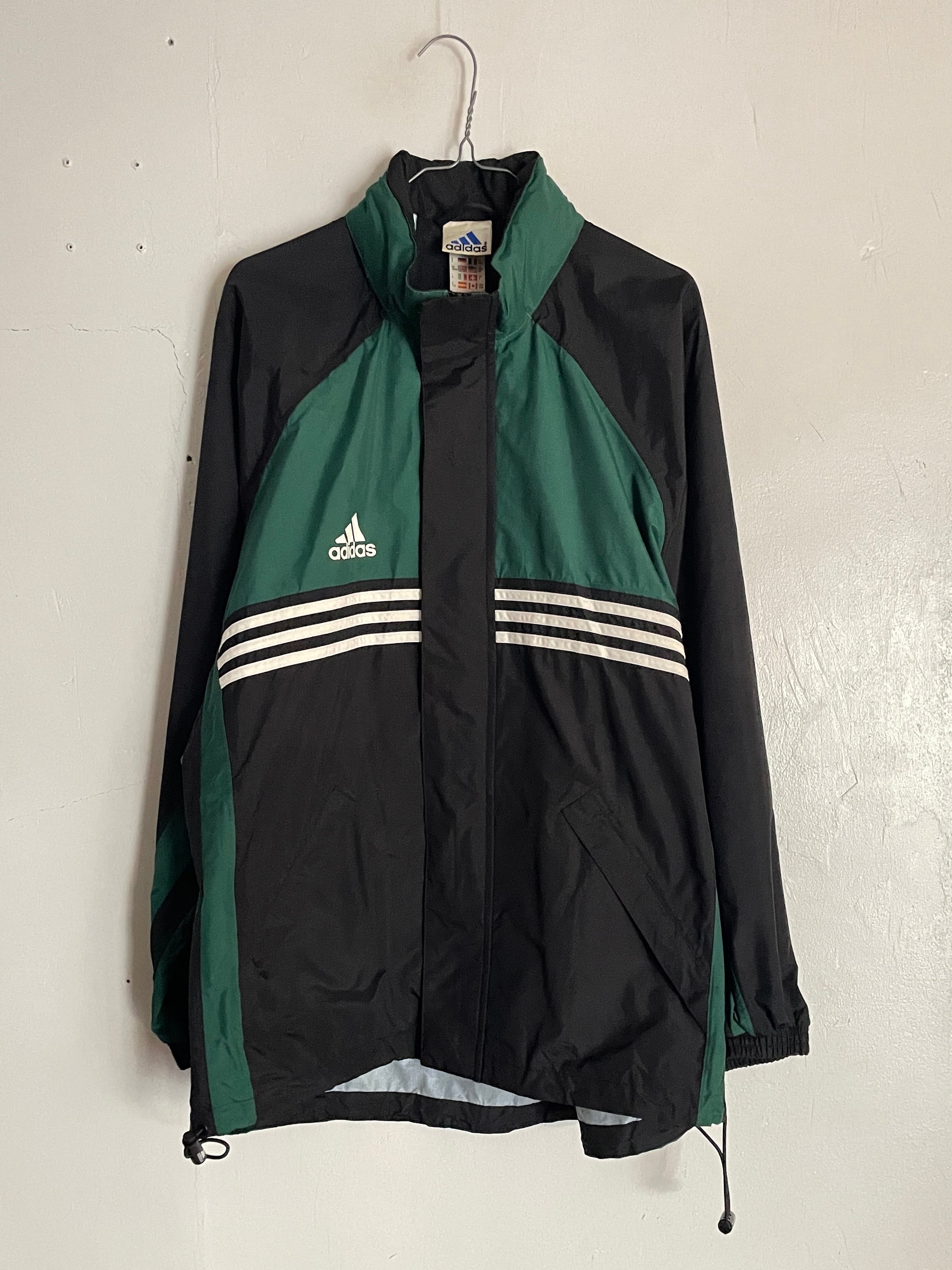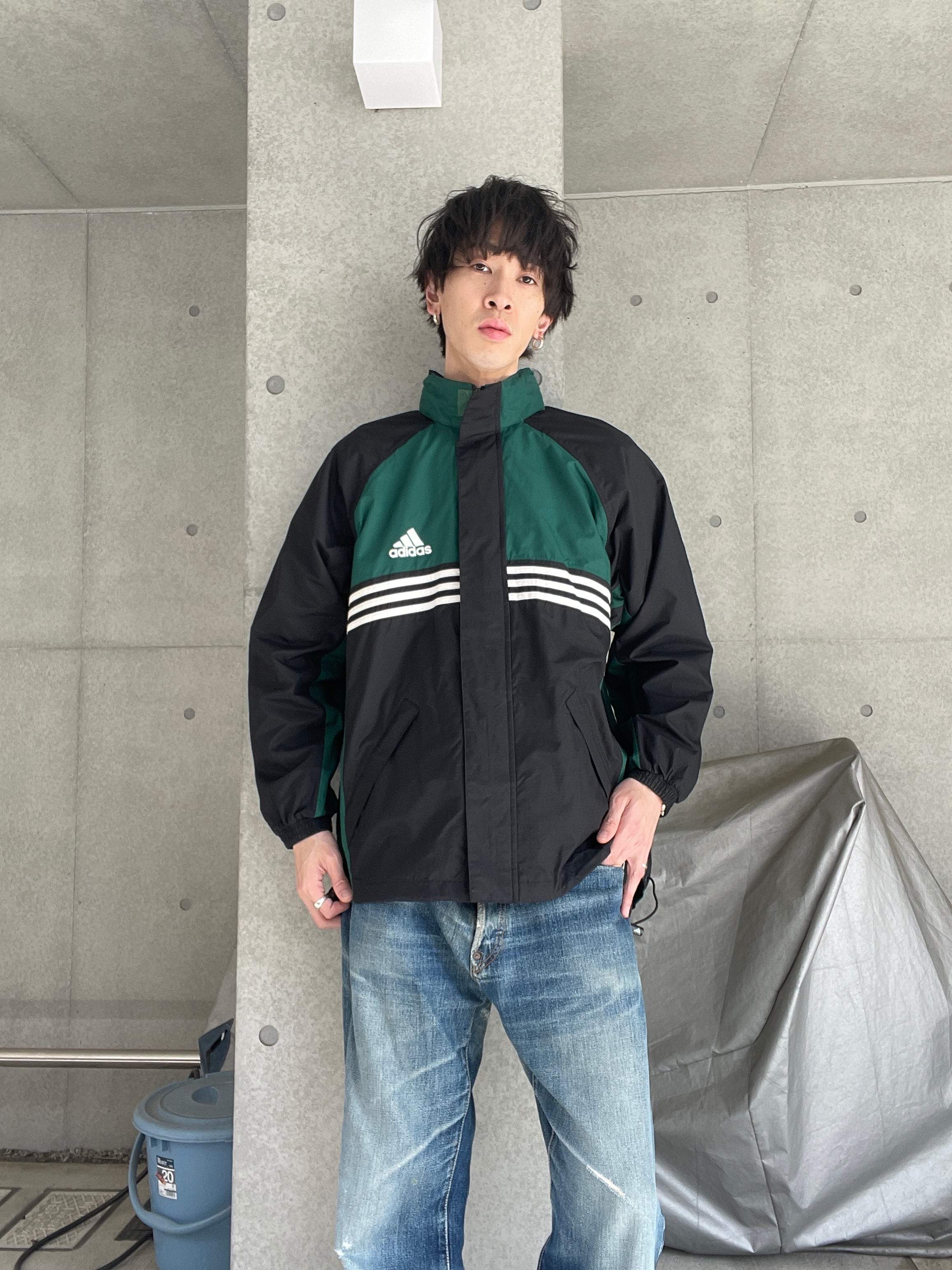 90年代アディダスのナイロンジャケットです。合わせやすいけどエッジが効いてるグリーン×ブラックの好配色で、定番の袖にラインではなくフロントにラインがあるデザインでcool。裾にはドローコードが付いているので絞って着るのも◎フードも収納されていて機能性も良しです。