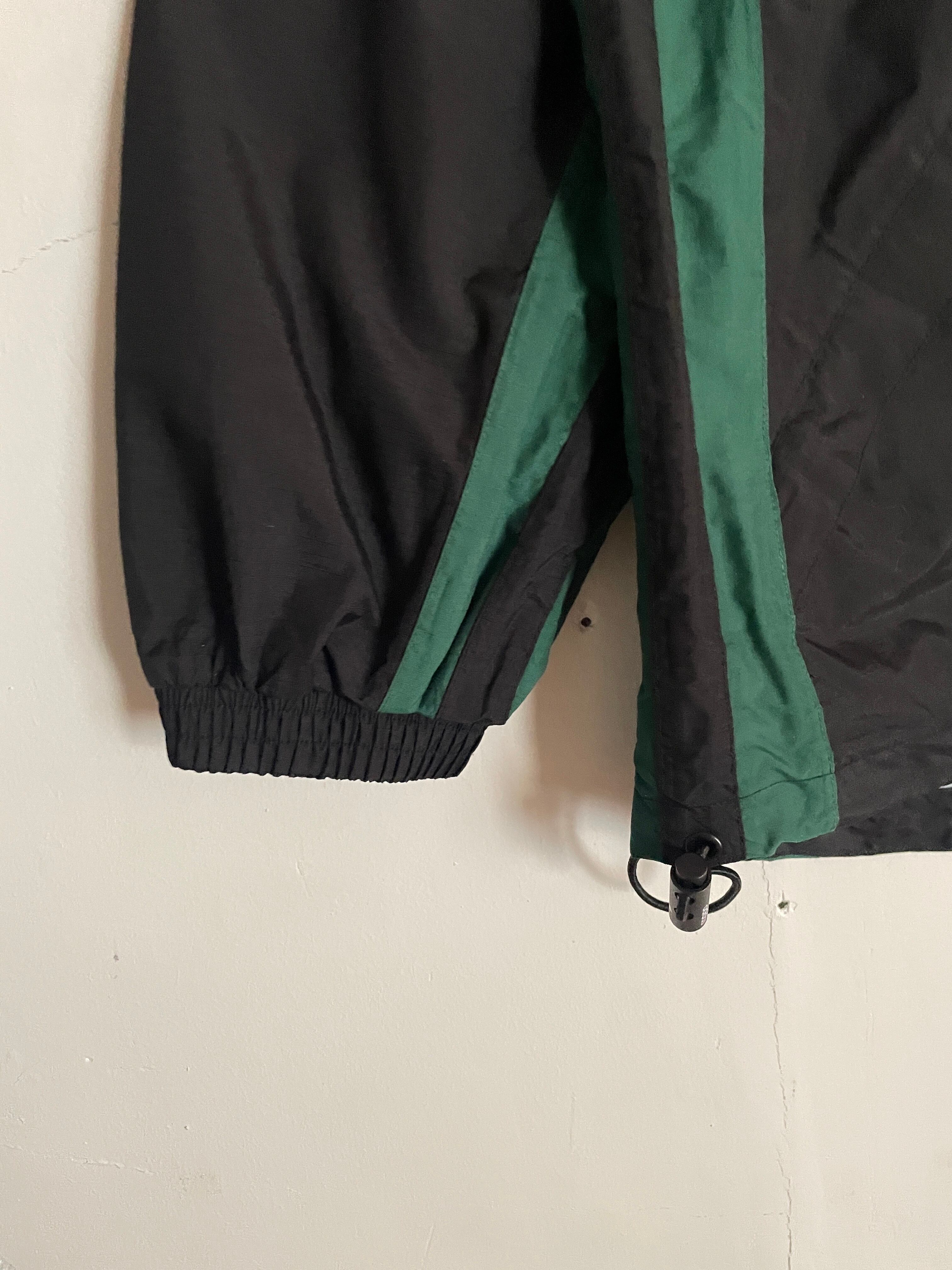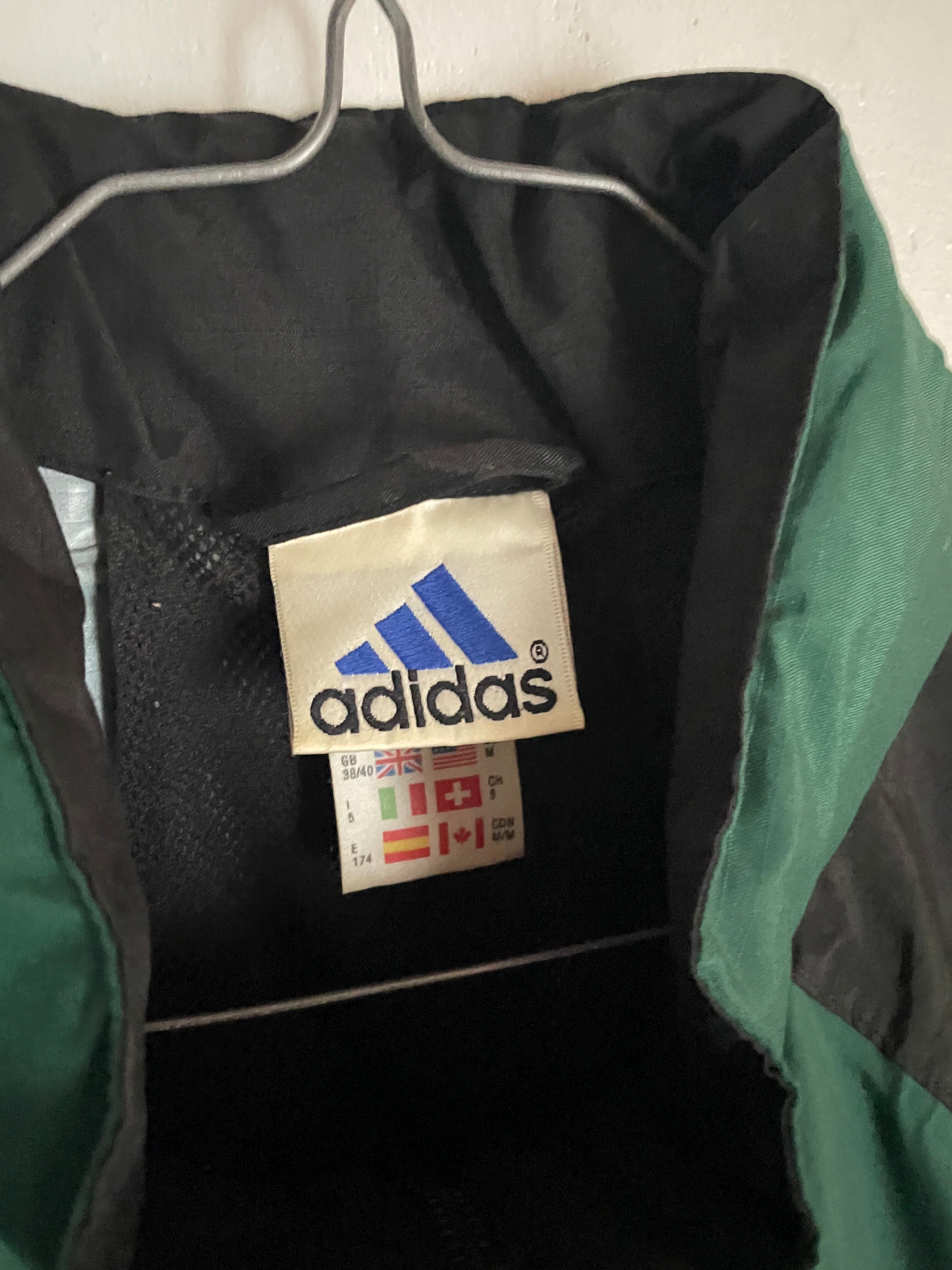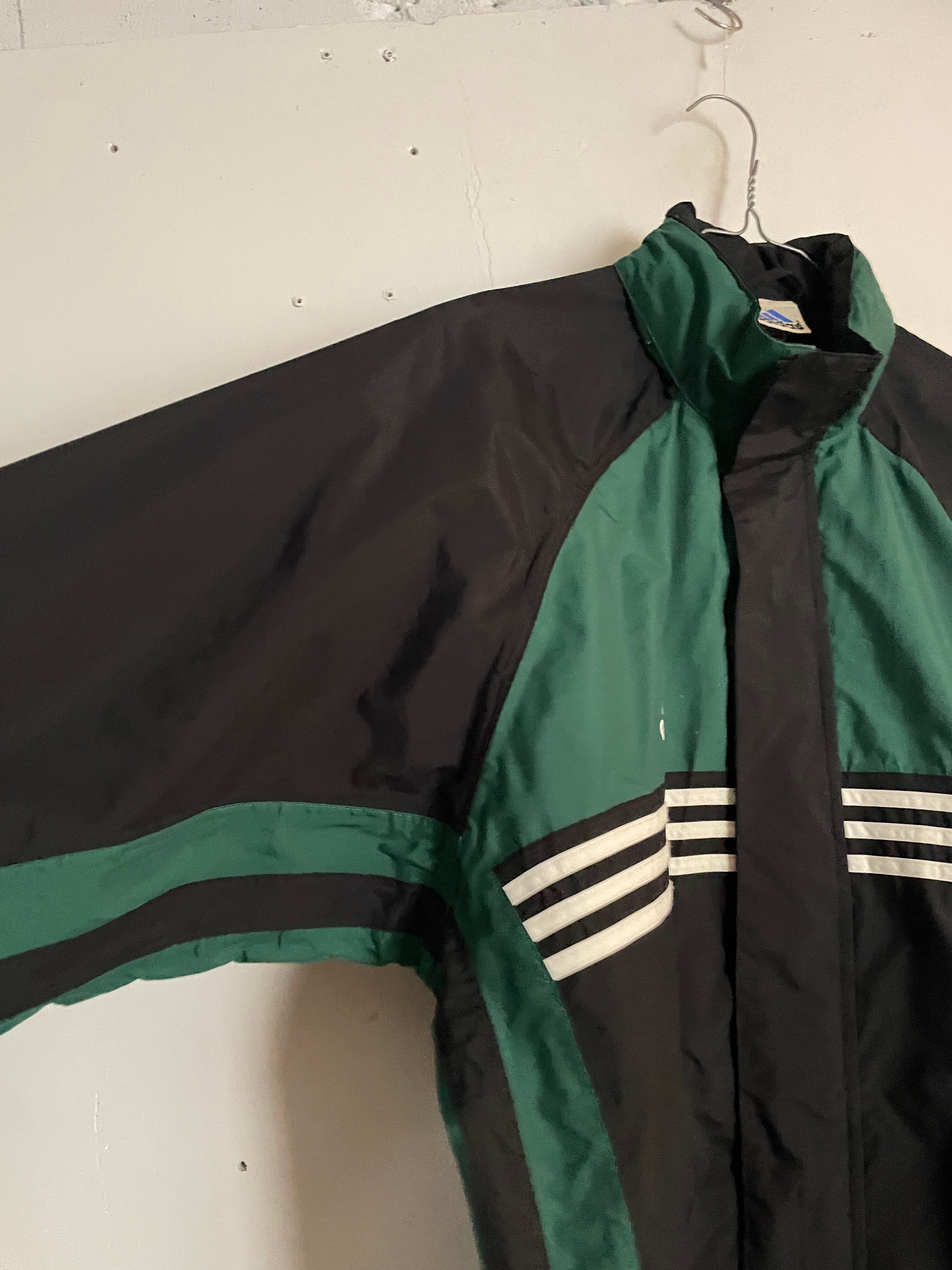 90年代アディダスのナイロンジャケットです。合わせやすいけどエッジが効いてるグリーン×ブラックの好配色で、定番の袖にラインではなくフロントにラインがあるデザインでcool。裾にはドローコードが付いているので絞って着るのも◎フードも収納されていて機能性も良しです。