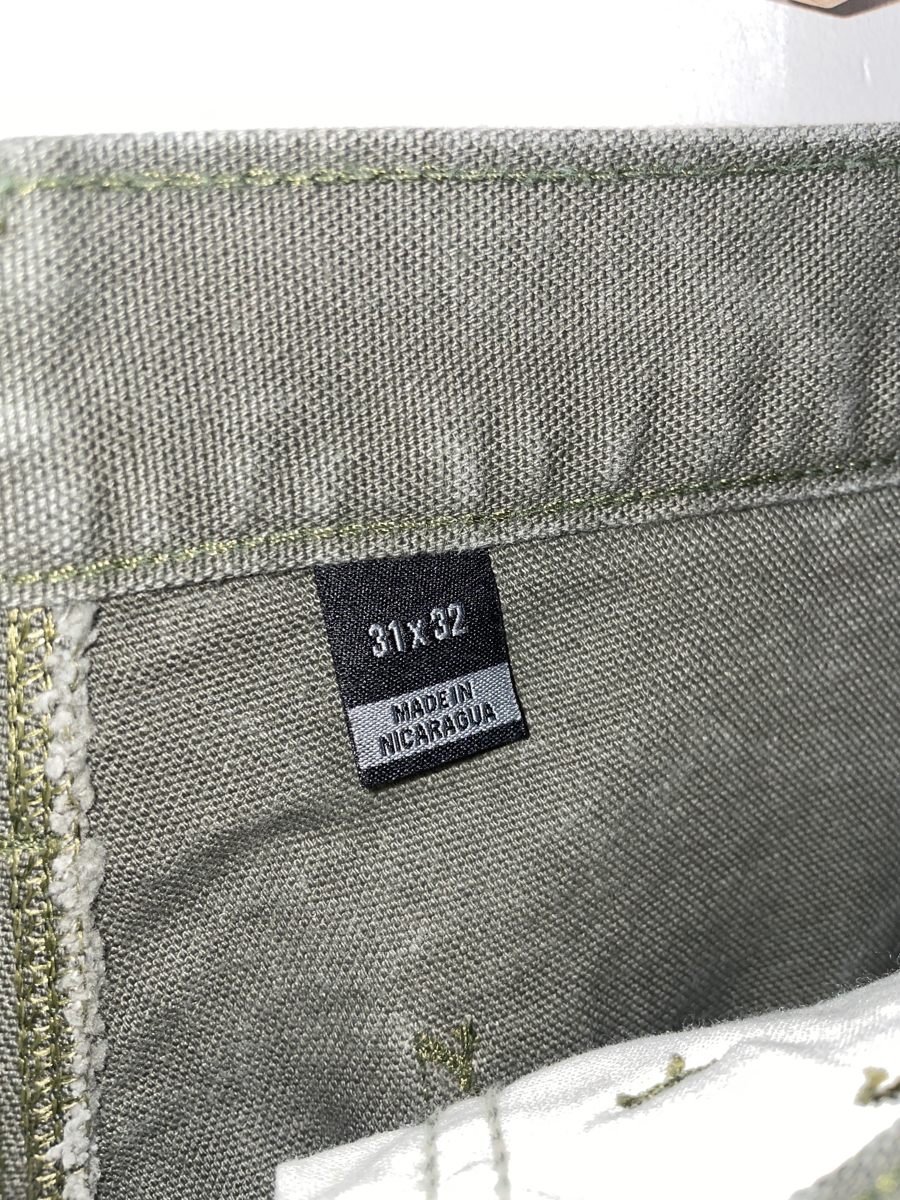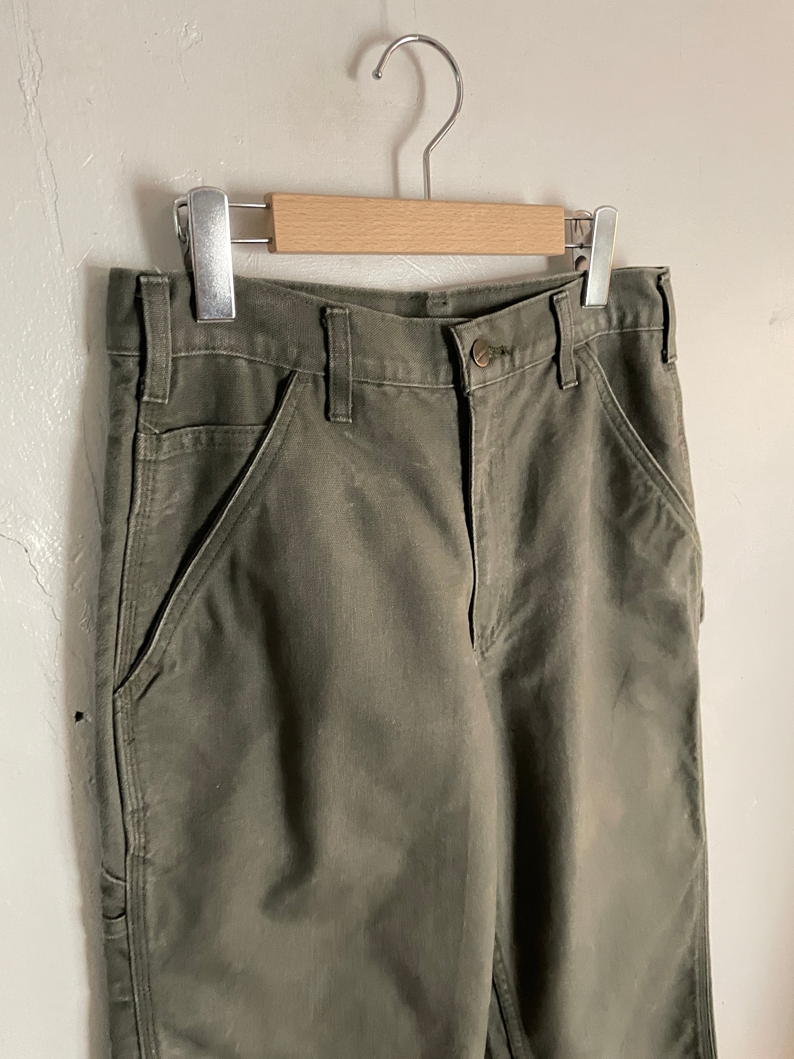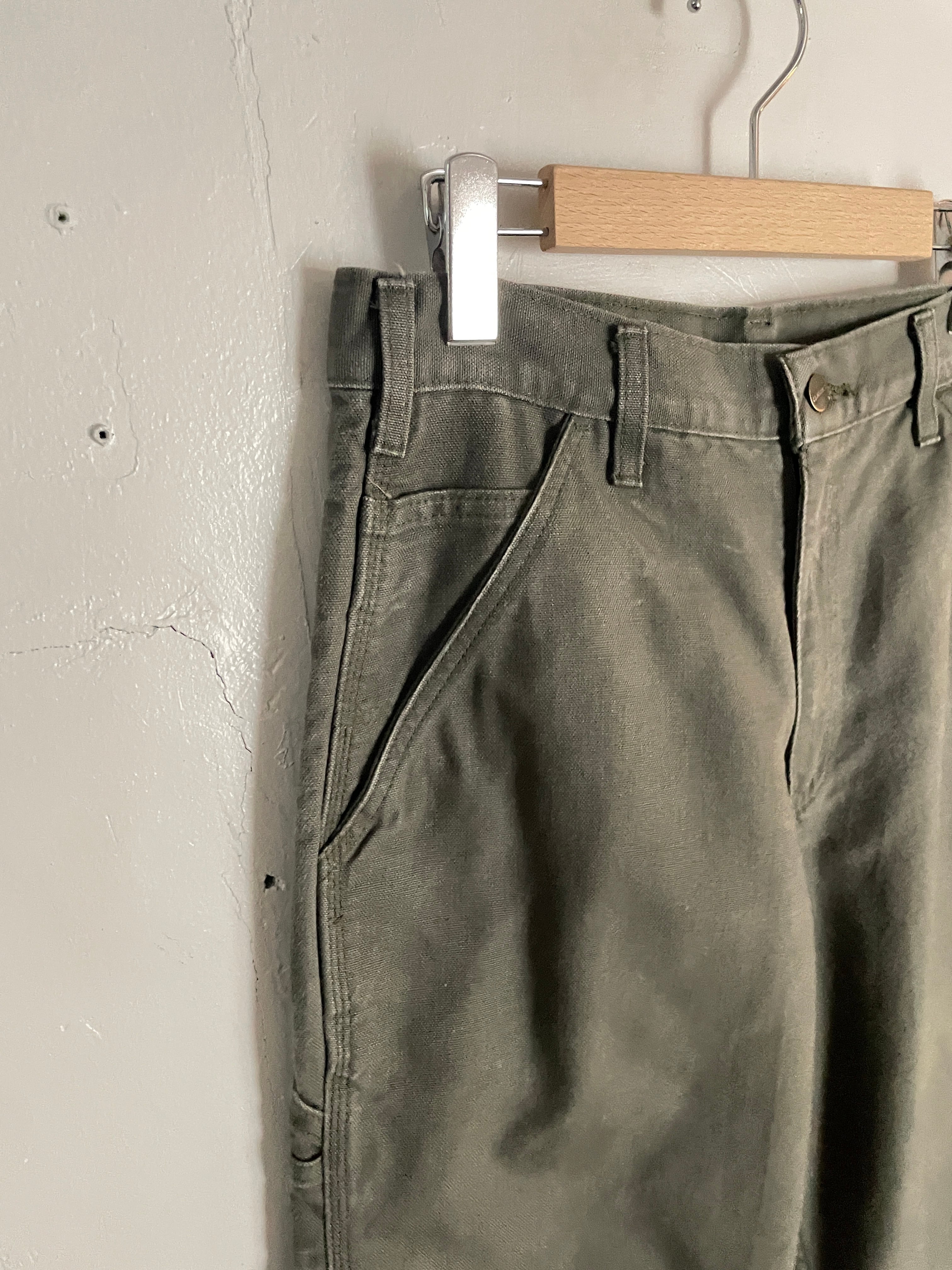 程よくフェードしたオリーブカラーが魅力のCarharttワークパンツ。無骨なワークブランドらしいしっかりとしたコットン生地に加え、フロントのスラッシュポケットや実用性の高いディテールが特徴です。シルエットはややテーパードが効いており、野暮ったくなりすぎず現代のスタイリングにも自然に馴染みます。カジュアルからストリートまで幅広く使える一本です。