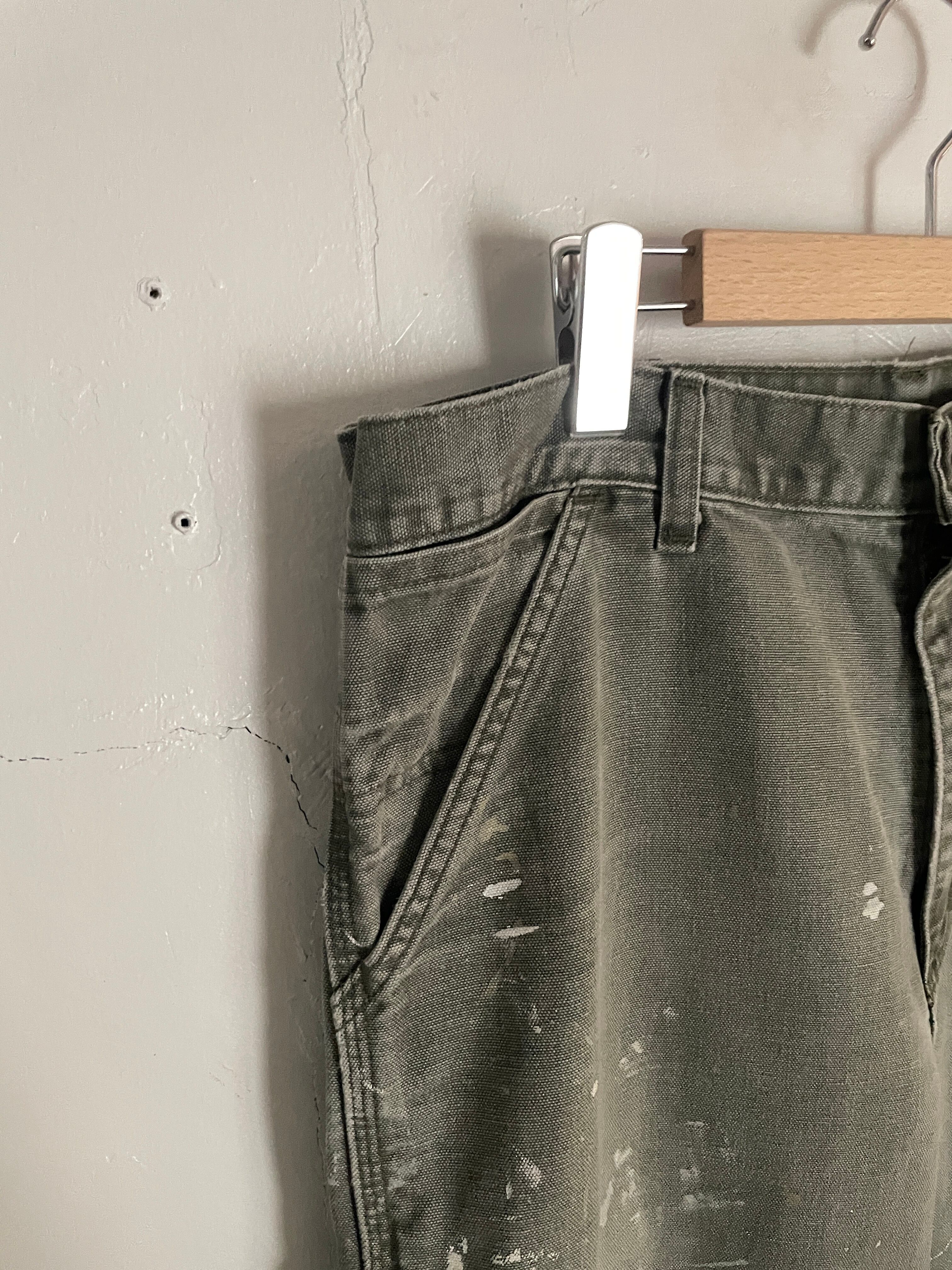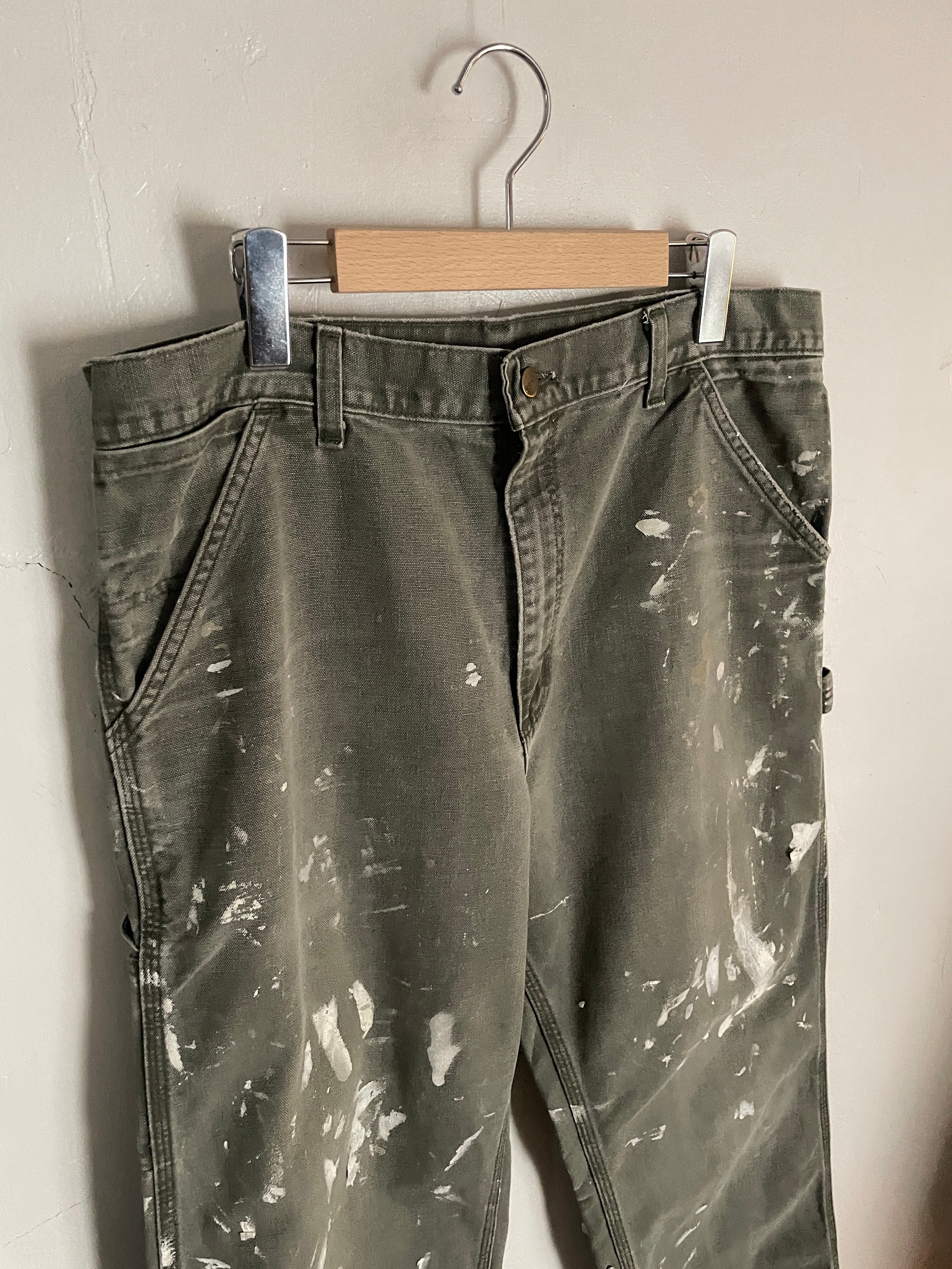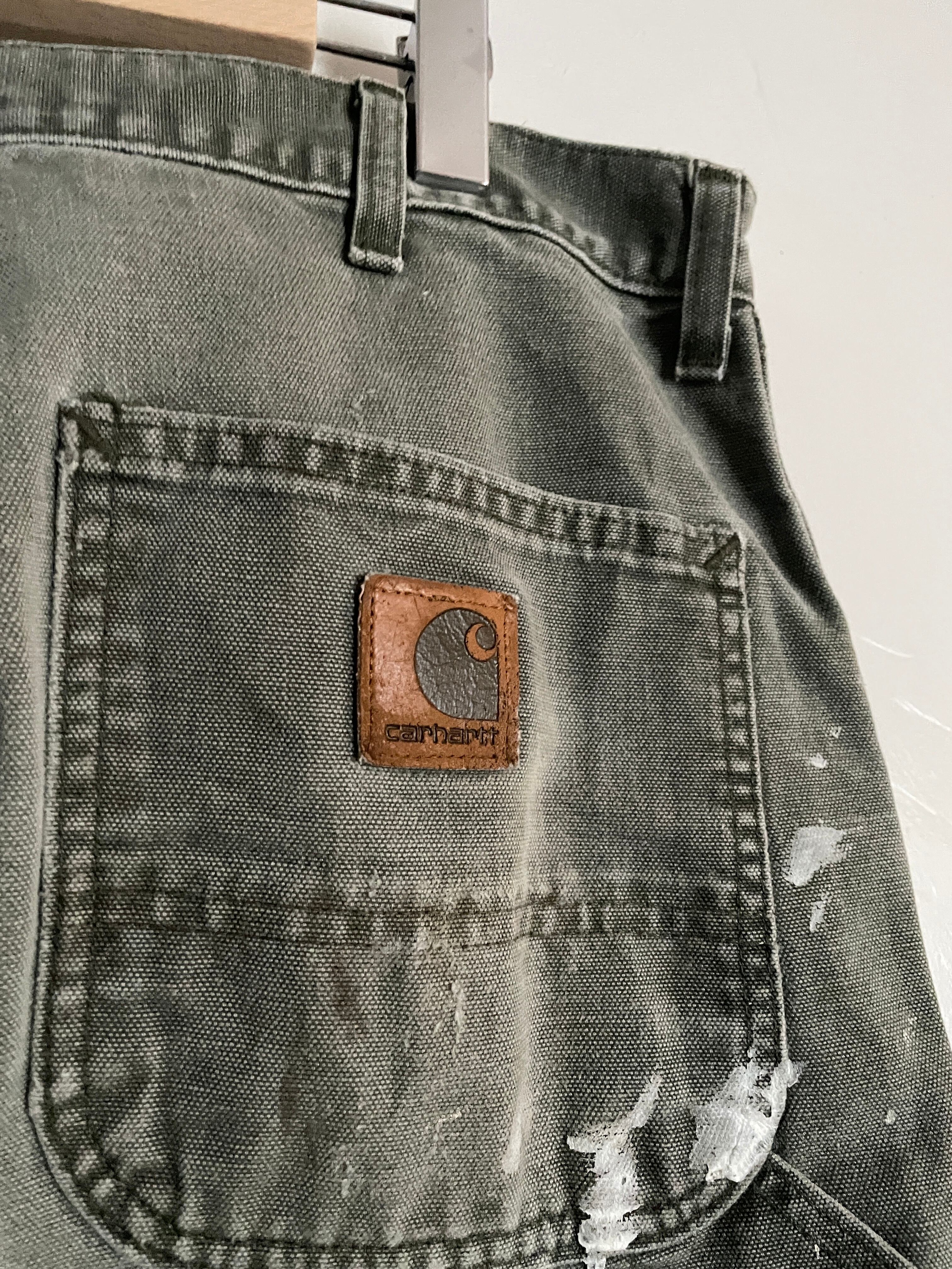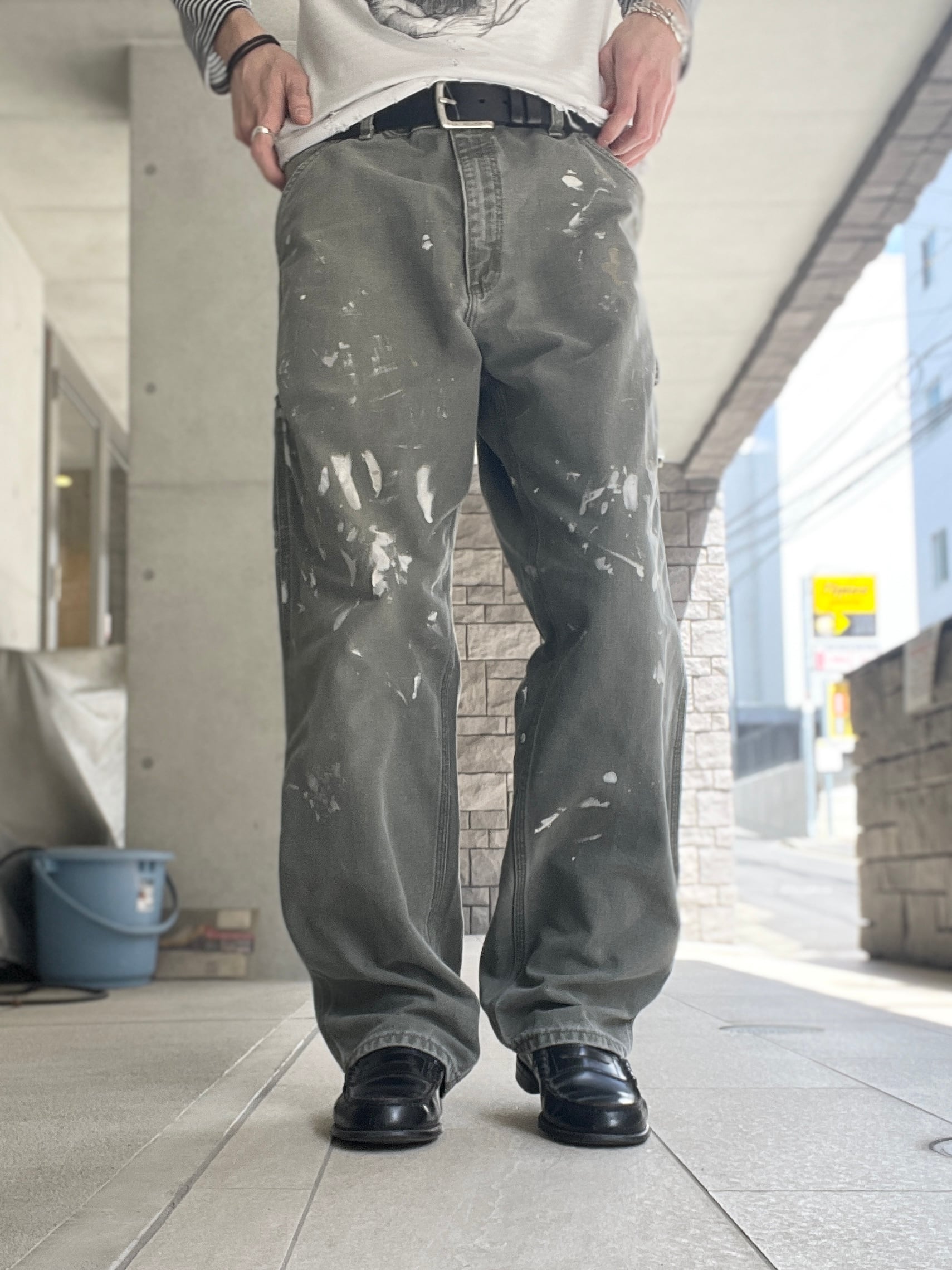 無骨なCarharttボディにリアルなペンキ飛びが重なった、唯一無二の存在感を放つワークパンツ。オリーブカラーをベースに、長年の使用によって刻まれたペイント跡や擦れが、作業着としての背景をそのままデザインへと昇華しています。シルエットはストレート寄りで、ラフに履いても雰囲気が出る一本です。