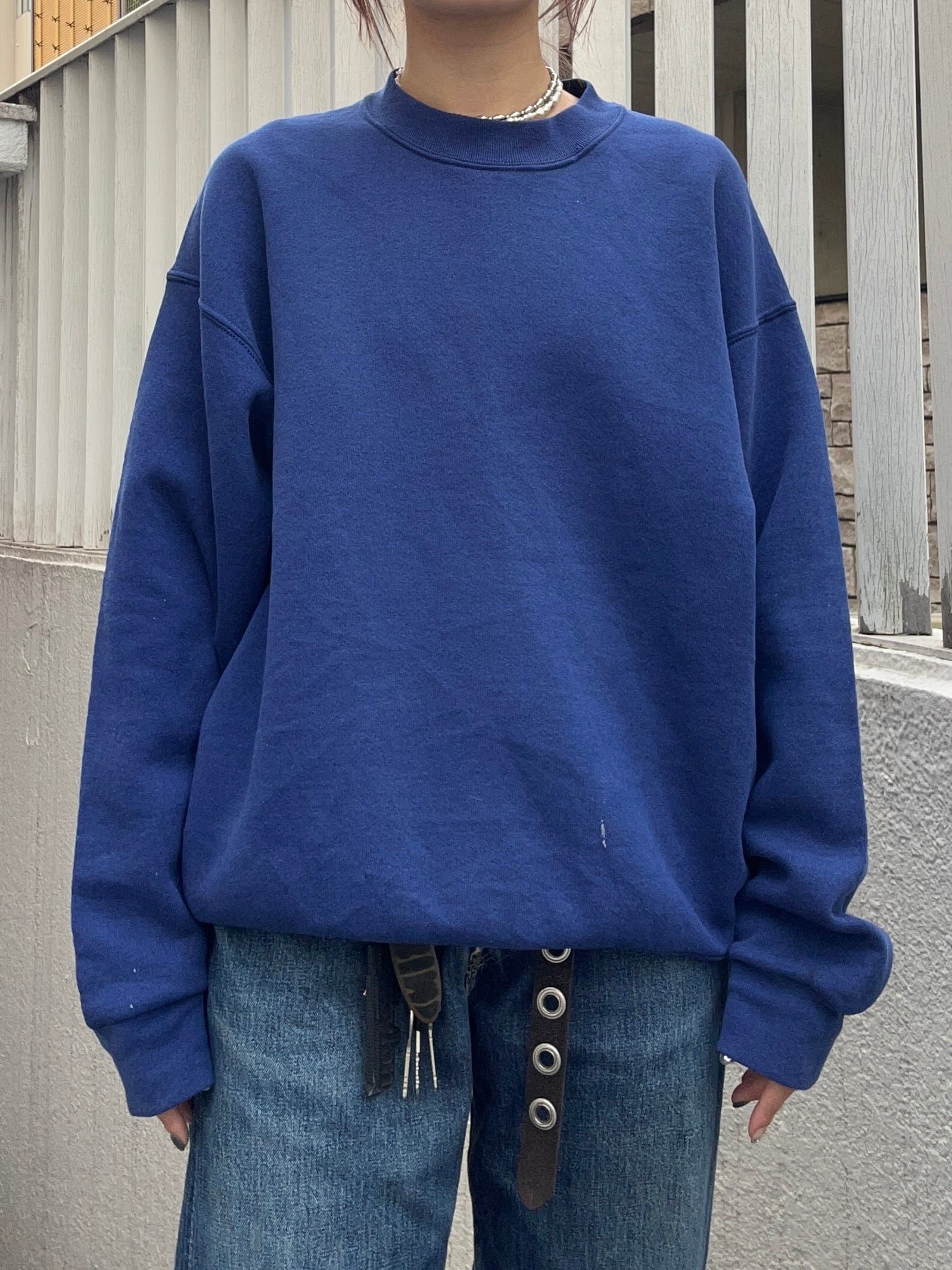 ブルーのようなネイビーカラーが魅力のBVDクルーネックスウェット。無駄を削ぎ落としたシンプルなデザインながら、程よくフェードした色味がこなれた雰囲気を演出します。軽やかな着心地のボディは日常使いに最適で、ラフに着ても様になるバランスの良いシルエットが特徴。装飾が無い分、レイヤードスタイルにも取り入れやすく、インナーとしても主役としても活躍します。ベーシックながらも古着らしい風合いを楽しめる一着です。