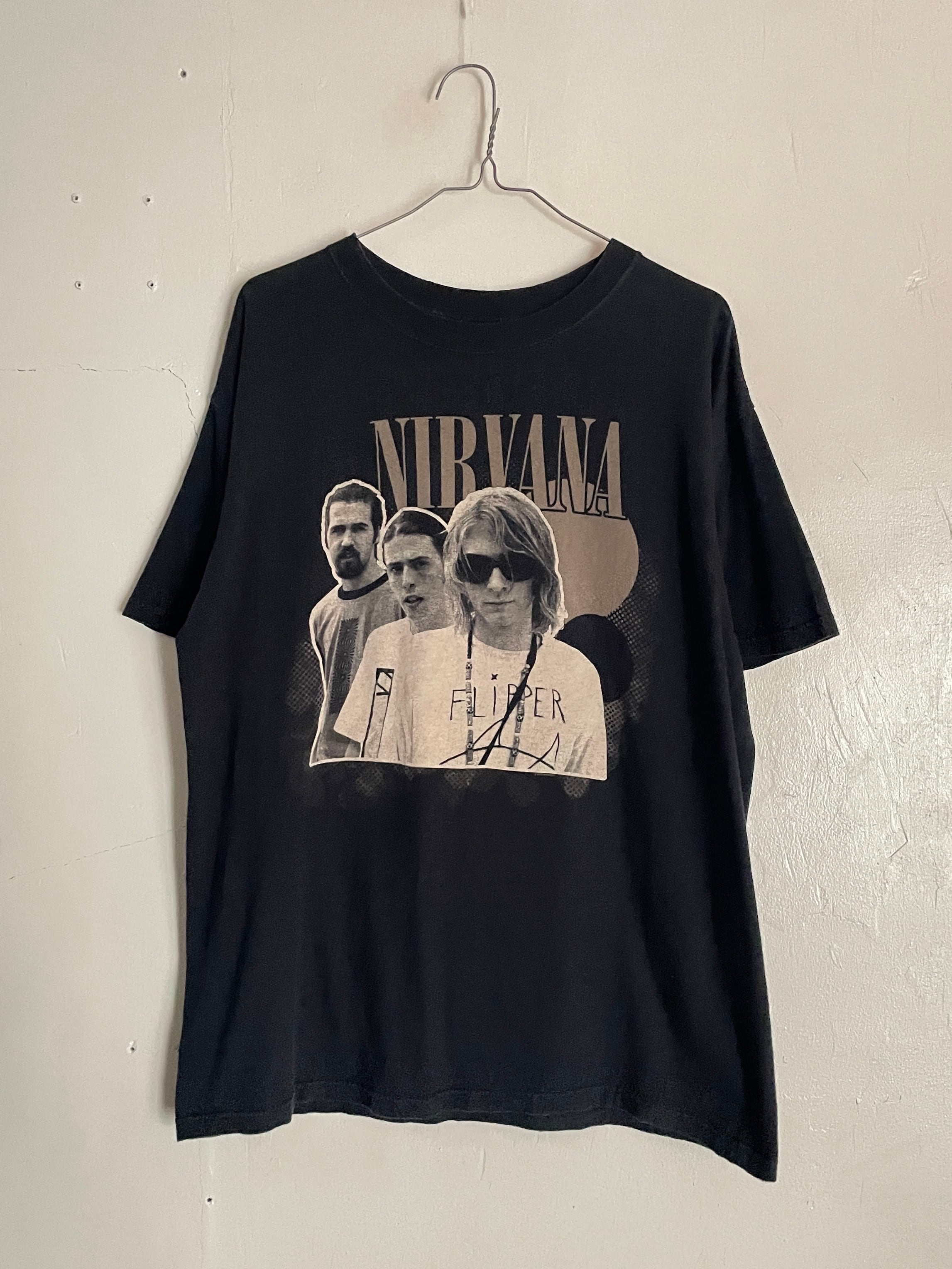 ブラックボディに、伝説的なロックバンド”NIRVANA”のメンバーがプリントされたTシャツです。ボーカルのカートコバーンがパンクバンド”Flipper"の自作Tシャツを着ている有名なフォトプリント。ロックすぎないプリントでデイリーに使えそうです。形のいいアンビルボディでシルエットも◎。07年のコピーライト入りです。夏には一枚で着たいロックTシャツです。