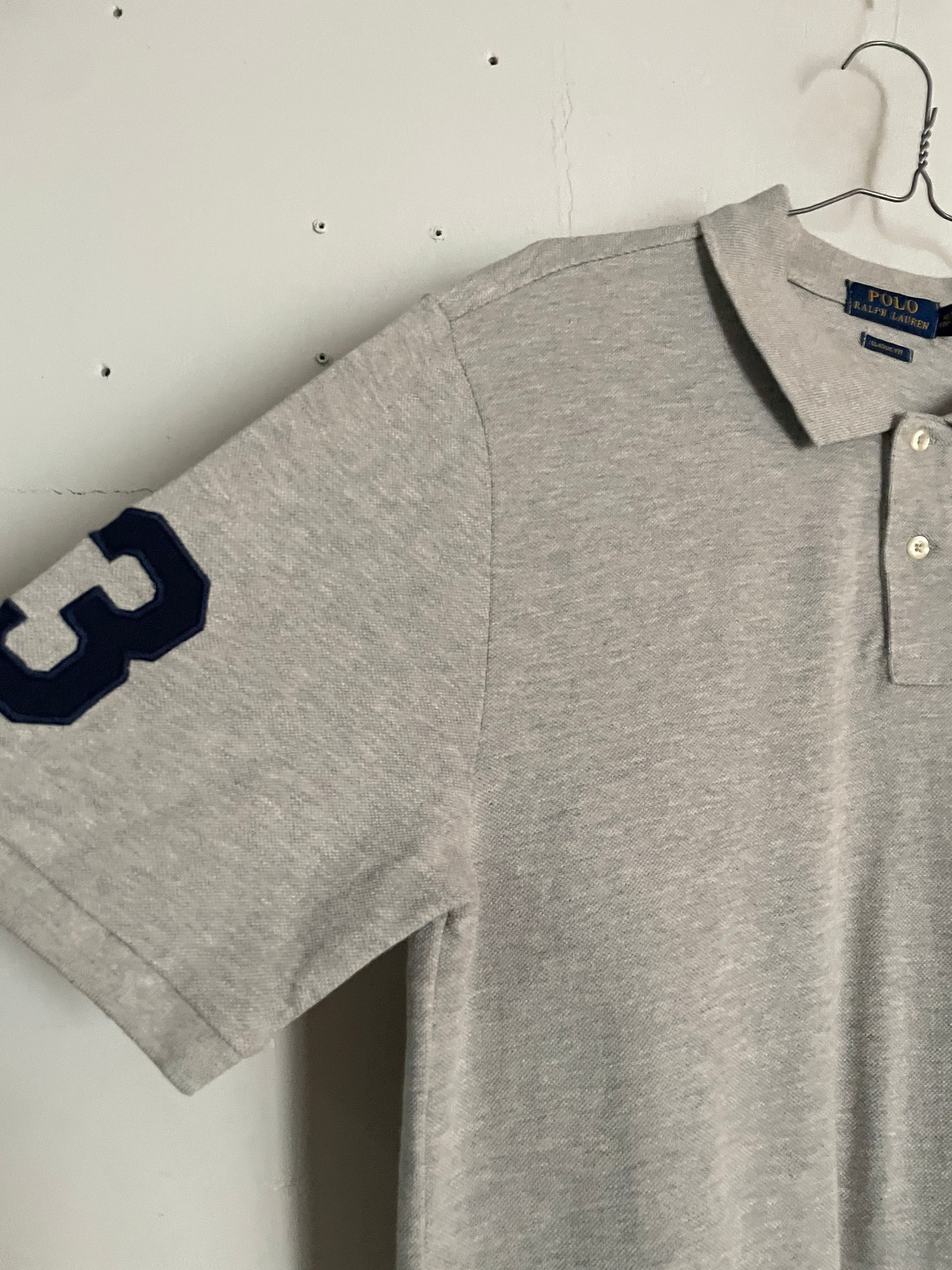 グレーボディに、アイコニックなビッグポニー刺繍が施された、ラルフローレンのポロシャツ。フロント部分にはビッグポニー、左袖にはナンバー3刺繍が施されているのが特徴的です。主張の激しくないデザインなので、様々なファッションに取り入れやすい一着かと思います。ゆったりとしたサイズ感なので、今の時期にはラフに着られそうです。タグ付きデッドストックアイテムです。