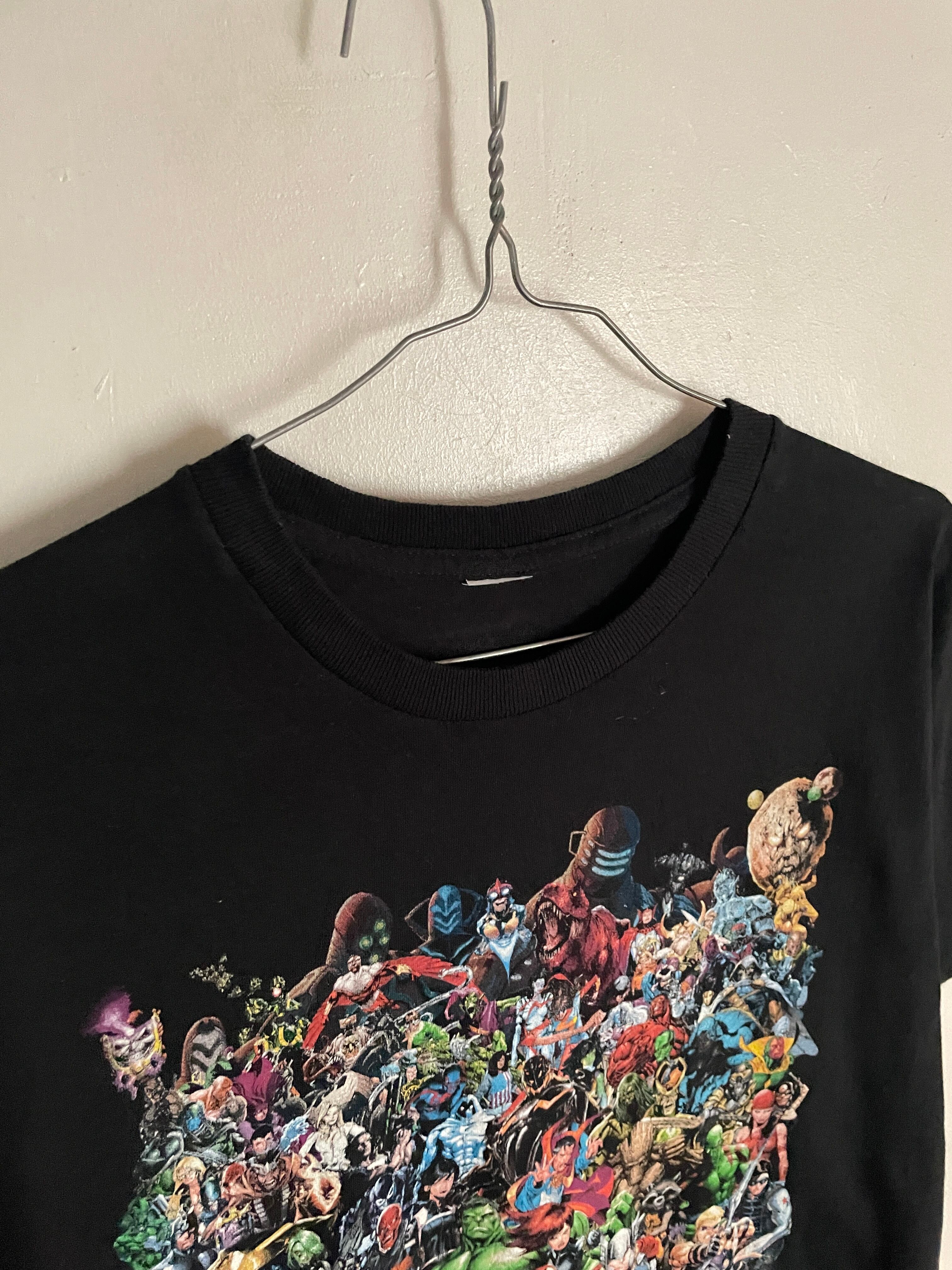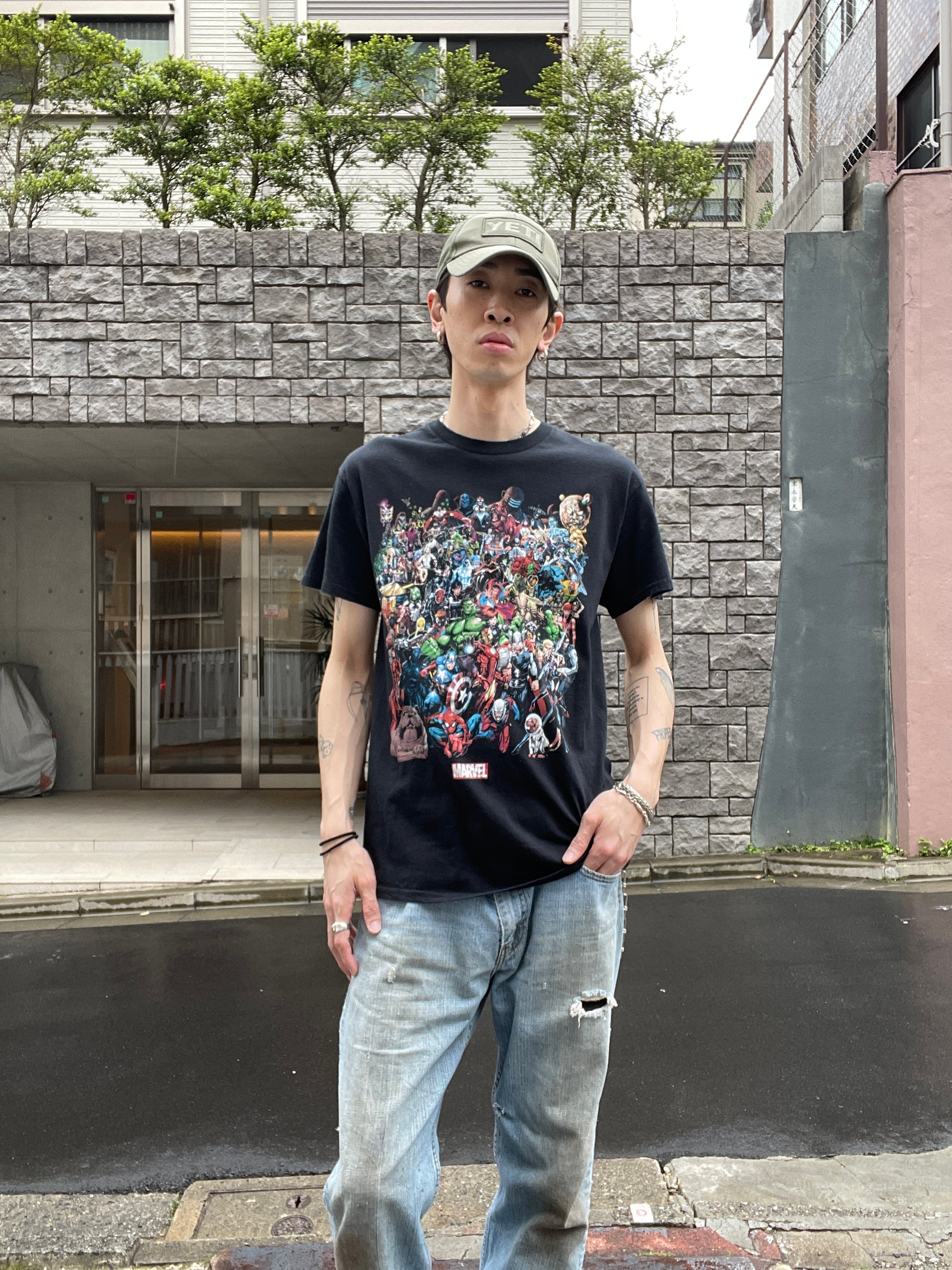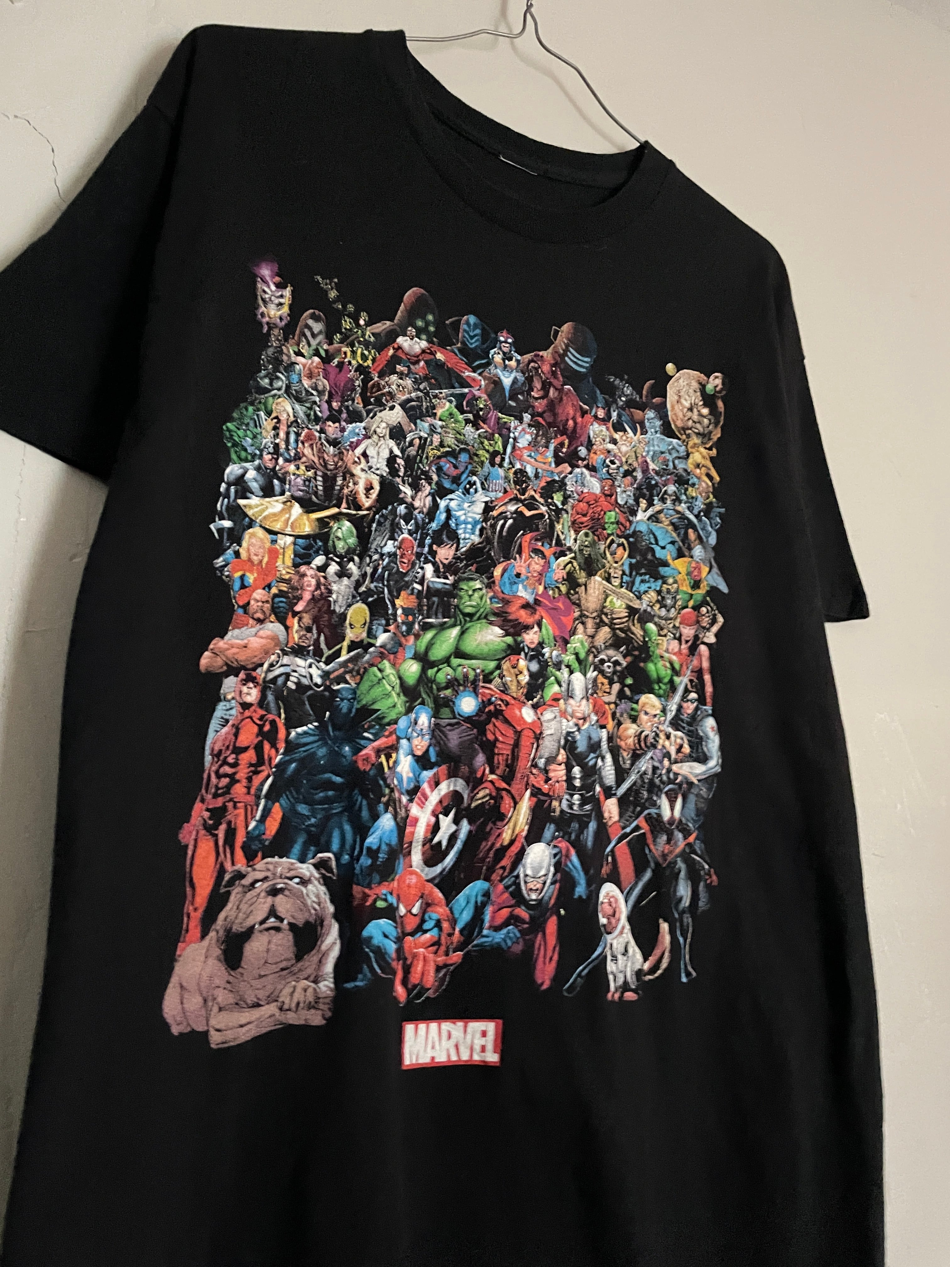 マーベルのキャラクターが集結したグラフィックTシャツ。フロントいっぱいにヒーローたちが描かれた迫力のデザインで、スパイダーマンやハルク、キャプテン・アメリカなど人気キャラが一堂に揃った豪華な一枚。ブラックボディにカラフルなプリントが映え、コーデの主役としてしっかり存在感を発揮してくれます。
