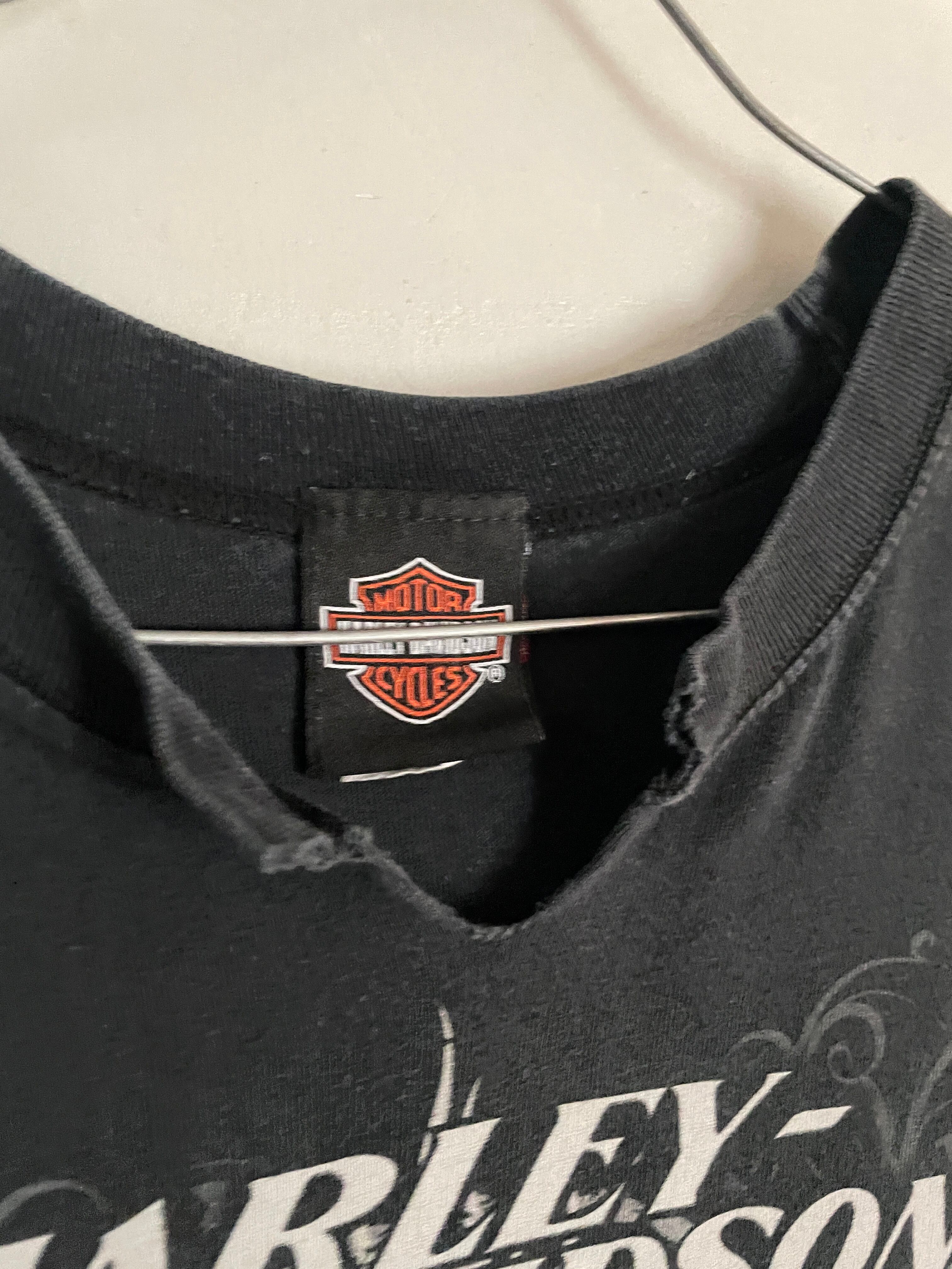 ややフェードじたブラックボディに、両面プリントが施された、ハーレーダビッドソンのノースリーブ。フロントにはスカル×ウイングモチーフの存在感あるグラフィック、バックにはウイングロゴとハーレープリントが大きく入った、ハーレーらしい無骨でインパクト抜群のデザインになっています。ネック部分の切り込みデザインもパンクっぽさがあってグッド。一枚ではもちろん、インナーとしても活躍してくれる一着。