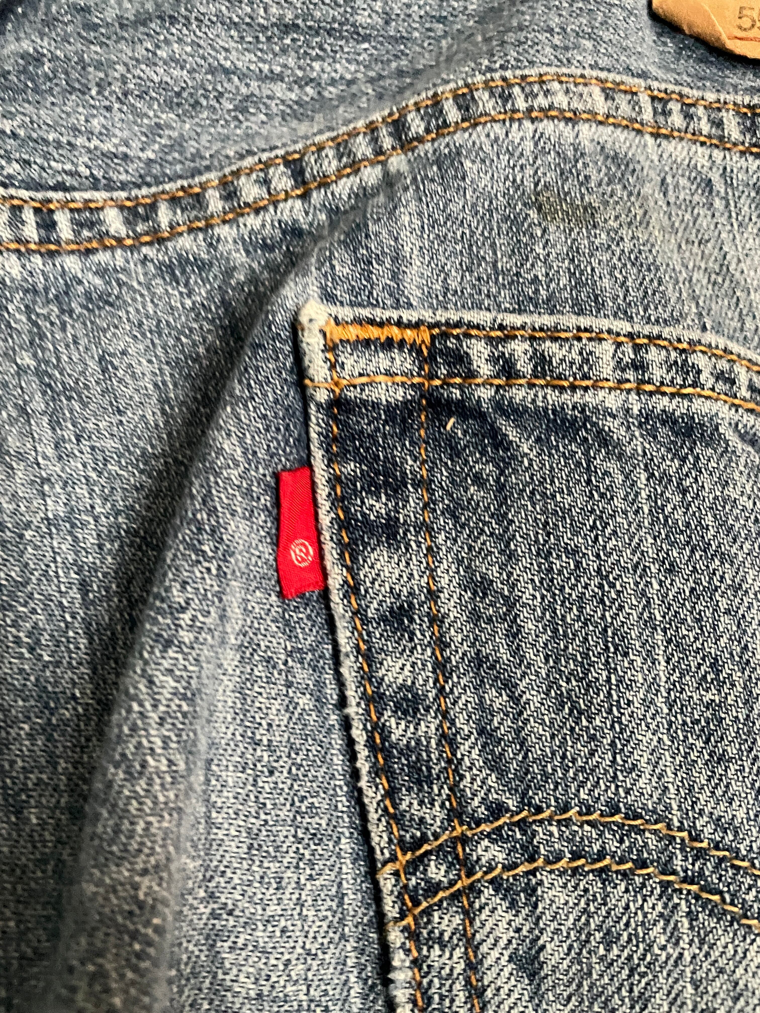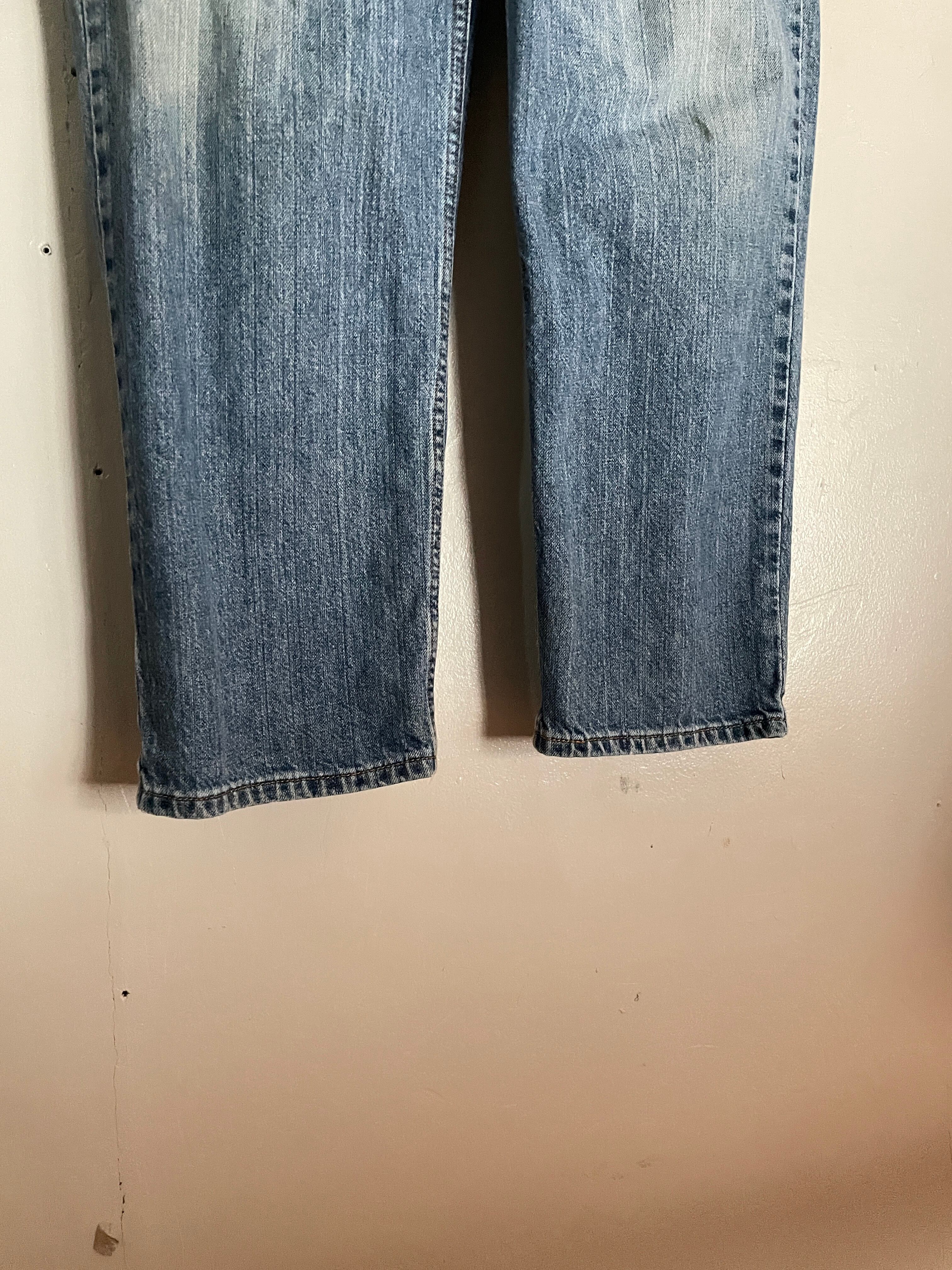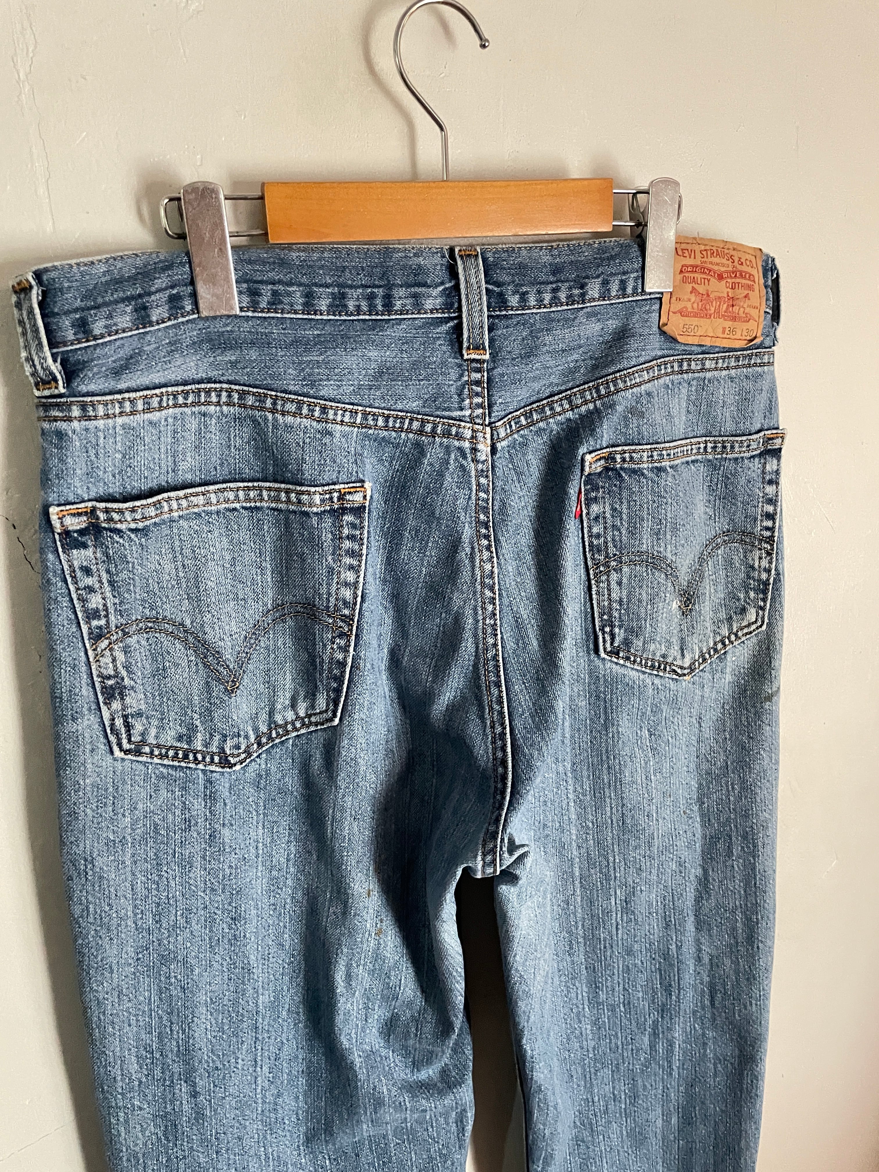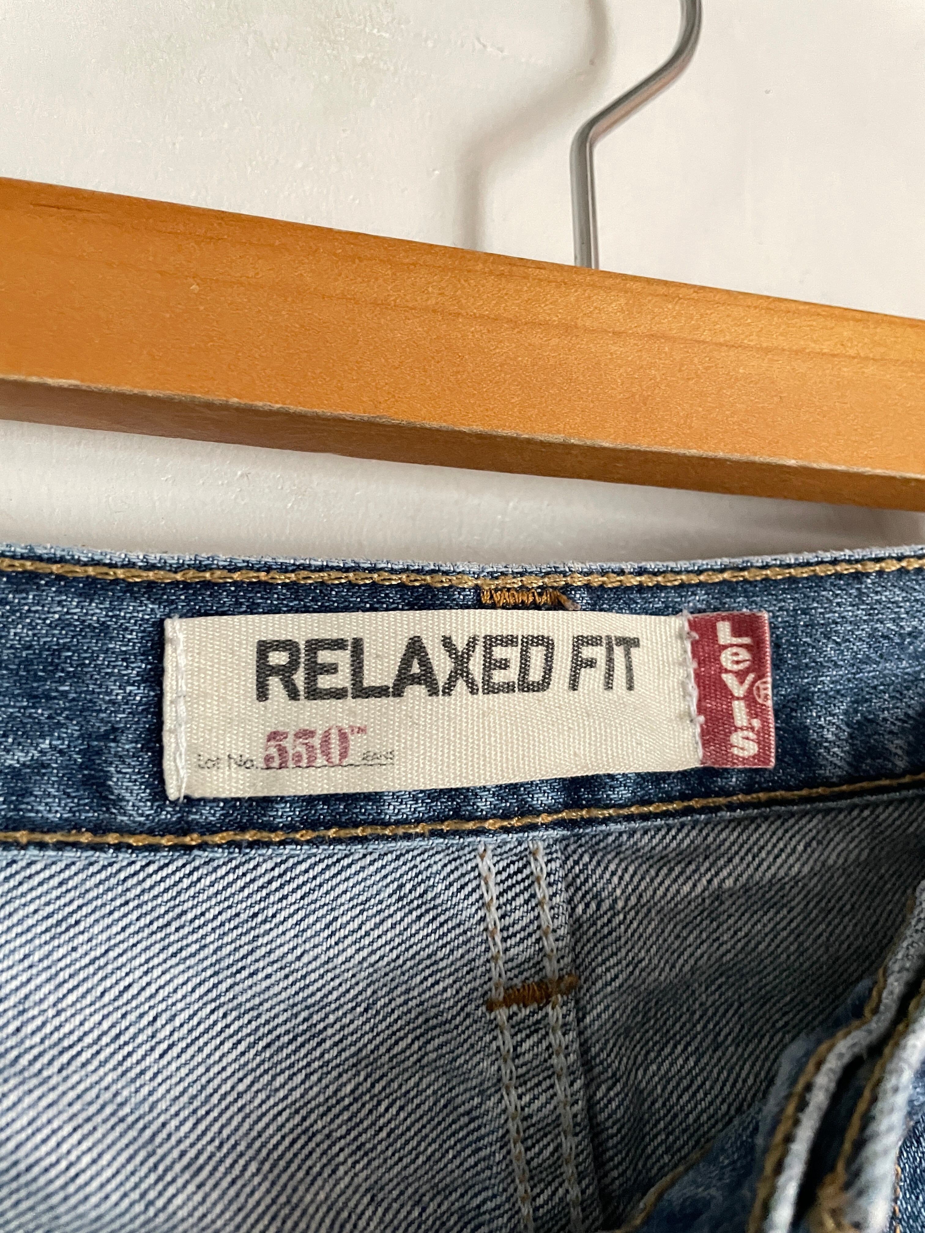 良い褪せ方をしたブルーカラーに、程良くペイントが施された、リーバイス550のデニムパンツ。ゆったりとしたテーパードシルエットが特徴で、腰回りに程よい余裕がありながら、裾にかけてすっきりと落ちるバランスの良い一本です。全体に施された自然な色落ちと、履き込まれたことで生まれた柔らかい風合いも魅力で、こなれたスタイリングにぴったりです。