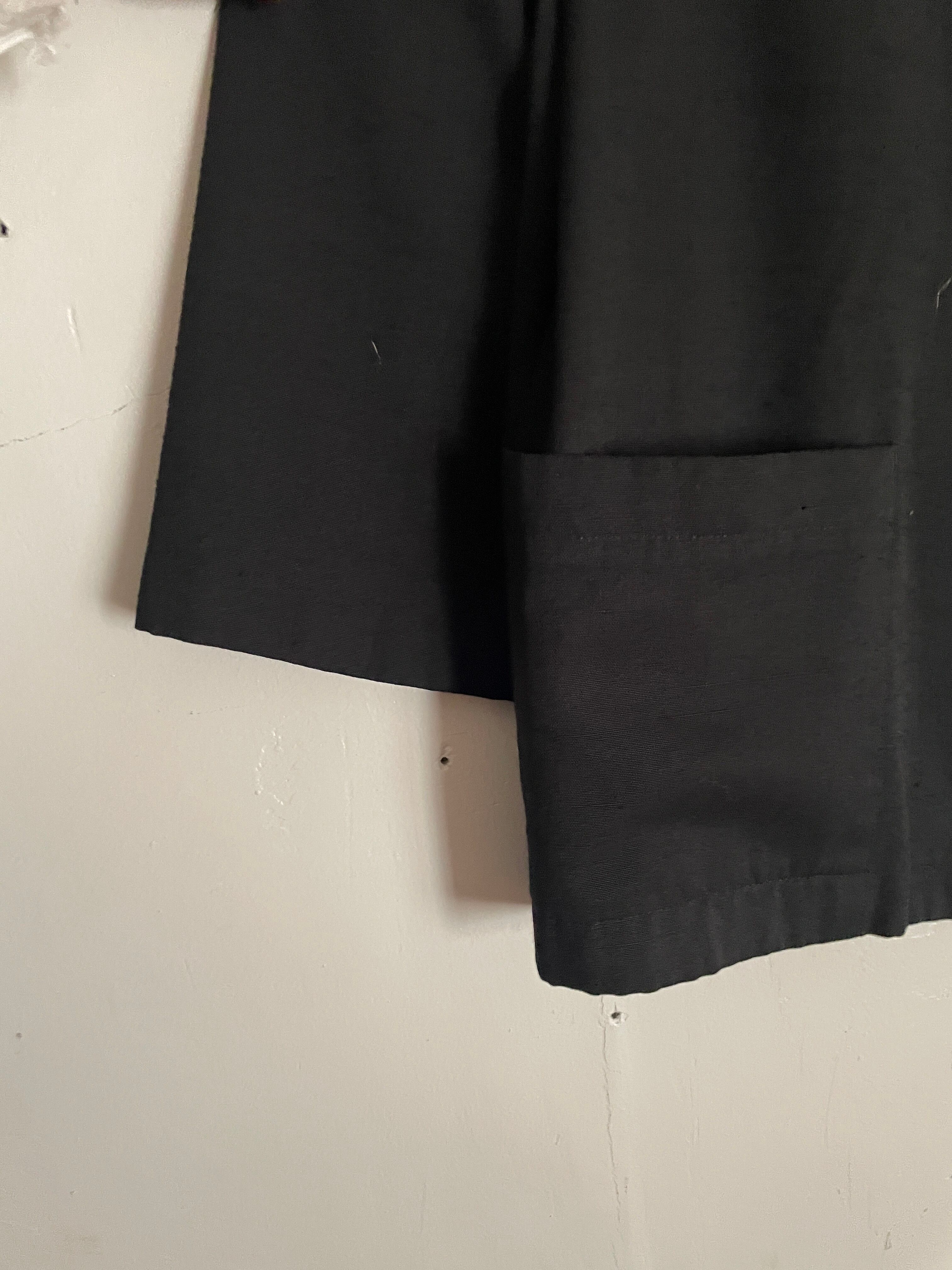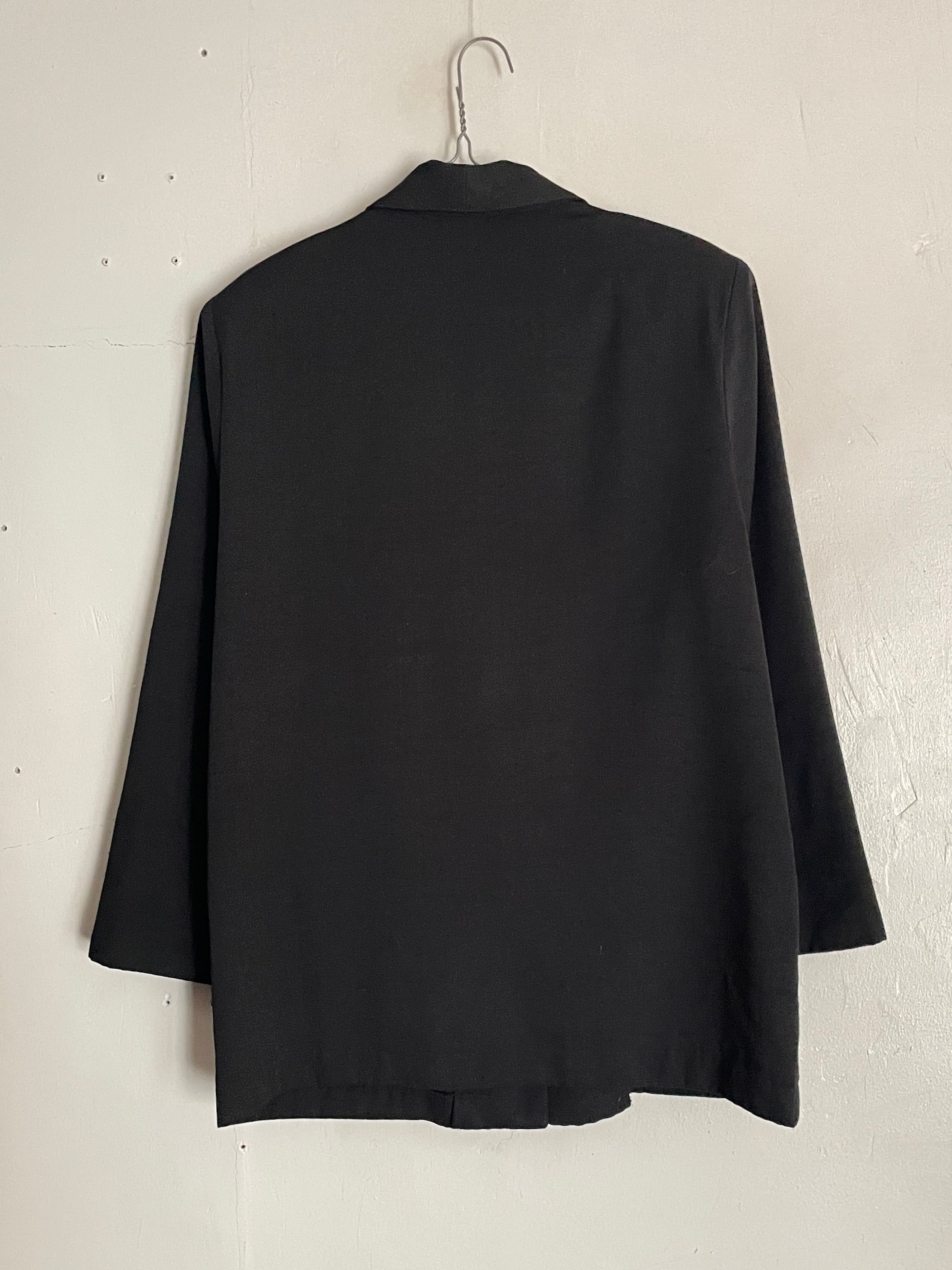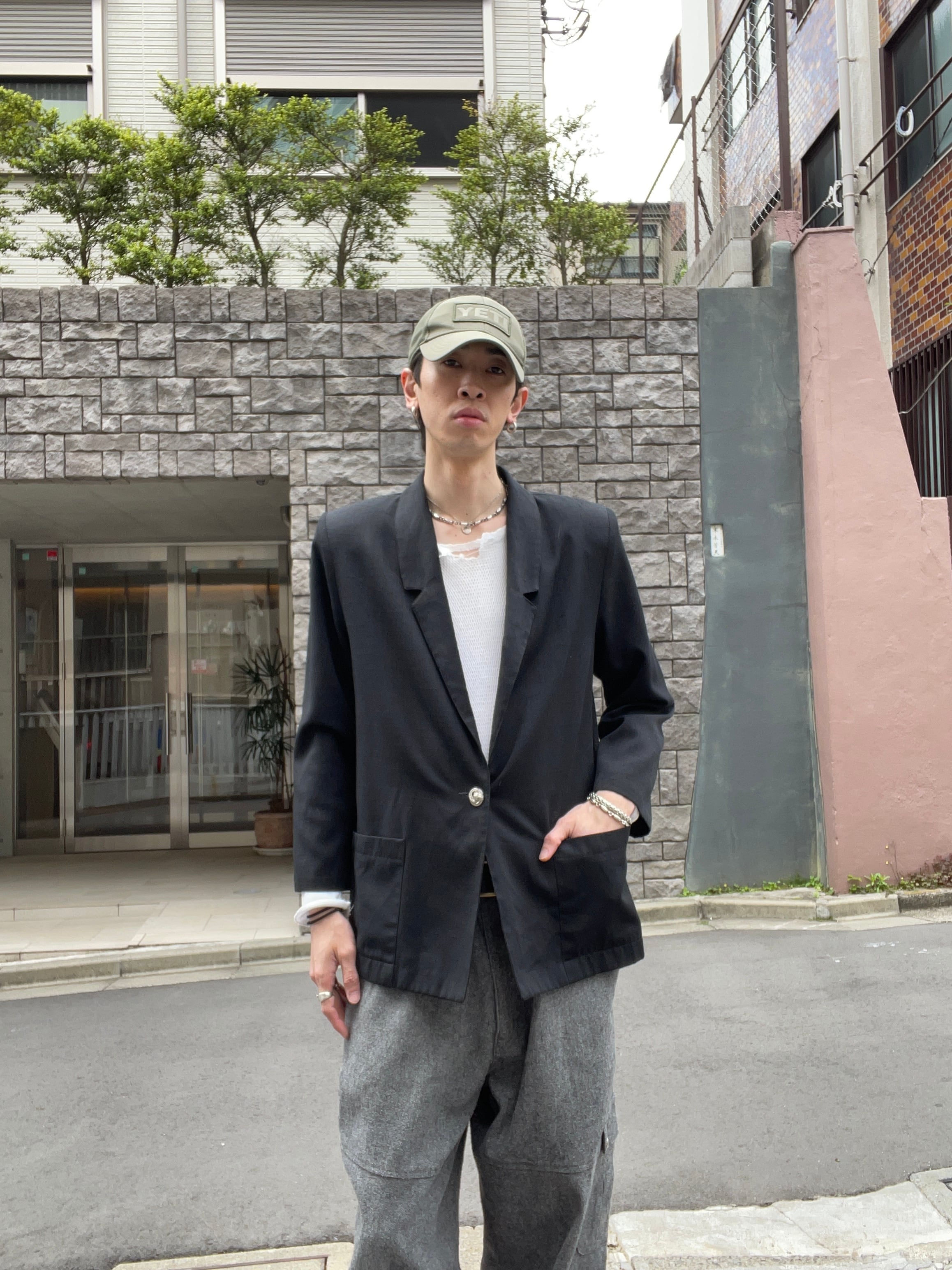 ブラックボディで、ポリとレーヨン素材のさらっと羽織れるサマージャケット。軽やかで、カジュアルに着られそうです。丈もしっかりあり、スタイリングの邪魔をせずきれいめに着られます。シンプルで使いやすい万能型アイテムです。