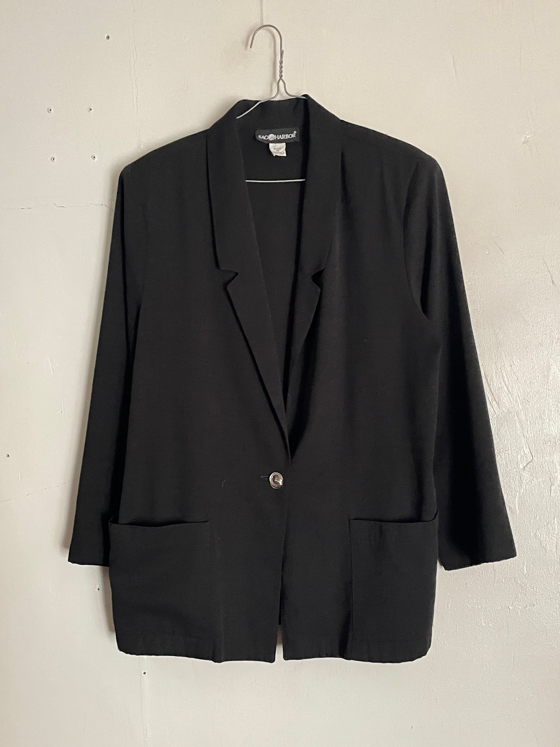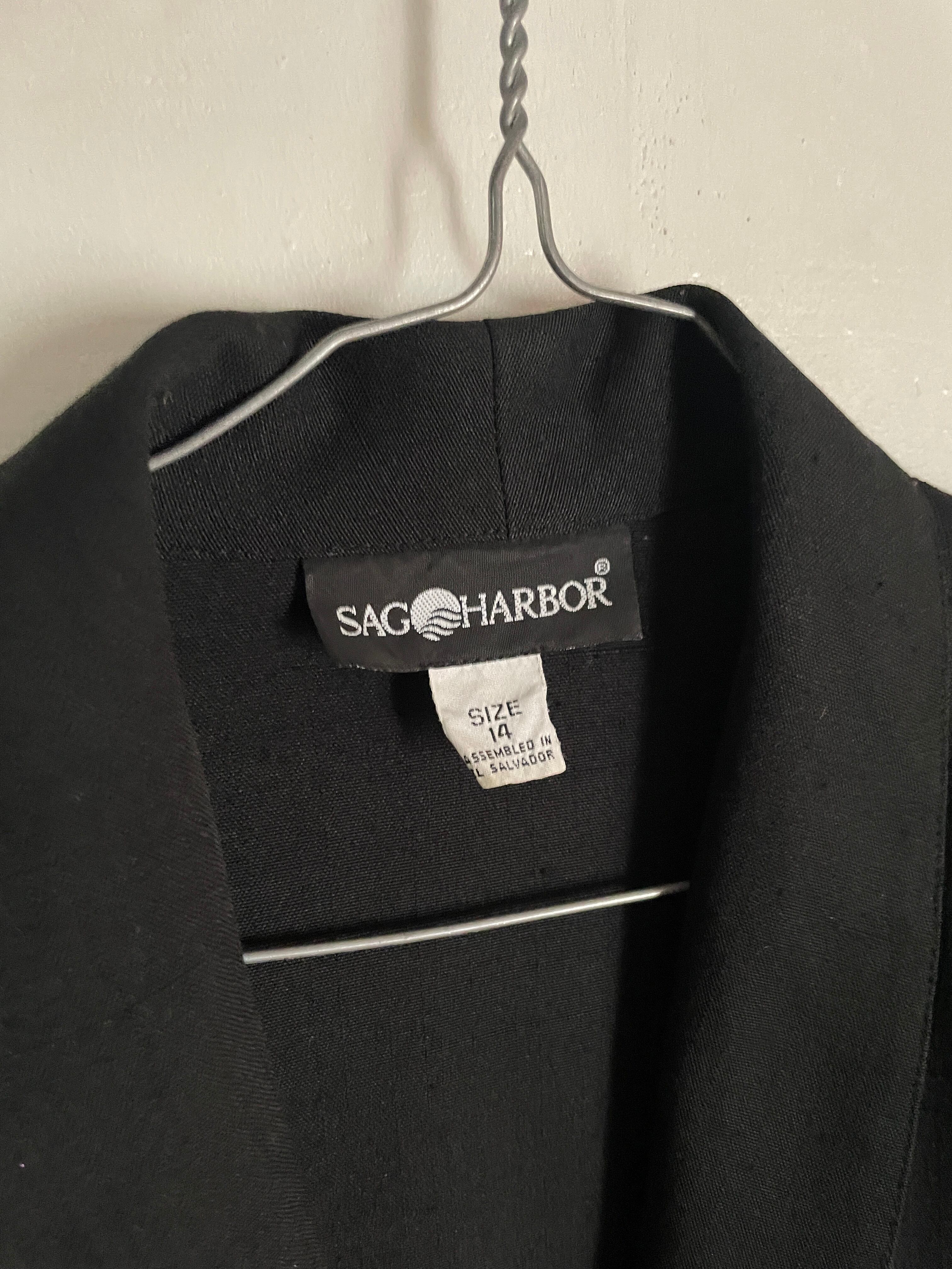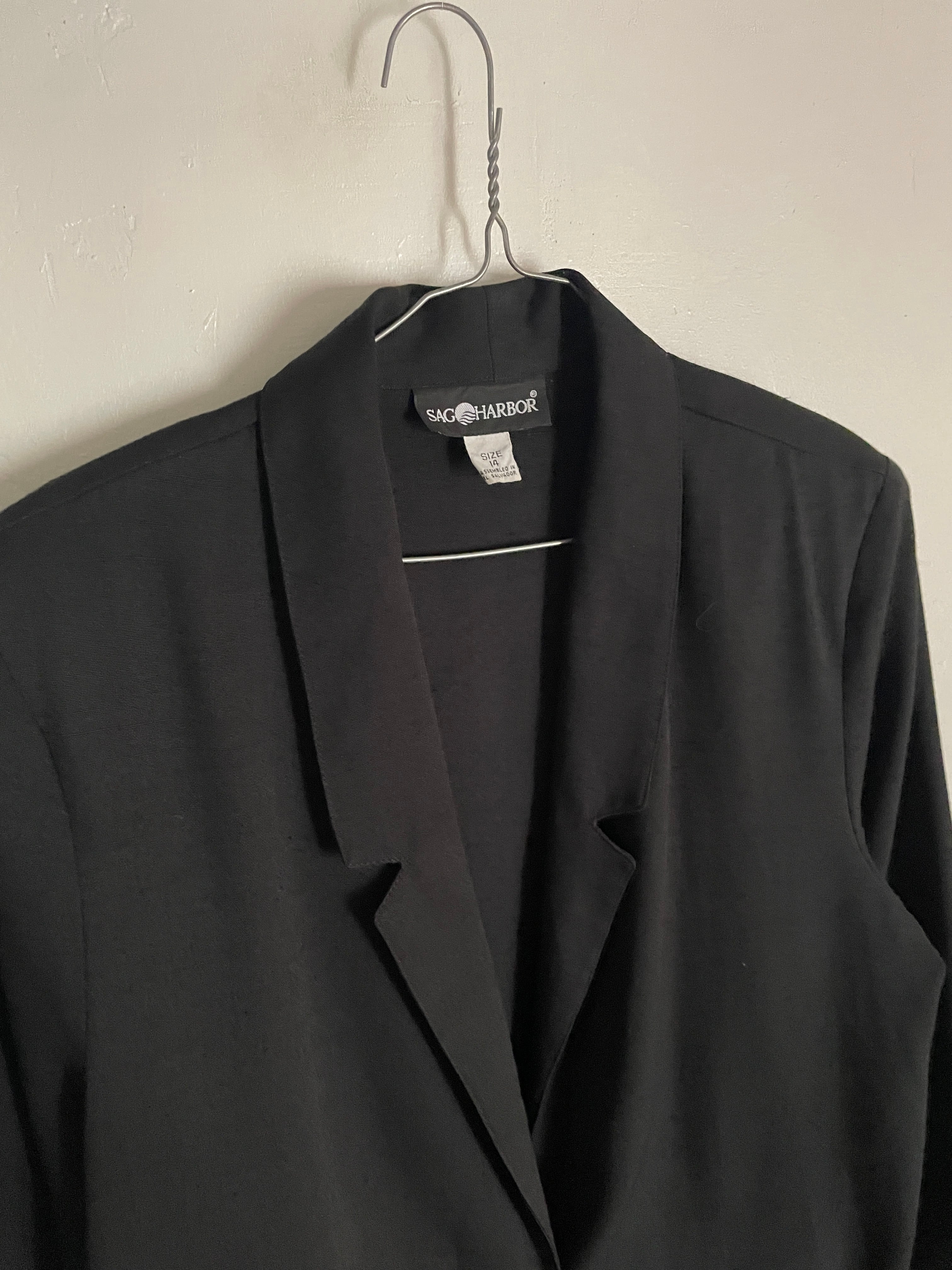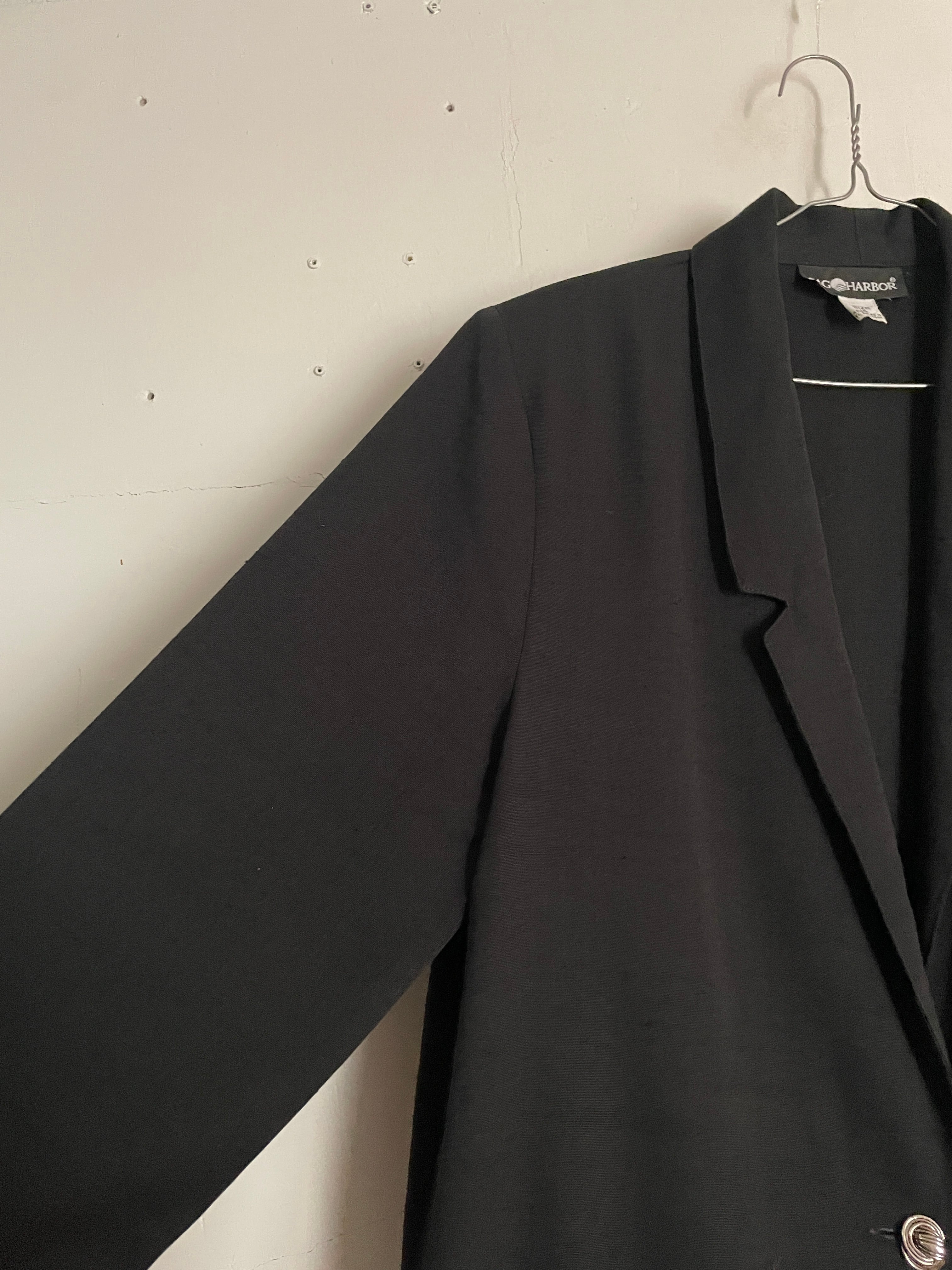 ブラックボディで、ポリとレーヨン素材のさらっと羽織れるサマージャケット。軽やかで、カジュアルに着られそうです。丈もしっかりあり、スタイリングの邪魔をせずきれいめに着られます。シンプルで使いやすい万能型アイテムです。