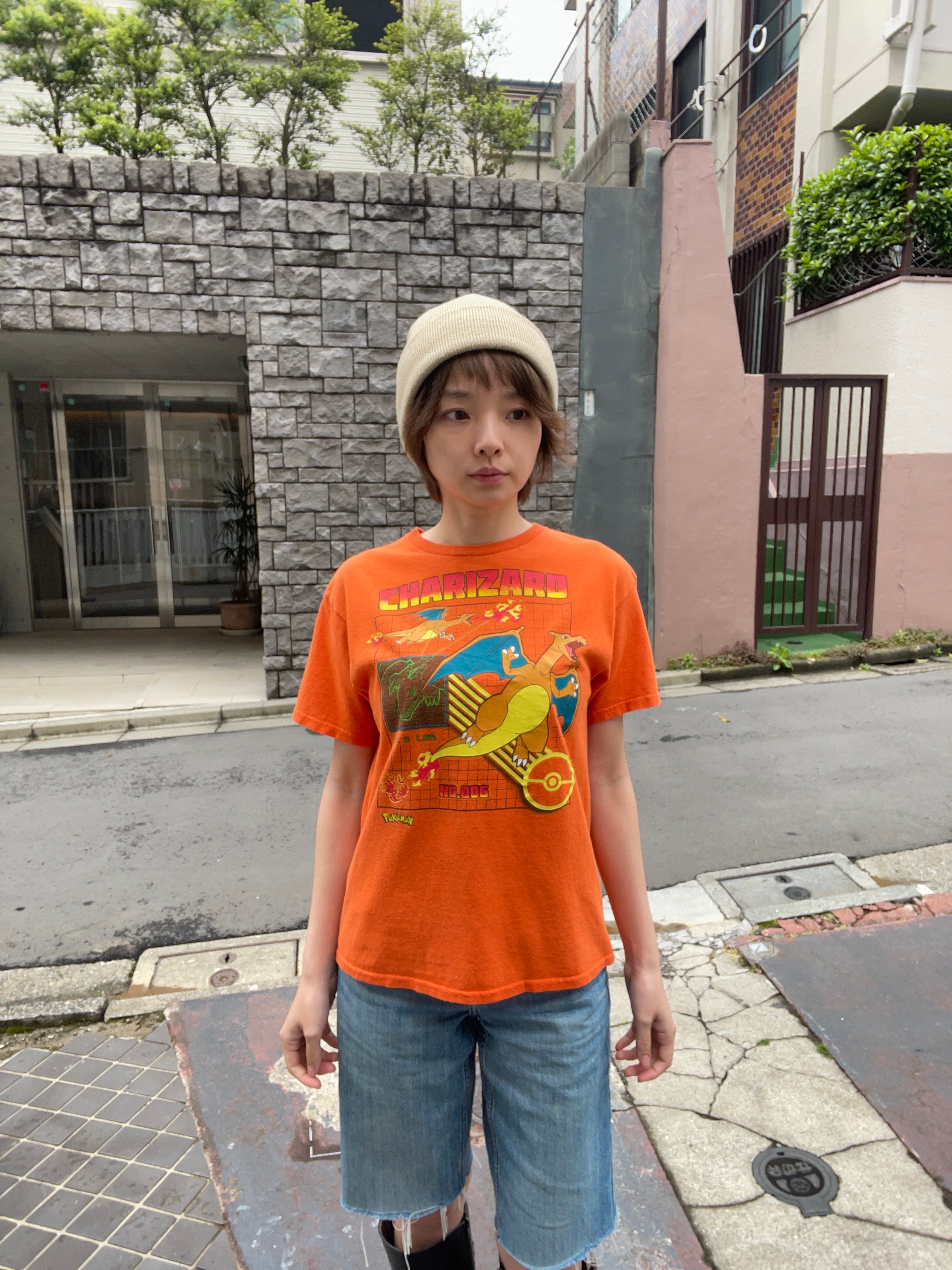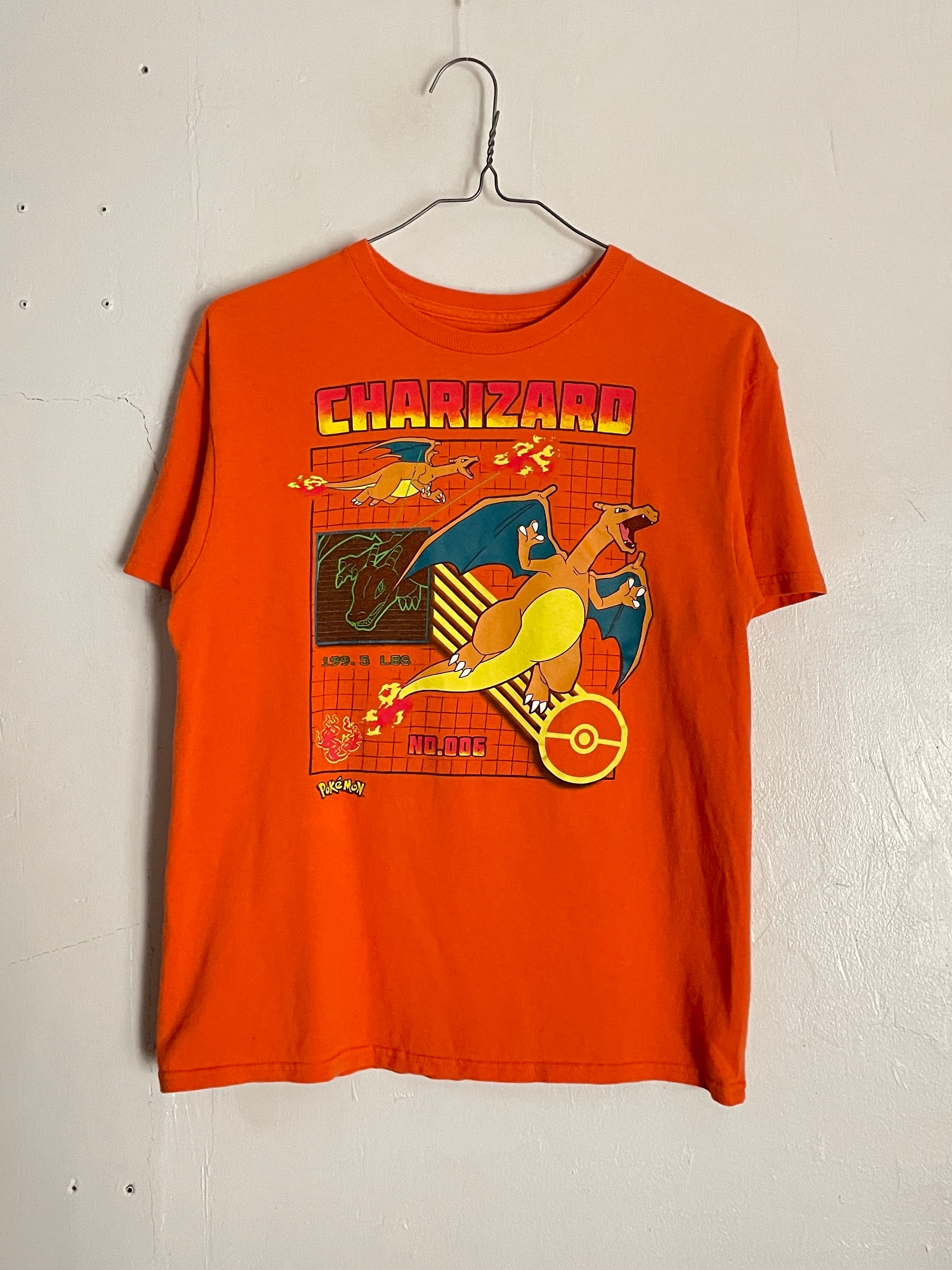 ポケモンの中でも人気の高いリザードンのTシャツです。図鑑番号や体重データ、さらにレトロなグリッド背景を組み合わせた90年代風のテックデザインがかなりイケてます。普段着としてもコレクションとしても是非な一枚です。