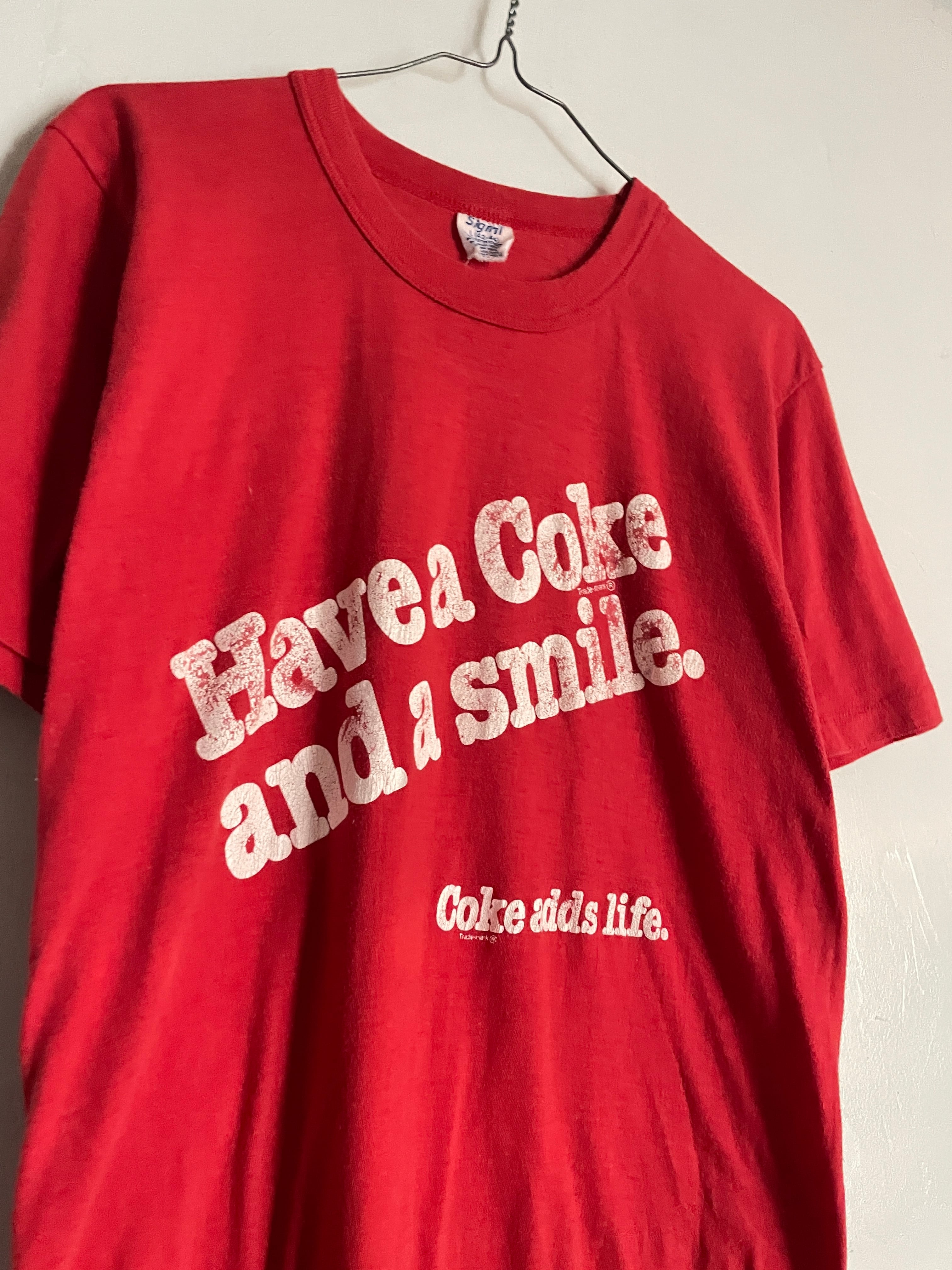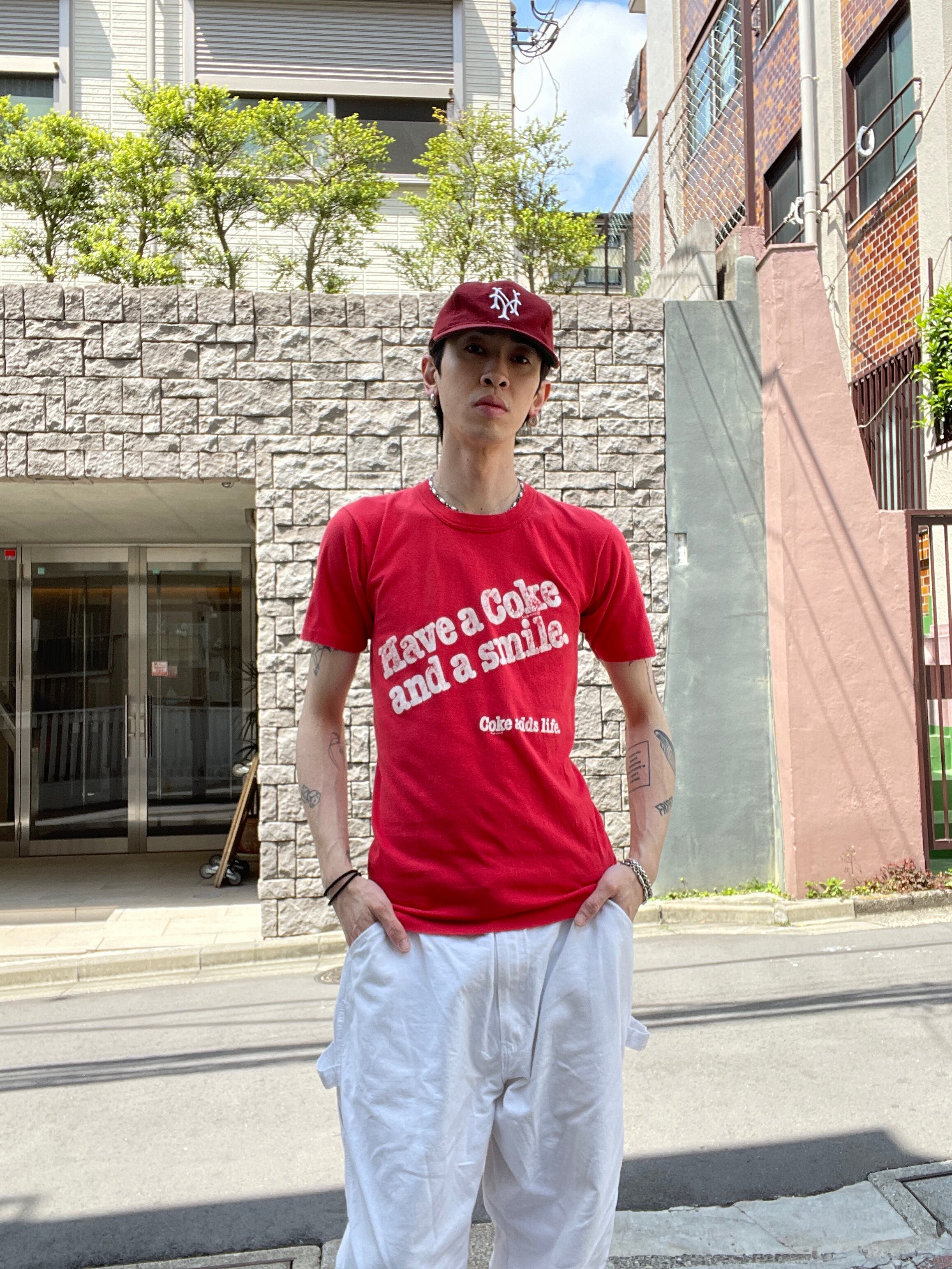 明るいレッドボディに、”コーラを飲んで、笑顔になろう”とキャッチコピープリントが施されたTシャツ。”コークをは人生を楽しくする”といったメッセージも入っています。コーラが飲みたくなるような、遊び心が感じられる一着。ややタイトめな縦長シルエット。コットンポリで柔らかく軽い質感。夏には一枚で着たいTシャツです。